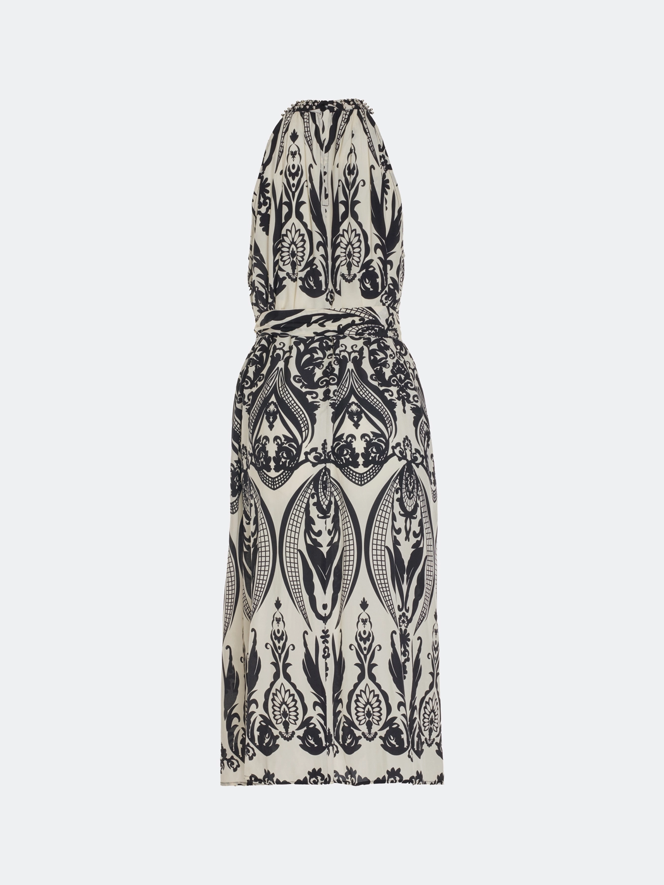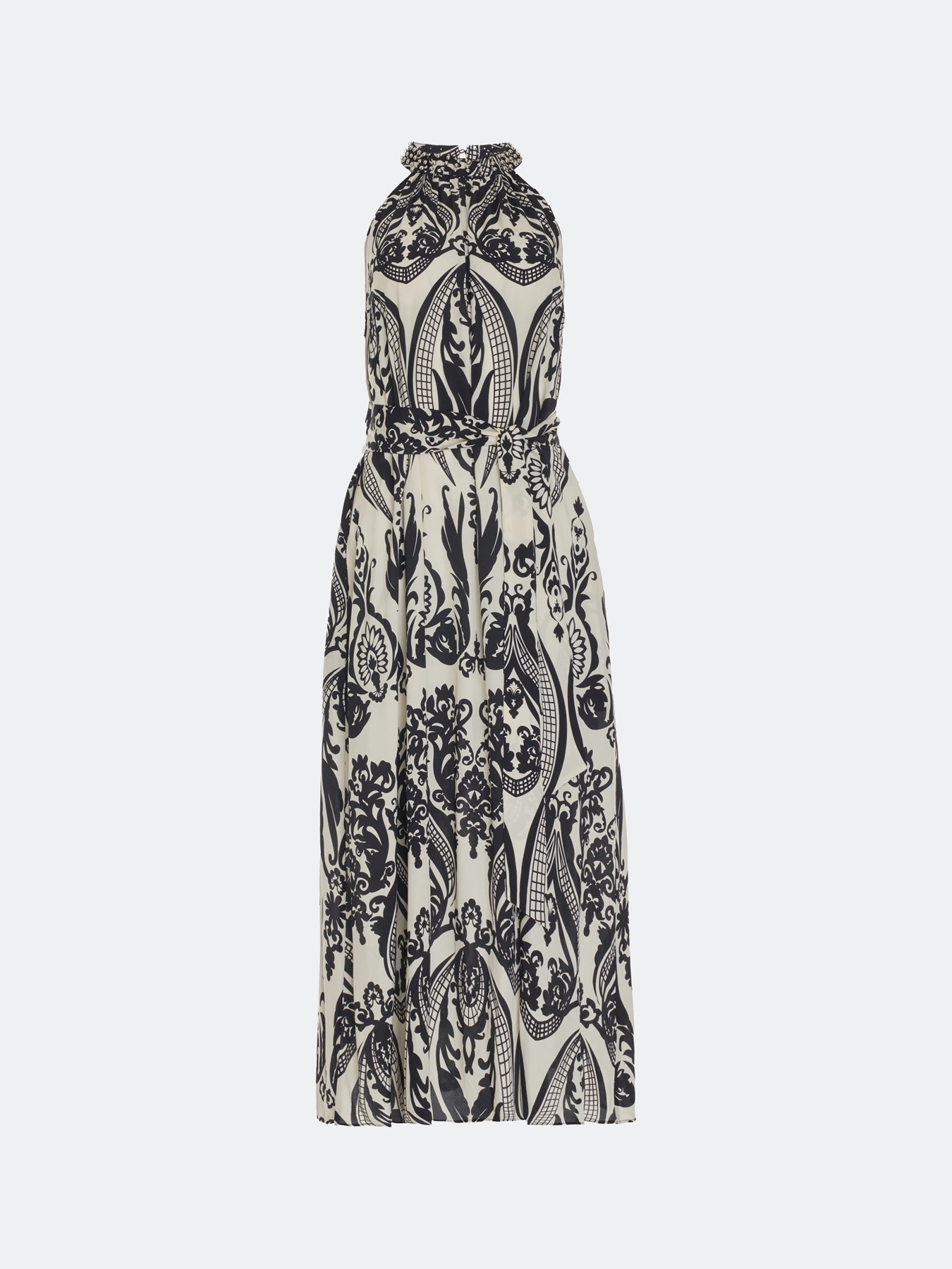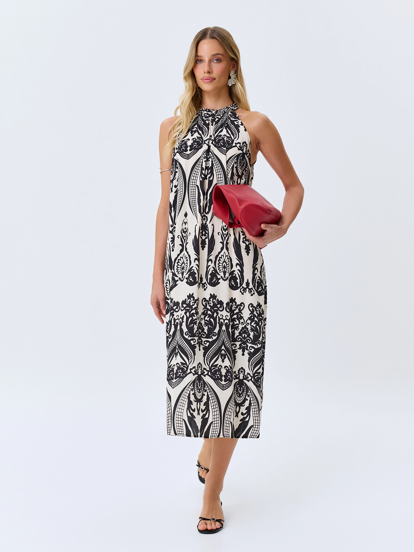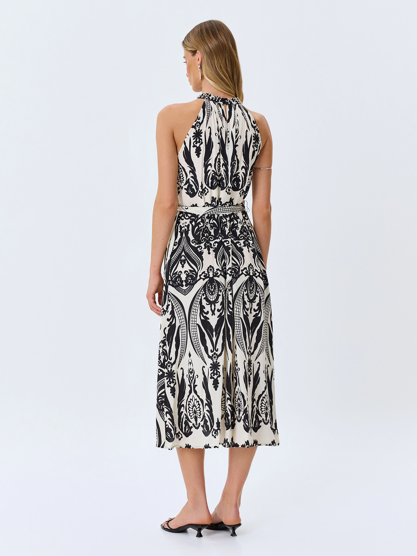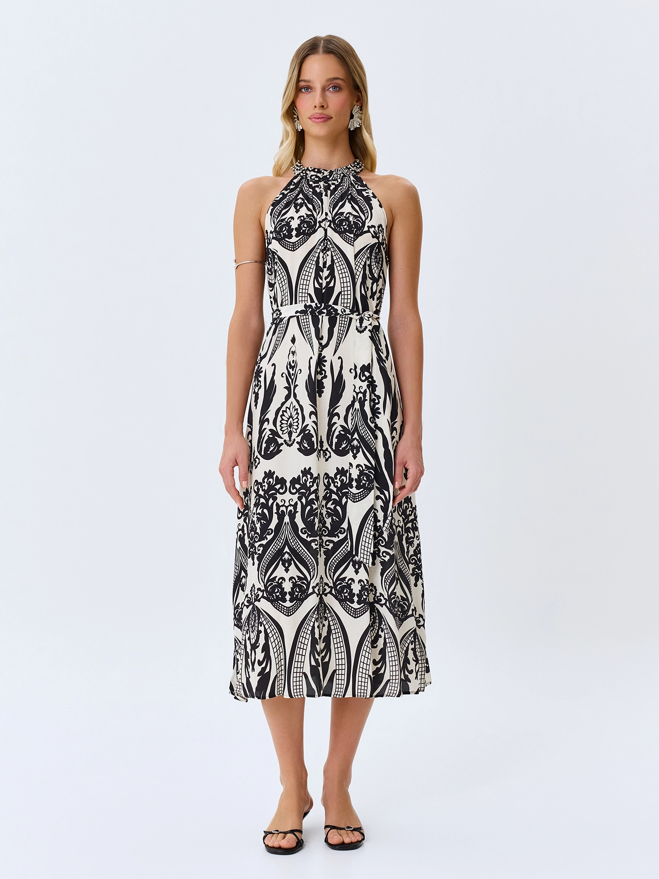 Платье-миди с монохромным этническим принтом. Свободный силуэт можно приталить поясом. Вырез халтер дополнен металлической фурнитурой. Боковые карманы в швах. Резинка и пояс по линии талии. В составе вискоза.