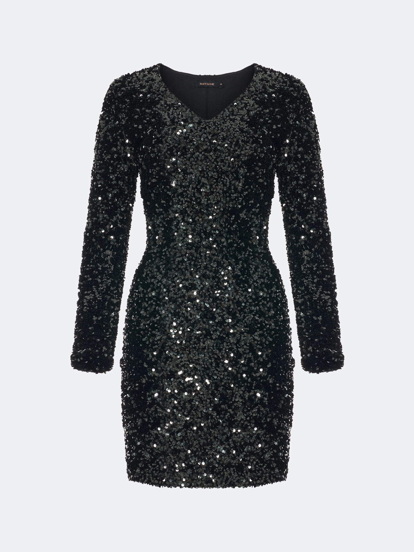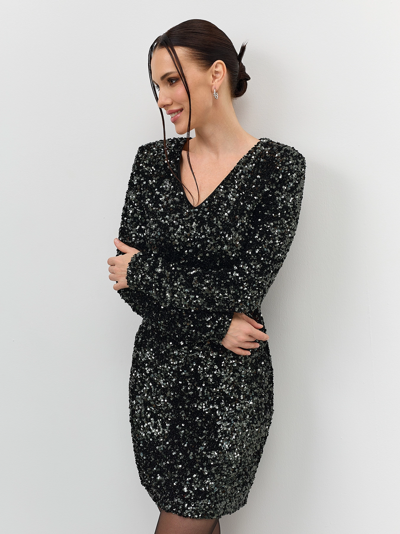 Нарядное платье-мини с искрящимися пайетками. Прилегающий силуэт. V-образный вырез. Застежка на молнию.