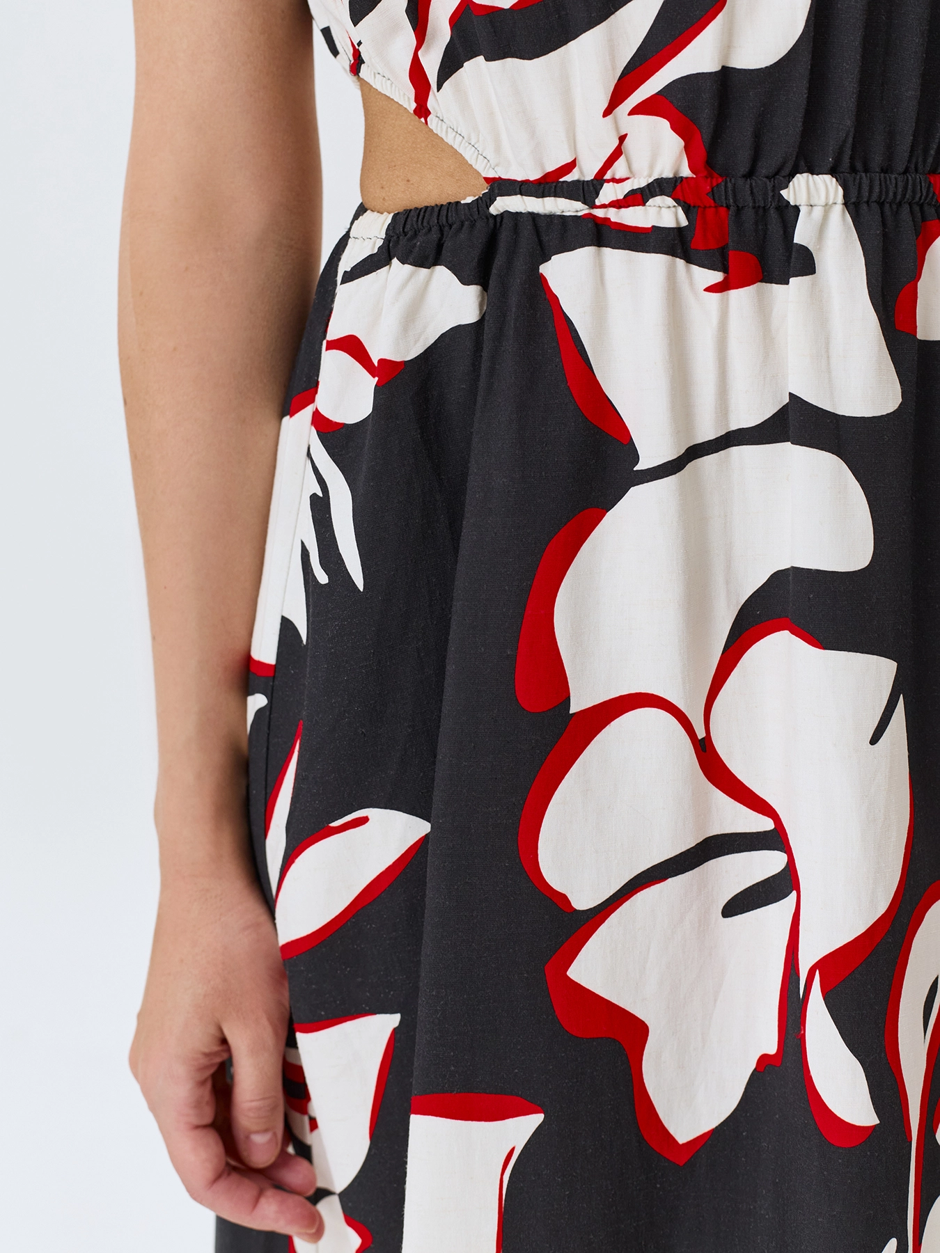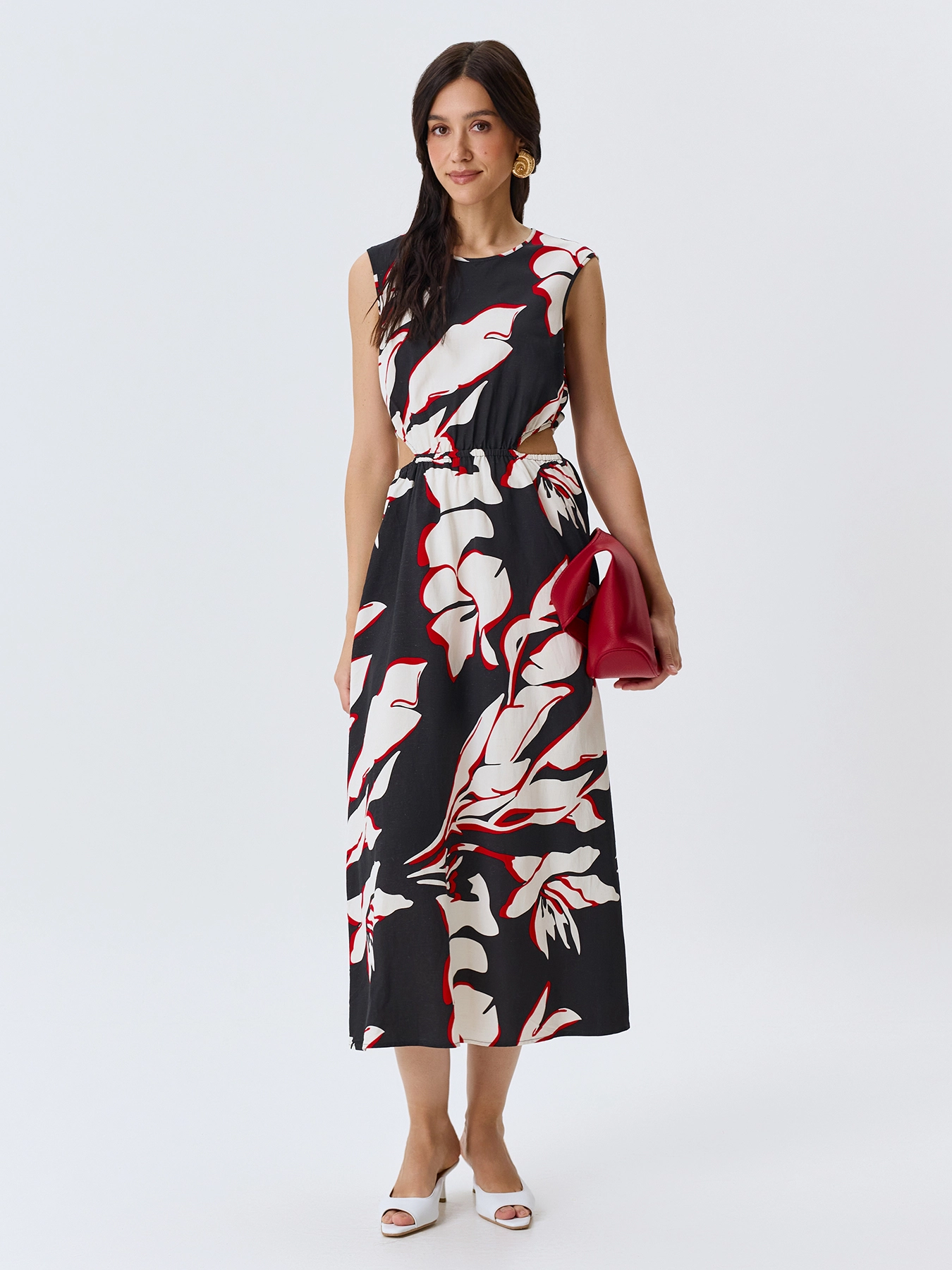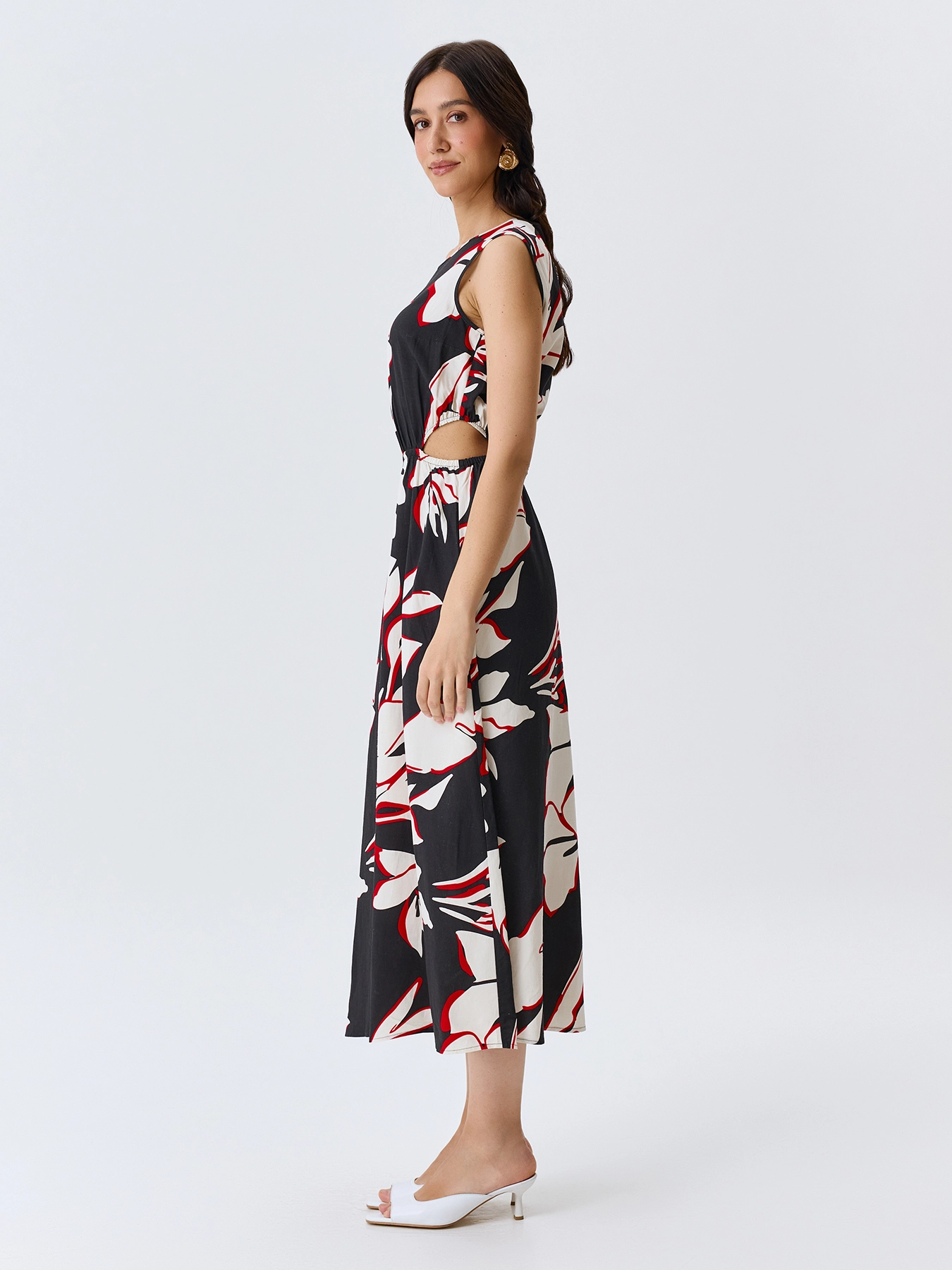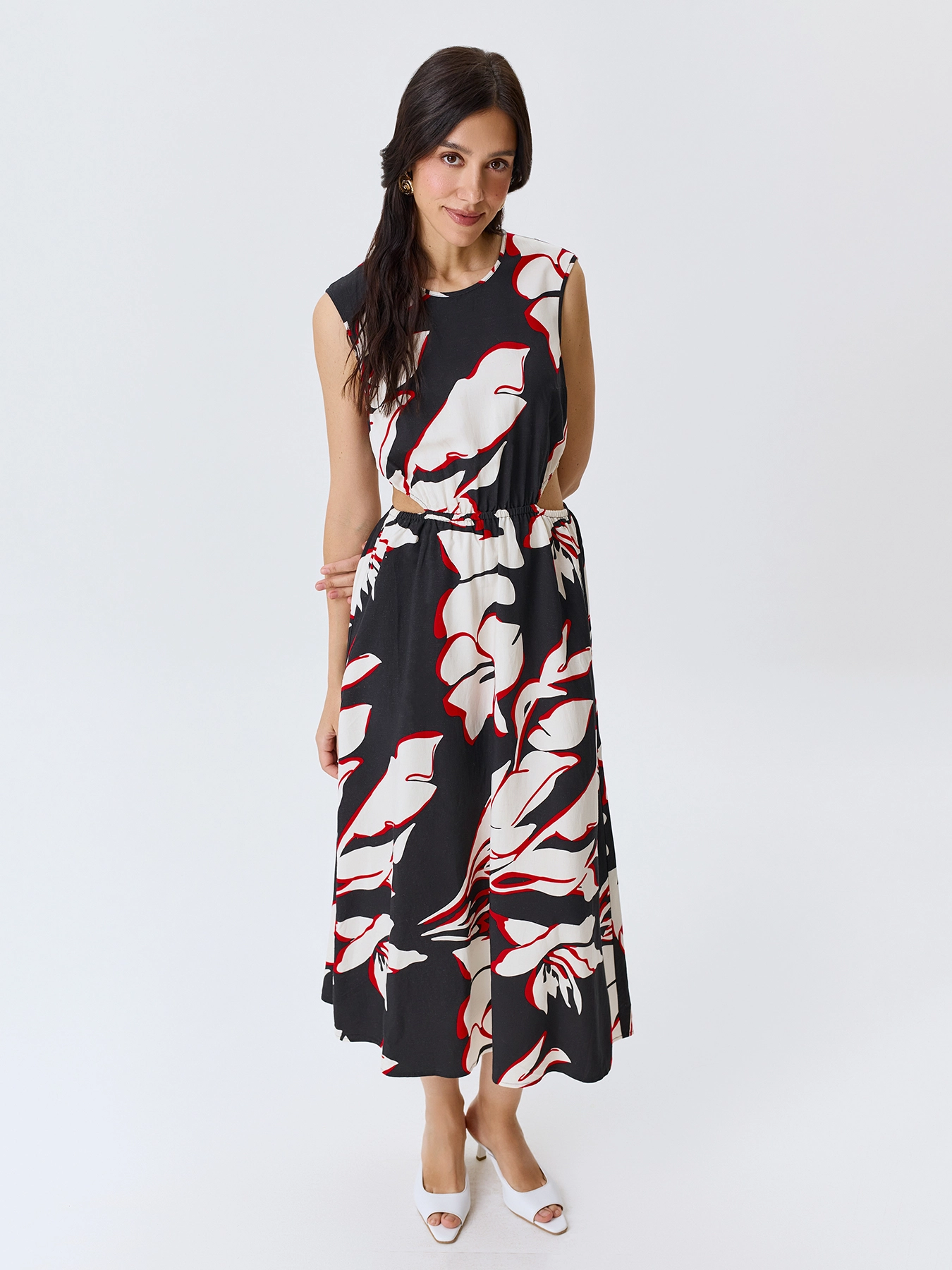 Яркое платье-миди с крупным флоральным принтом с акцентными вырезами по линии талии. Круглый вырез. Приталенный силуэт. Резинка по линии талии. Застежка на пуговицу. В составе тенсель и лен.