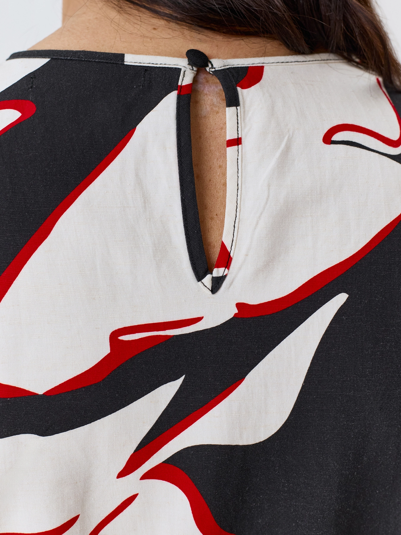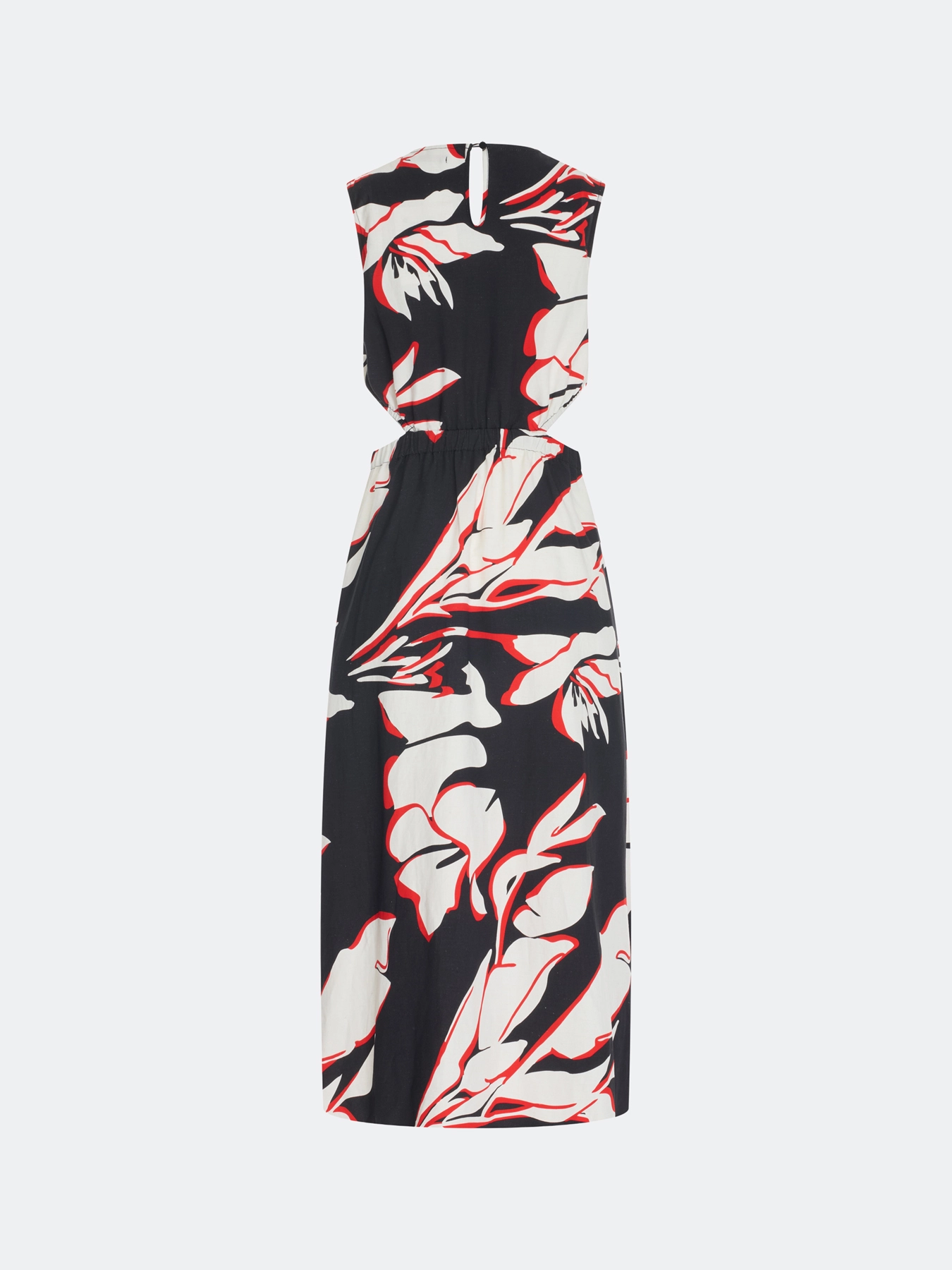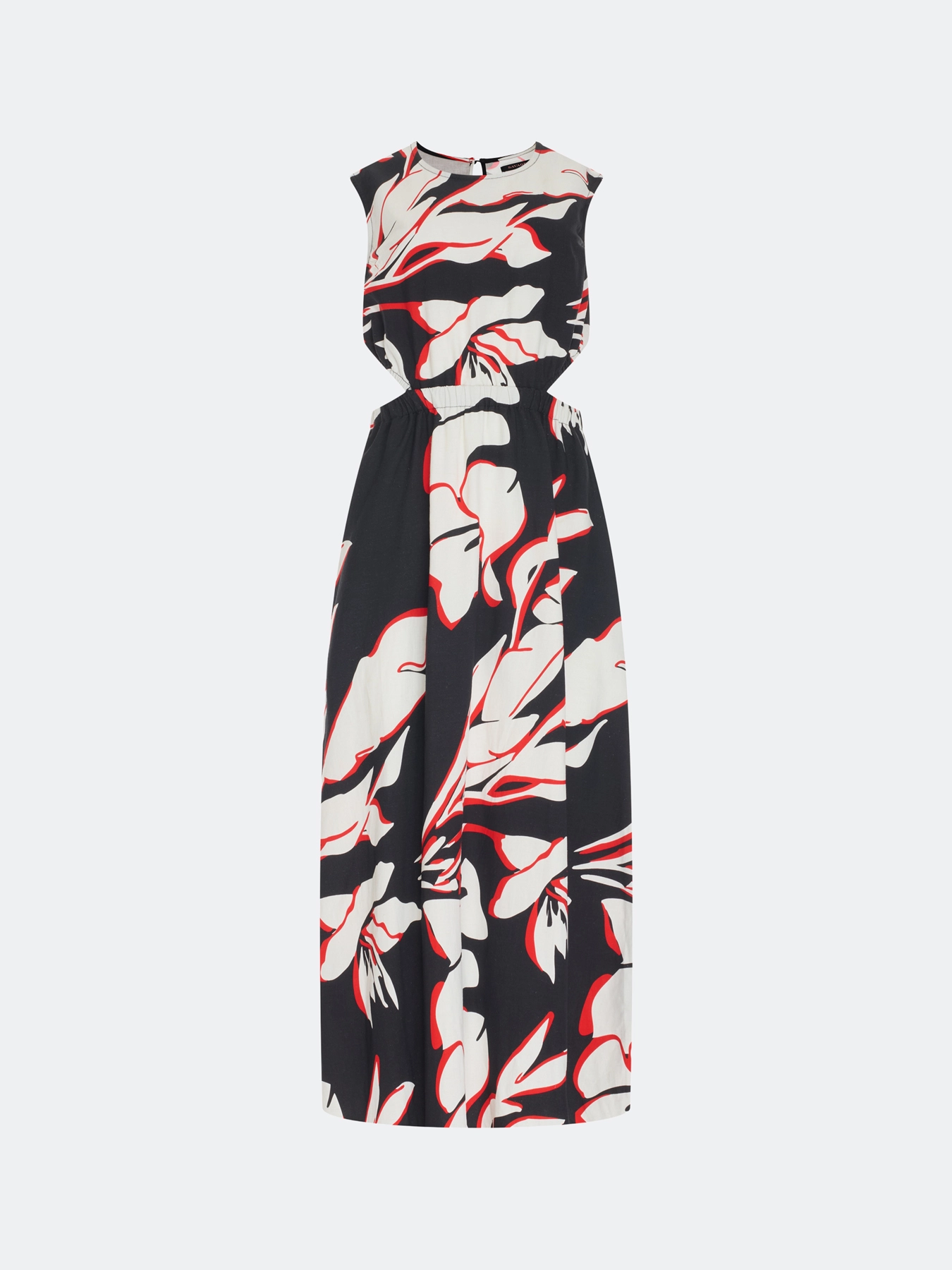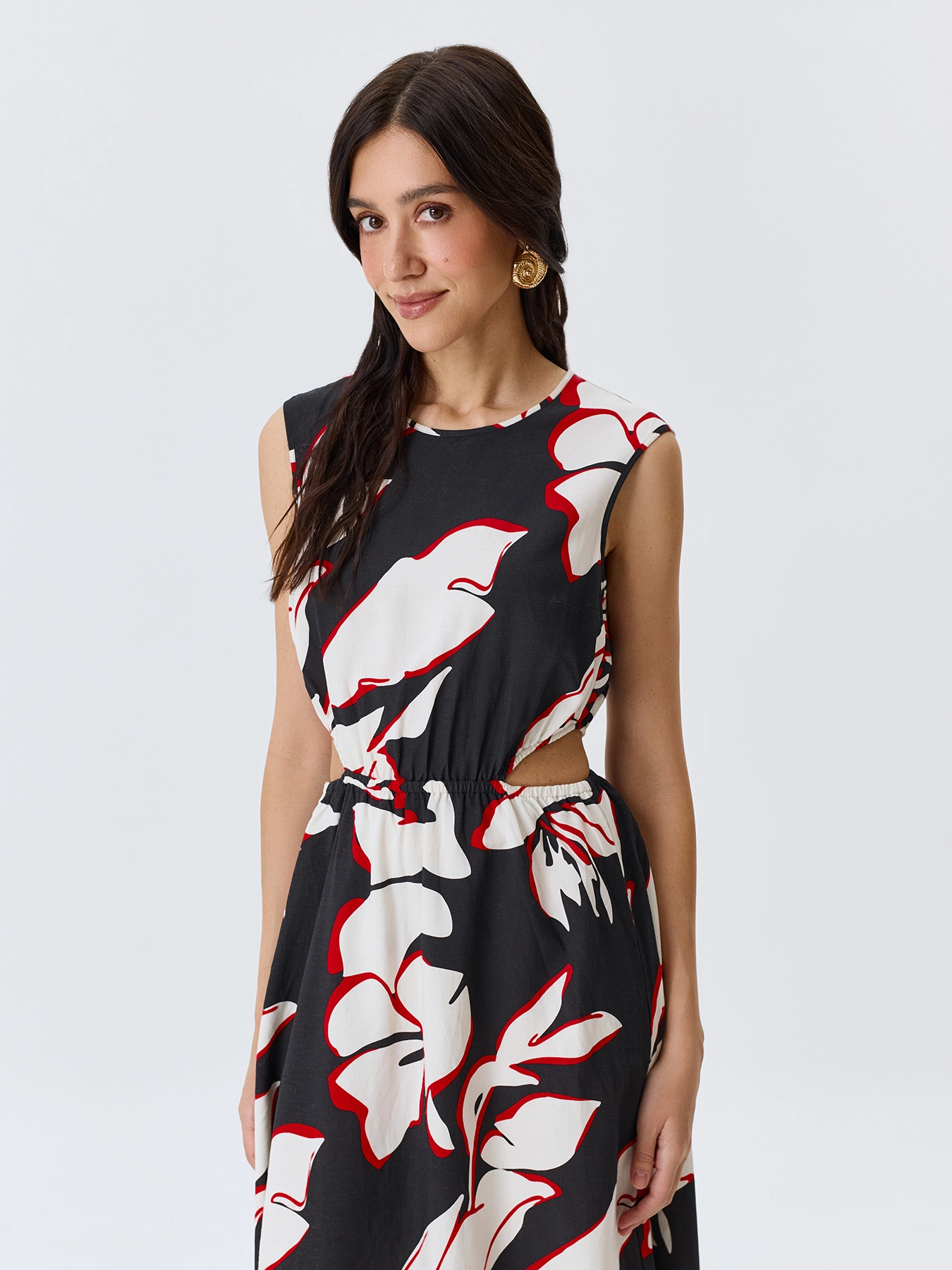 Яркое платье-миди с крупным флоральным принтом с акцентными вырезами по линии талии. Круглый вырез. Приталенный силуэт. Резинка по линии талии. Застежка на пуговицу. В составе тенсель и лен.