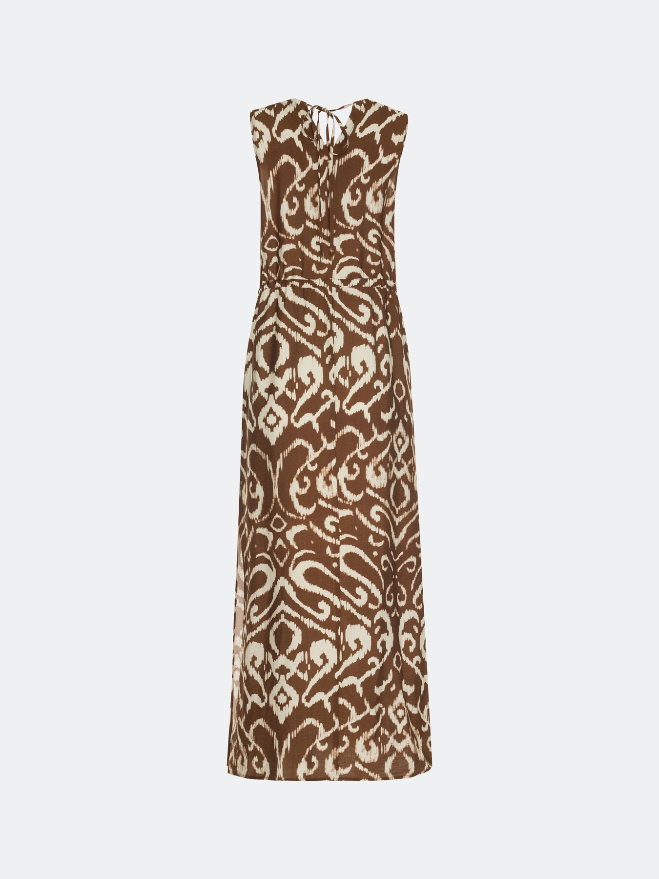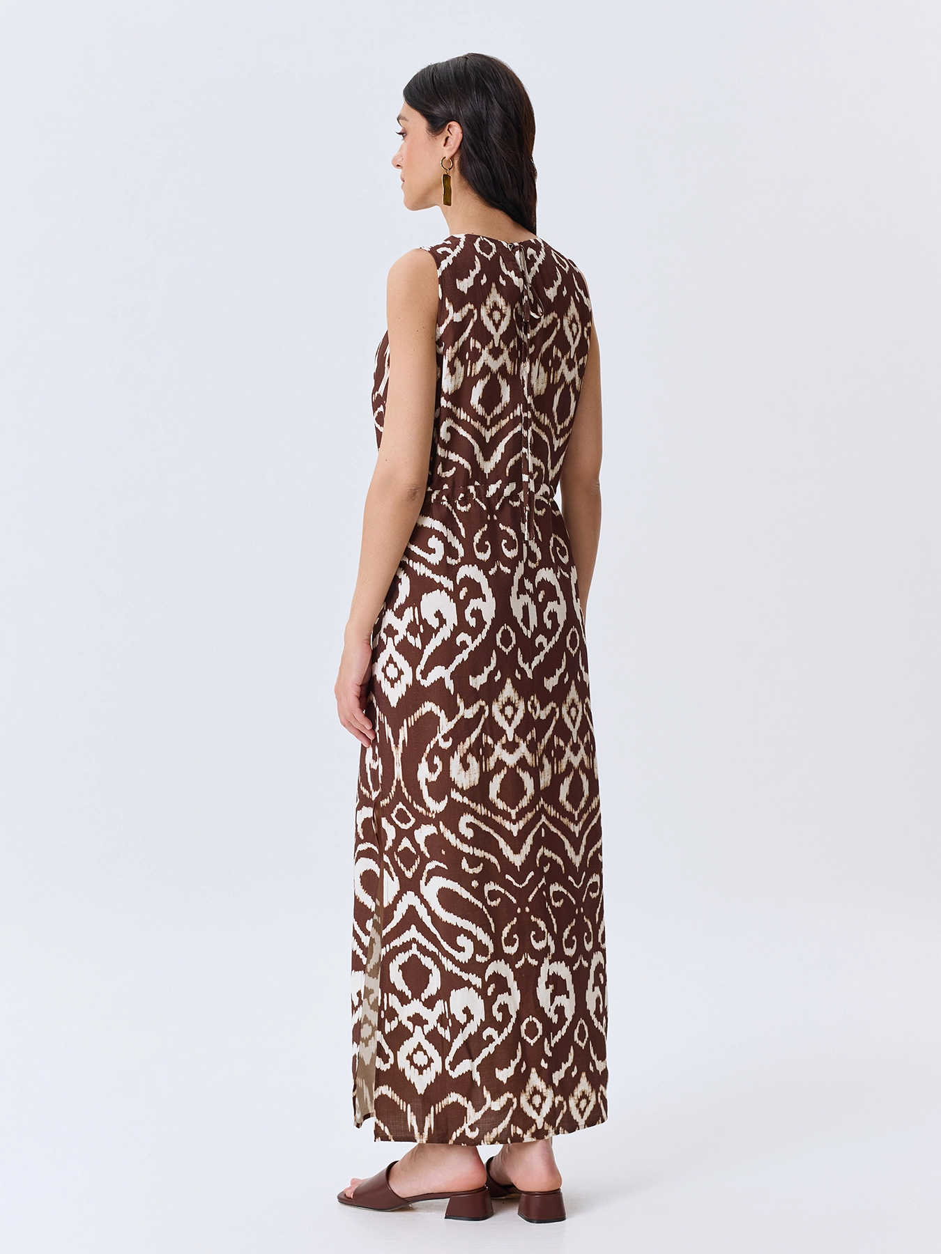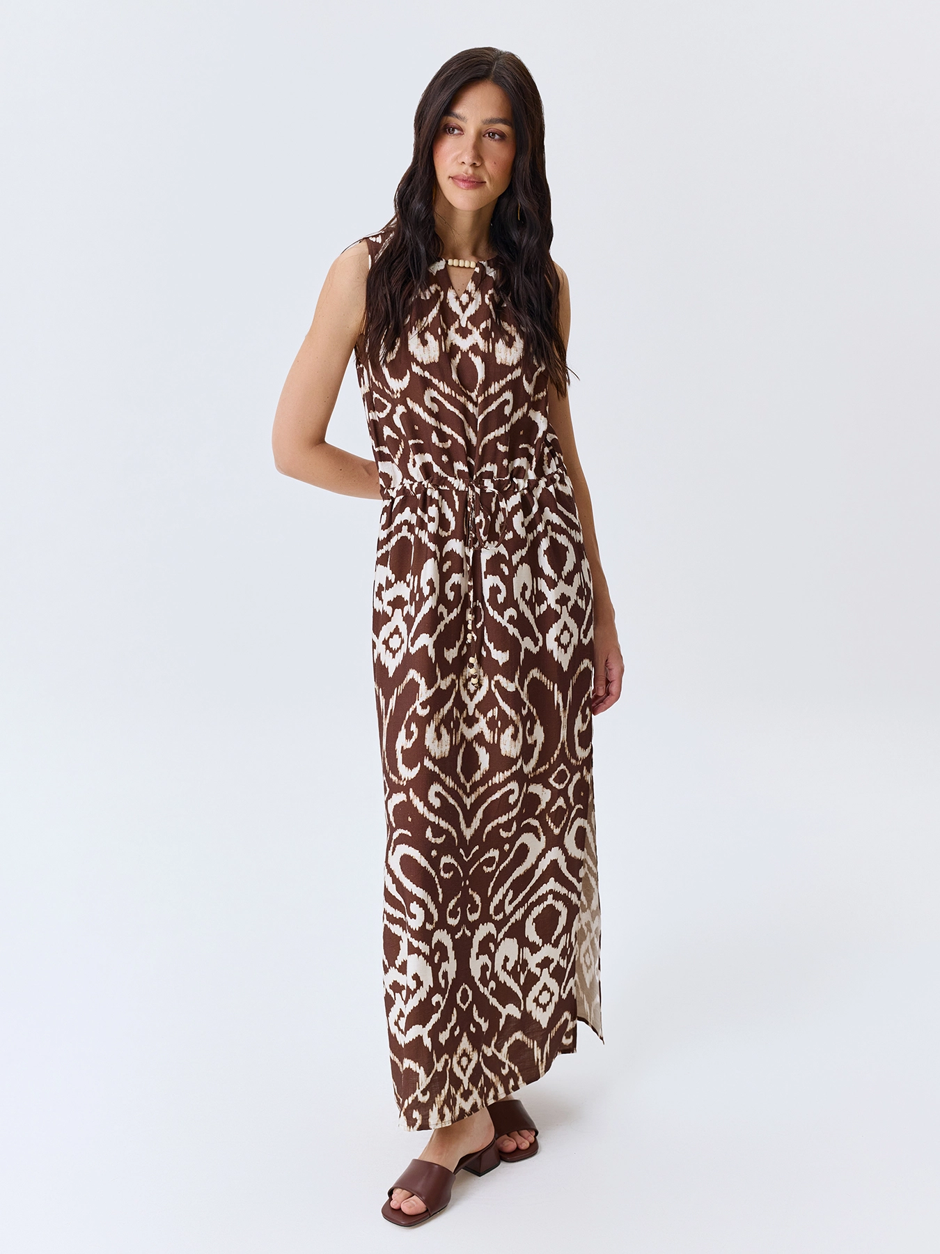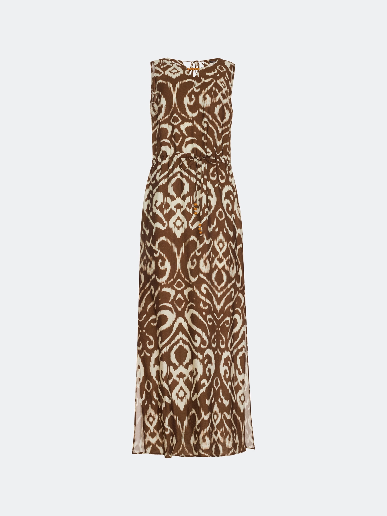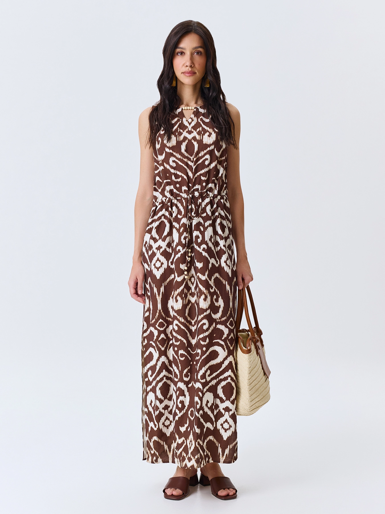 Платье-миди с этническим принтом. Свободный силуэт можно приталить тонким поясом. Круглая горловина дополнена вырезом с акцентными бусинами. Дополнено кулисой по линии талии. Завязка сзади на шнурок. Высокие разрезы в боковых швах. В составе модал.