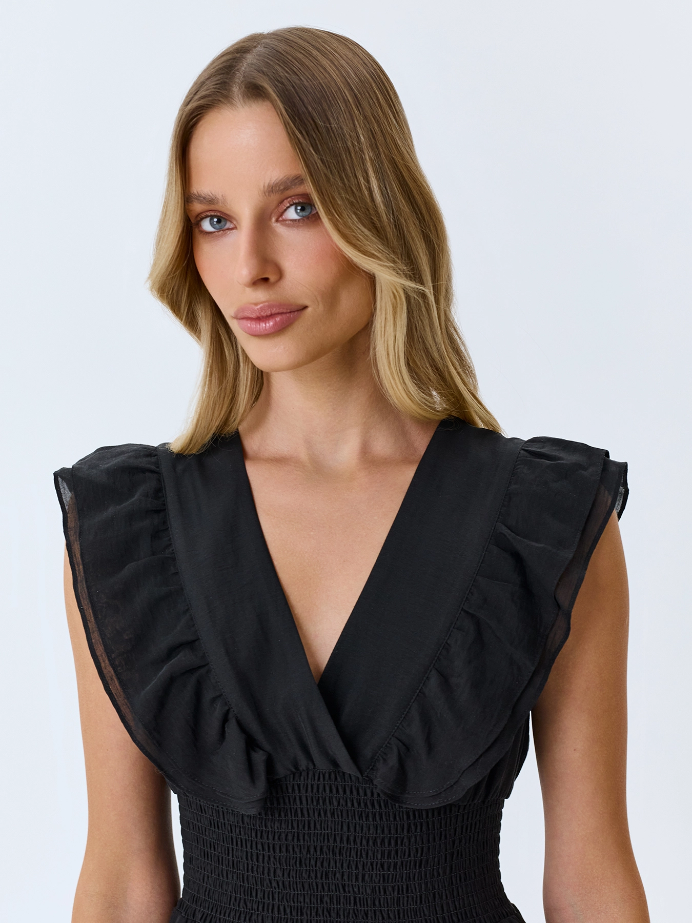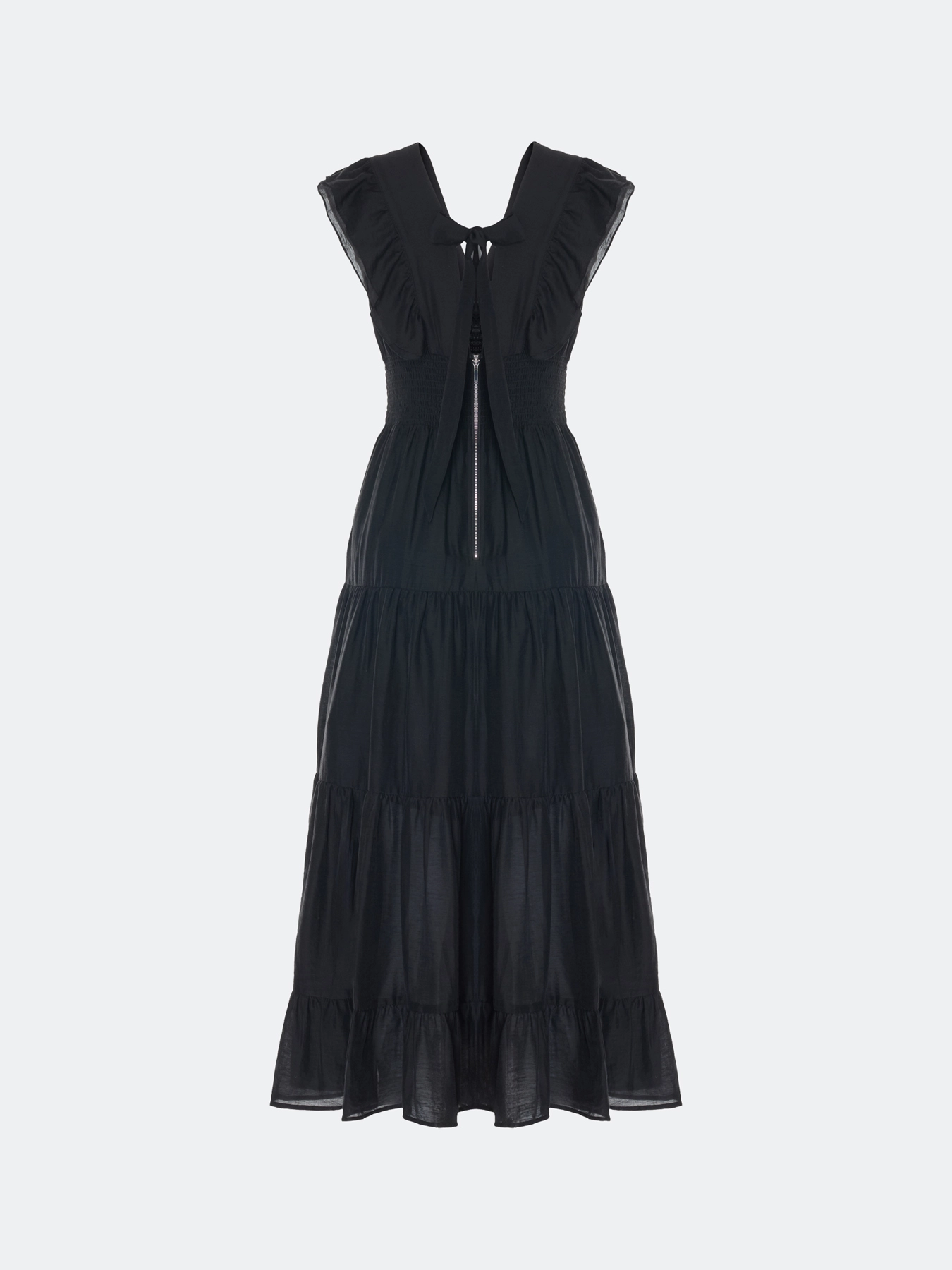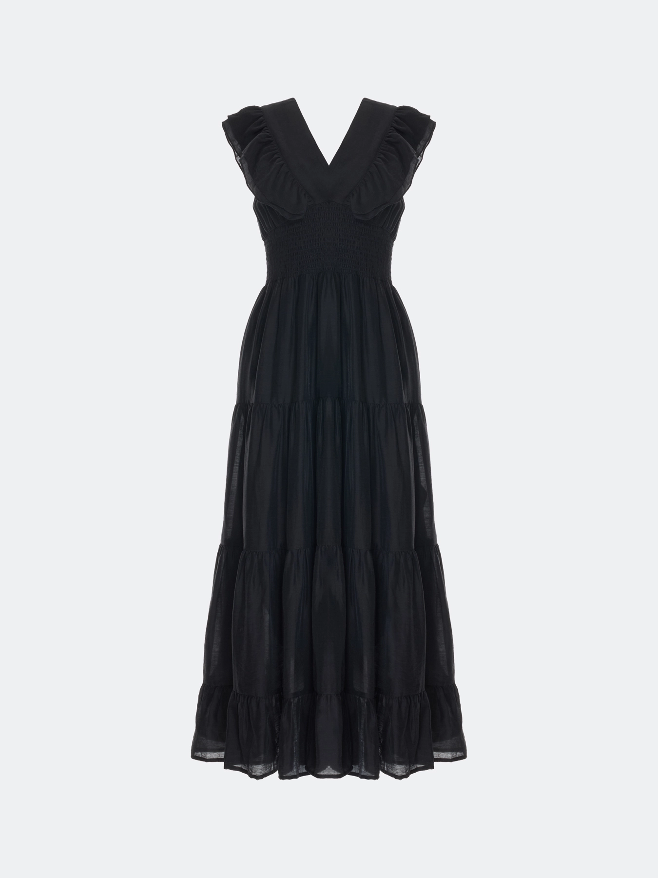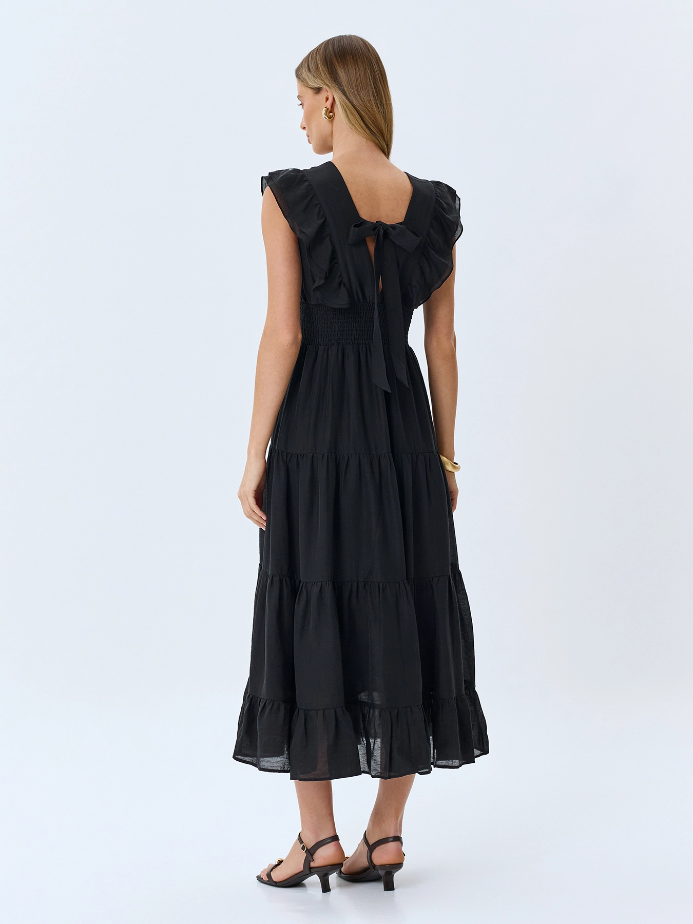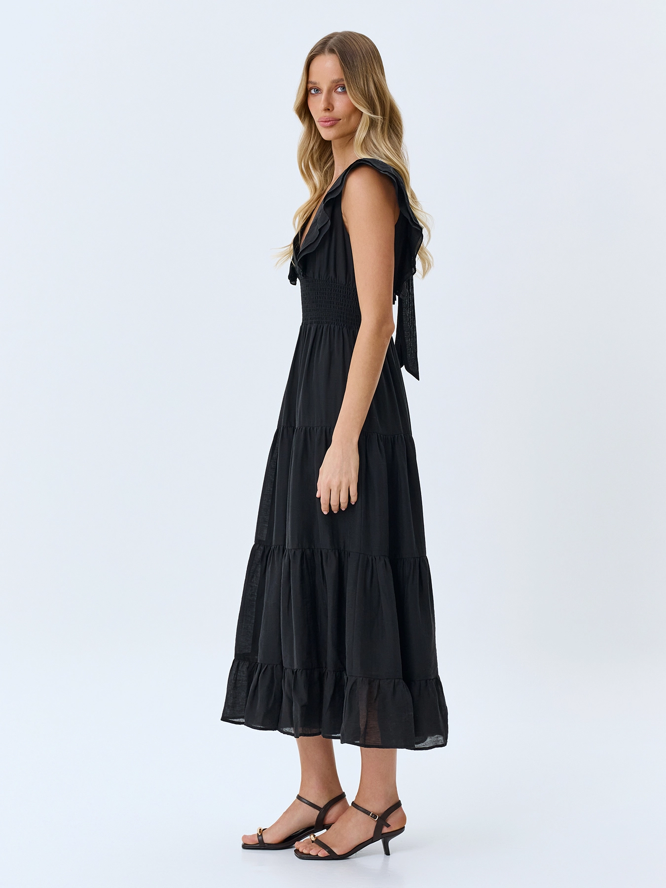 Платье с ярусными оборками из лиоцелла и льна. Приталенный силуэт. V-образный вырез и широкие бретели дополнены акцентными оборками. Летящая юбка А-силуэта. Застежка на ленты и молнию. Подкладка из 100% хлопка.