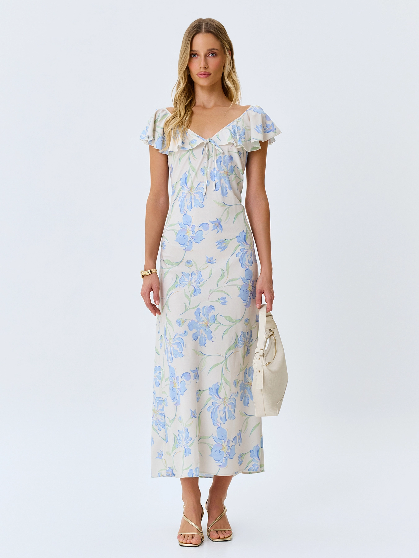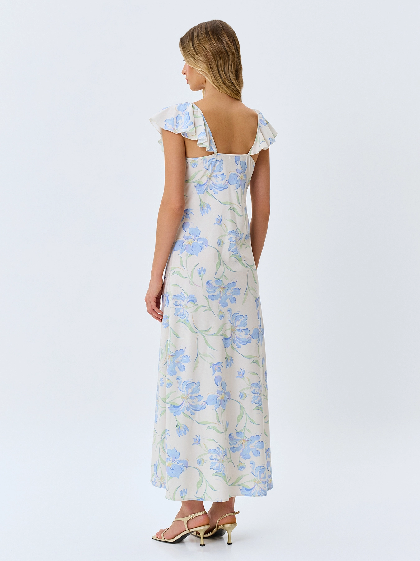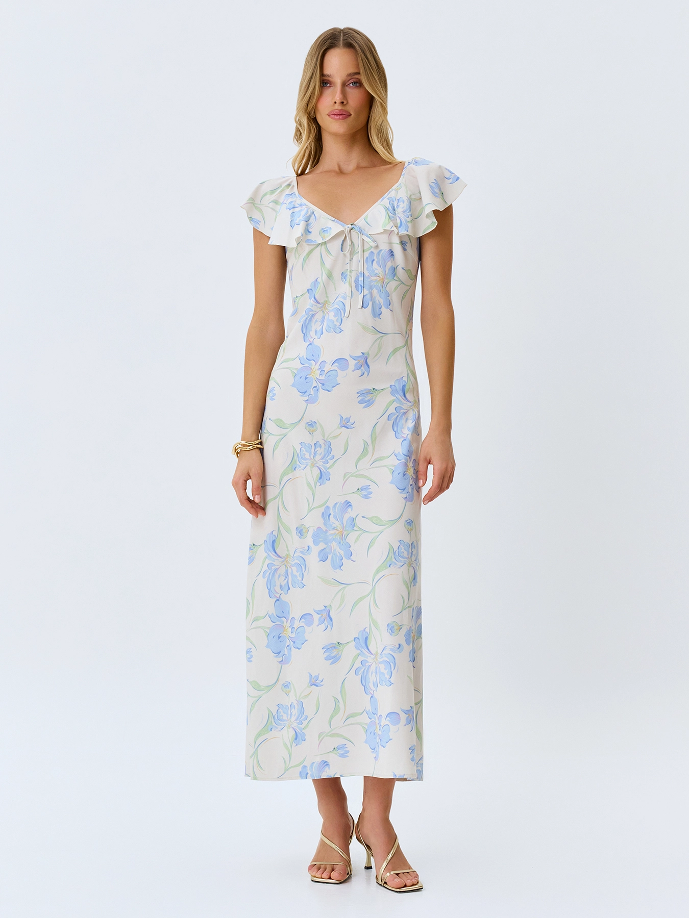 Романтичное платье с флоральным принтом. Длина миди. Приталенный силуэт и крой по косой. V-образный вырез с тонкими бретелями и воланами. Застежка на молнию.