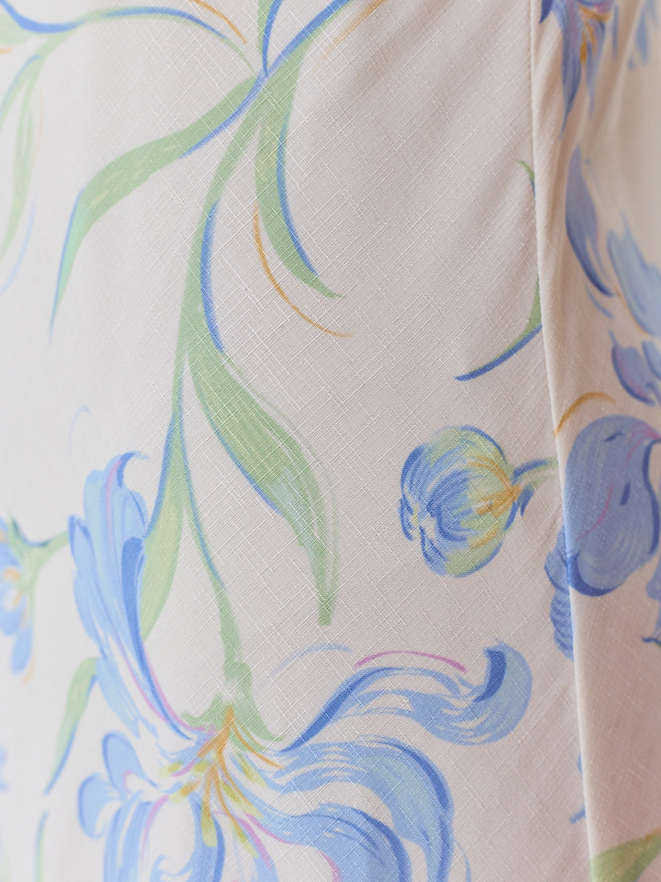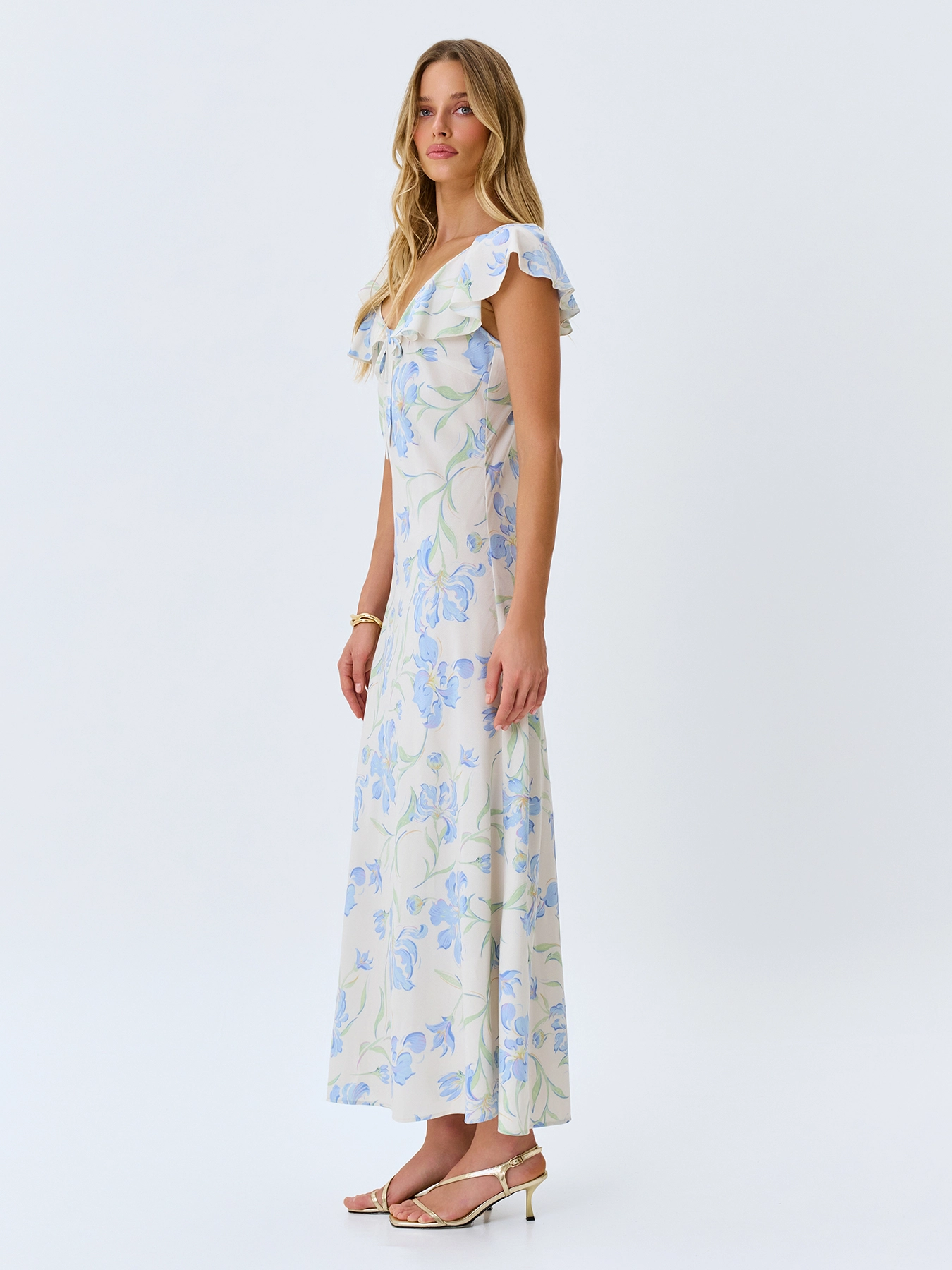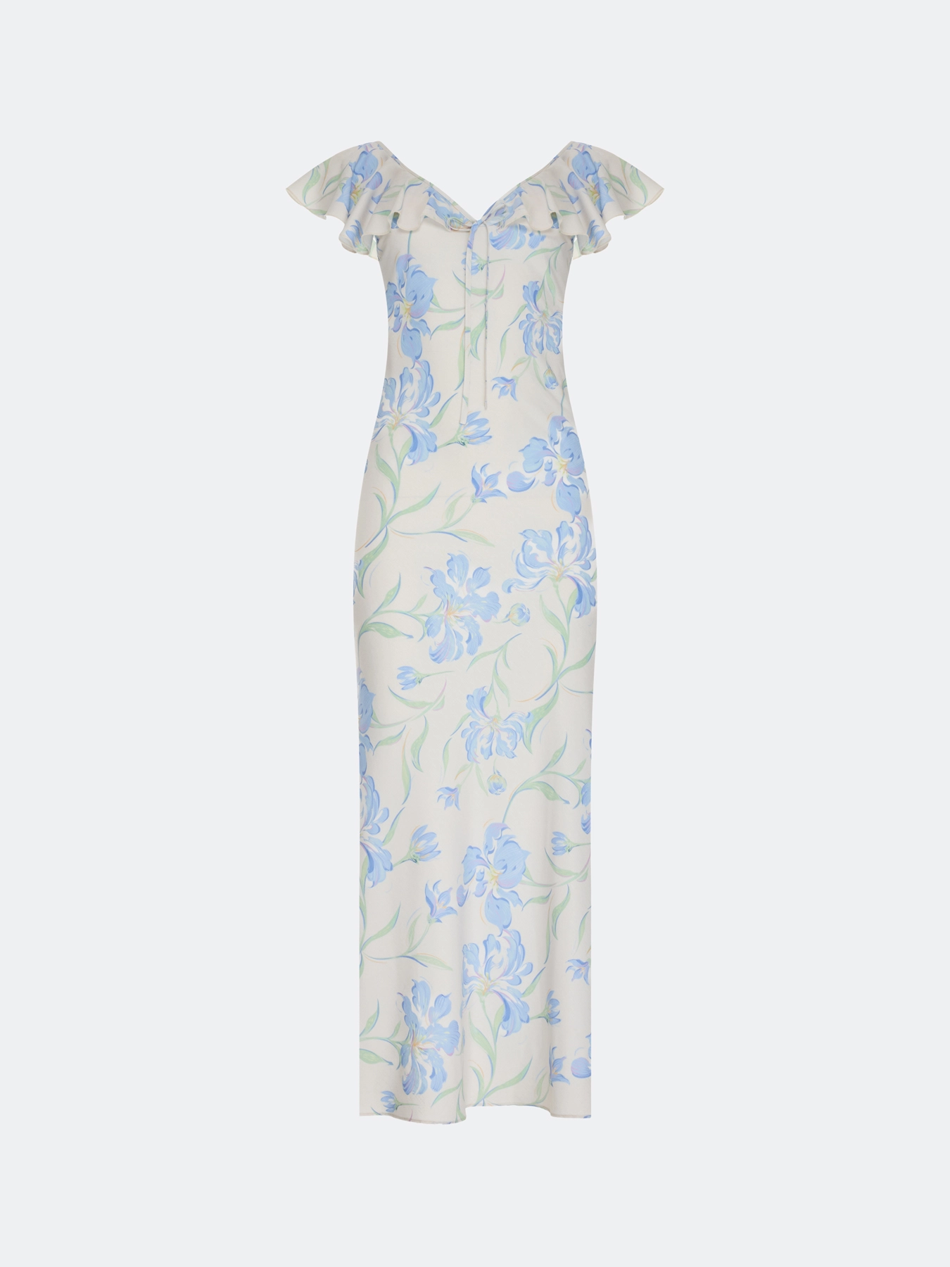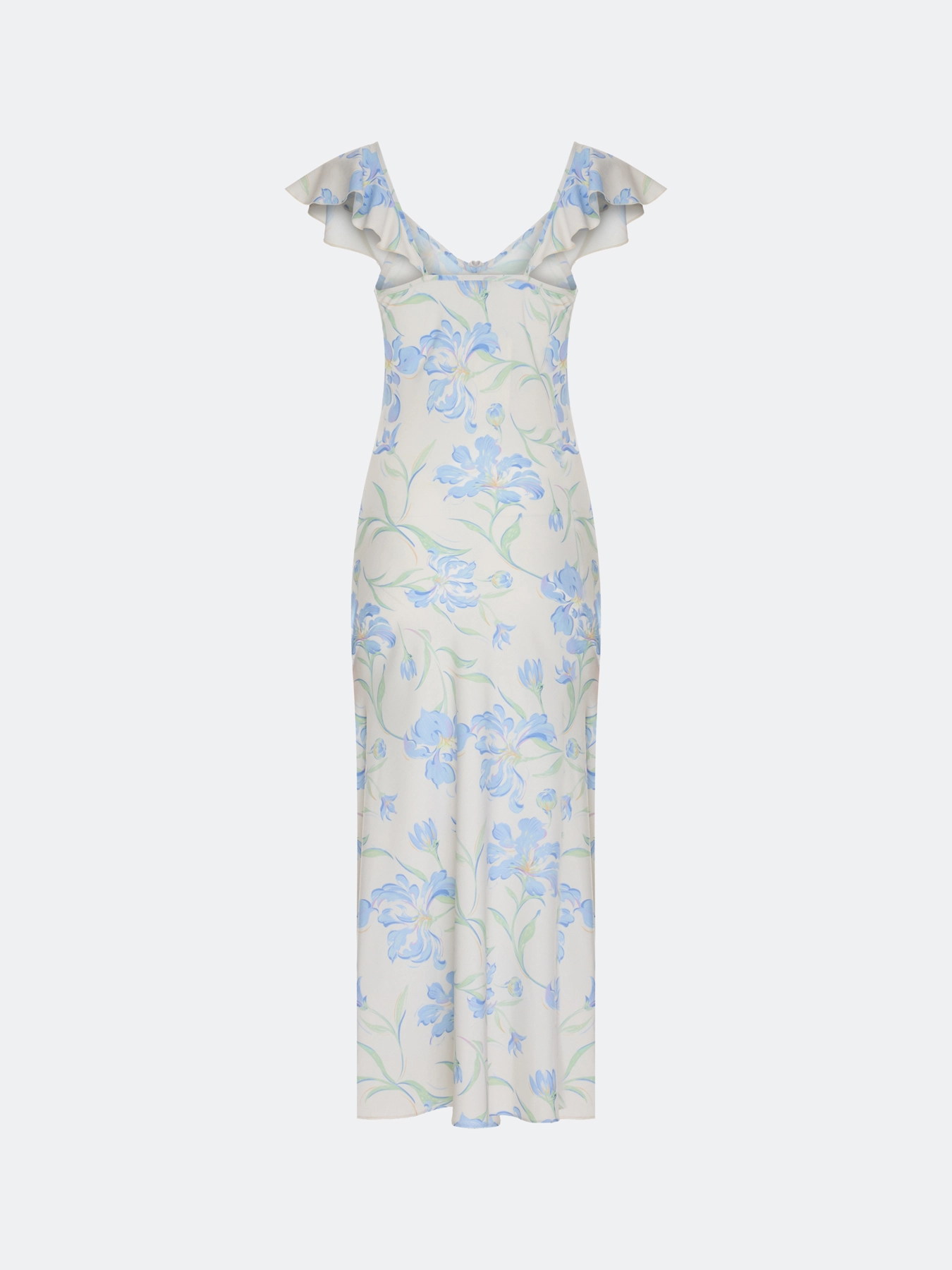 Романтичное платье с флоральным принтом. Длина миди. Приталенный силуэт и крой по косой. V-образный вырез с тонкими бретелями и воланами. Застежка на молнию.