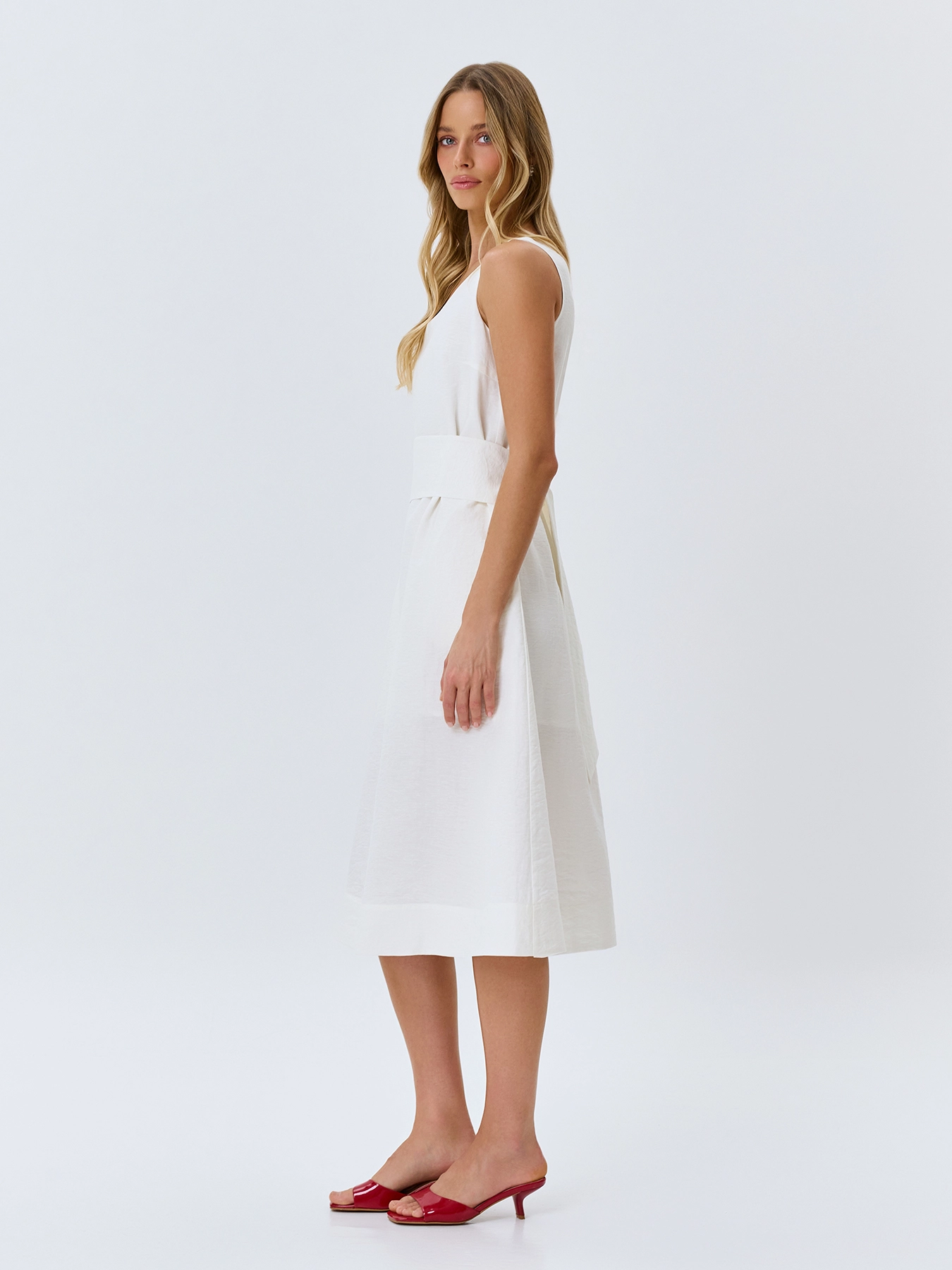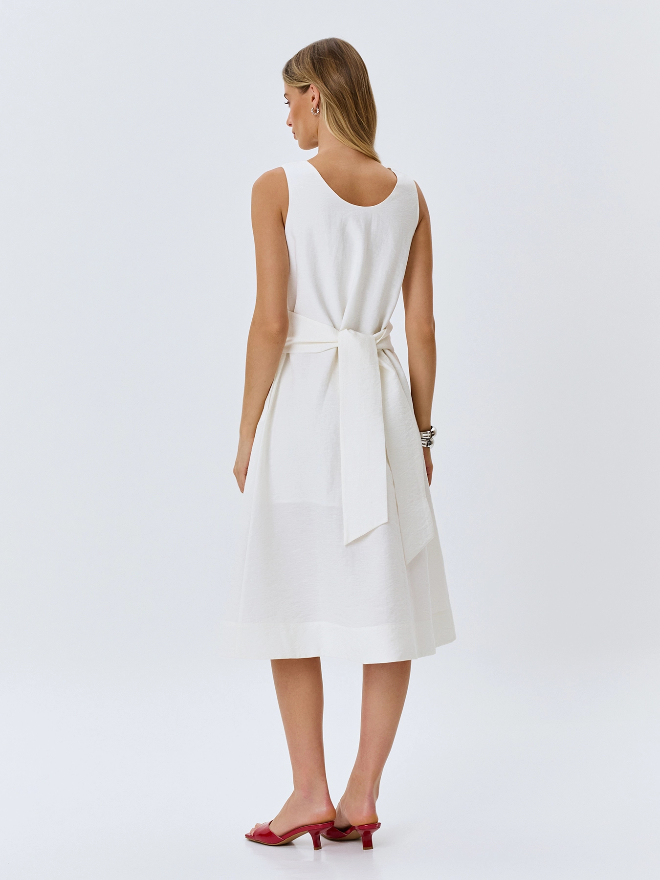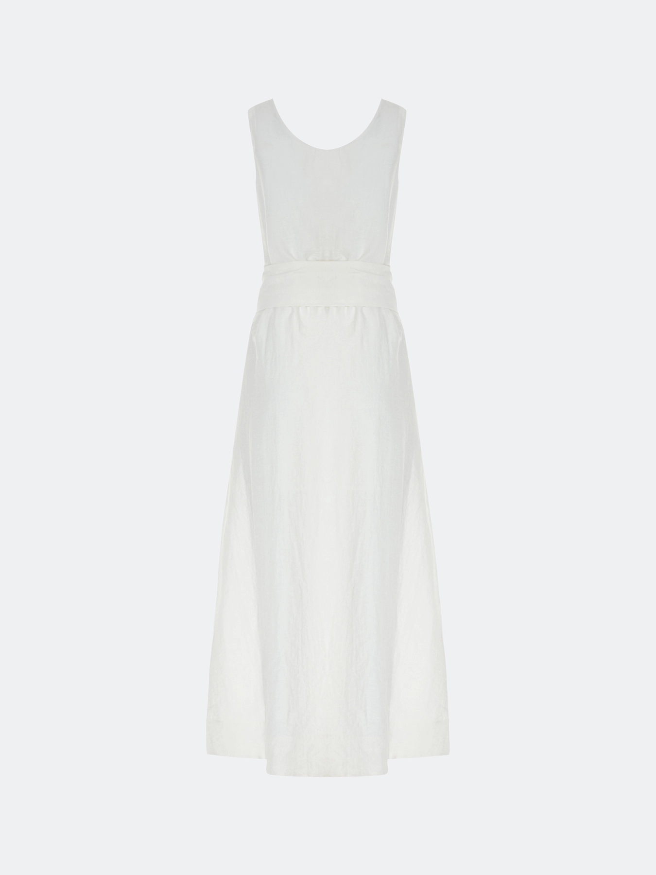 Платье-миди из района и льна. Свободный силуэт можно приталить акцентным широким поясом. Круглый вырез и широкие бретели. Боковые карманы в швах. Подкладка из 100% вискозы.