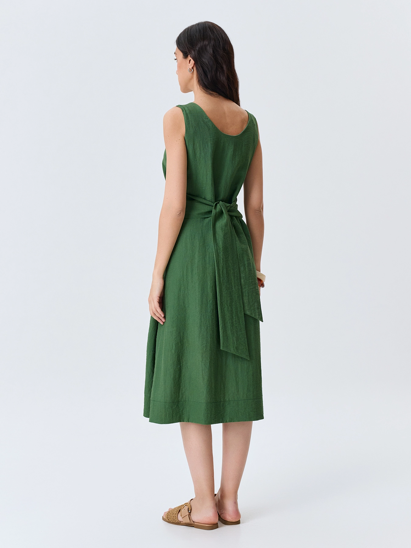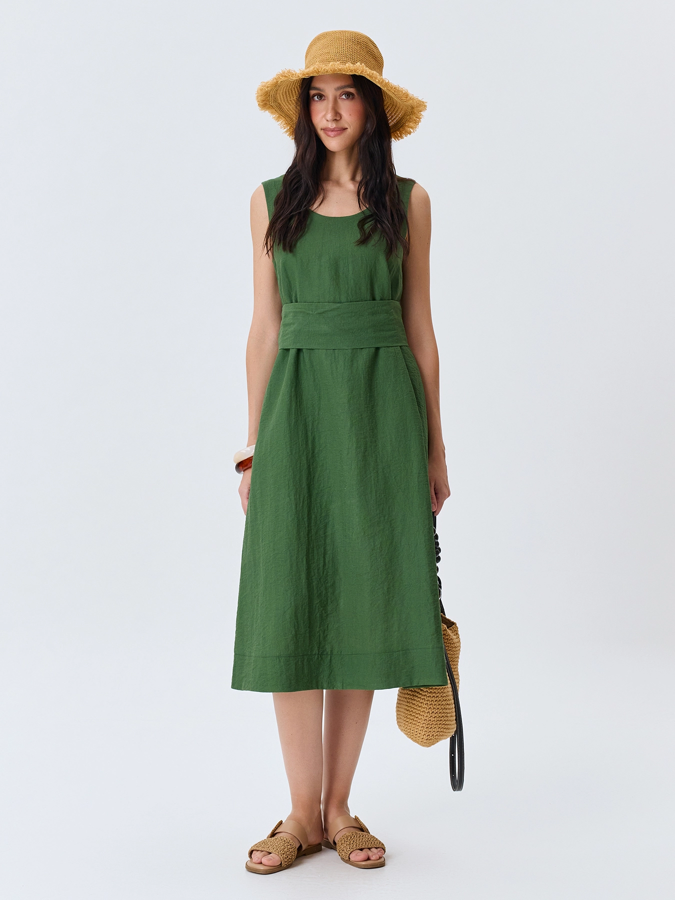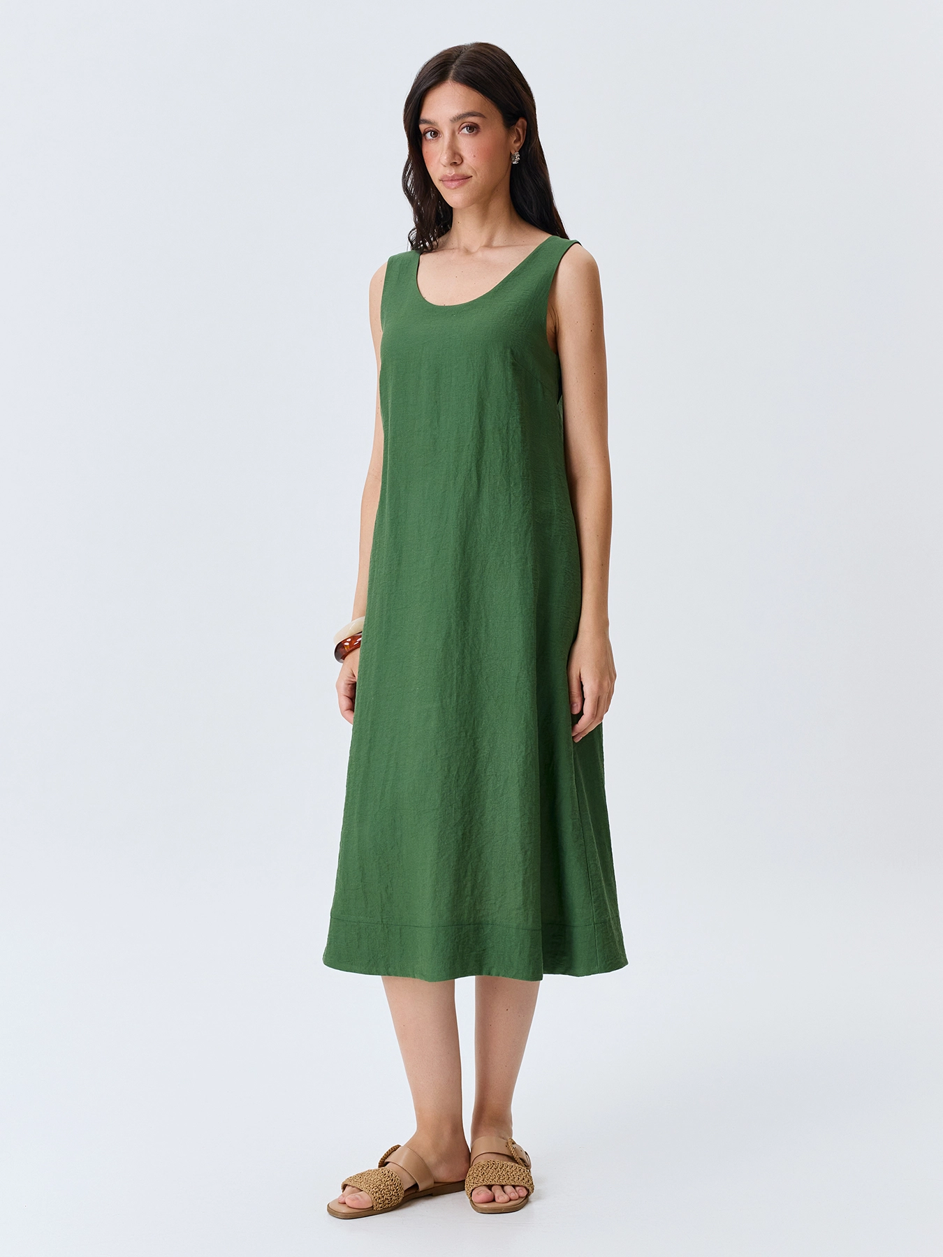 Платье-миди из района и льна. Свободный силуэт можно приталить акцентным широким поясом. Круглый вырез и широкие бретели. Боковые карманы в швах. Подкладка из 100% вискозы.