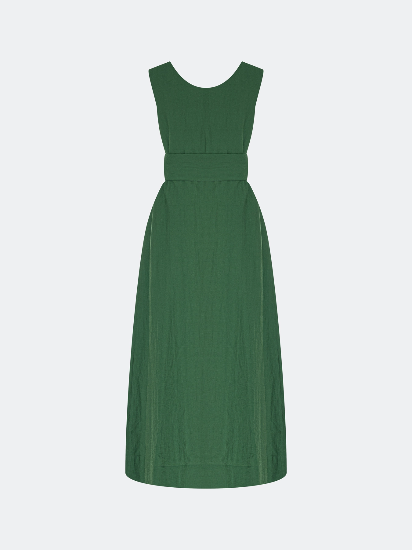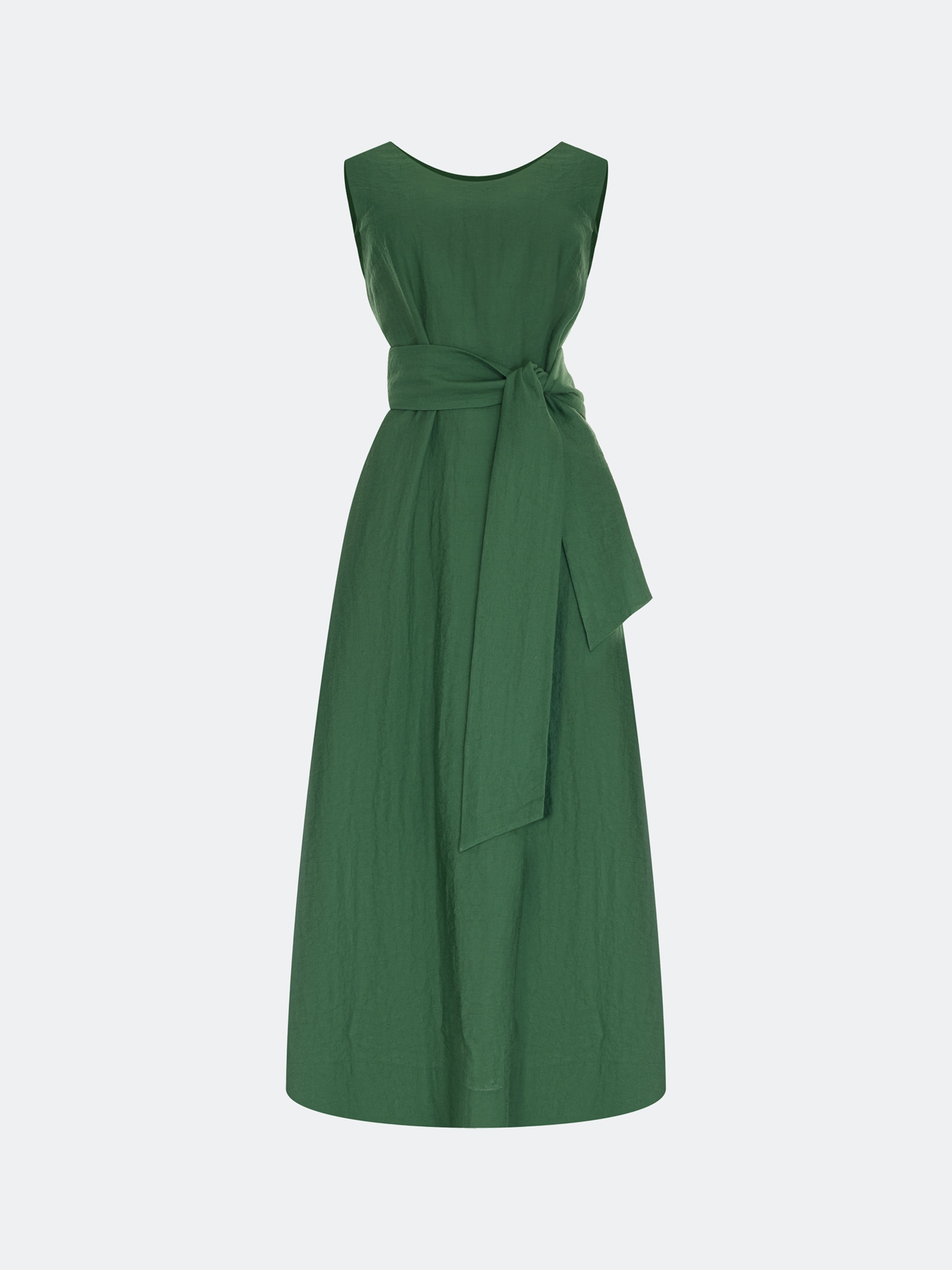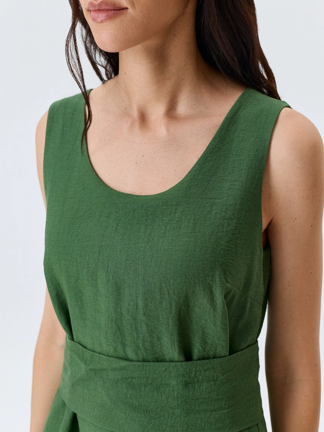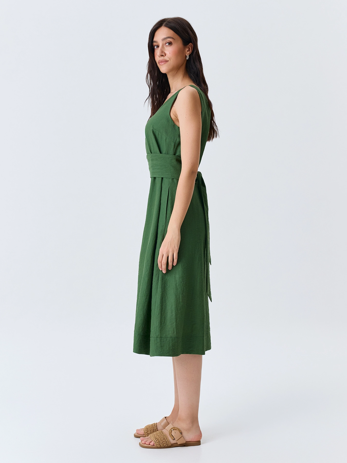 Платье-миди из района и льна. Свободный силуэт можно приталить акцентным широким поясом. Круглый вырез и широкие бретели. Боковые карманы в швах. Подкладка из 100% вискозы.
