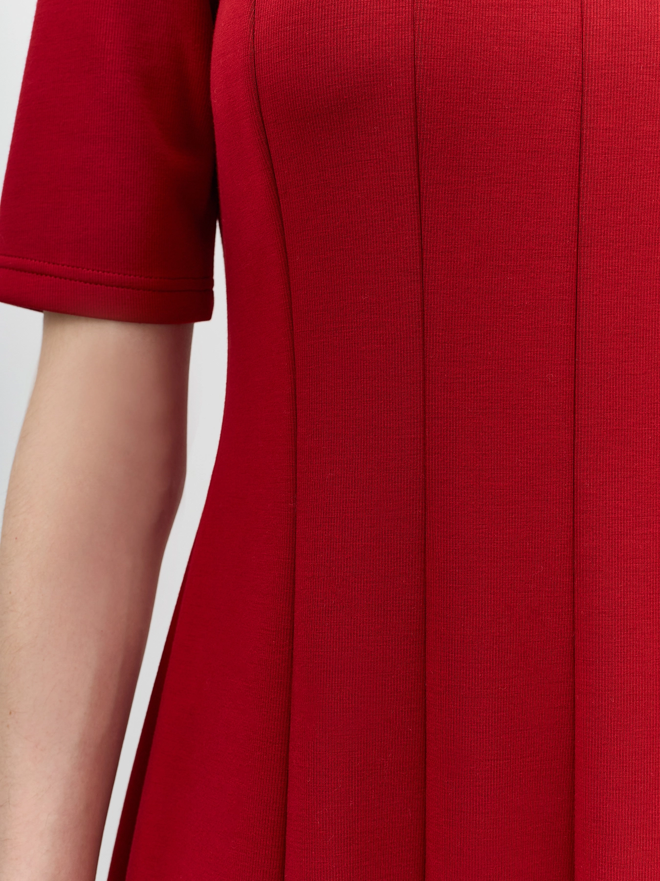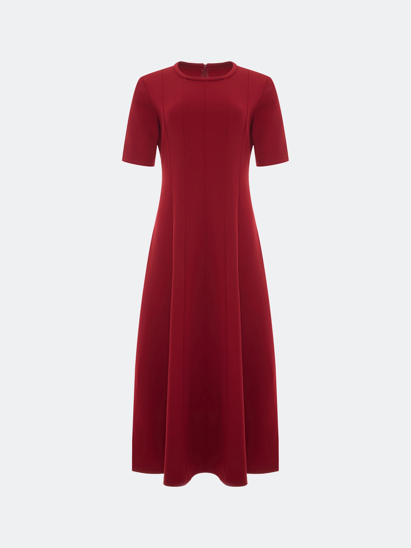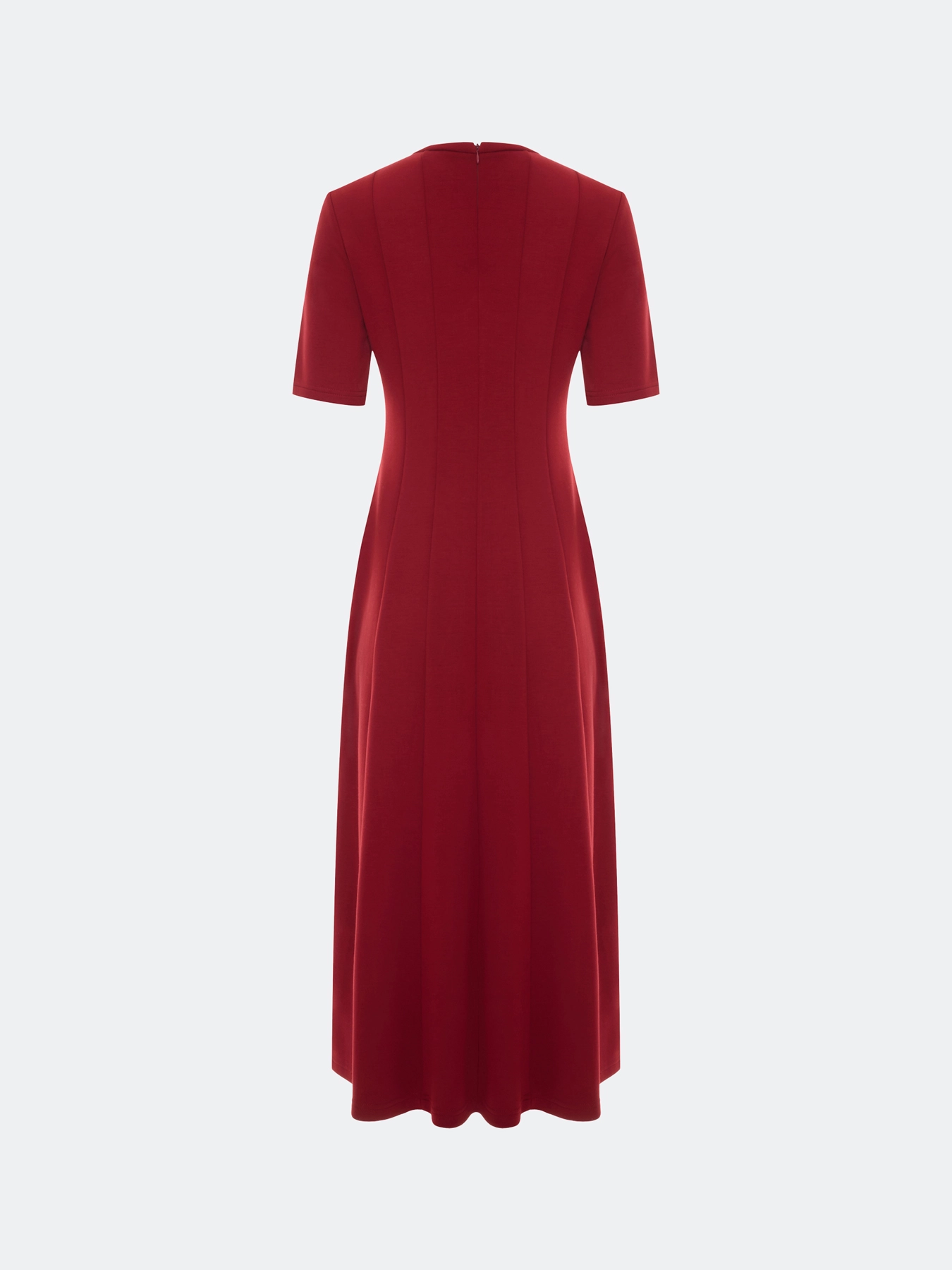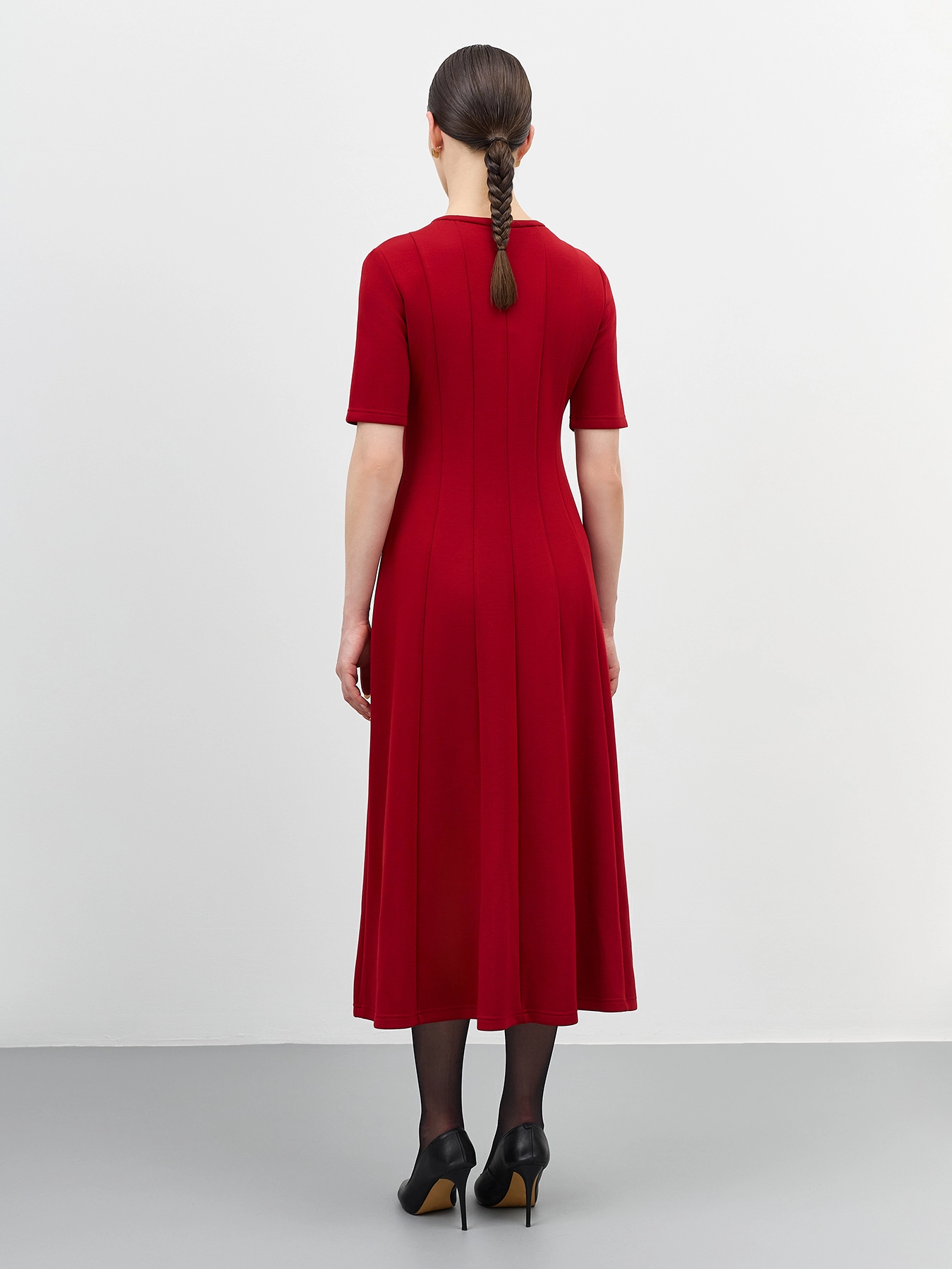 Трикотажное платье из смесовой вискозы. Вертикальные рельефы задают приталенный силуэт. Длина макси. Круглый вырез. Короткий рукав.