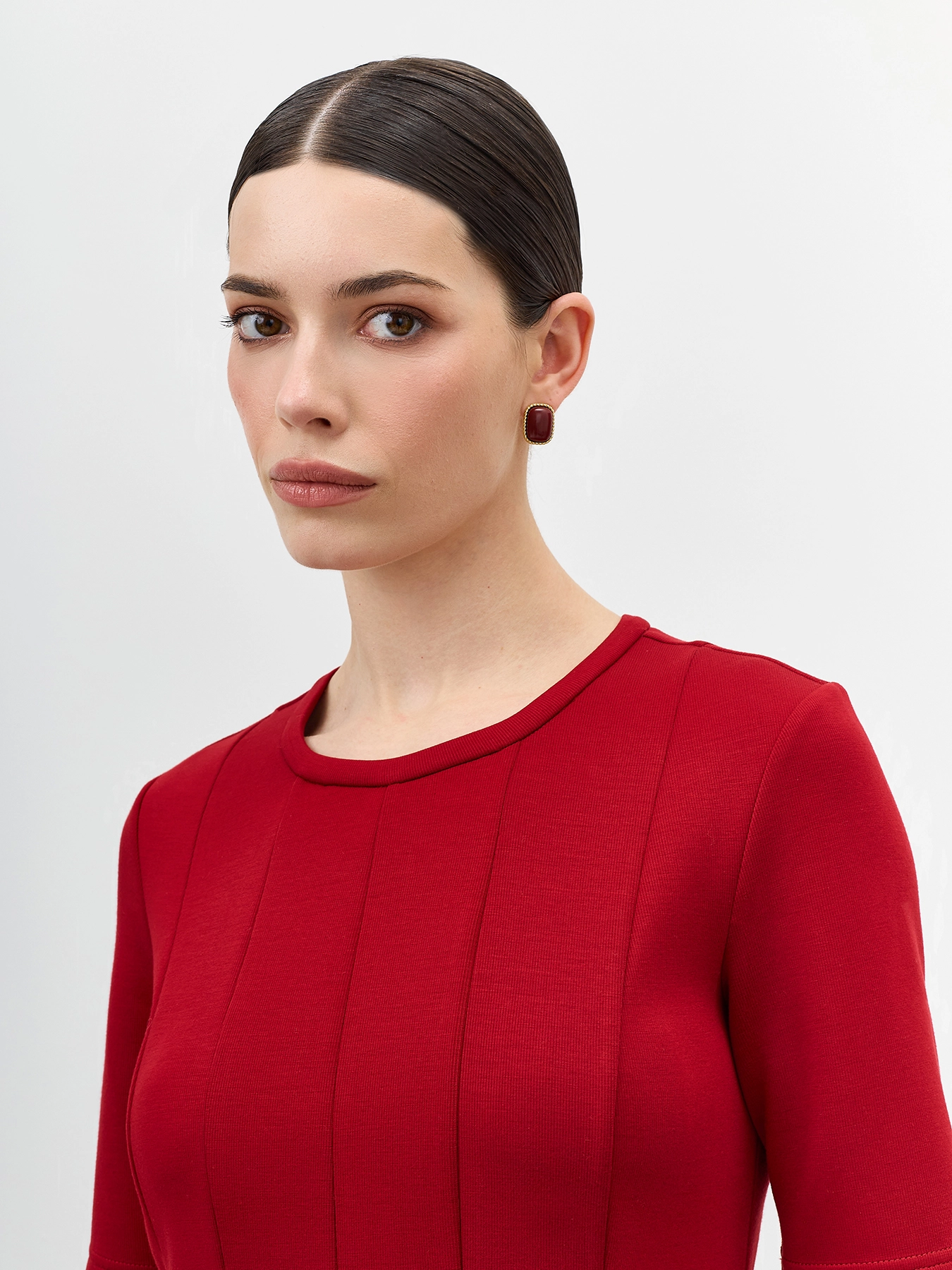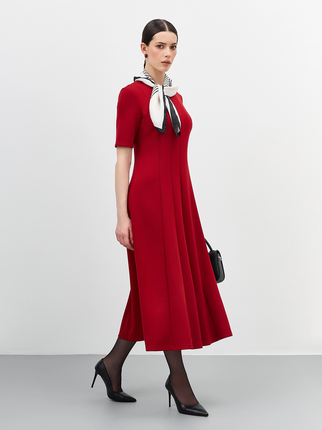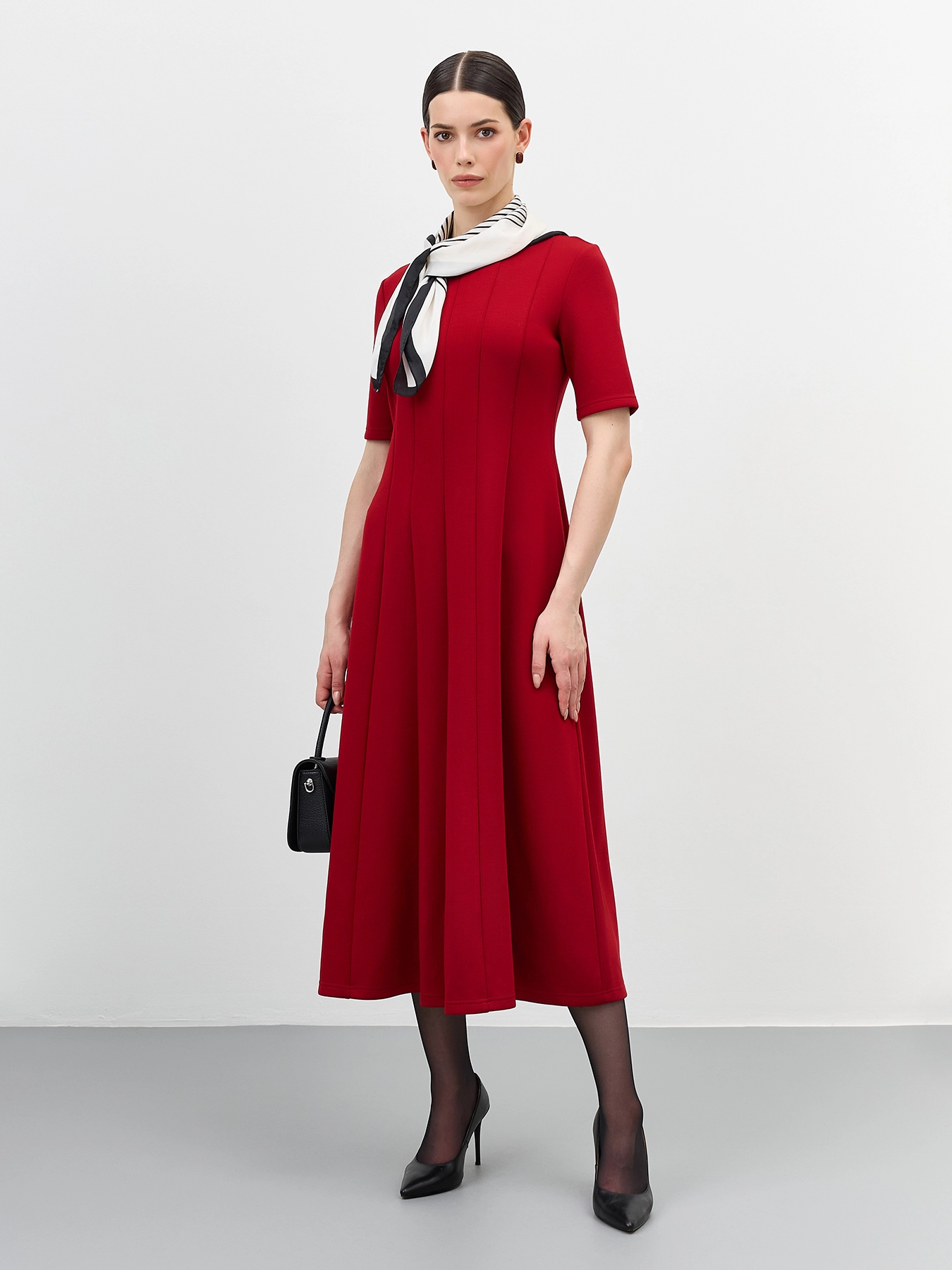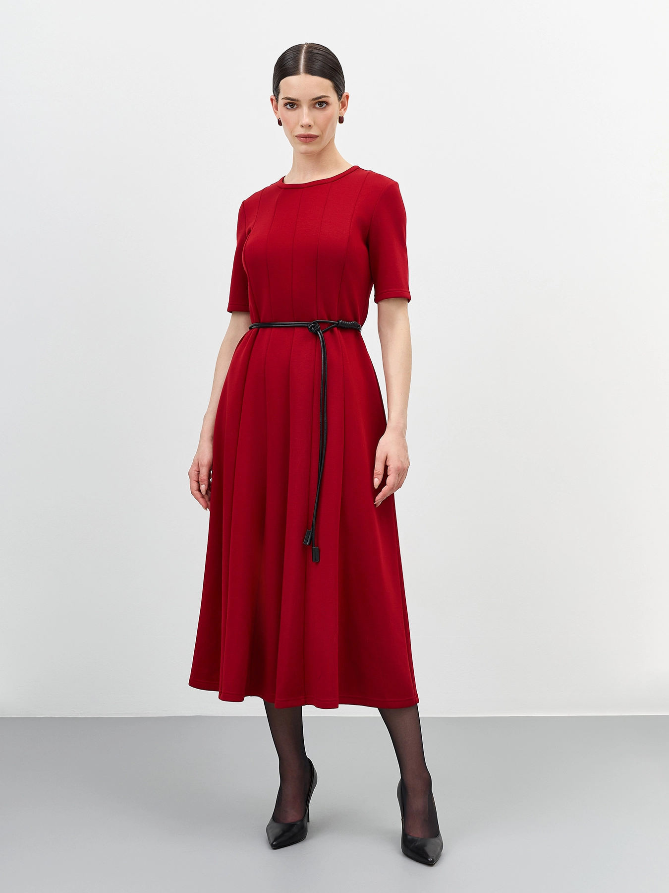 Трикотажное платье из смесовой вискозы. Вертикальные рельефы задают приталенный силуэт. Длина макси. Круглый вырез. Короткий рукав.