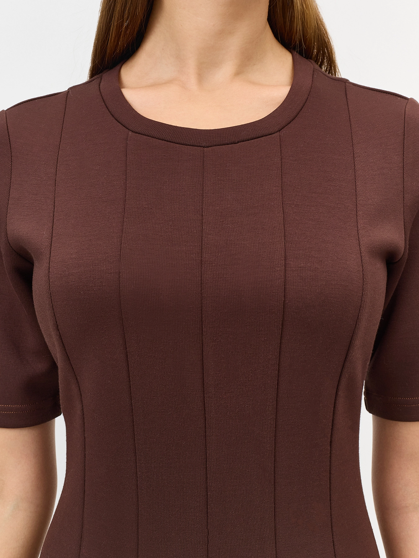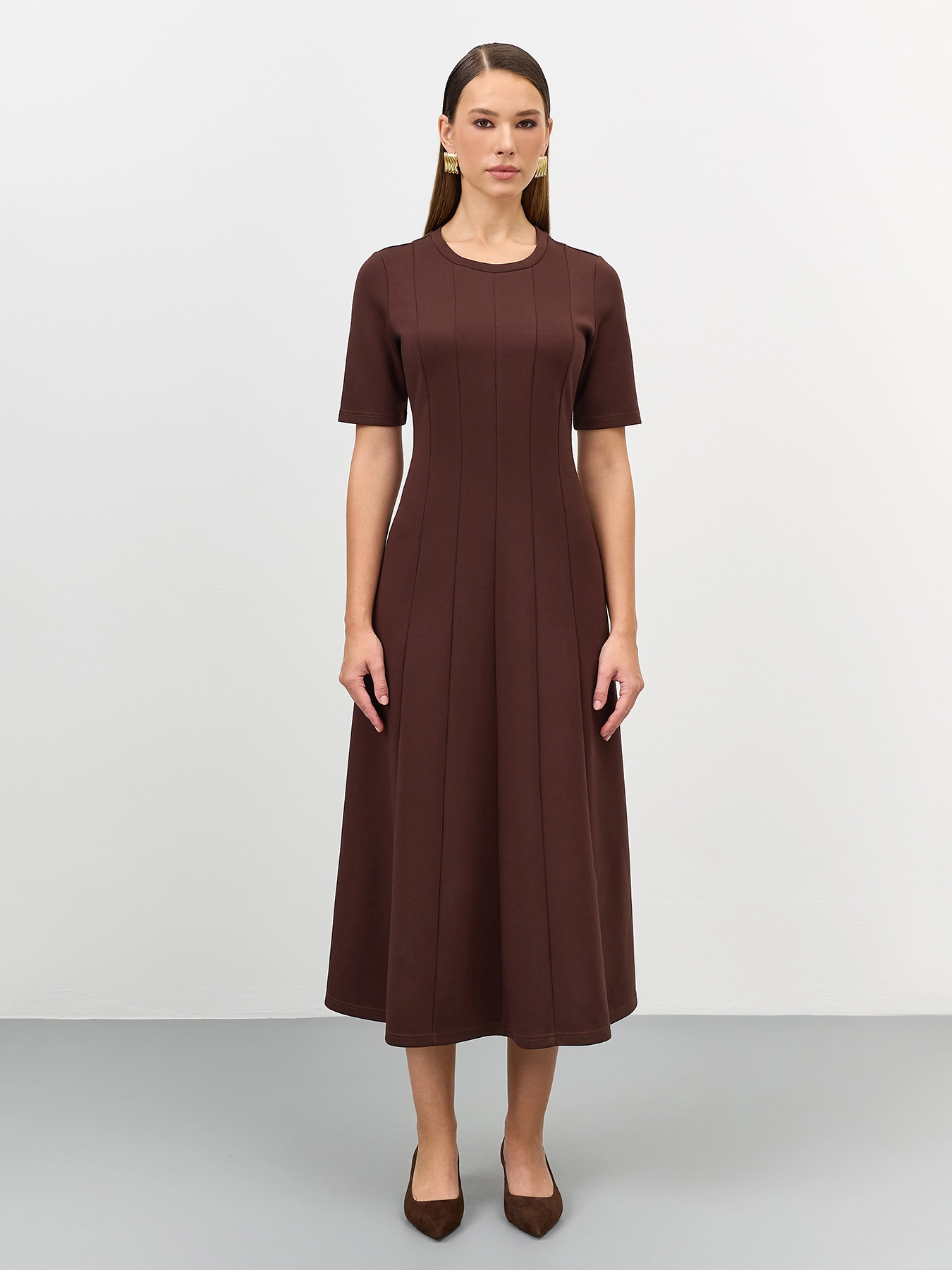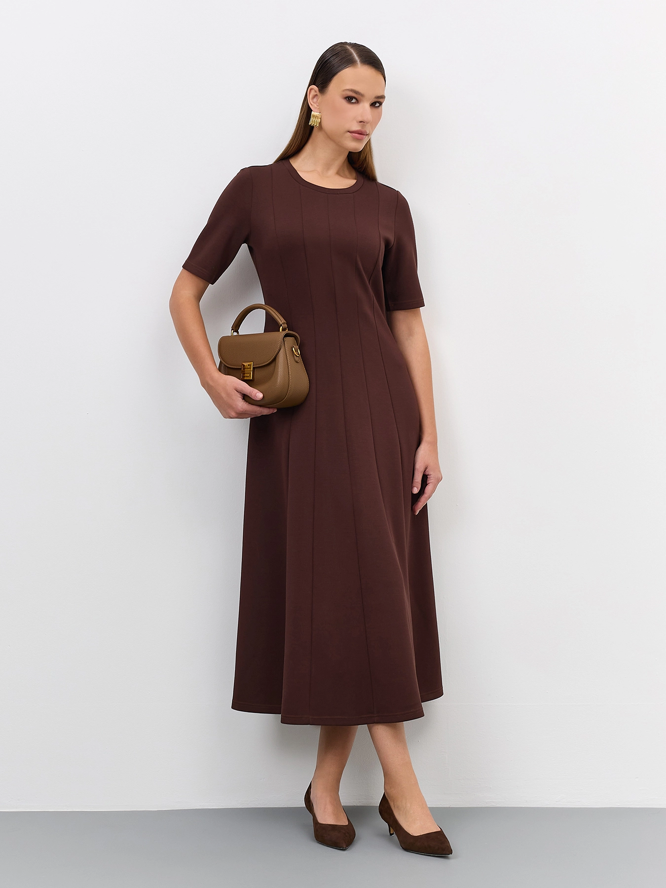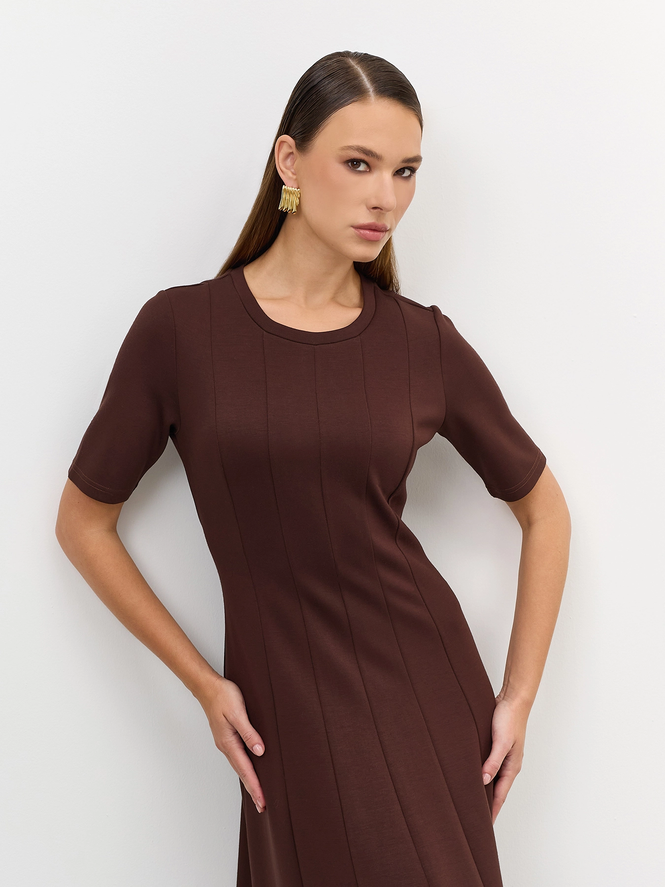 Трикотажное платье из смесовой вискозы. Вертикальные рельефы задают приталенный силуэт. Длина макси. Круглый вырез. Короткий рукав.