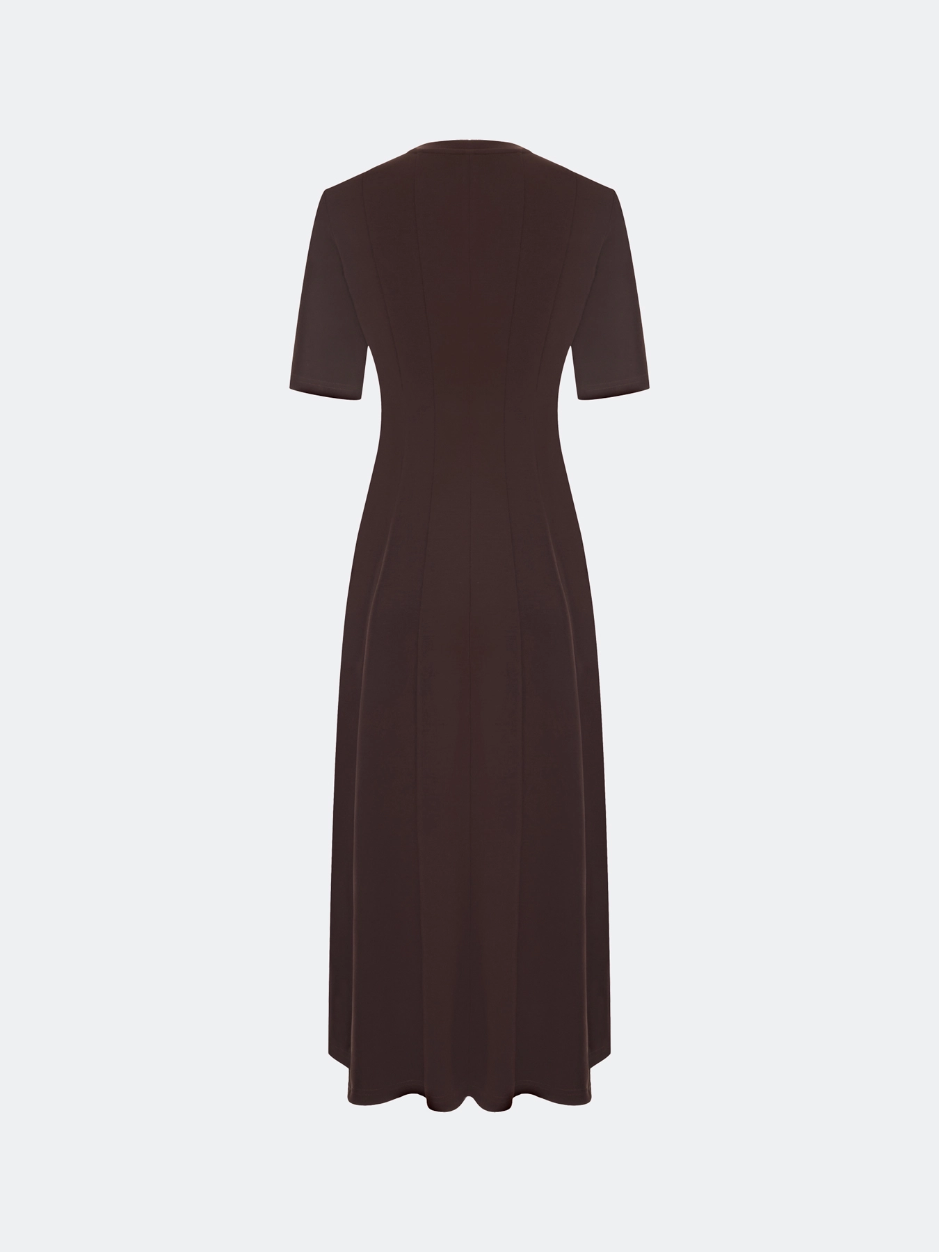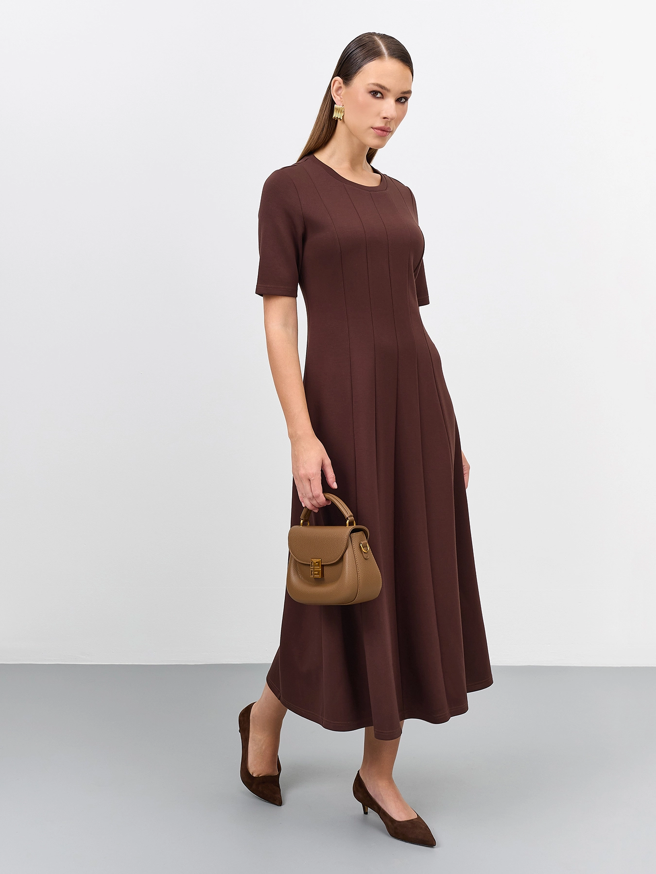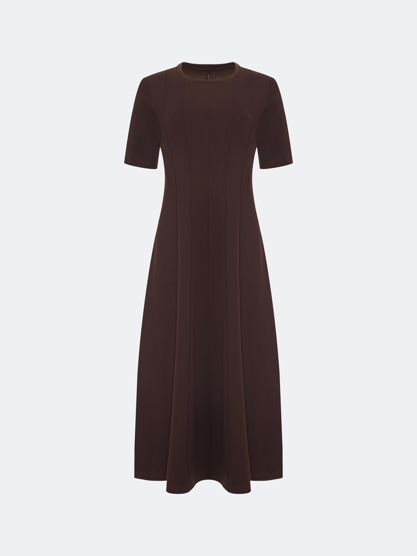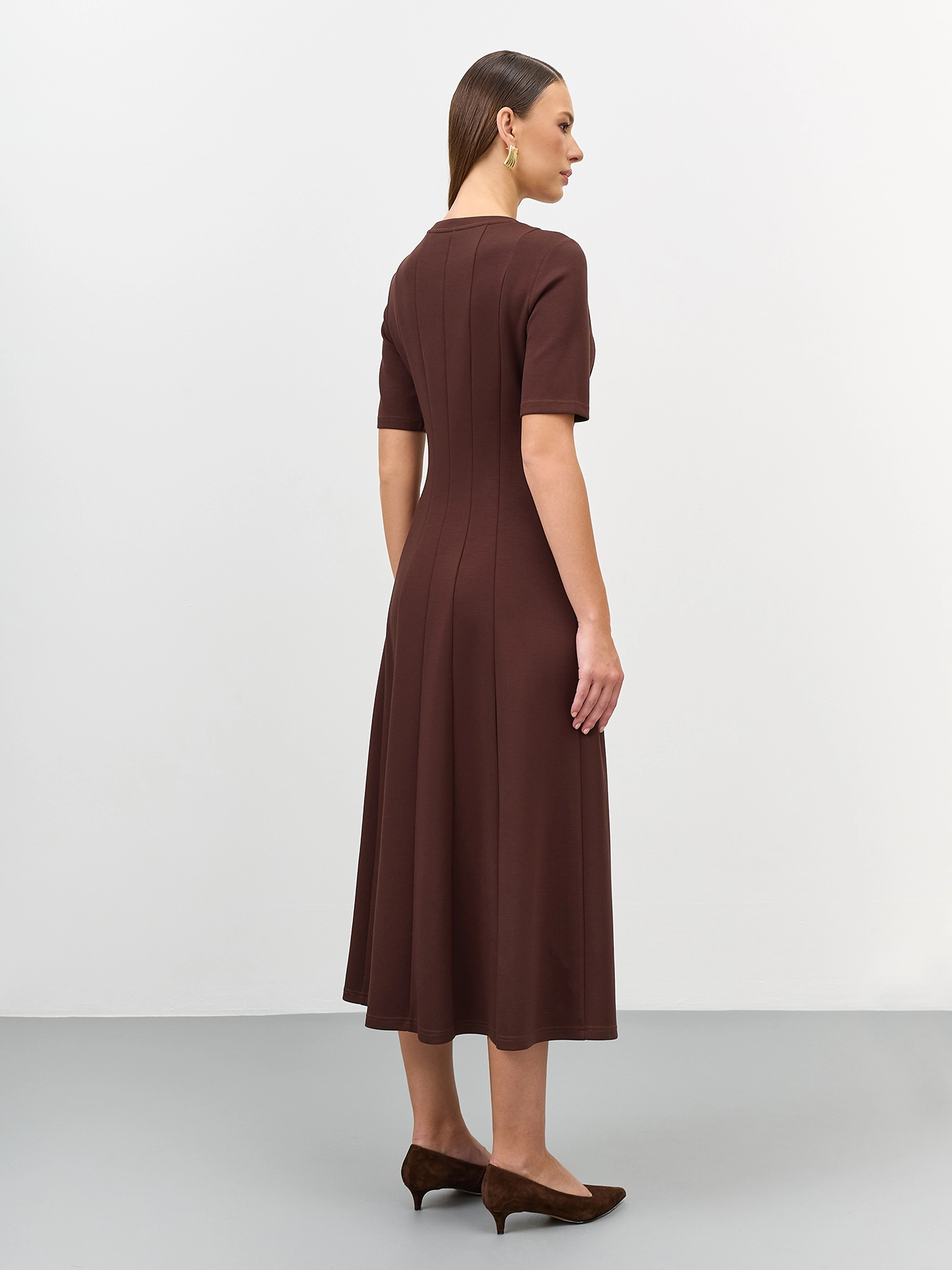 Трикотажное платье из смесовой вискозы. Вертикальные рельефы задают приталенный силуэт. Длина макси. Круглый вырез. Короткий рукав.