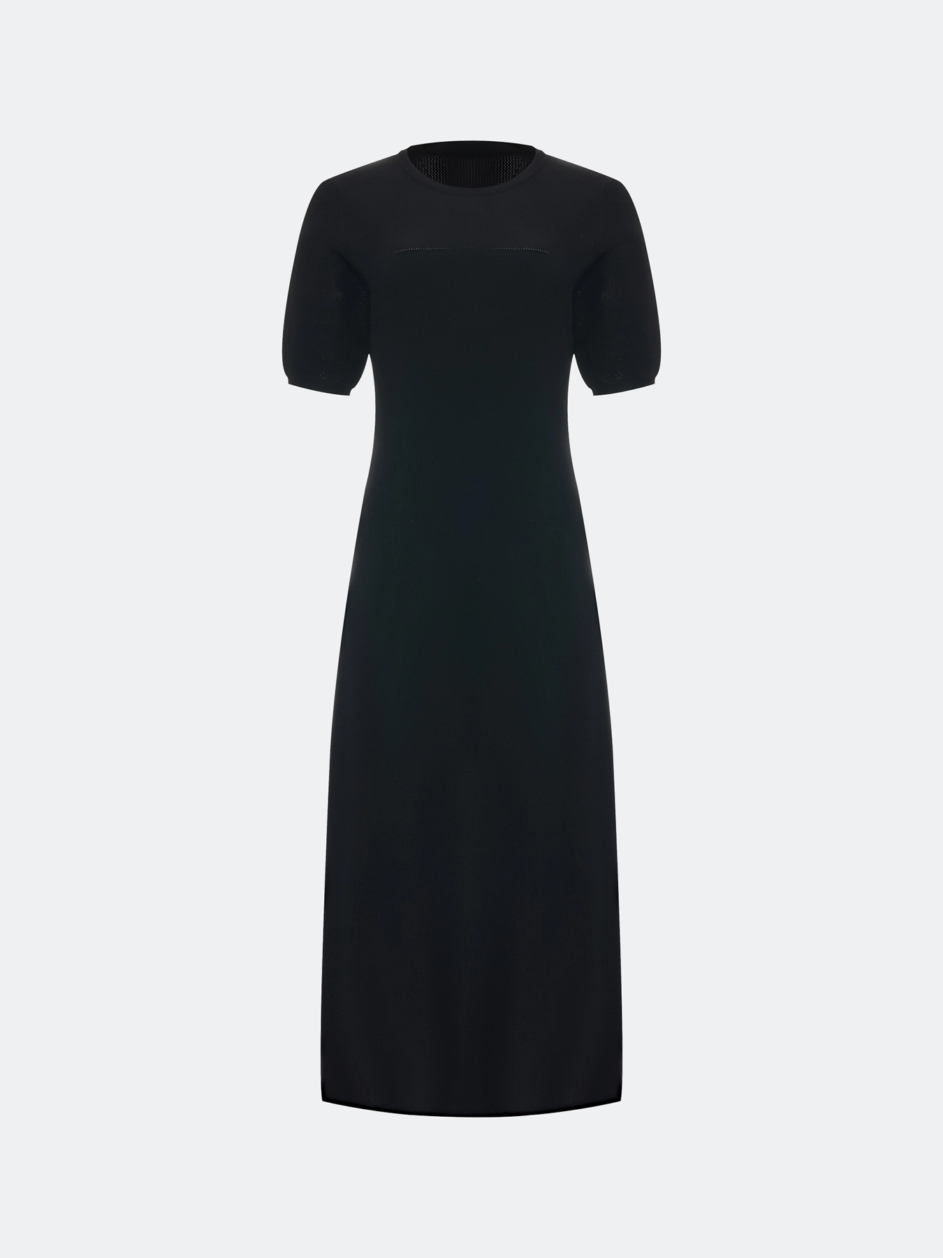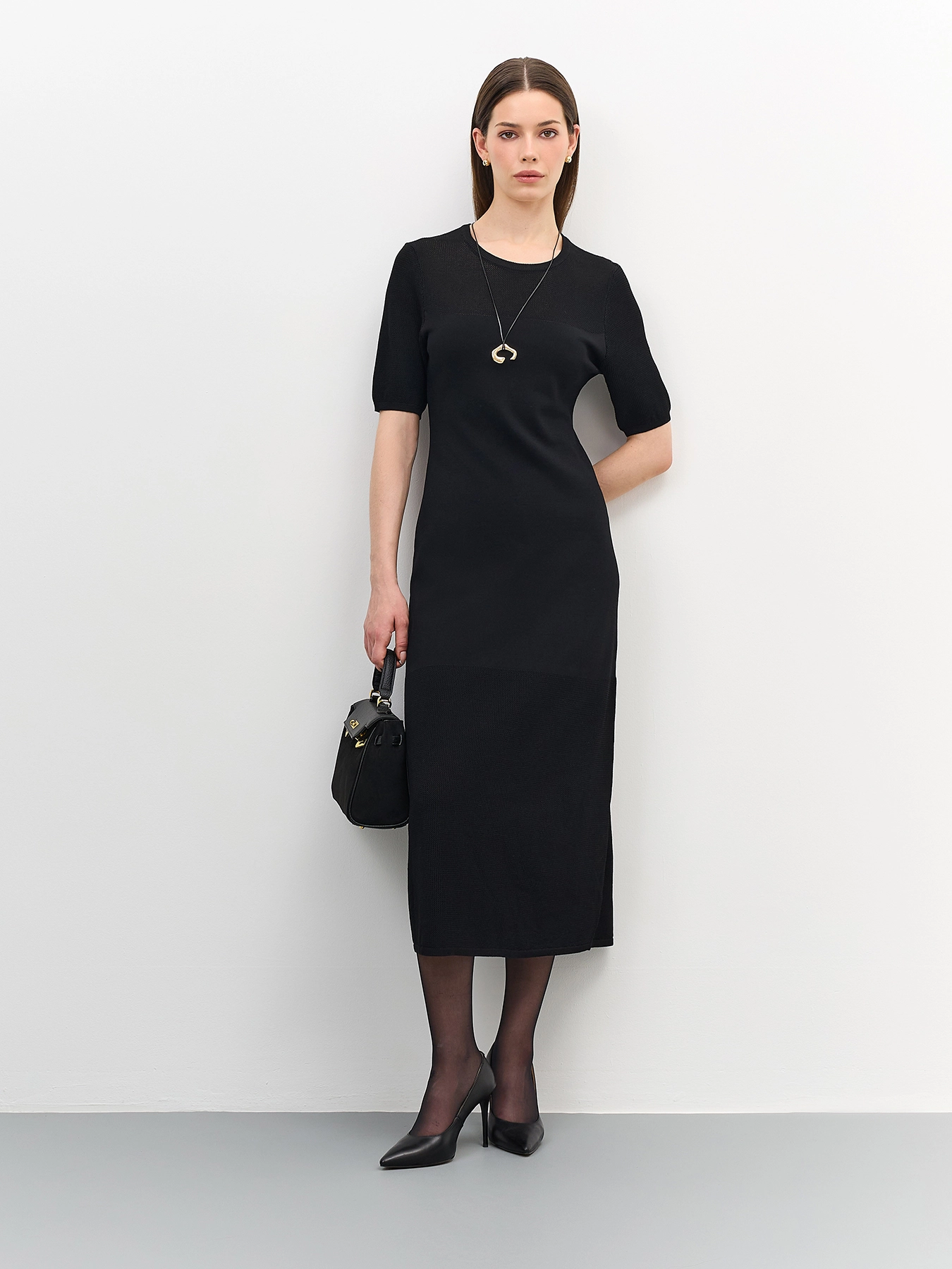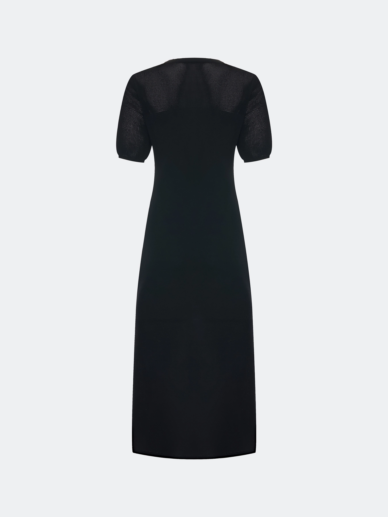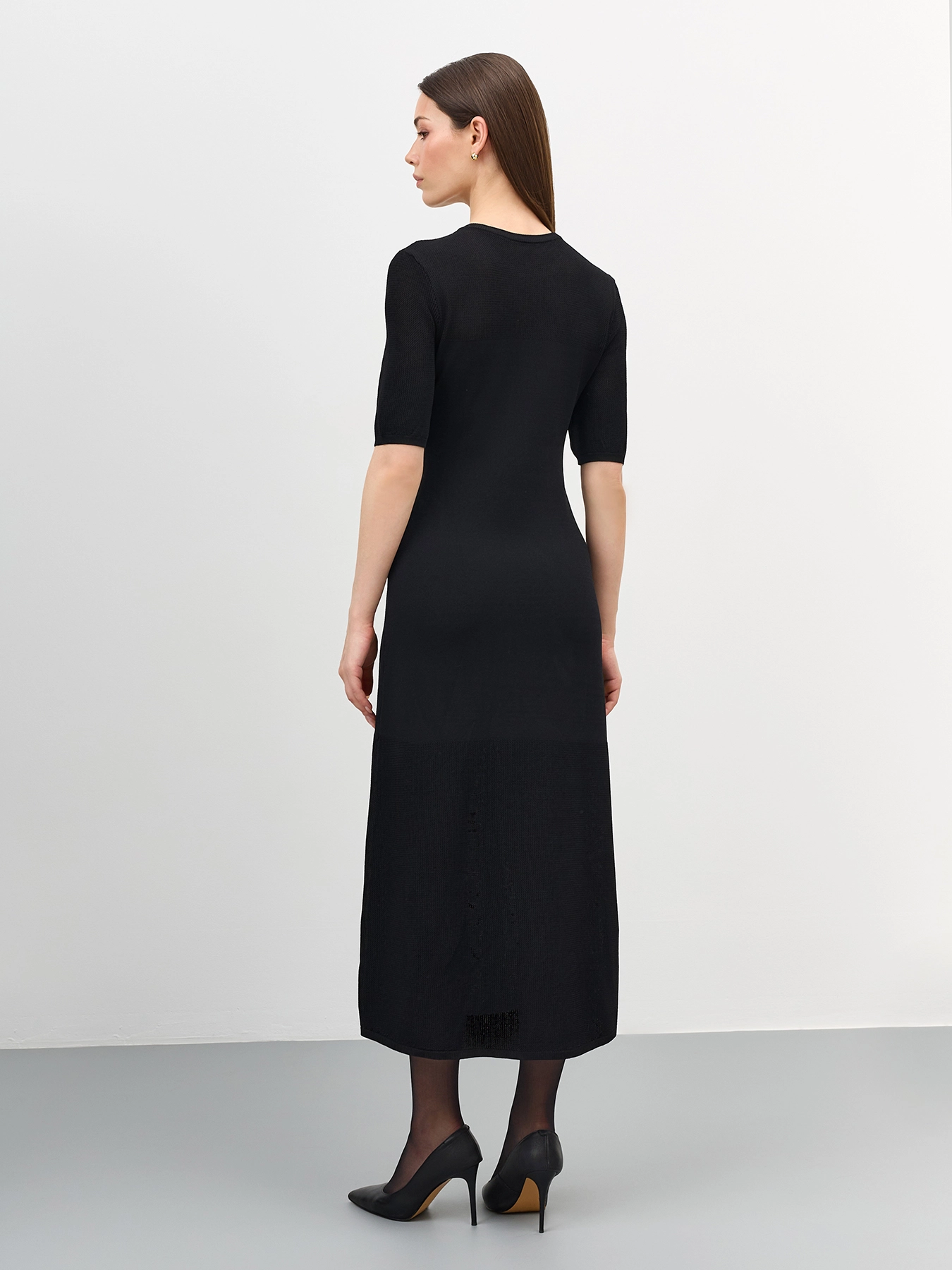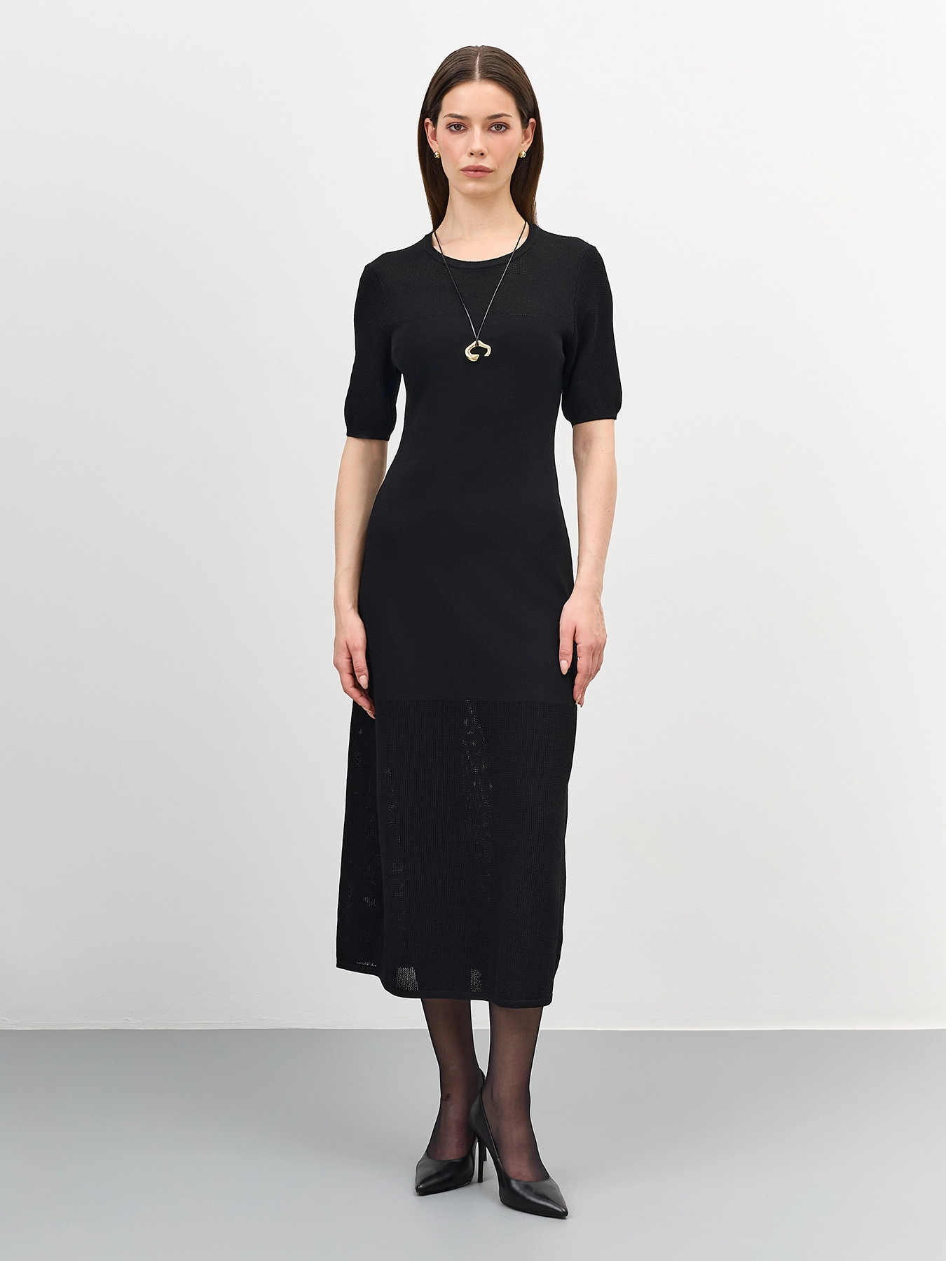 Вязаное платье-миди с полупрозрачными ажурными деталями. Приталенный силуэт. Круглый вырез. Короткие рукава с деликатными манжетами. В составе вискоза.