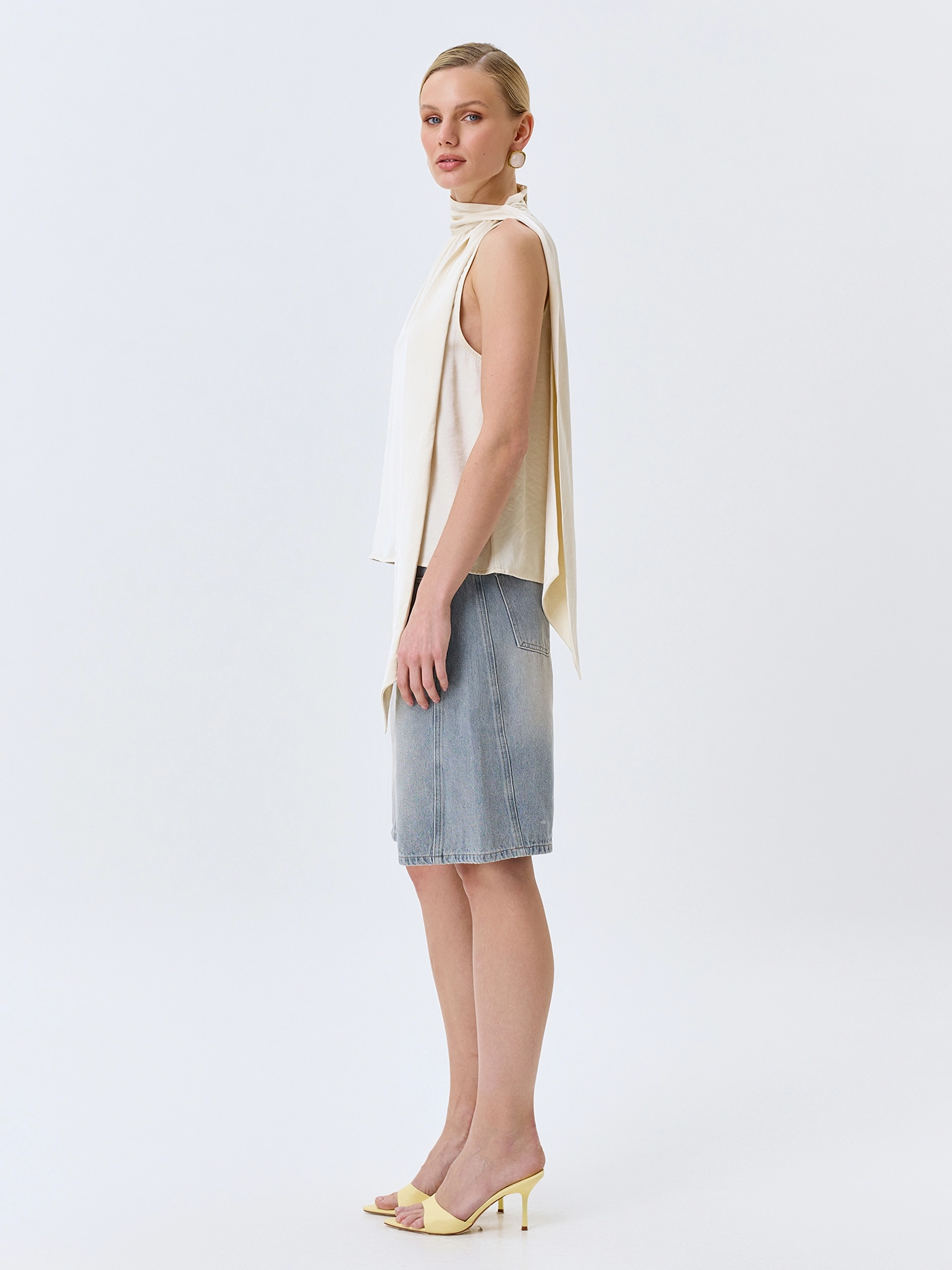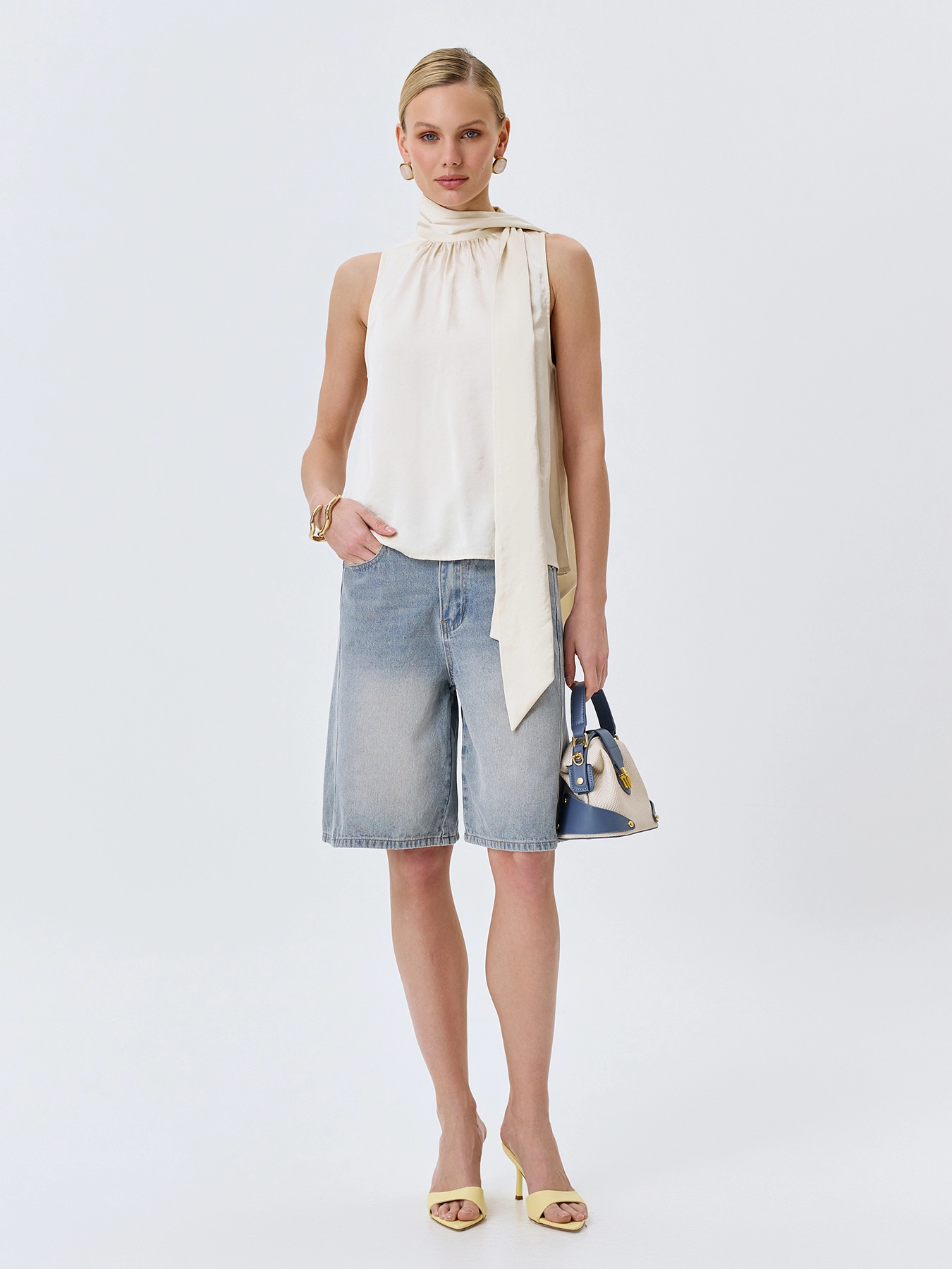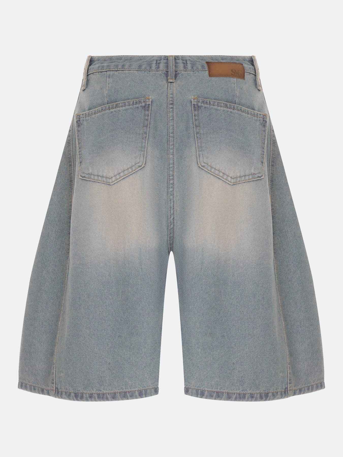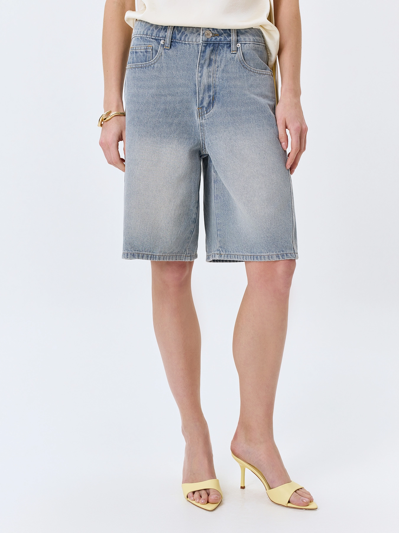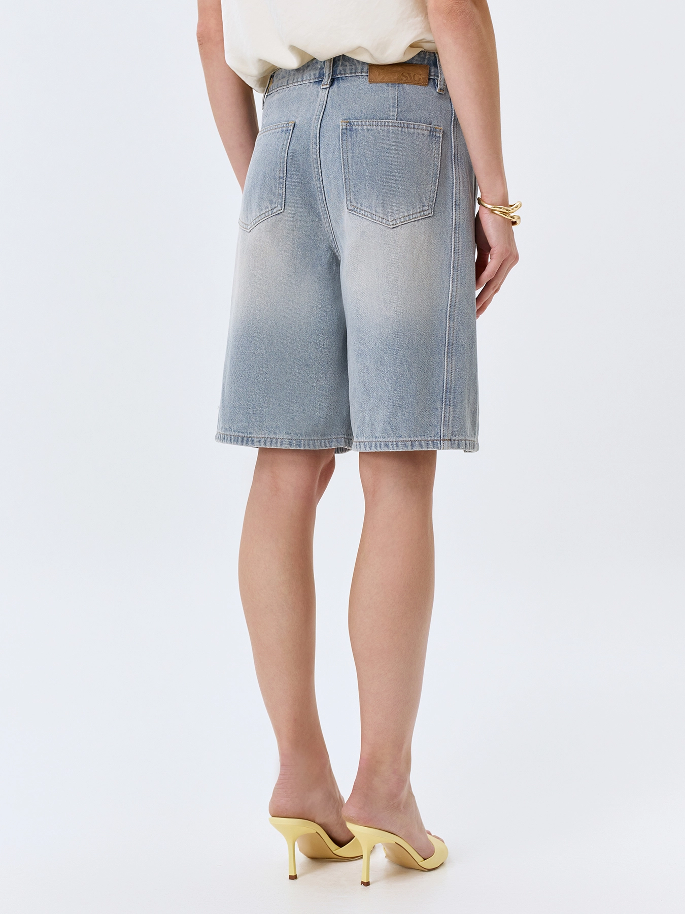 Джинсовые бермуды расклешенного силуэта. Пять карманов. Застежка на молнию и металлическую пуговицу. Дополнены акцентной варкой. В составе 100% хлопок.