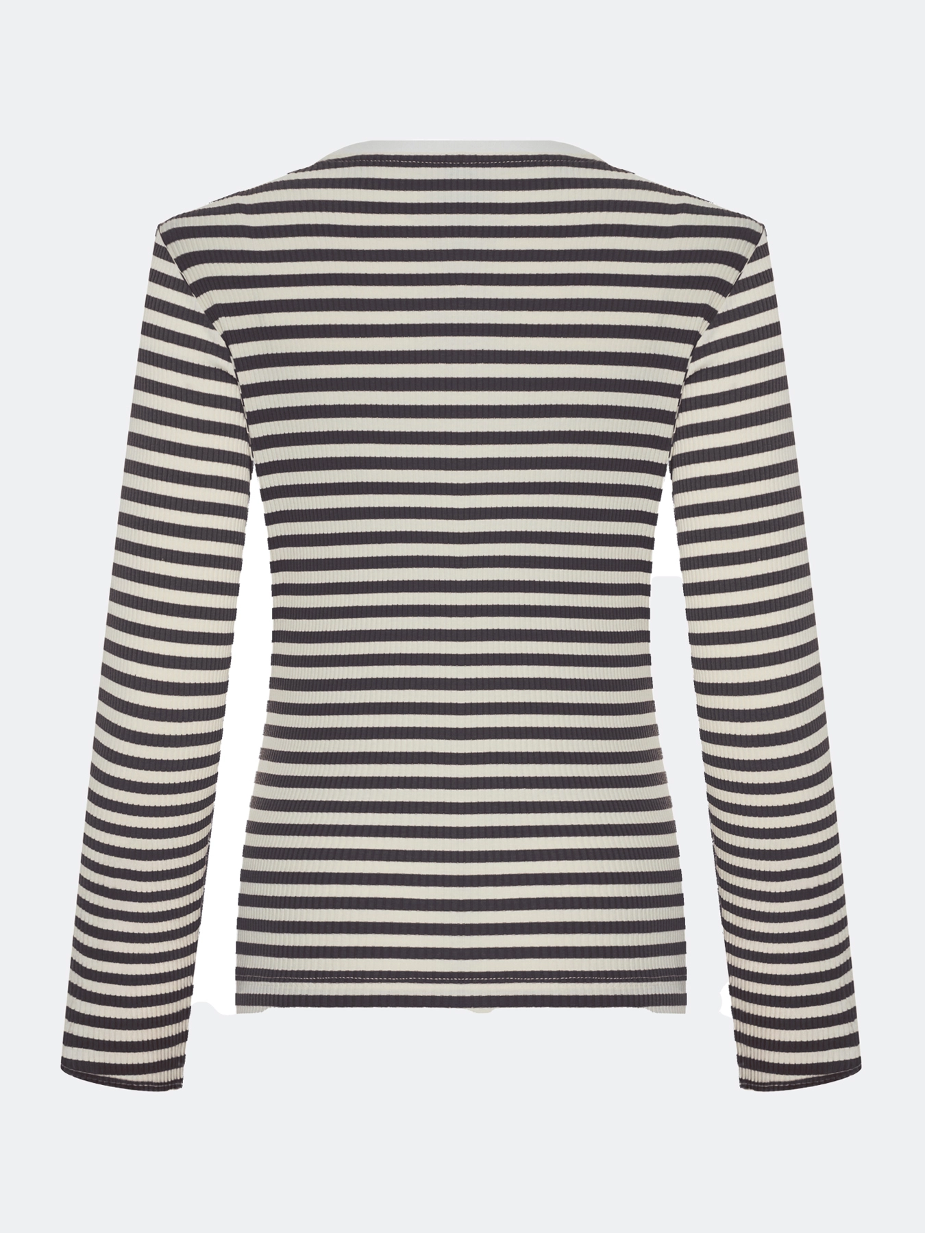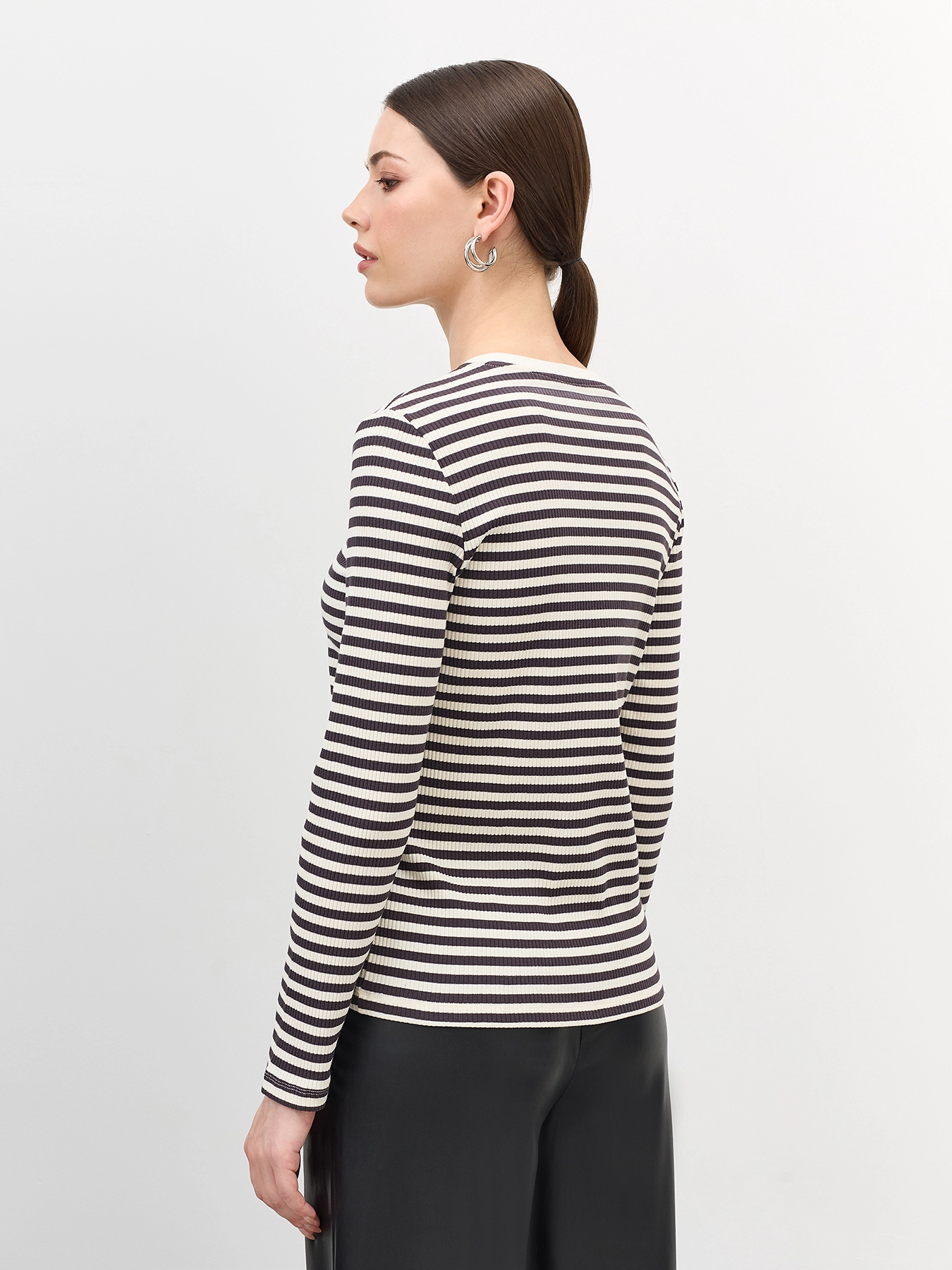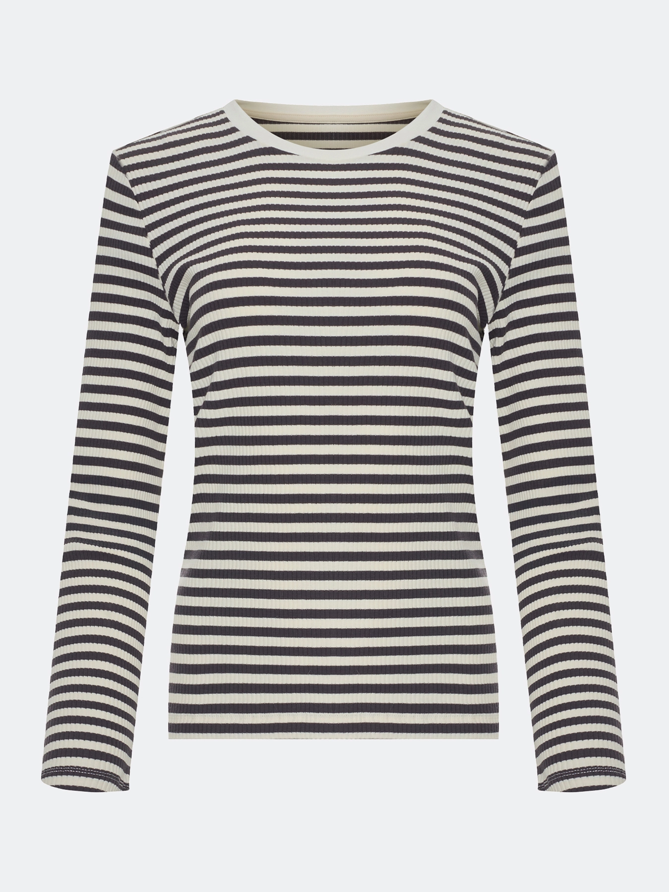 Базовый фактурный лонгслив в контрастную полоску. Полуприталенный силуэт. Круглый вырез. Длинные втачные рукава. В составе хлопок.