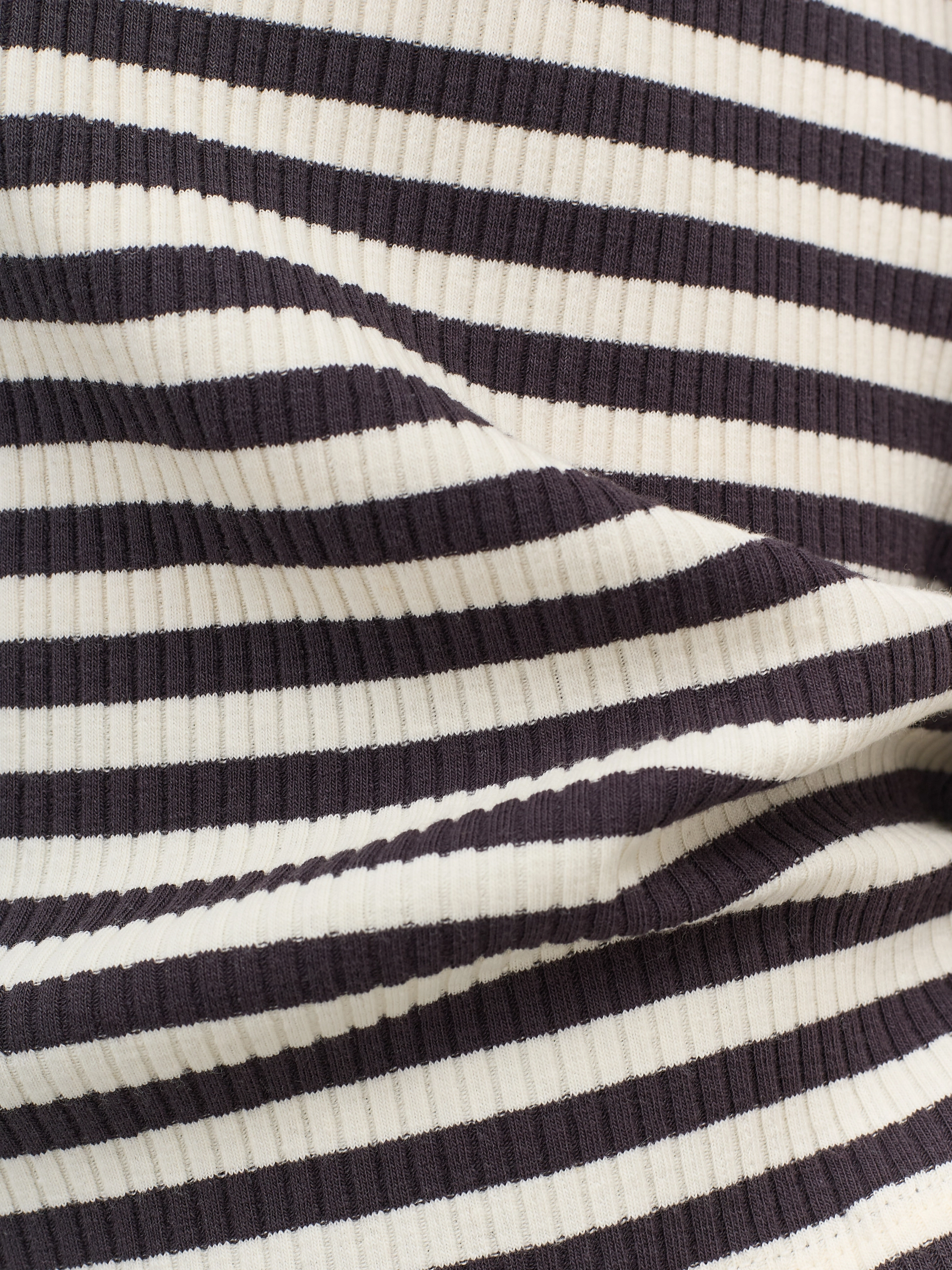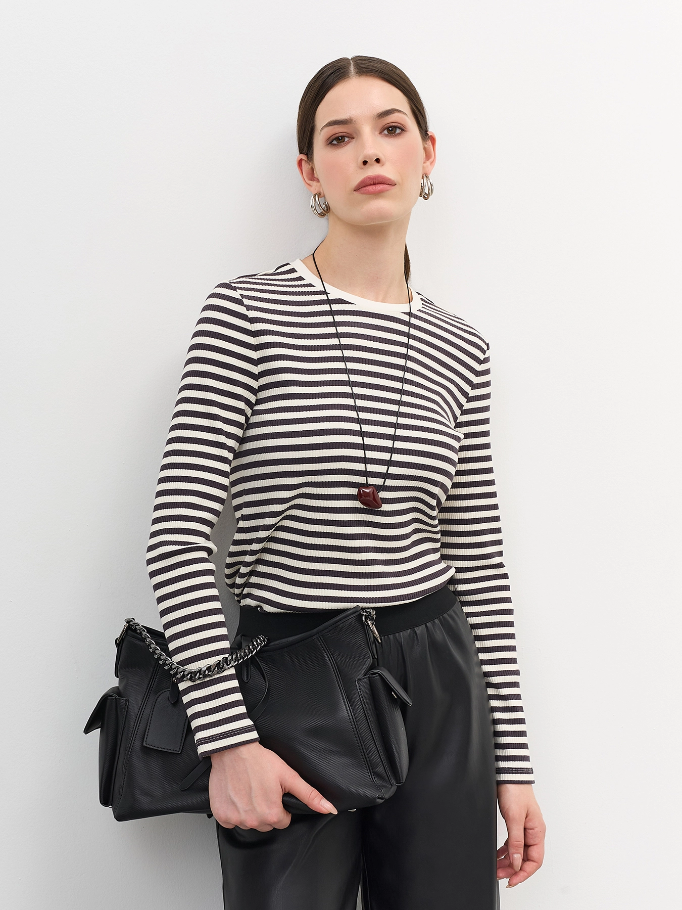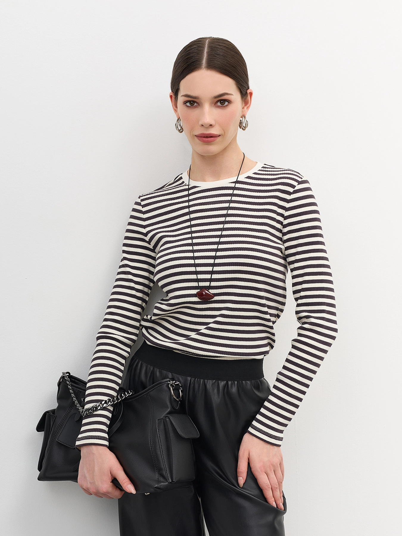 Базовый фактурный лонгслив в контрастную полоску. Полуприталенный силуэт. Круглый вырез. Длинные втачные рукава. В составе хлопок.