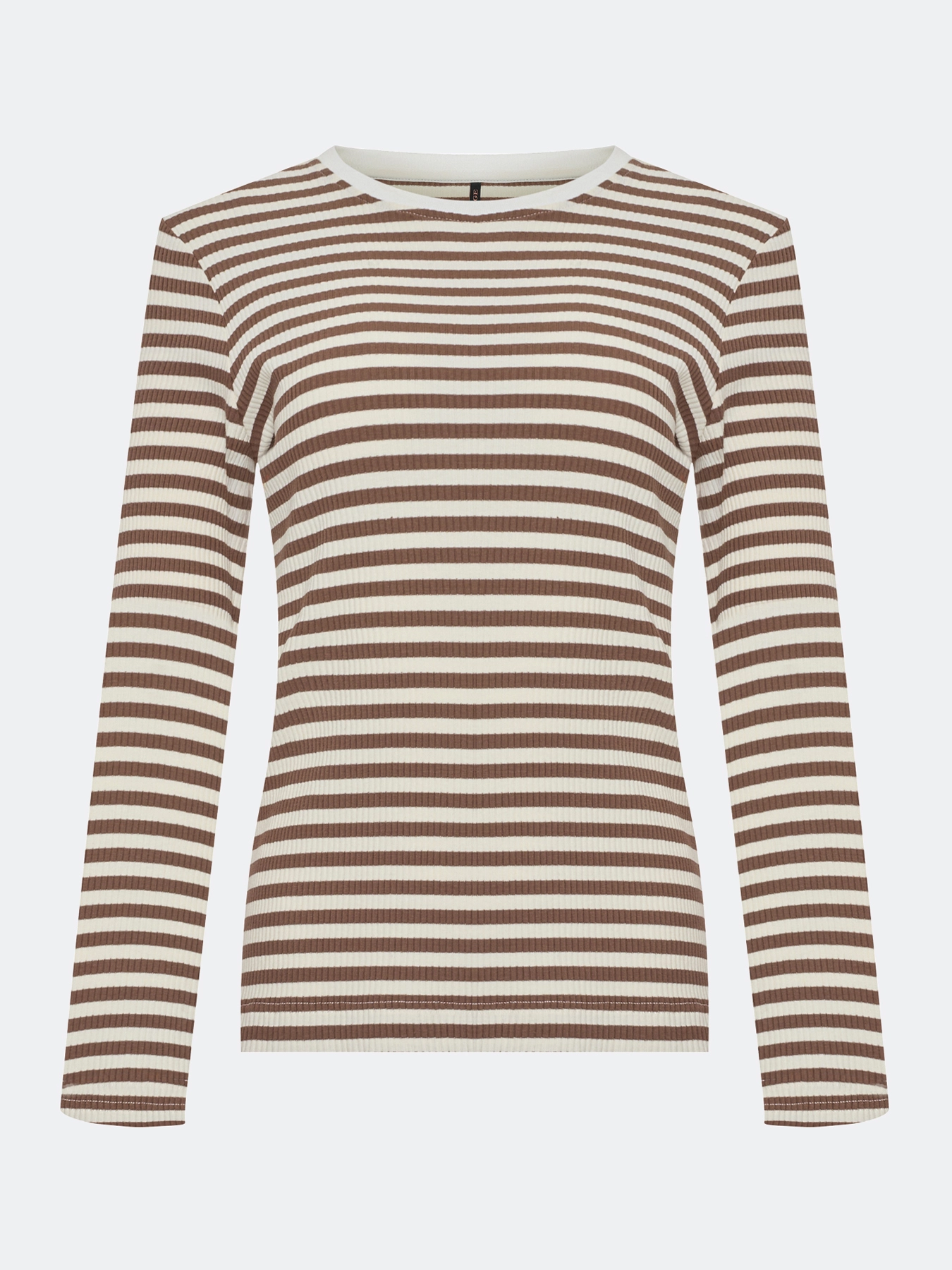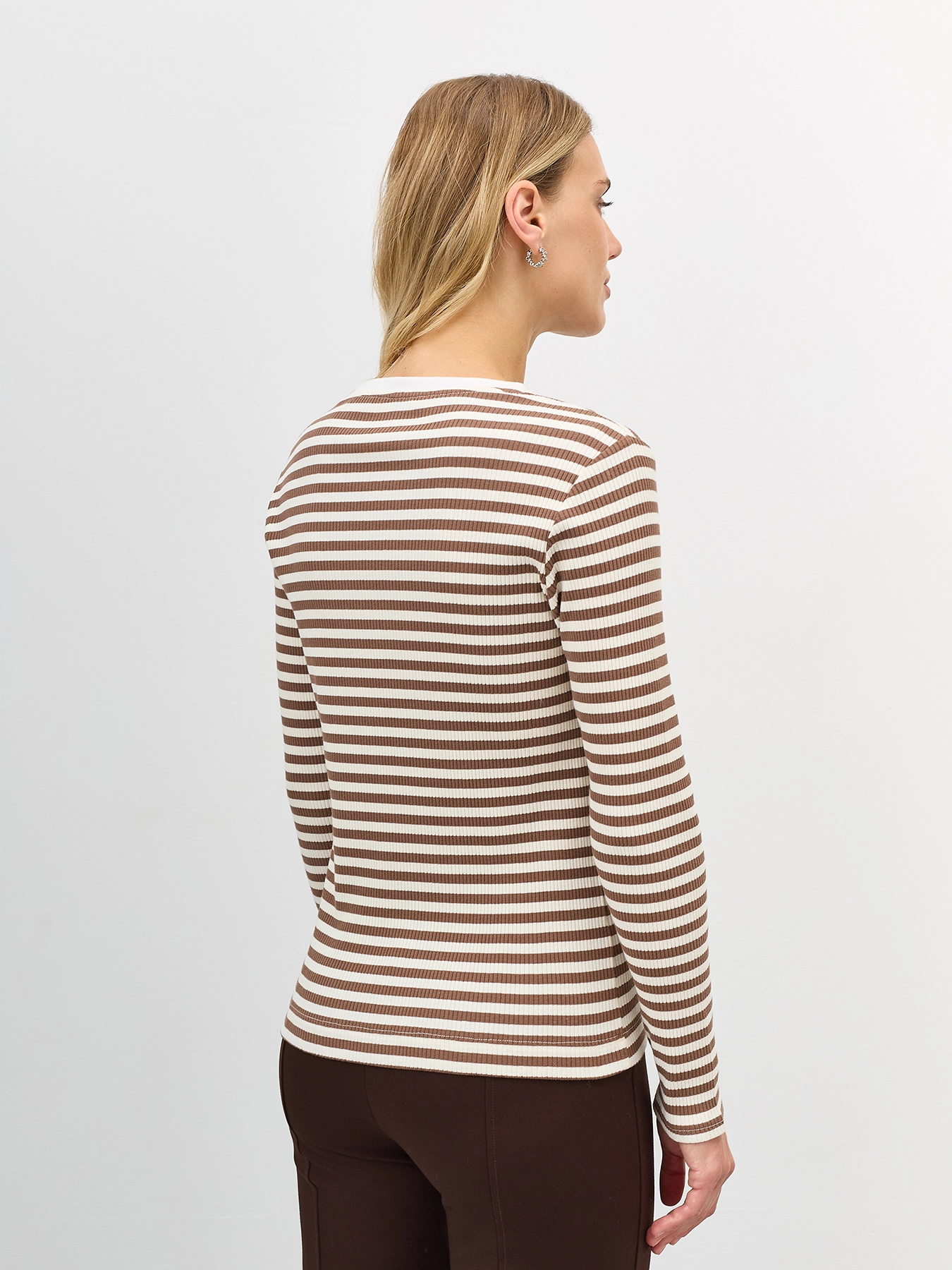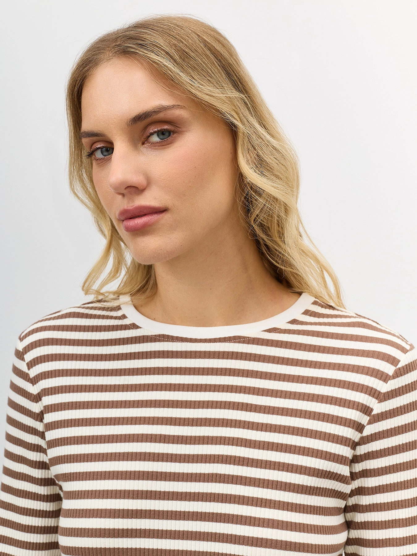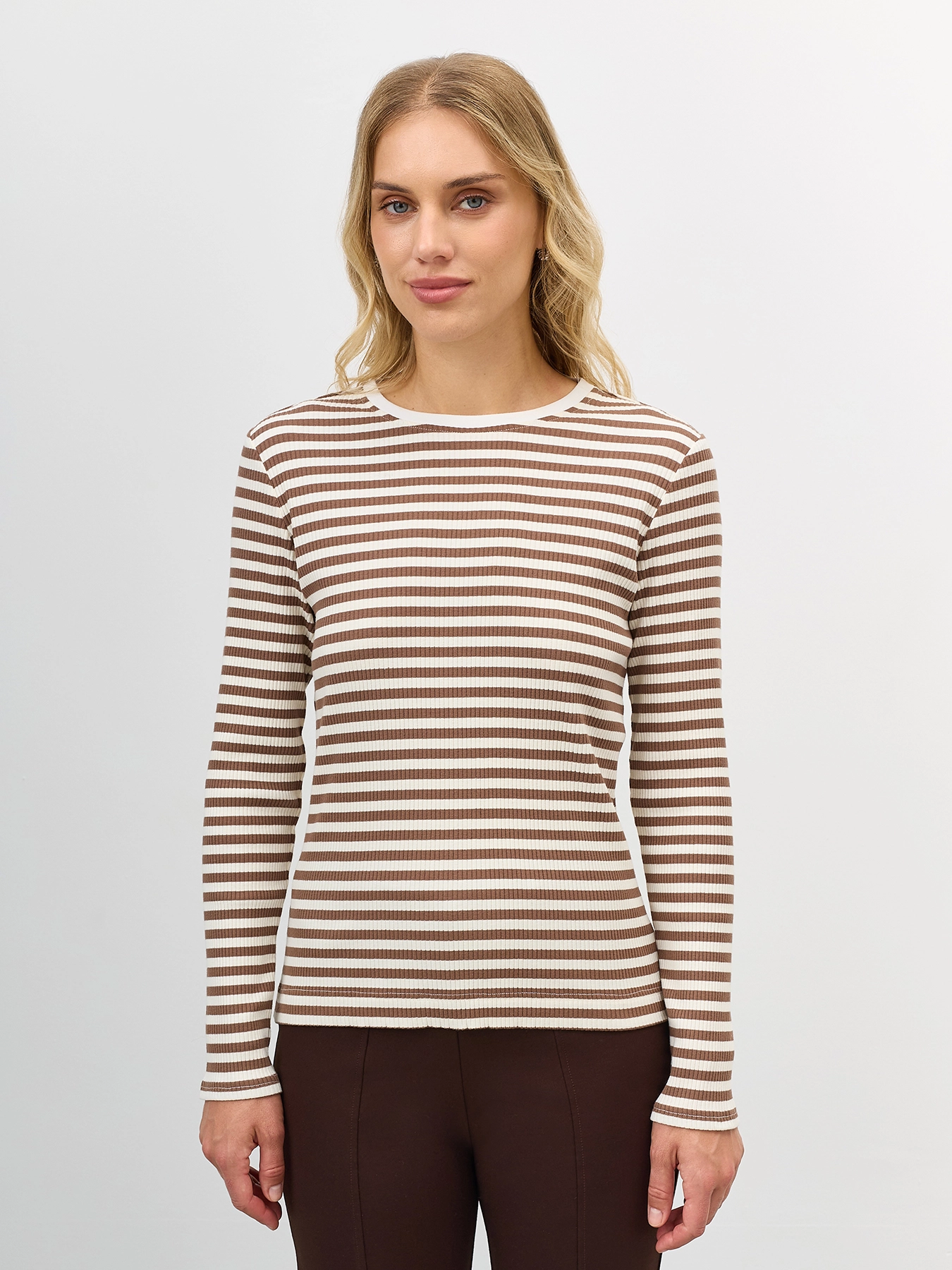 Базовый фактурный лонгслив в контрастную полоску. Полуприталенный силуэт. Круглый вырез. Длинные втачные рукава. В составе хлопок.