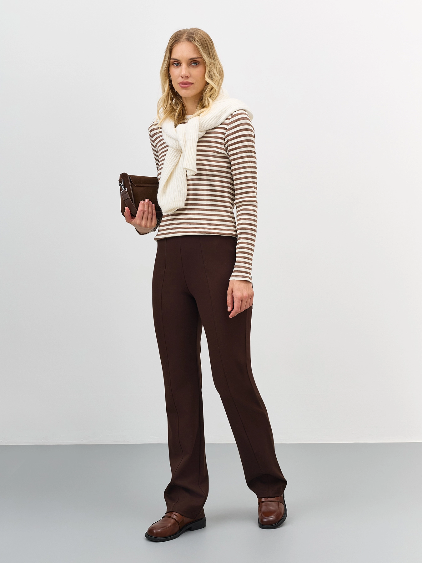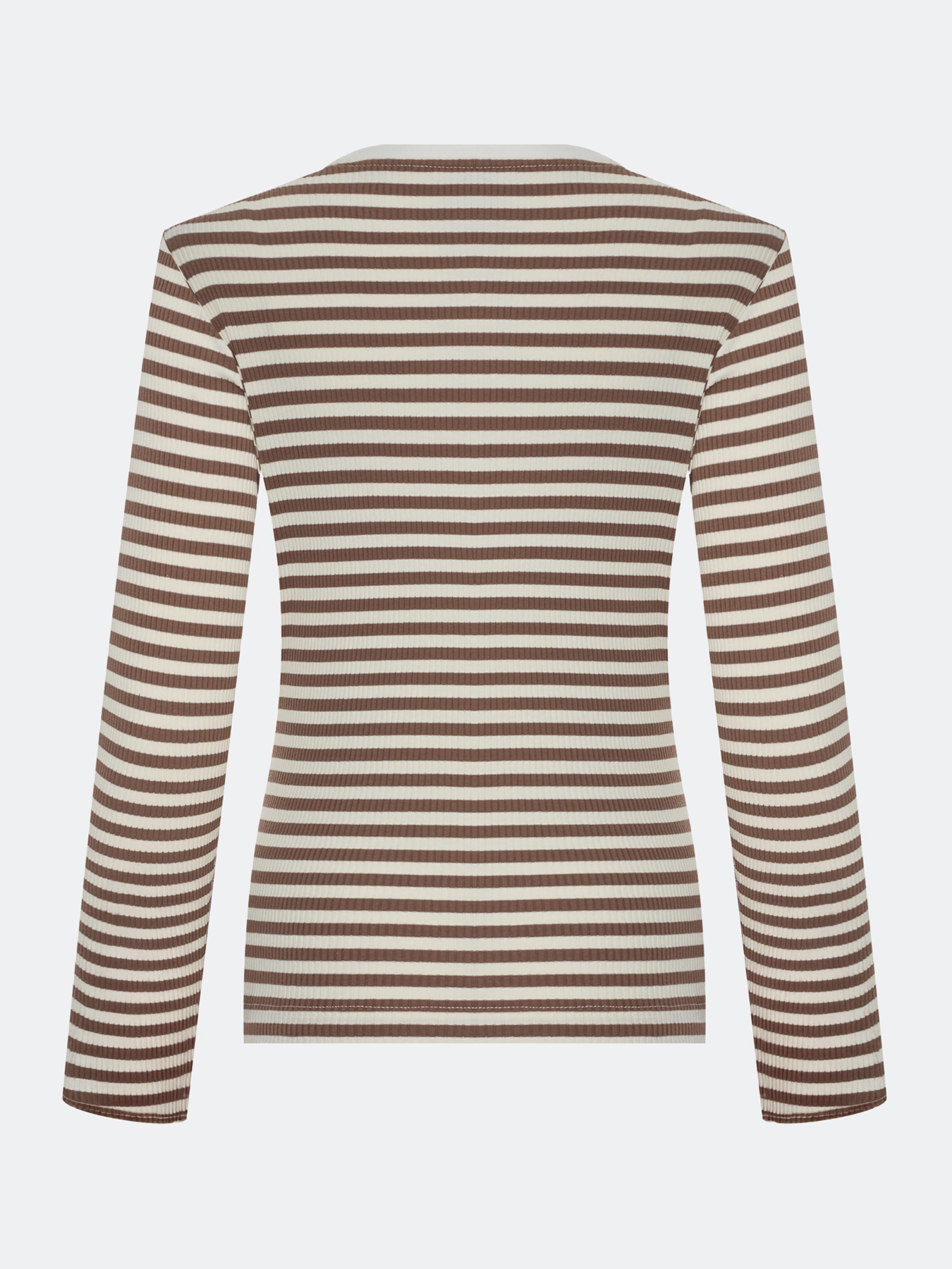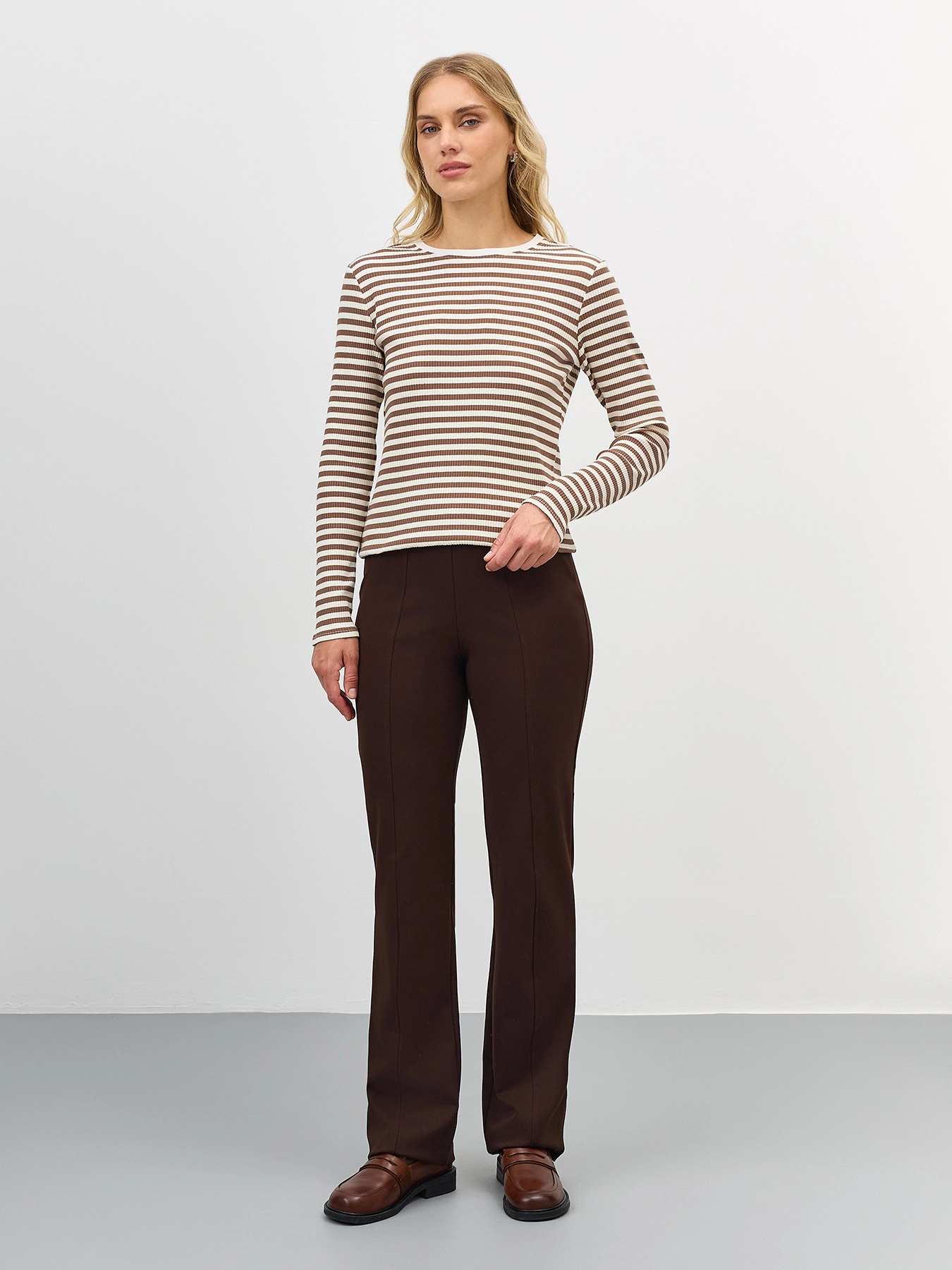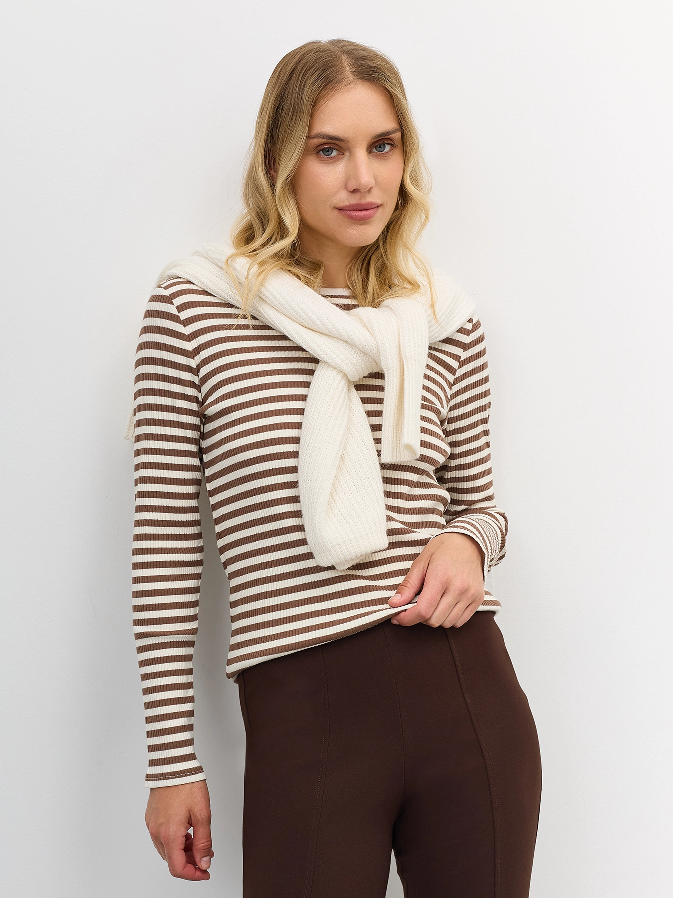 Базовый фактурный лонгслив в контрастную полоску. Полуприталенный силуэт. Круглый вырез. Длинные втачные рукава. В составе хлопок.