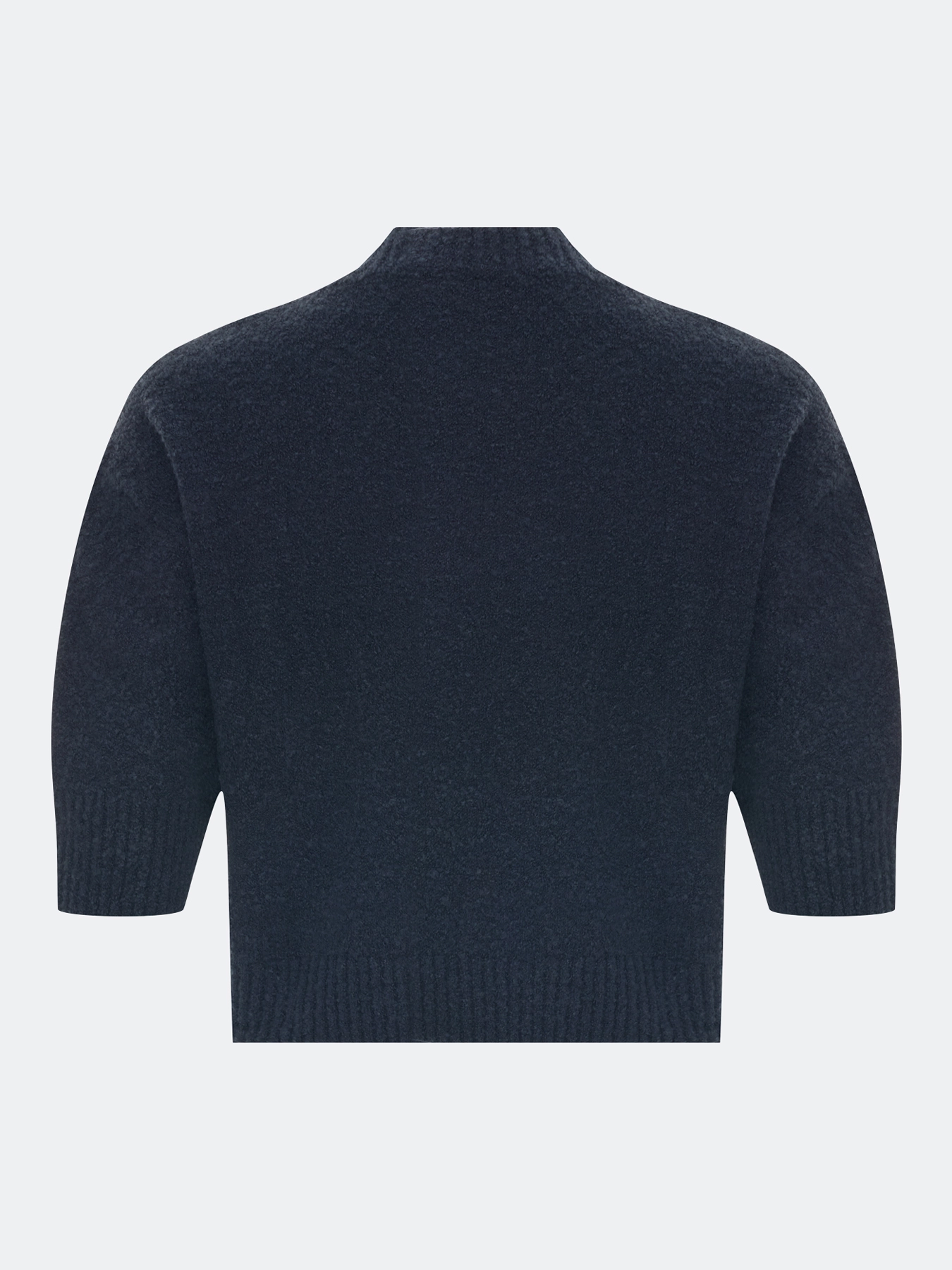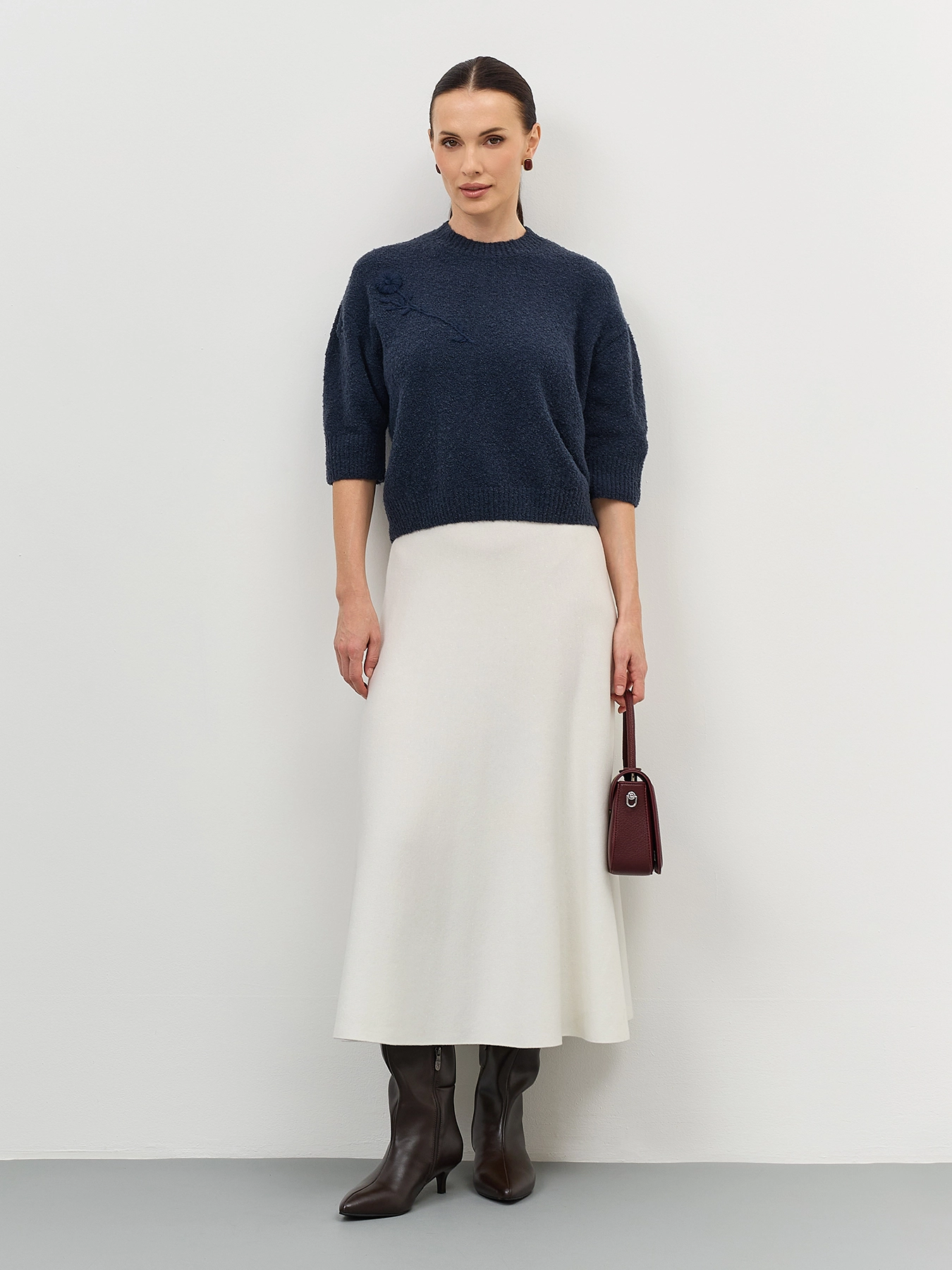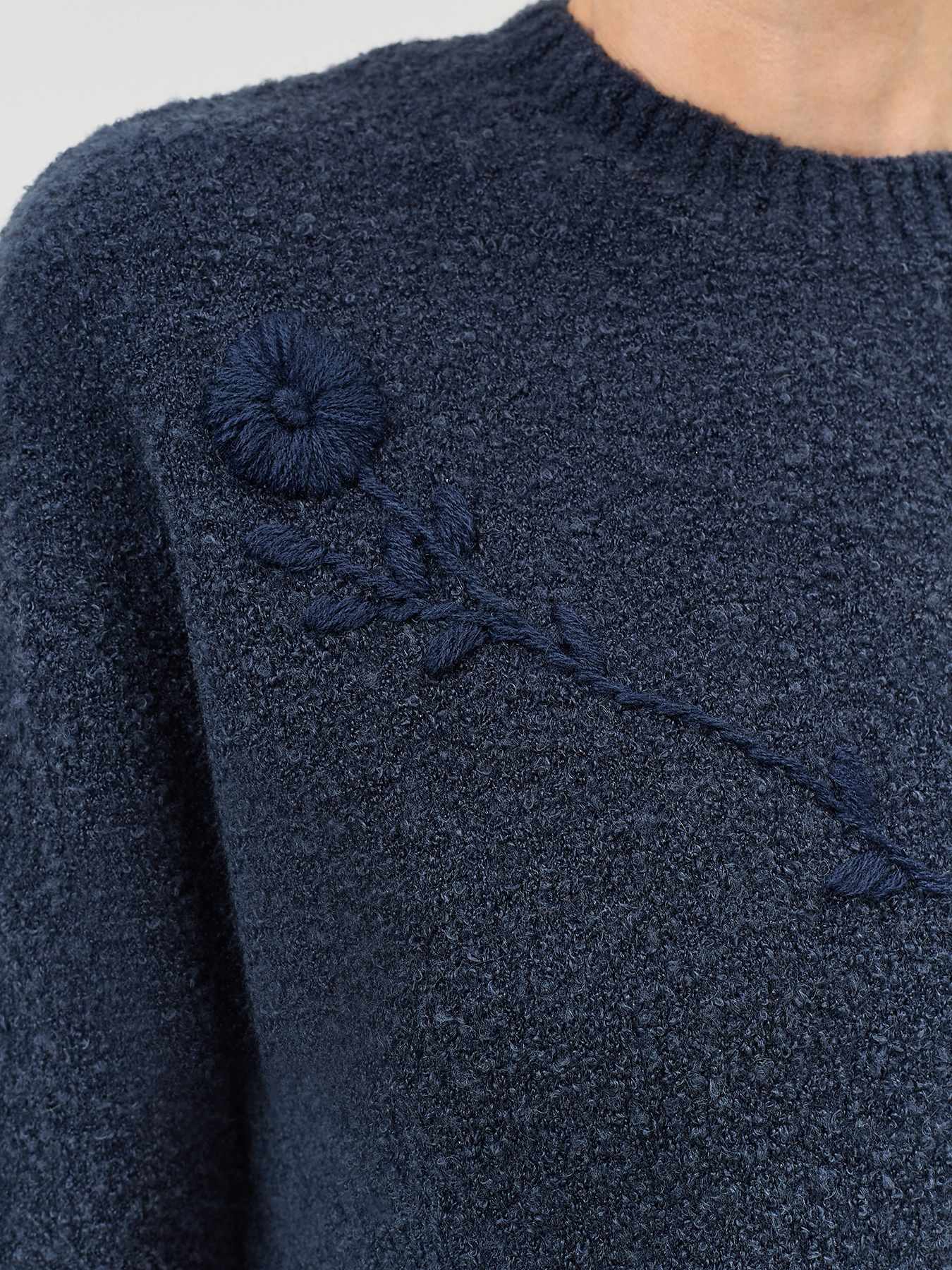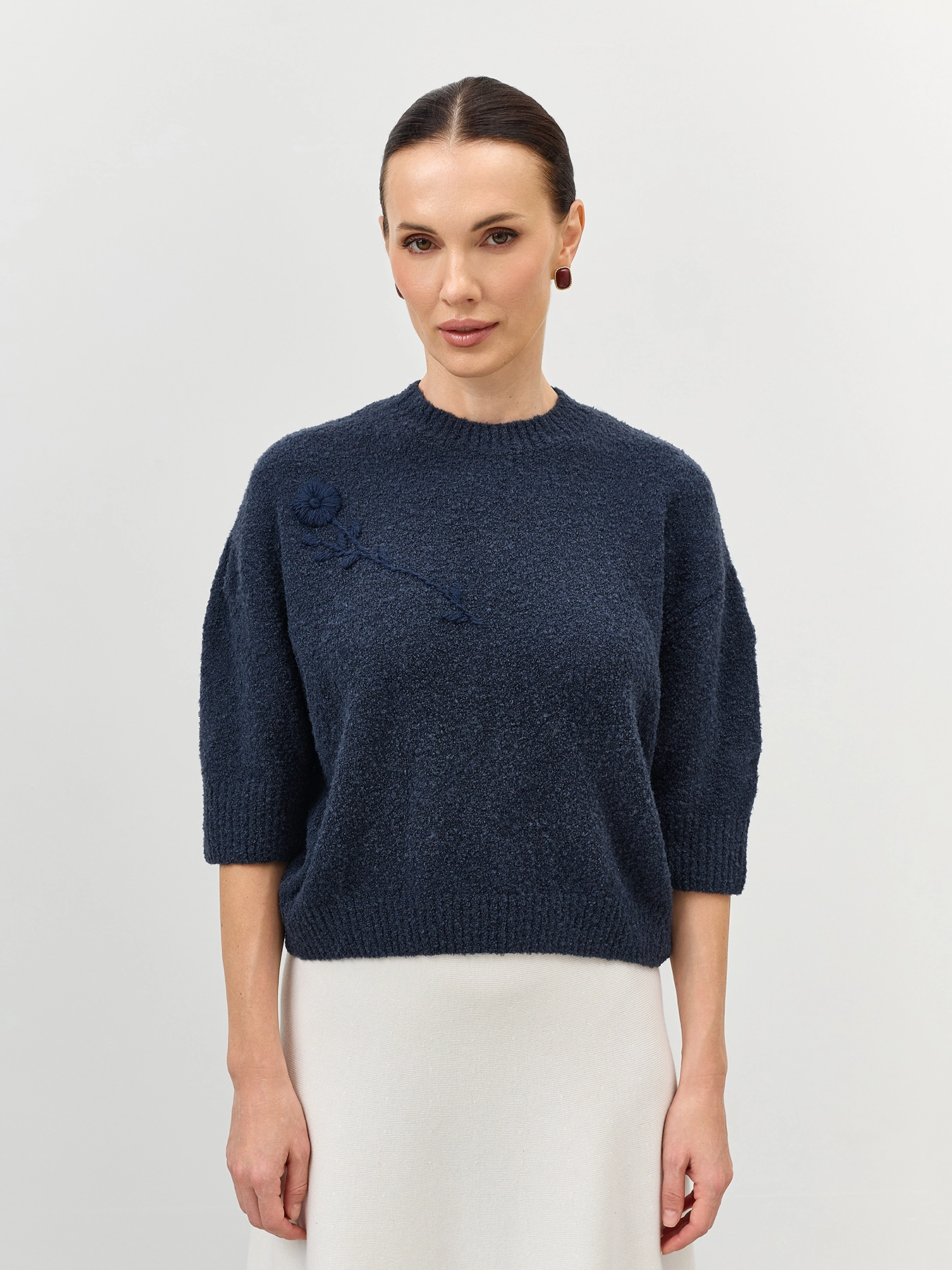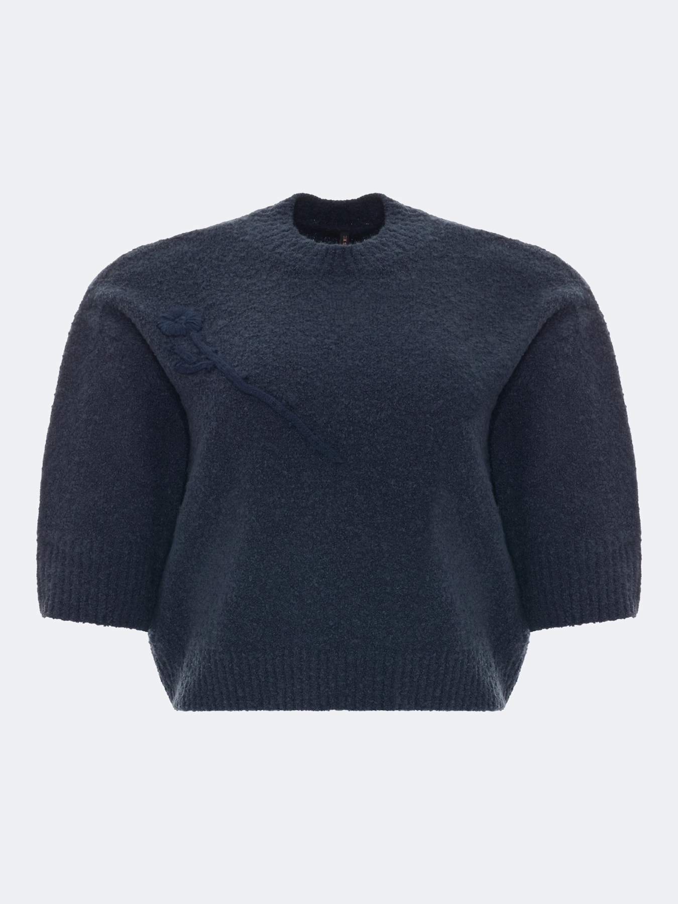 Укороченный джемпер из пряжи букле с добавлением шерсти. Свободный силуэт. Круглый вырез. Укороченный рукав. Спущенная линия плеч. Дополнен декоративной вышивкой в цвет.