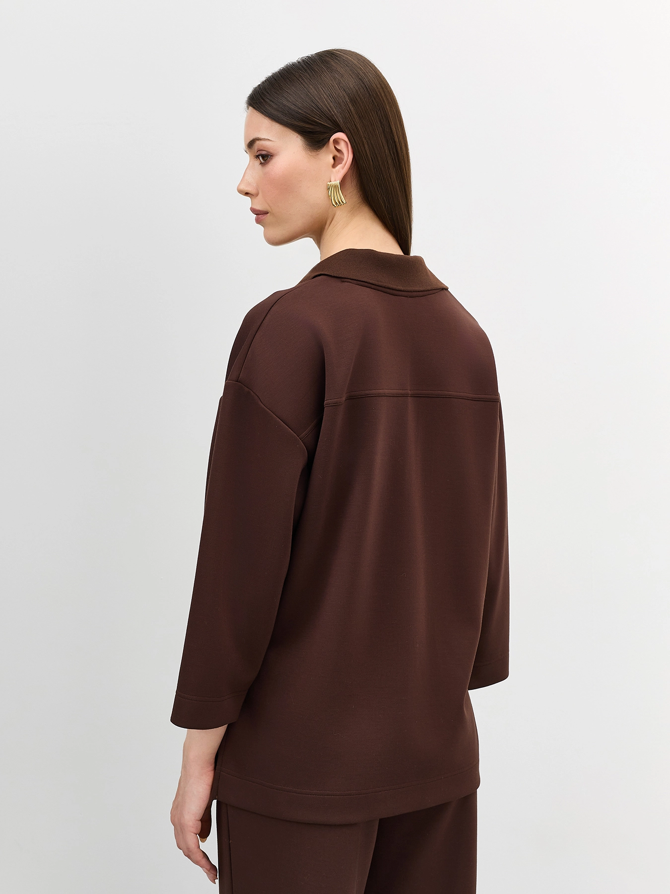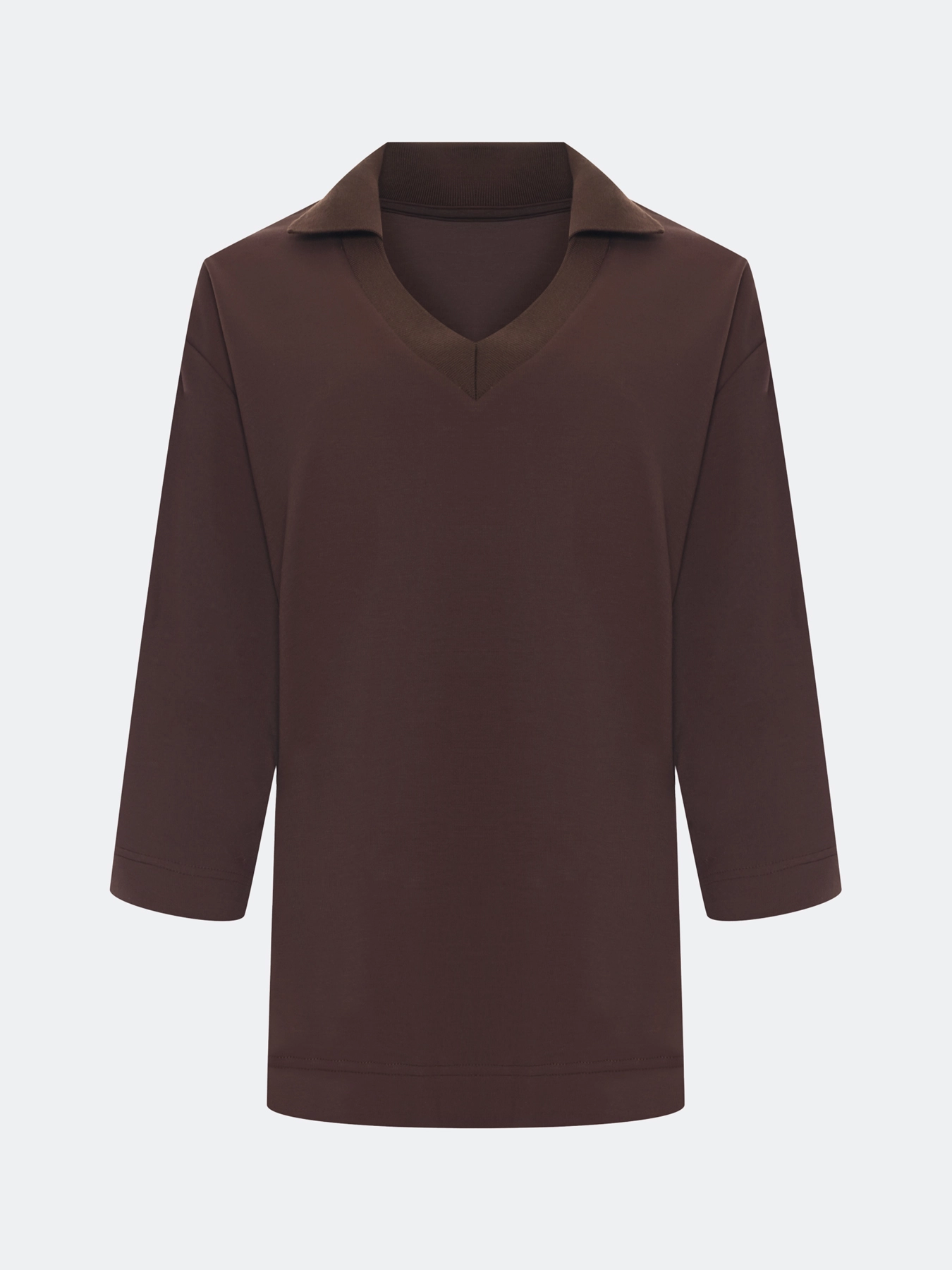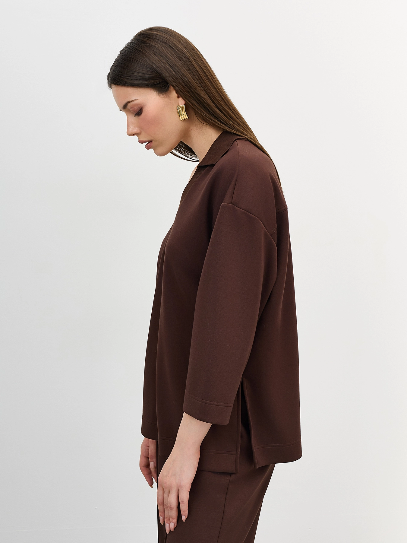 Джемпер из трикотажной вискозы с воротником-поло. Свободный силуэт. Спущенная линия плеча. V-образный вырез. Укороченные рукава 3/4. Высокие разрезы в боковых швах. Комплект с арт. 60830.