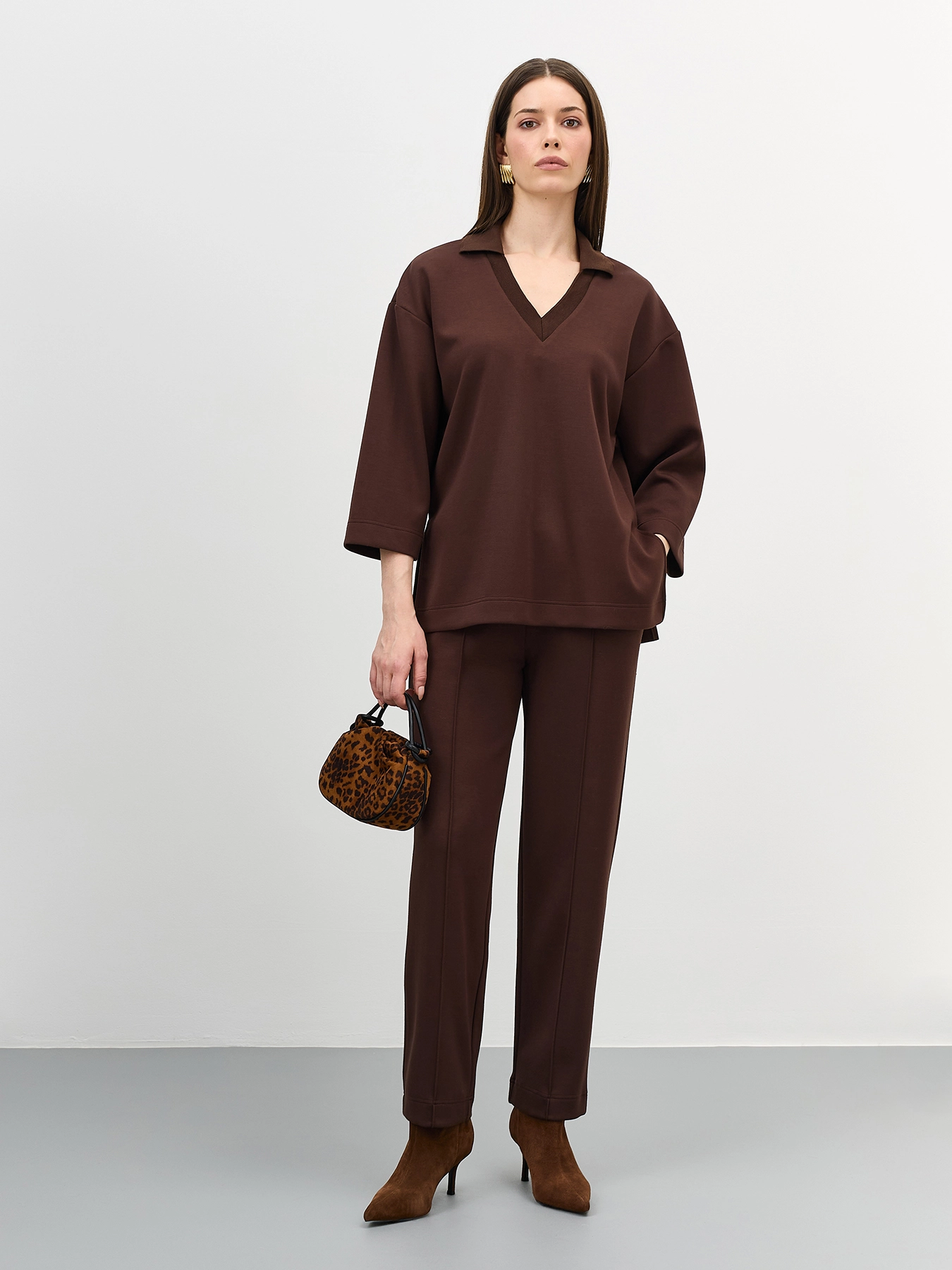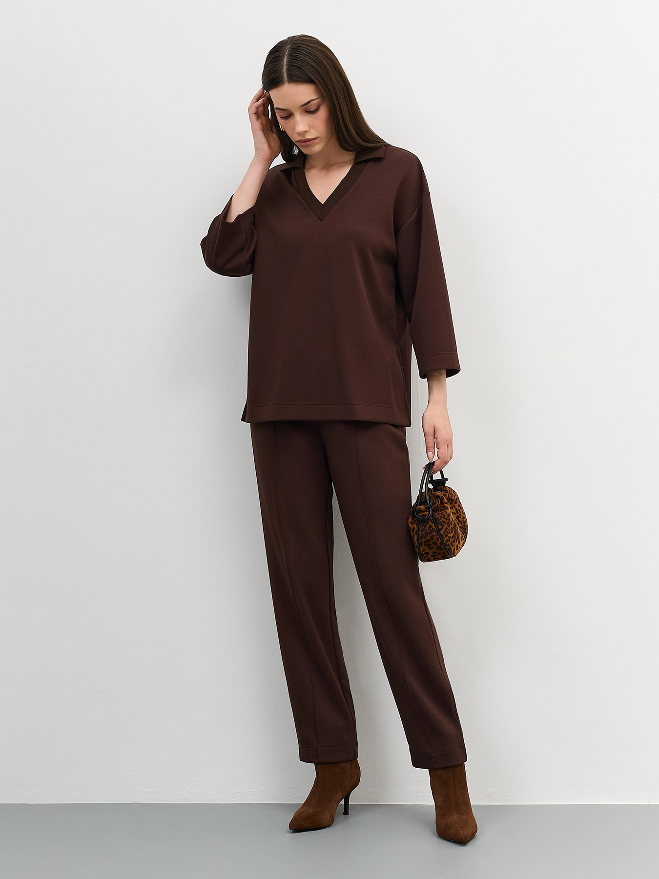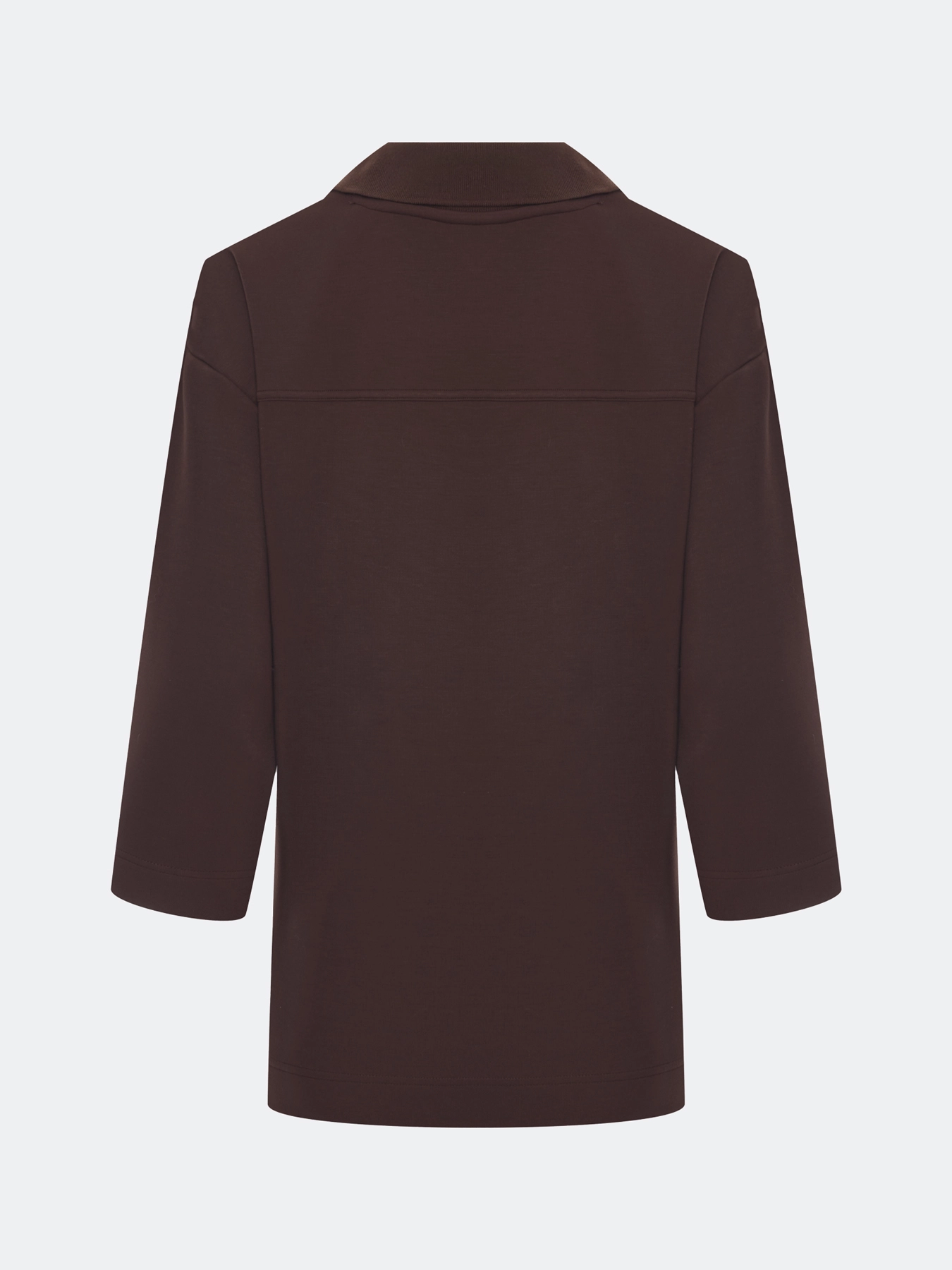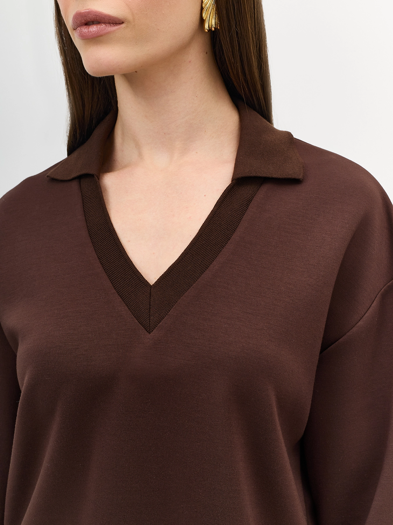 Джемпер из трикотажной вискозы с воротником-поло. Свободный силуэт. Спущенная линия плеча. V-образный вырез. Укороченные рукава 3/4. Высокие разрезы в боковых швах. Комплект с арт. 60830.