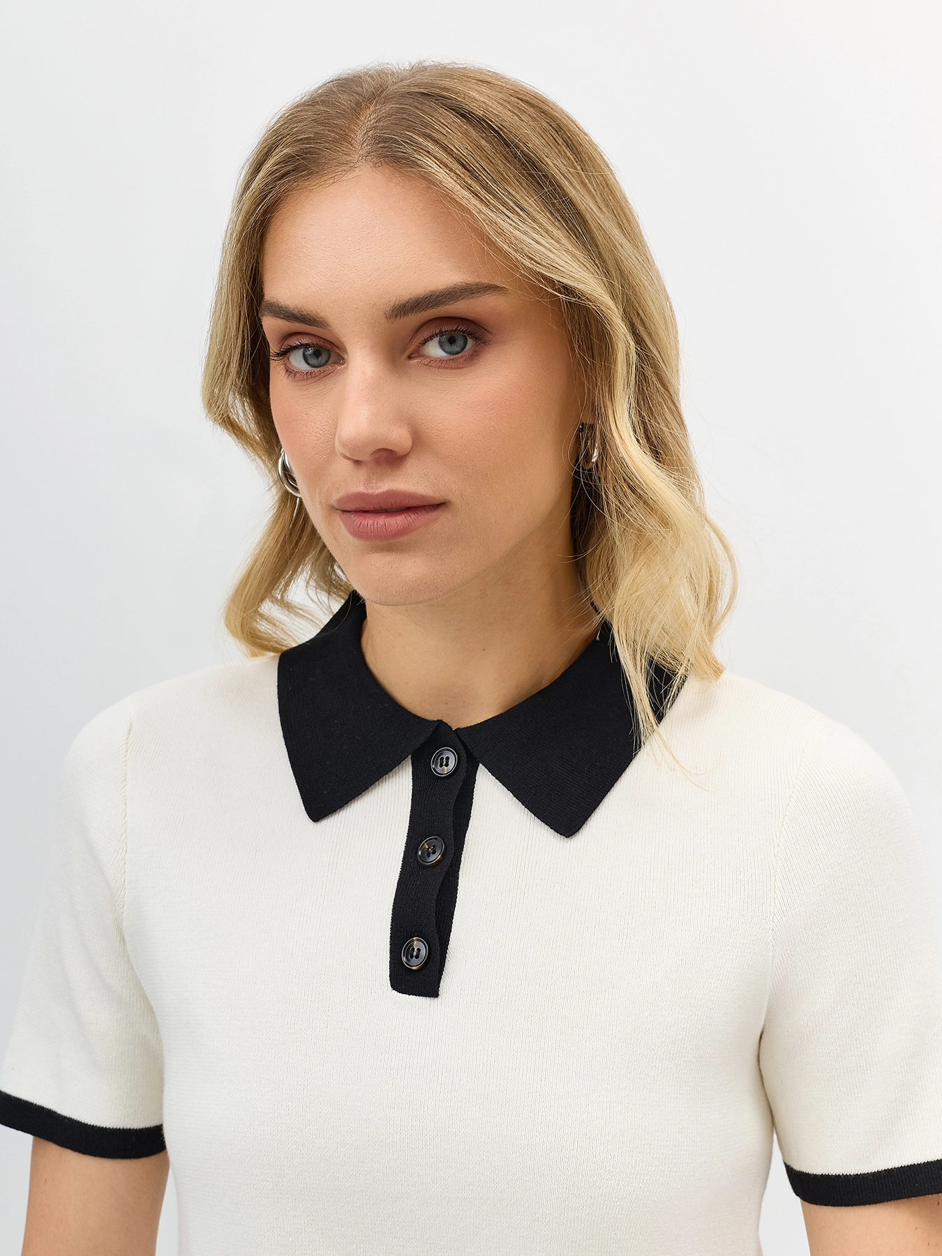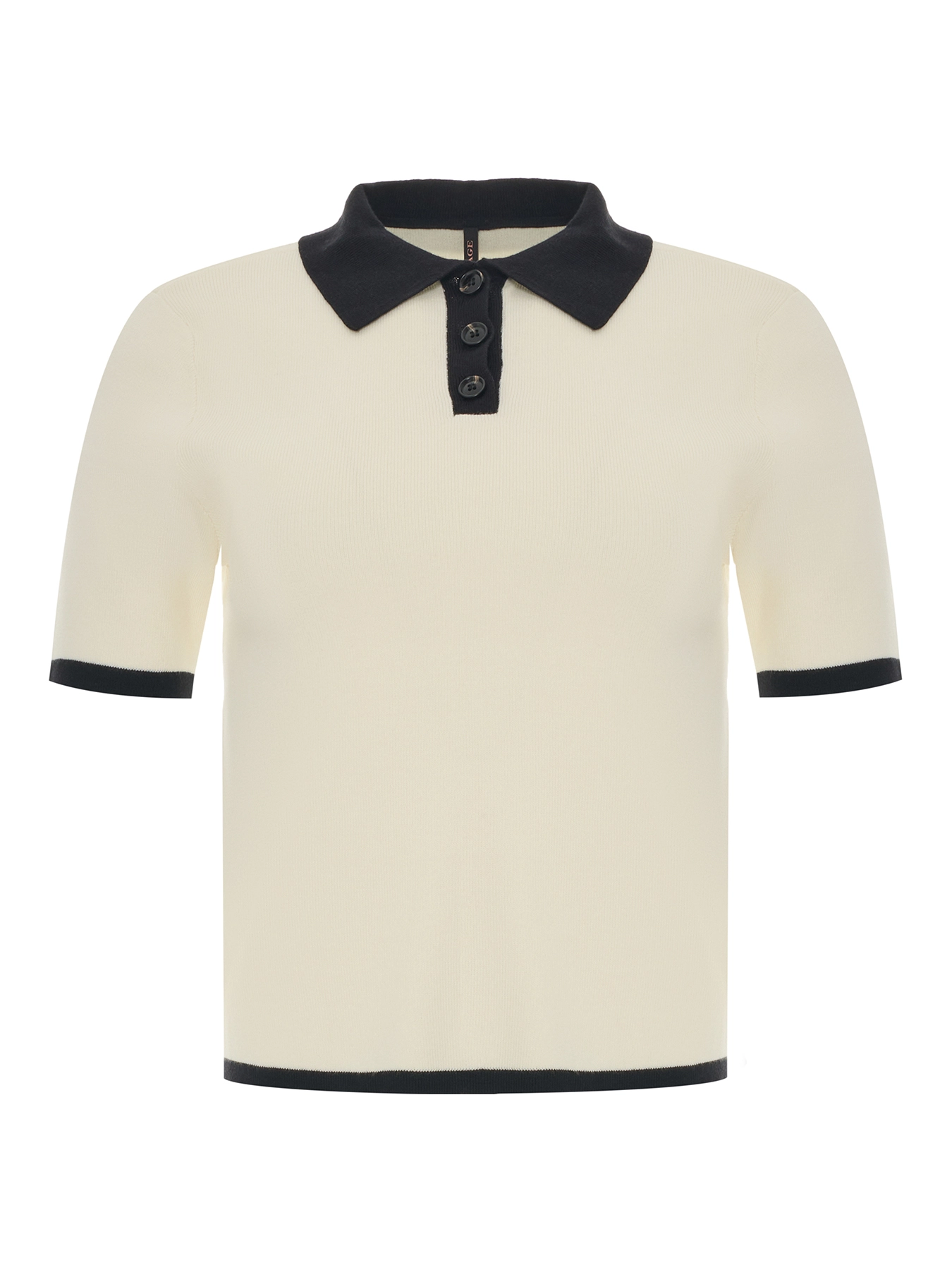 Укороченный джемпер с контрастными деталями. Классический прямой силуэт. Воротник поло контрасного цвета. Короткие рукава. В составе хлопок и нейлон.