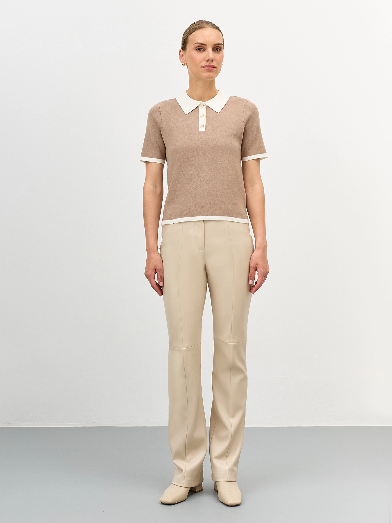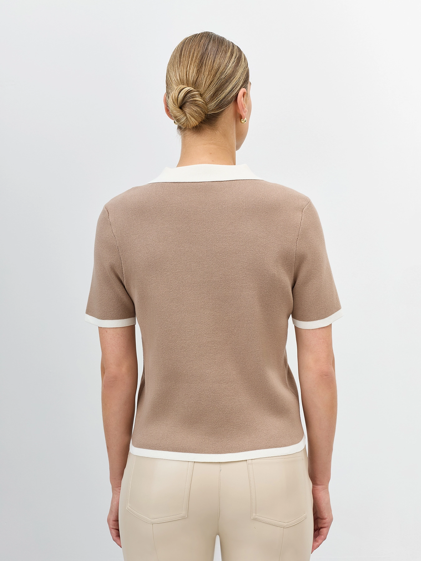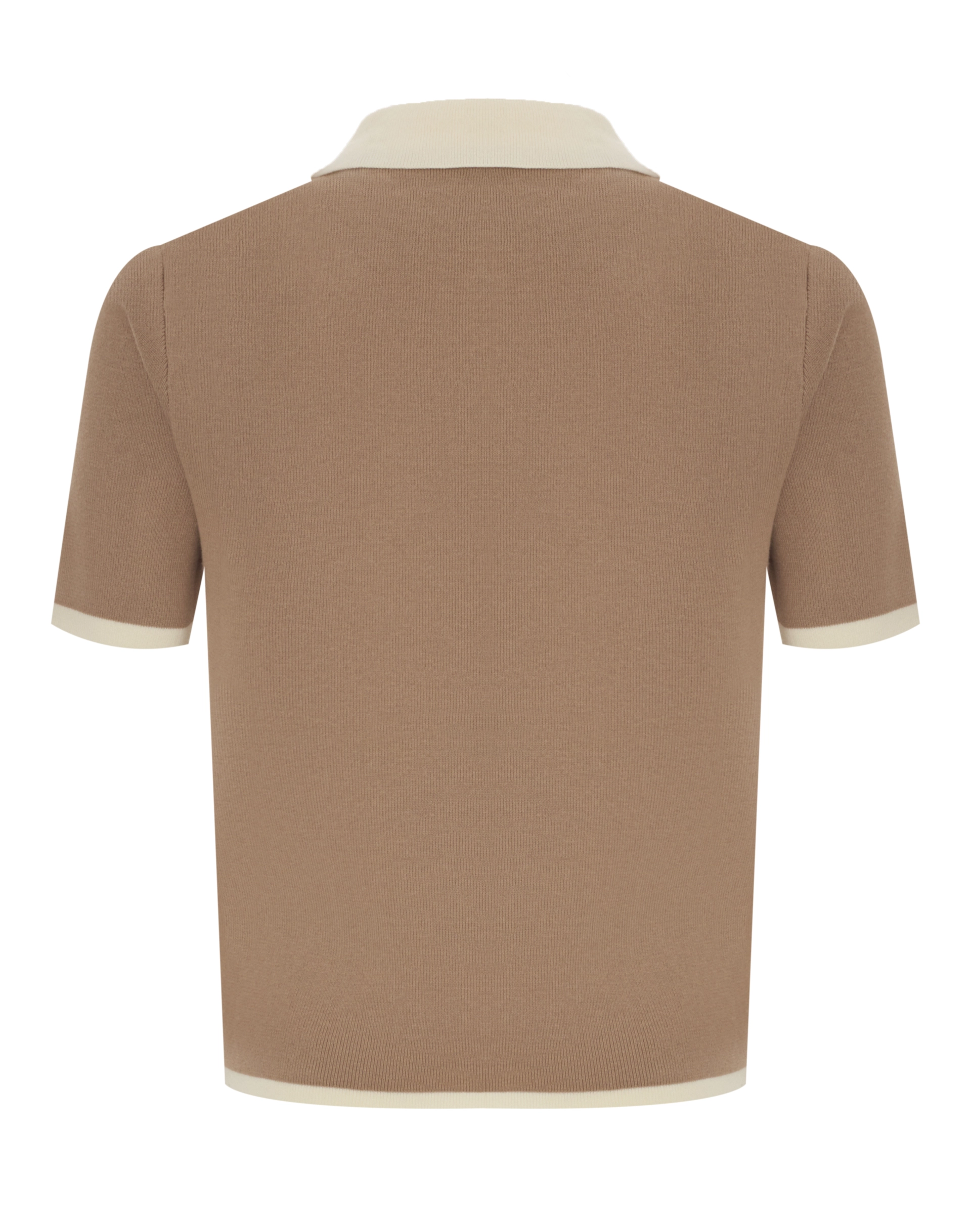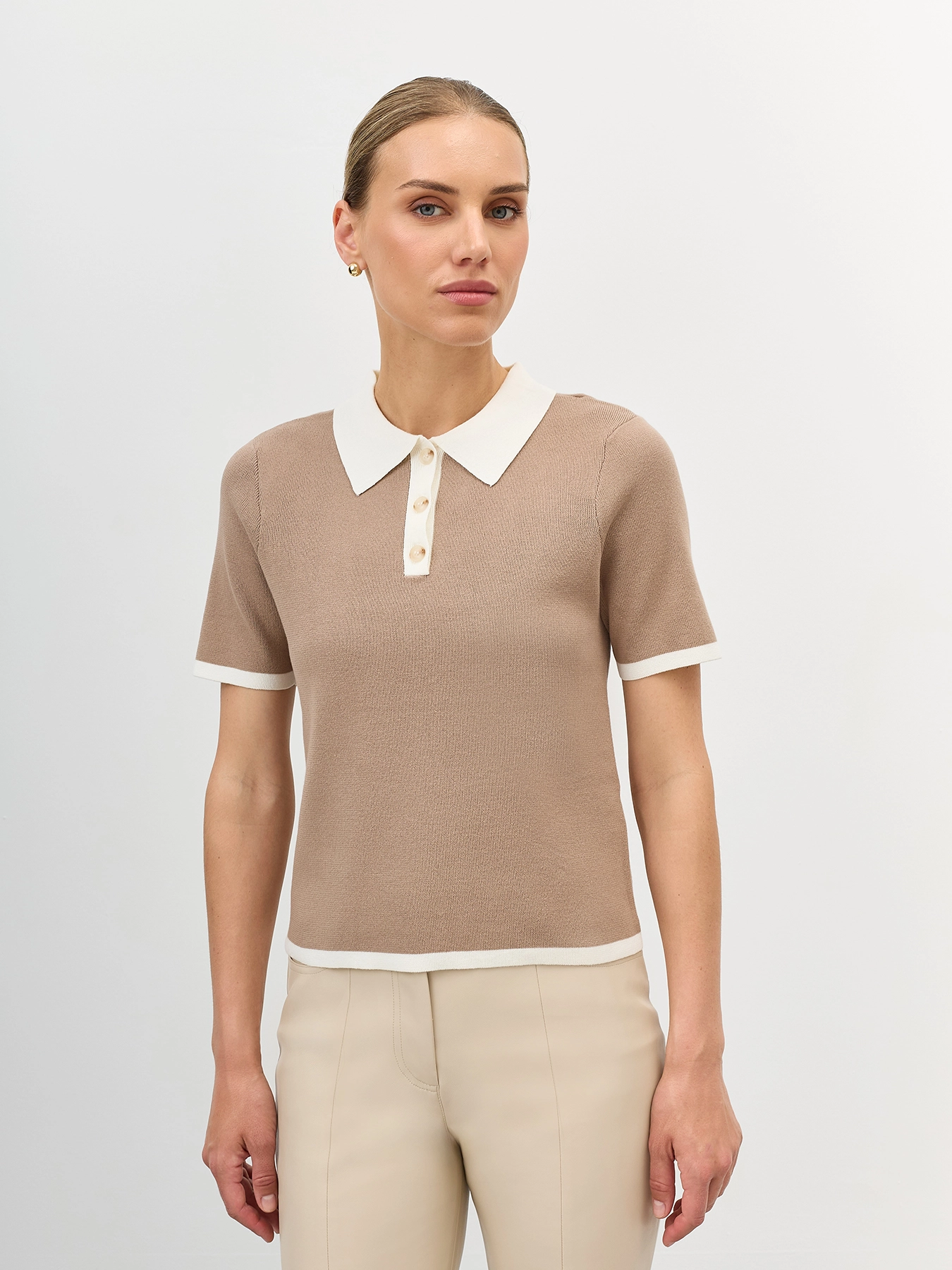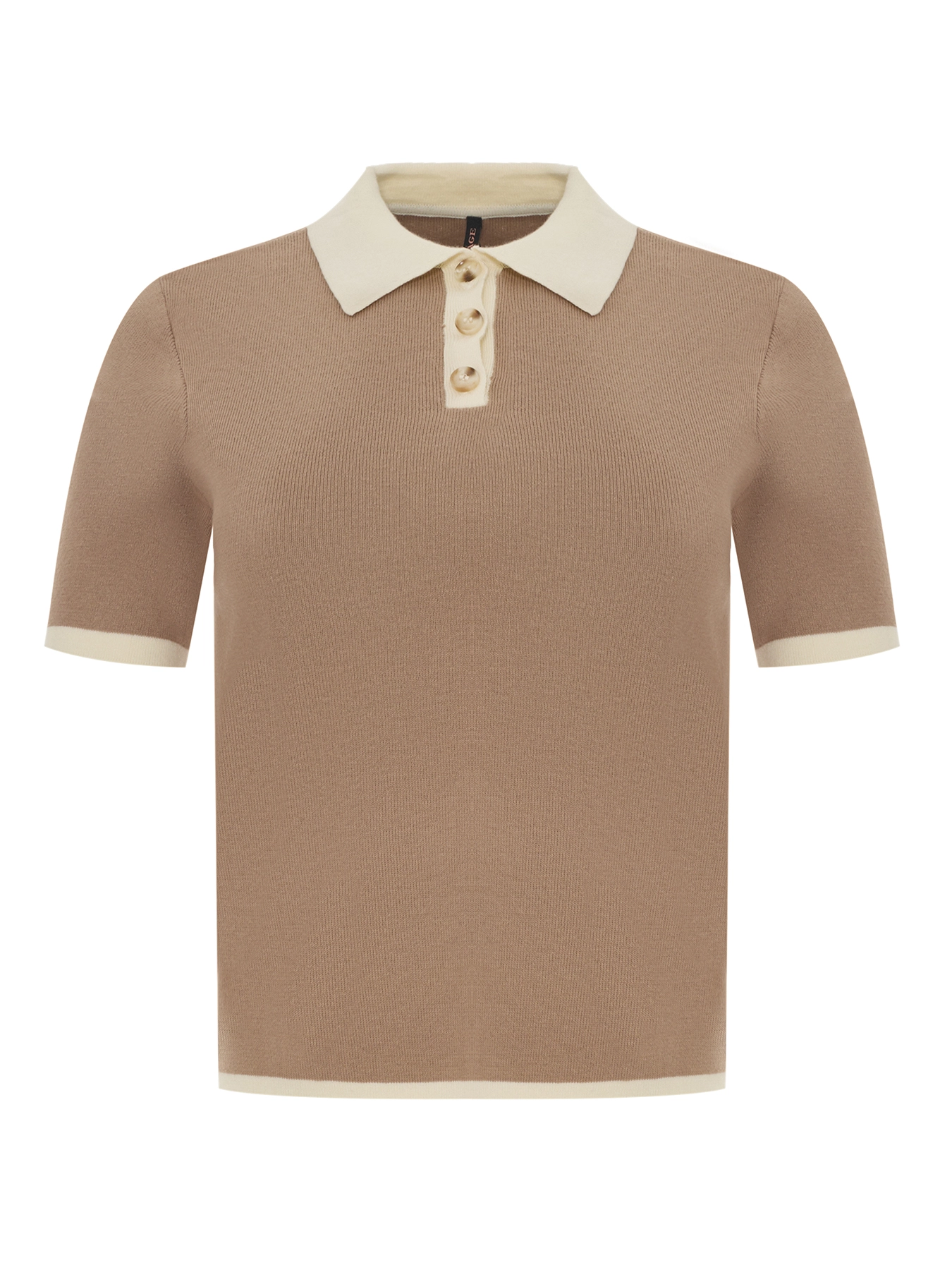 Укороченный джемпер с контрастными деталями. Классический прямой силуэт. Воротник поло контрасного цвета. Короткие рукава. В составе хлопок и нейлон.
