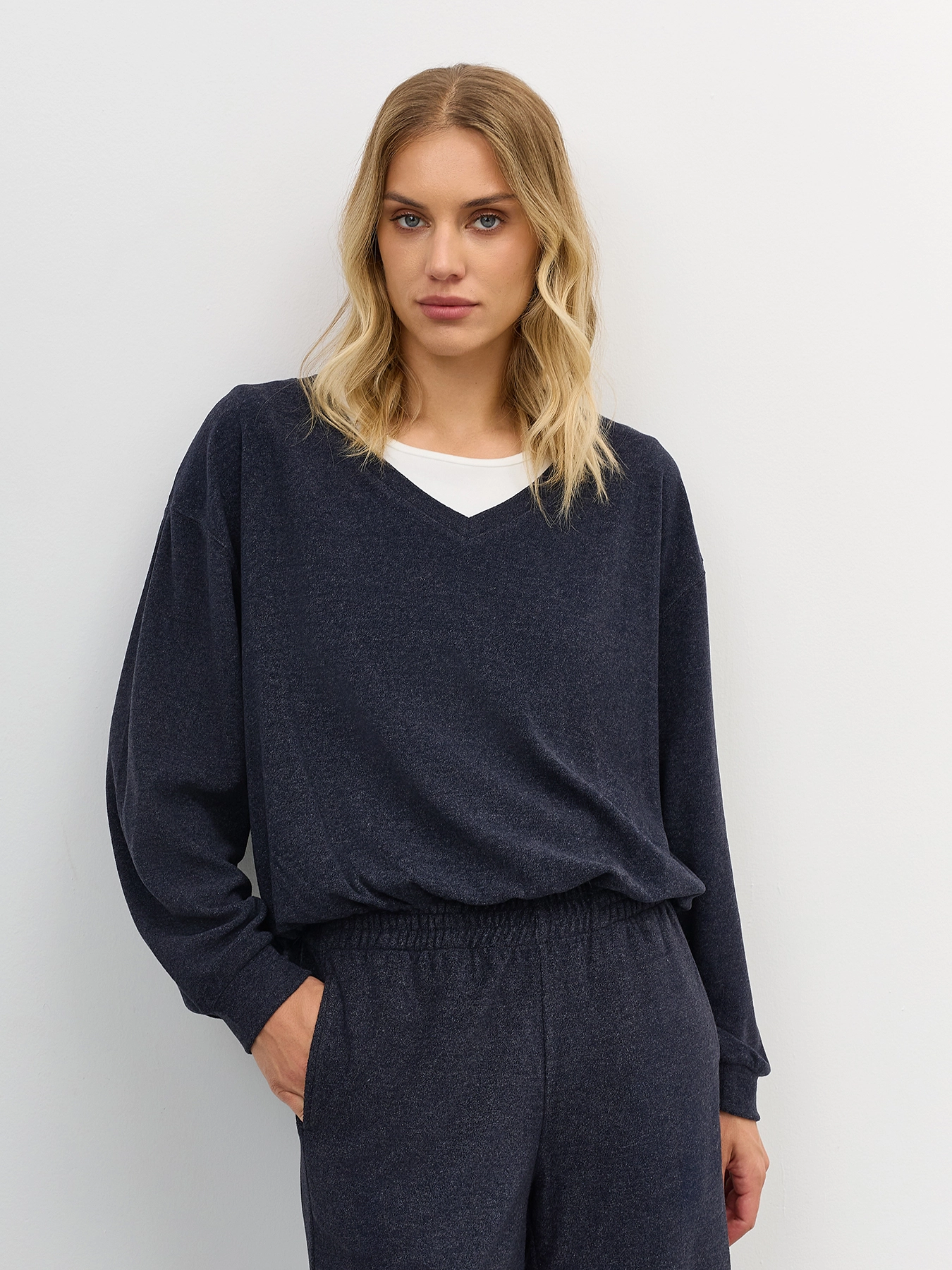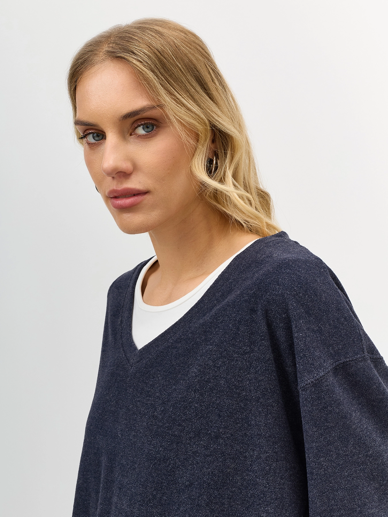 Комбинированный джемпер из фактурного трикотажа с имитацией многослойности. Свободный силуэт. Спущенная линия плеч. V-образный вырез. Резинка и дополнительный объем по низу изделия. В составе вискоза и нейлон. Подкладка имитирующая топ из хлопка. Комплект с арт. 60875.