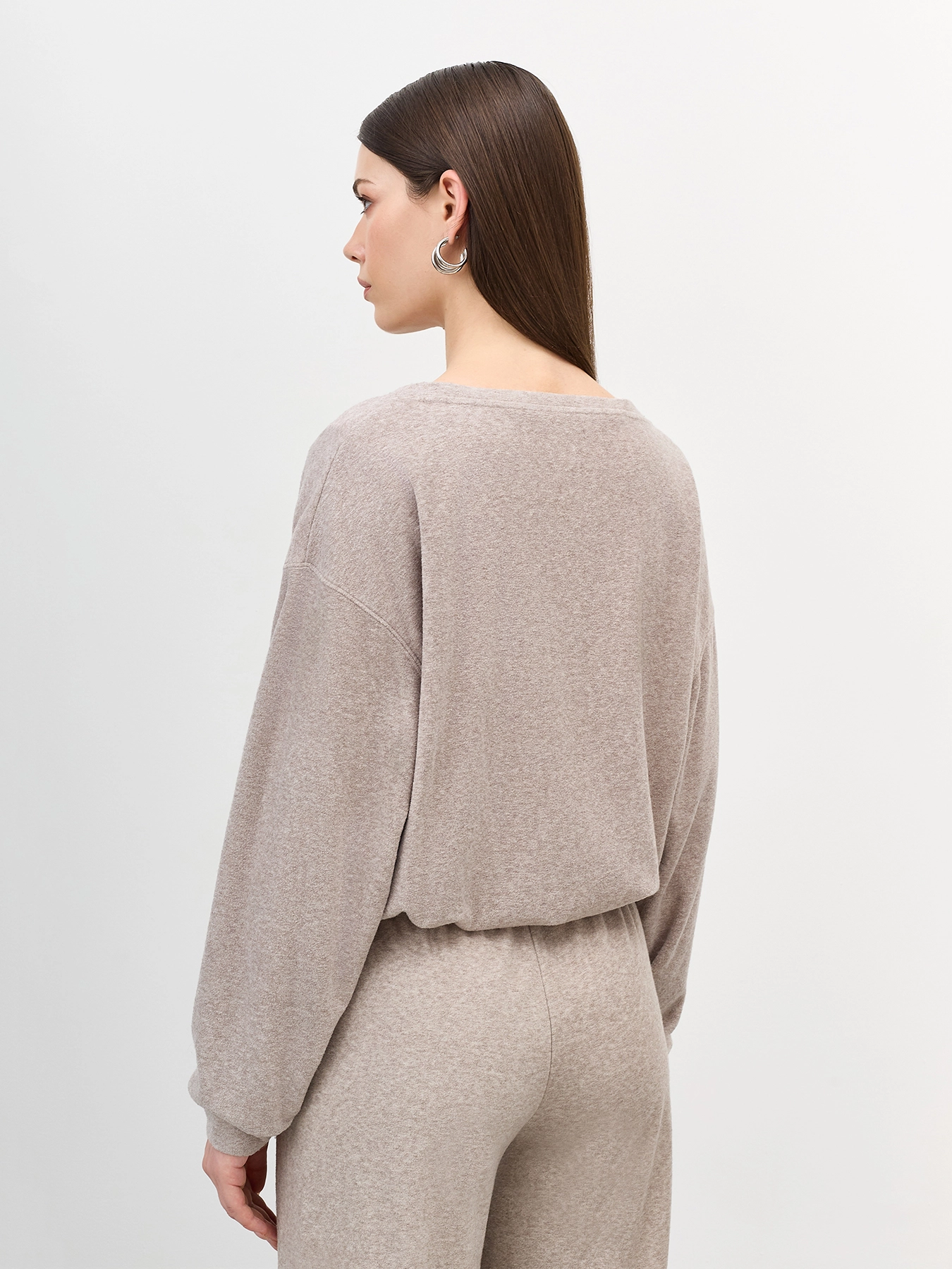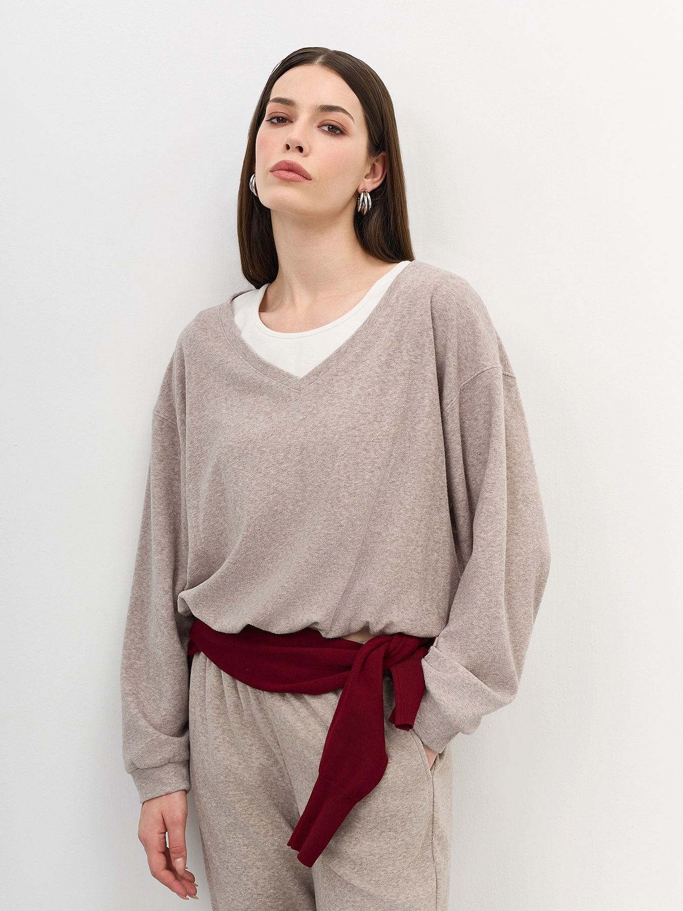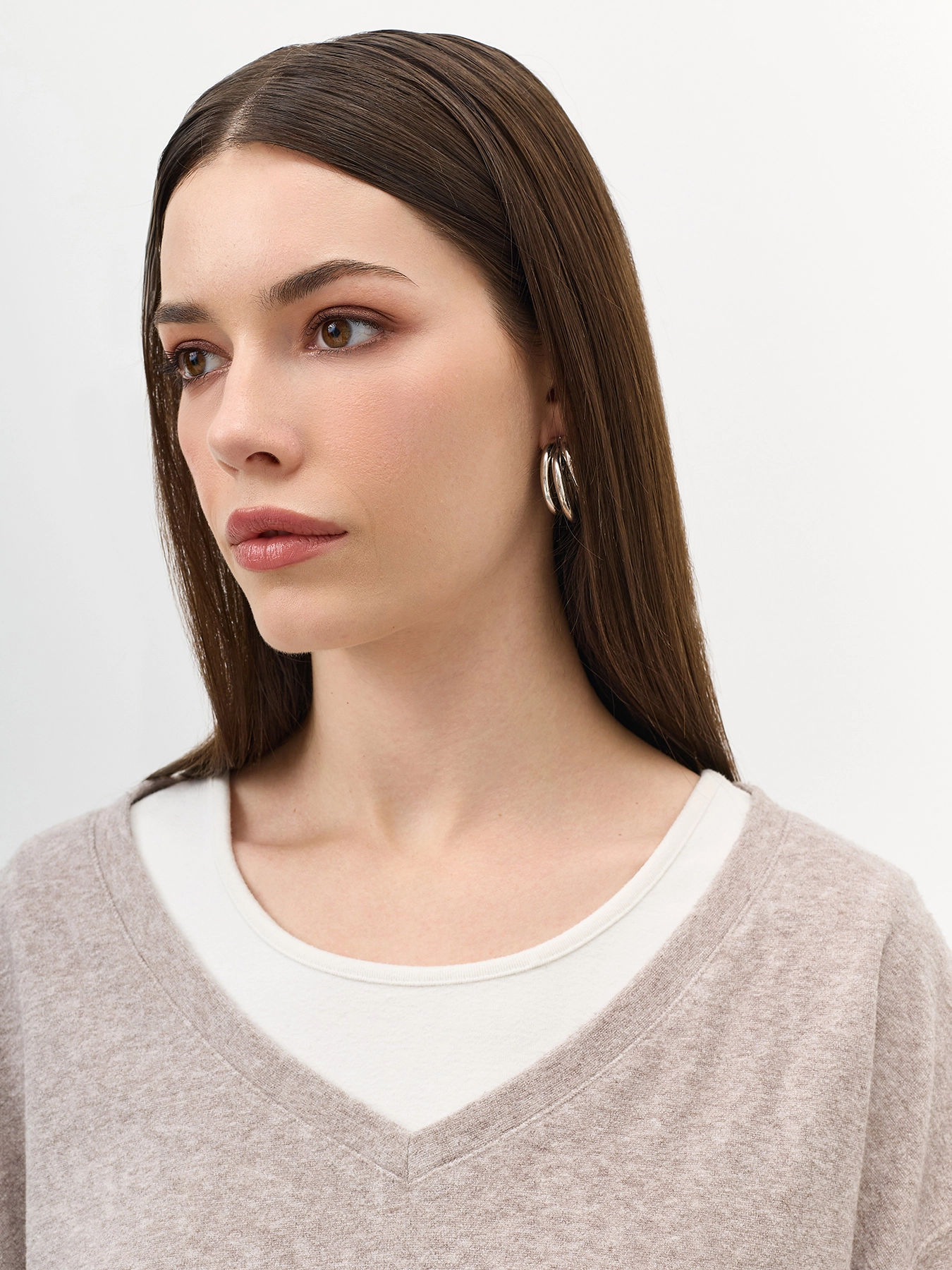 Комбинированный джемпер из фактурного трикотажа с имитацией многослойности. Свободный силуэт. Спущенная линия плеч. V-образный вырез. Резинка и дополнительный объем по низу изделия. В составе вискоза и нейлон. Подкладка имитирующая топ из хлопка. Комплект с арт. 60875.