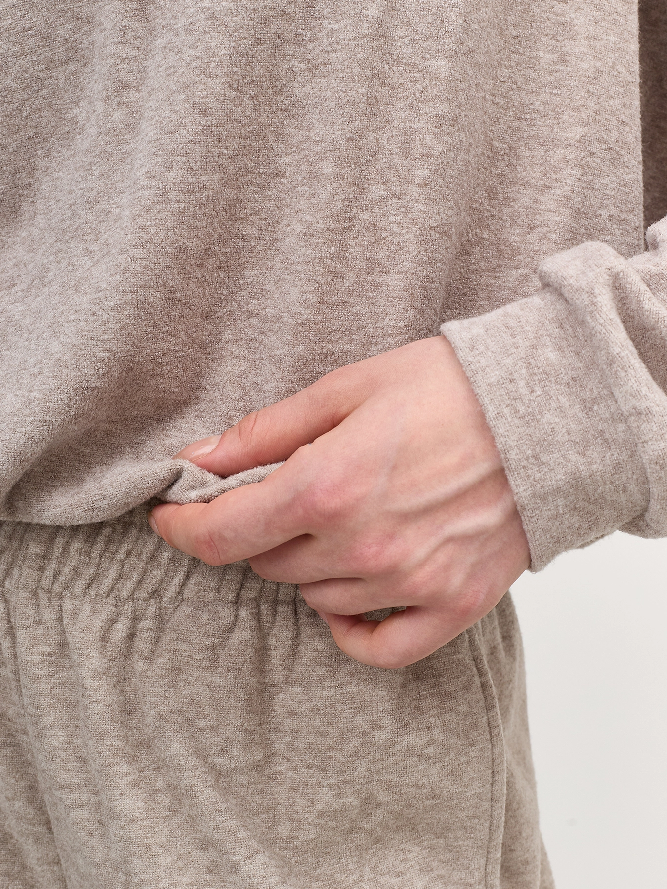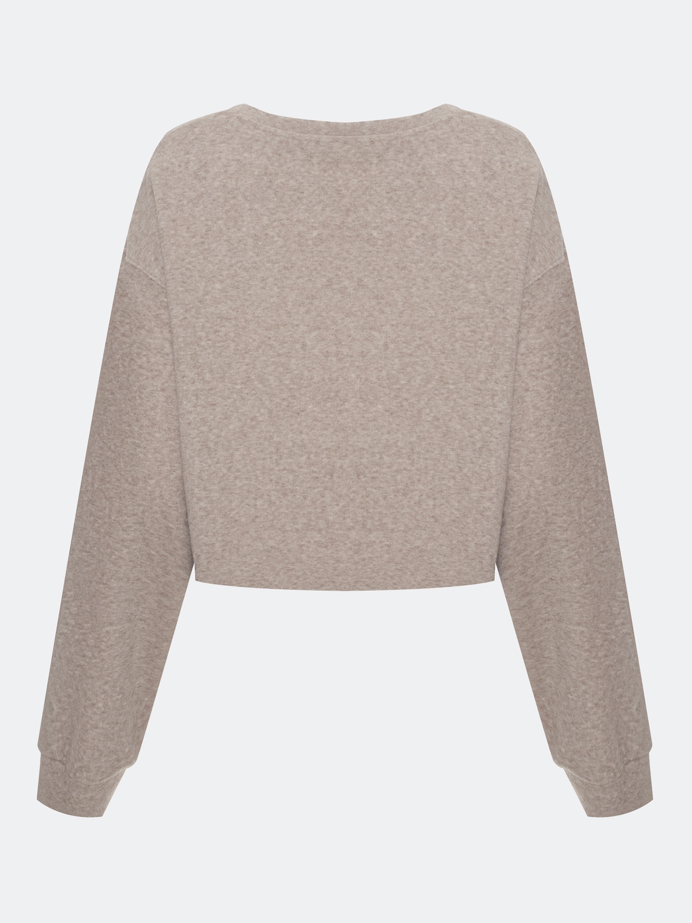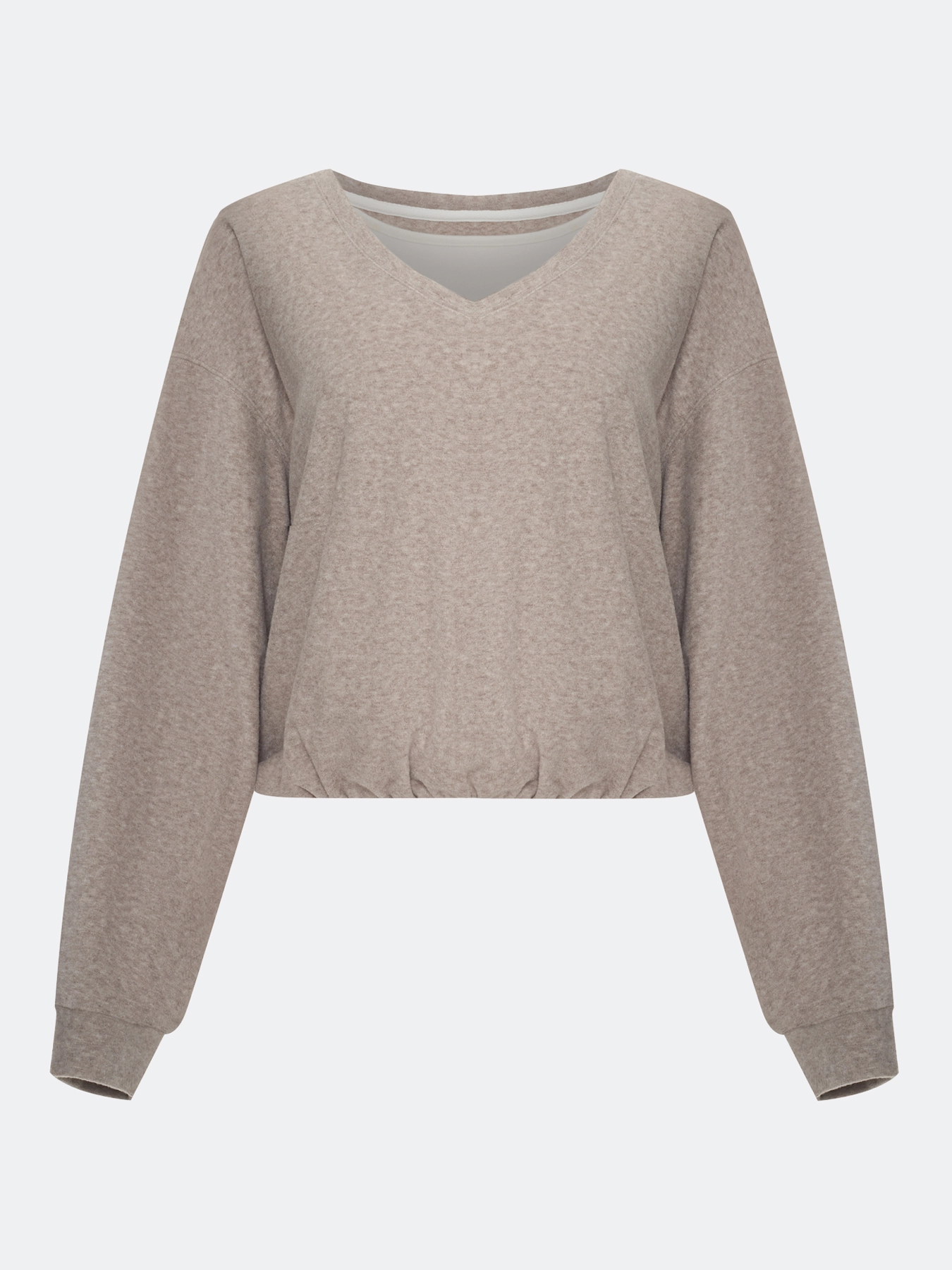 Комбинированный джемпер из фактурного трикотажа с имитацией многослойности. Свободный силуэт. Спущенная линия плеч. V-образный вырез. Резинка и дополнительный объем по низу изделия. В составе вискоза и нейлон. Подкладка имитирующая топ из хлопка. Комплект с арт. 60875.