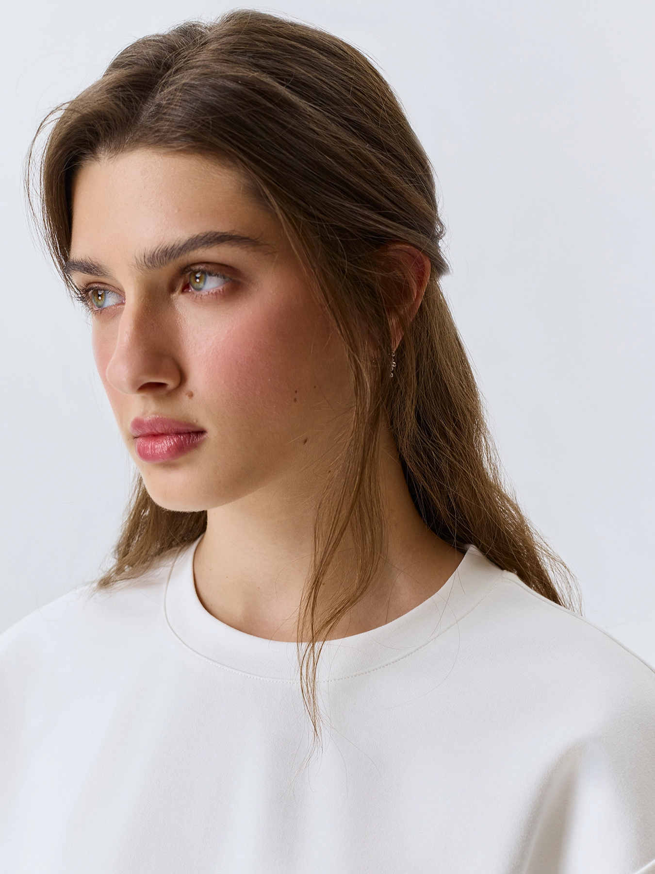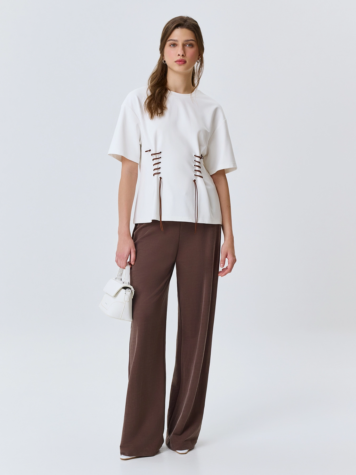 Джемпер из смесовой вискозы. Свободный силуэт притален яркой шнуровкой. Круглый вырез. Спущенная линия плеч. Укороченные рукава.