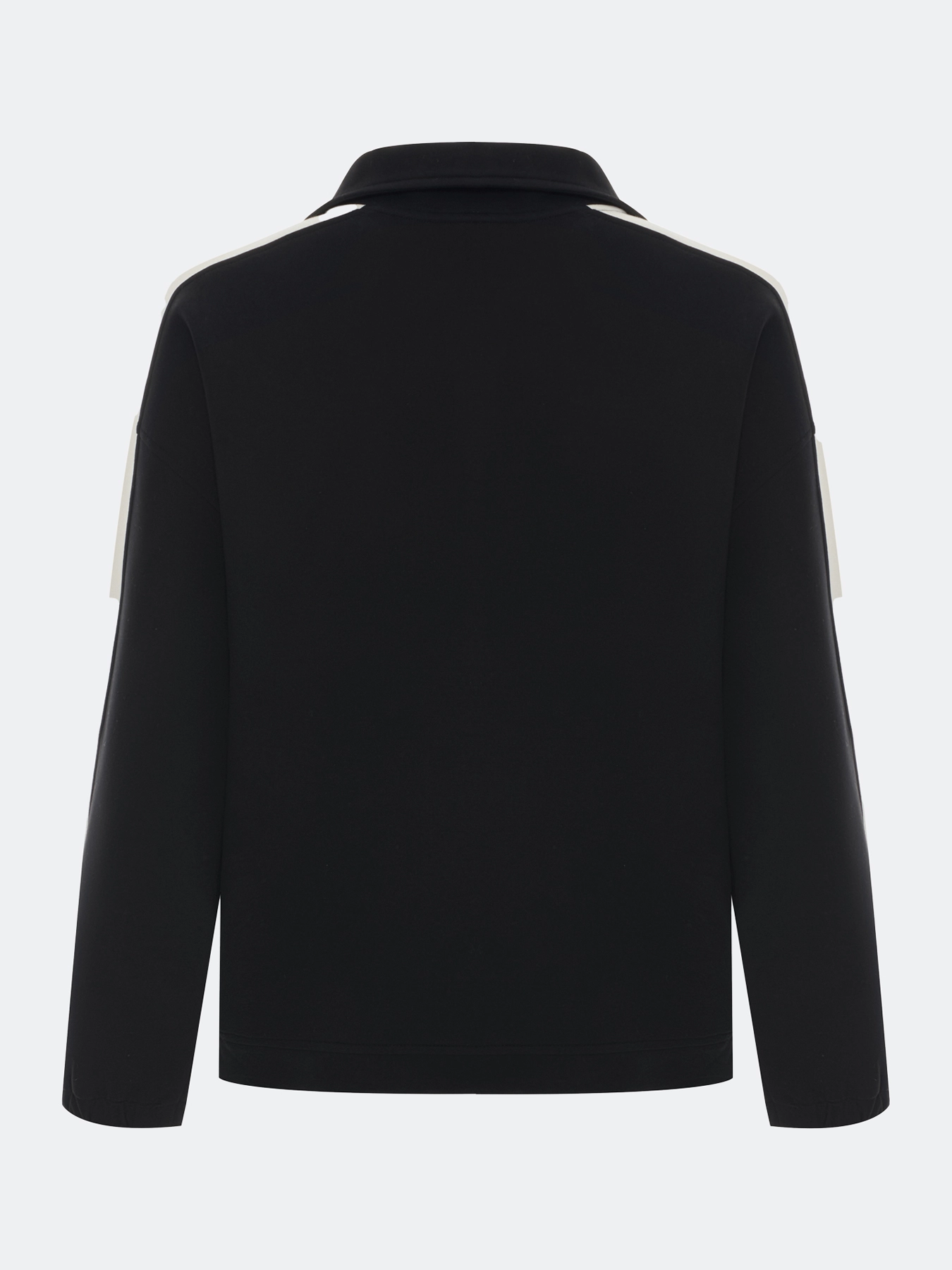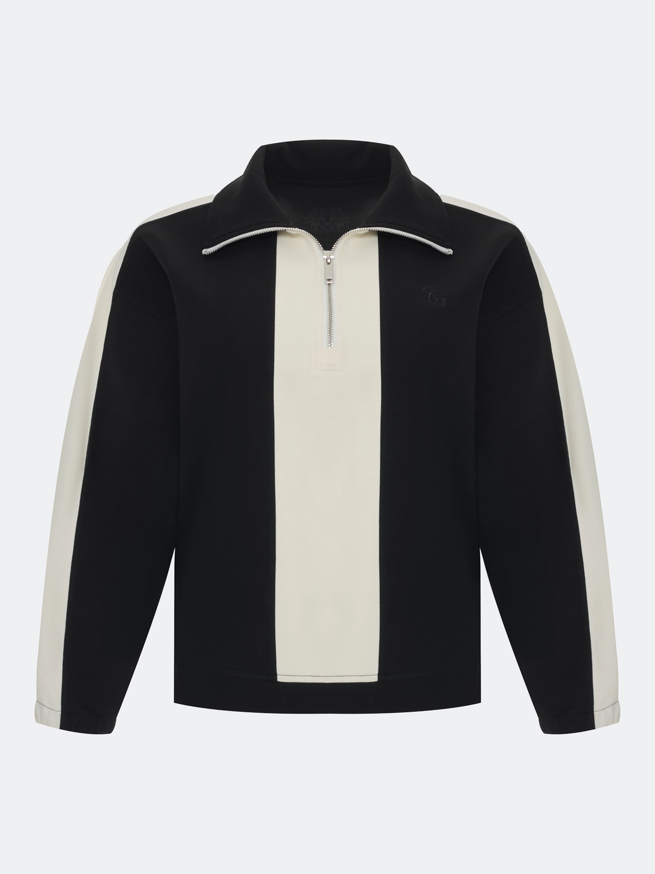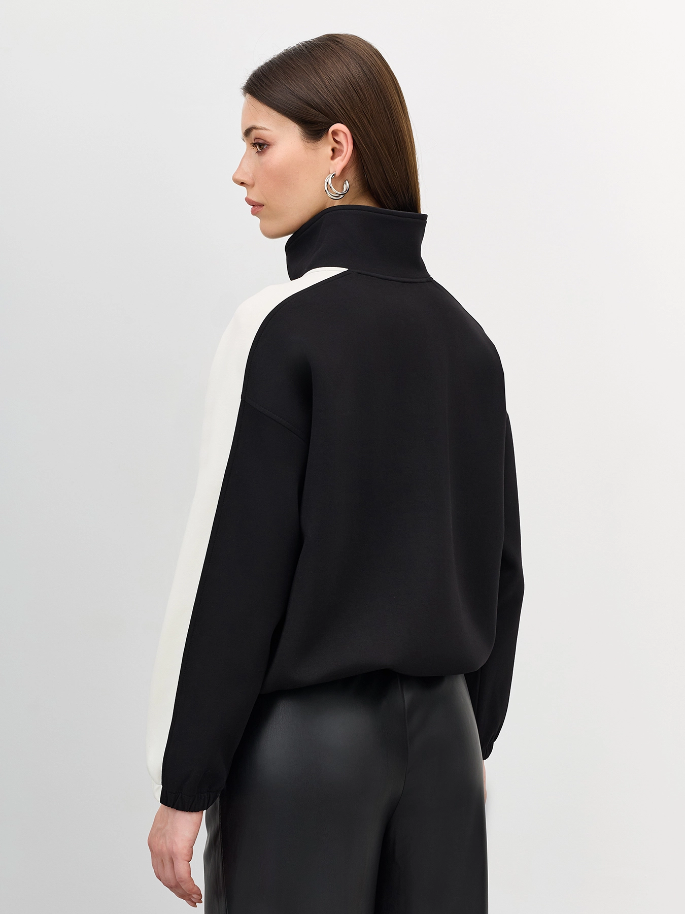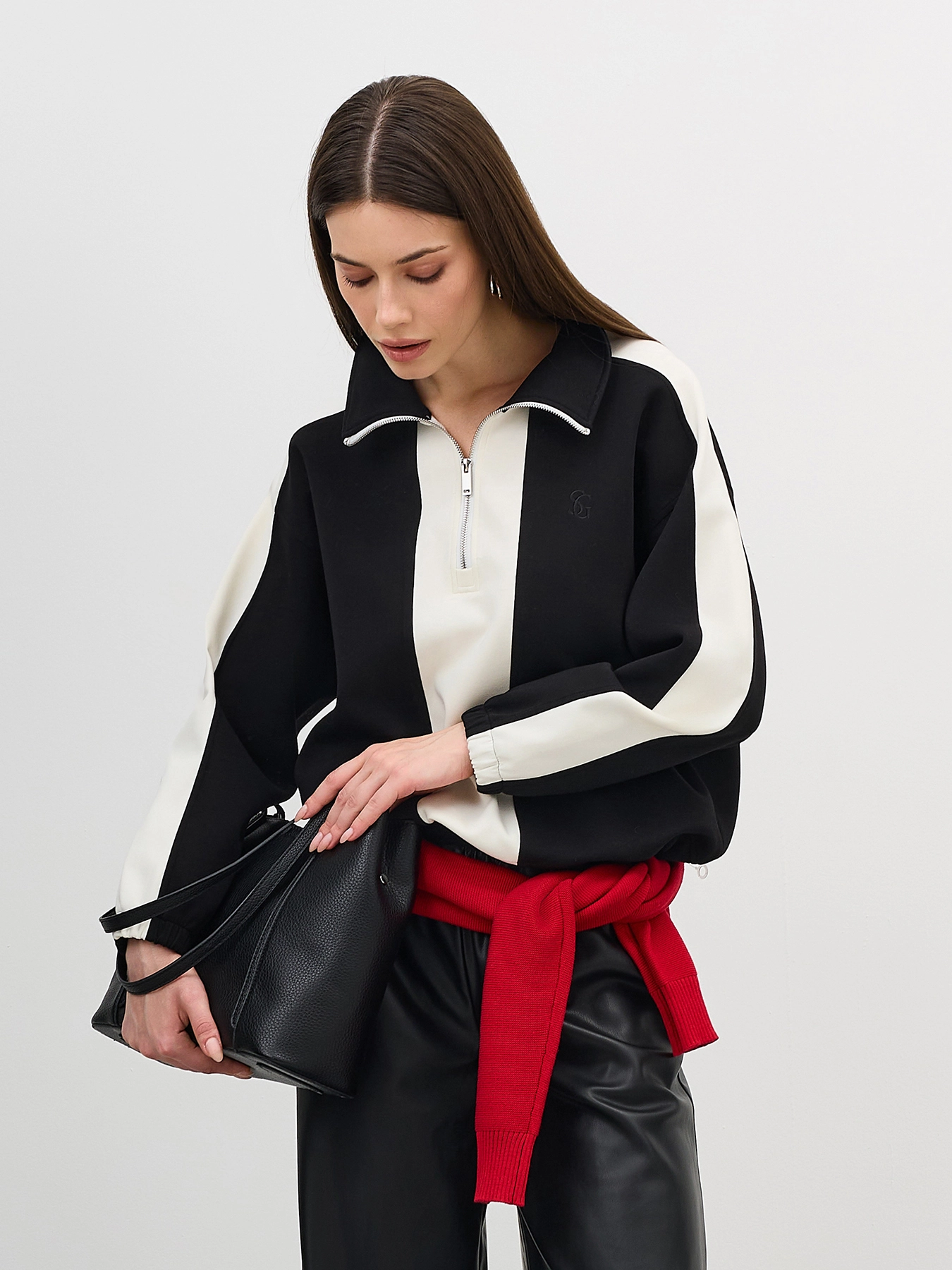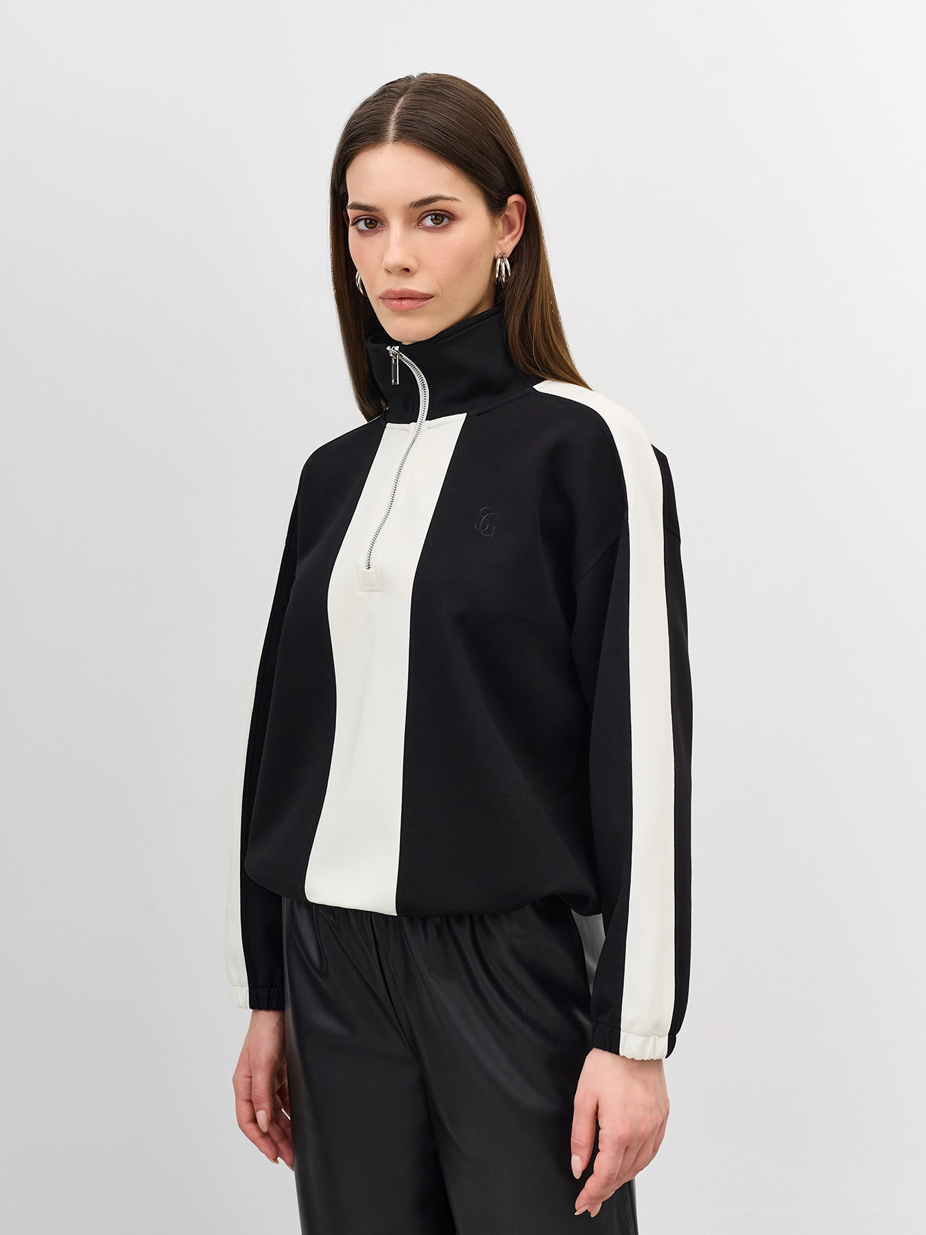 Джемпер в спортивном стиле с контрастными вставками в стиле "color block". Свободный силуэт. Воротник стойка с застежкой молнией. Спущенная линия плеч. Резинка по низу рукавов. В составе хлопок. Комплект с арт. 60834.
