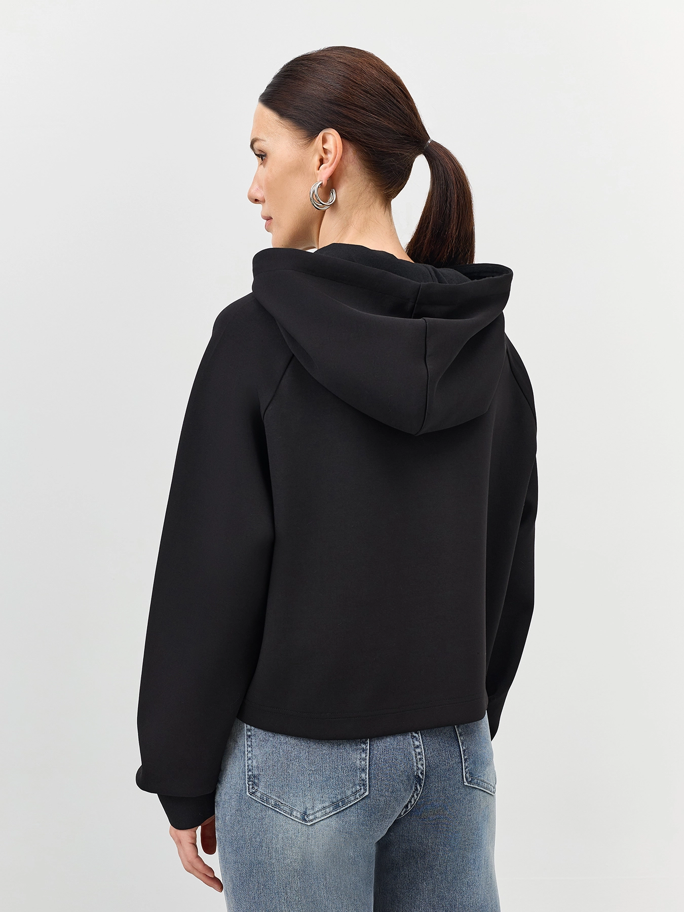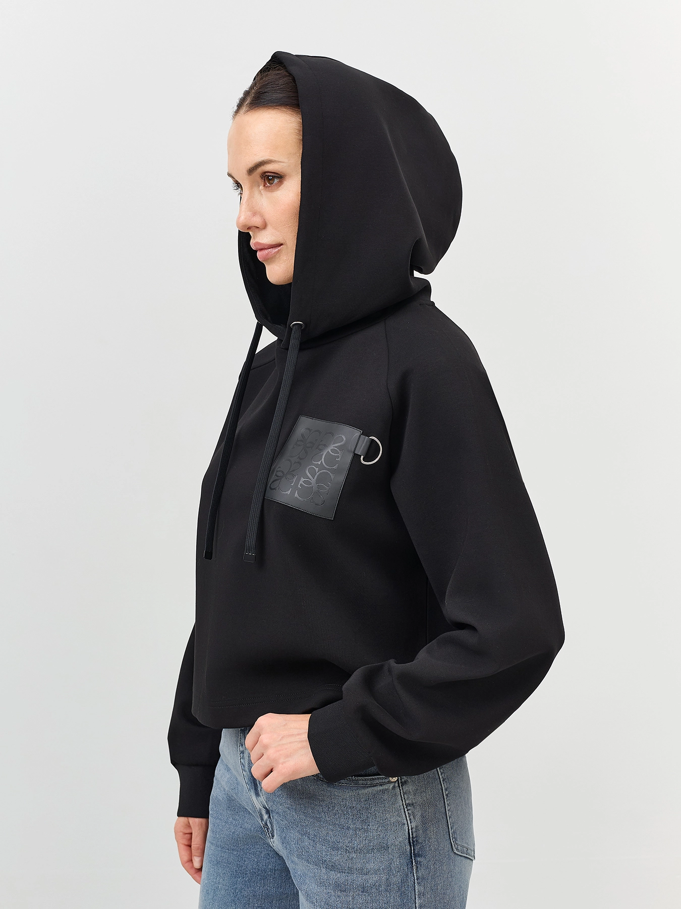 Укороченный худи с деталью из экокожи на груди. Свободный силуэт. Воротник с капюшоном с кулиской и шнурком. Манжеты по низу рукавов. Дополнен металлической фурнитурой. В составе хлопок.