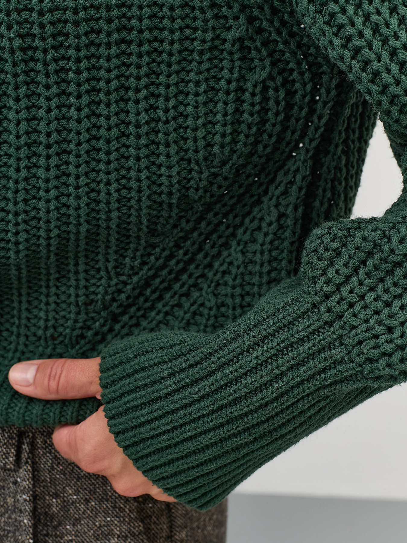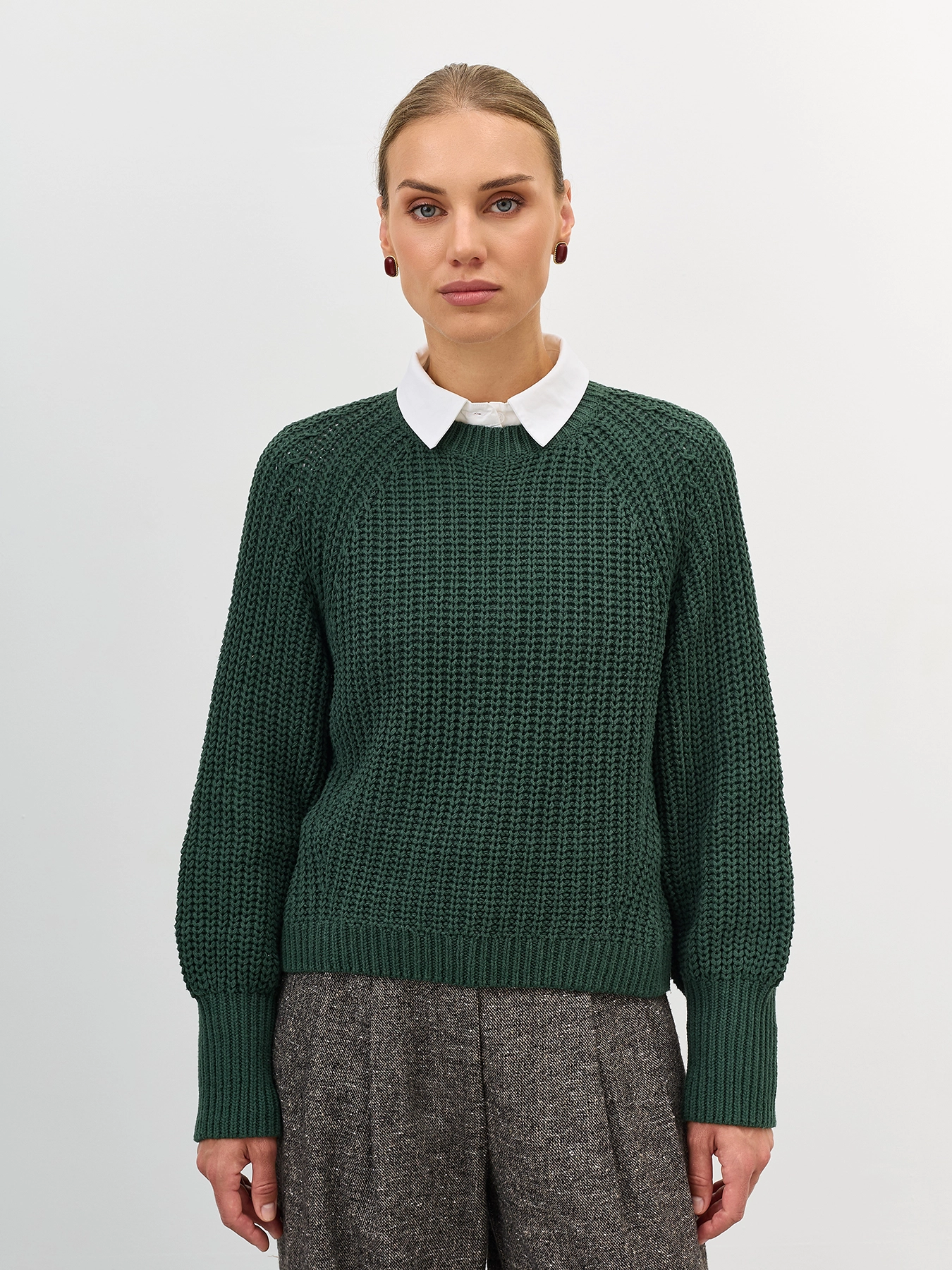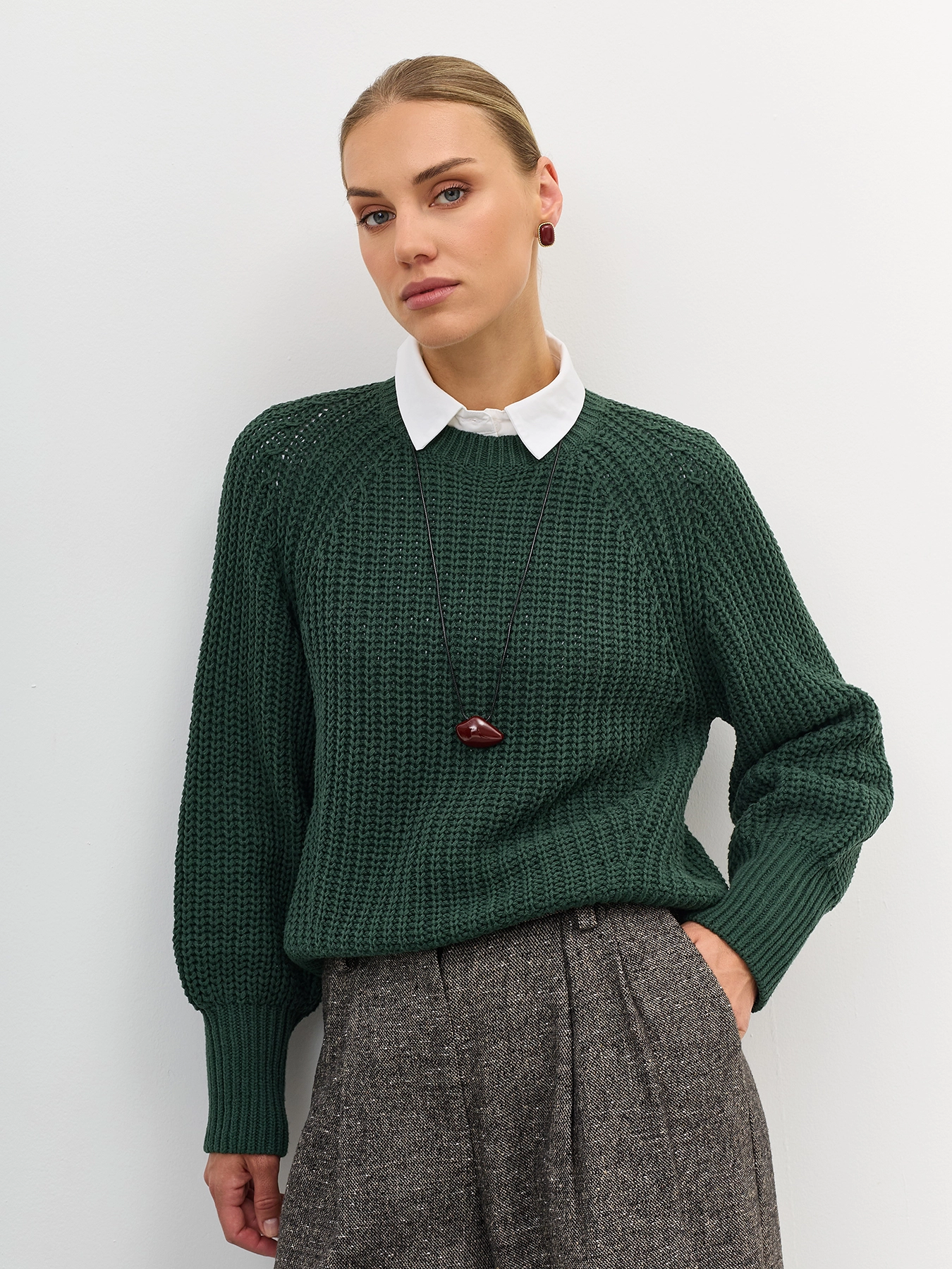 Объемный свитер крупной вязки из смесового хлопка. Свободный силуэт. Круглый вырез. Объемные длинные рукава реглан. Манжеты по низу рукавов.