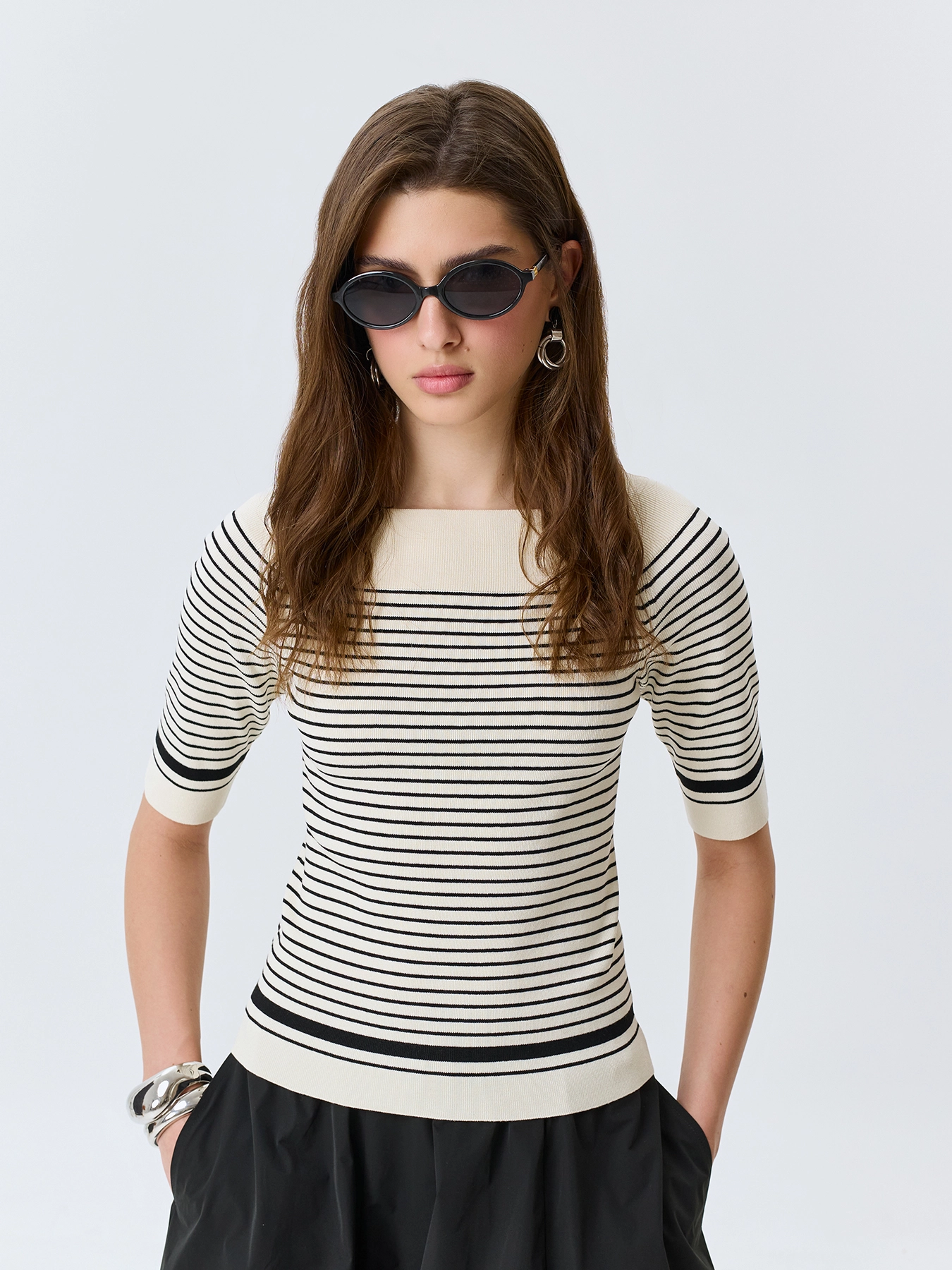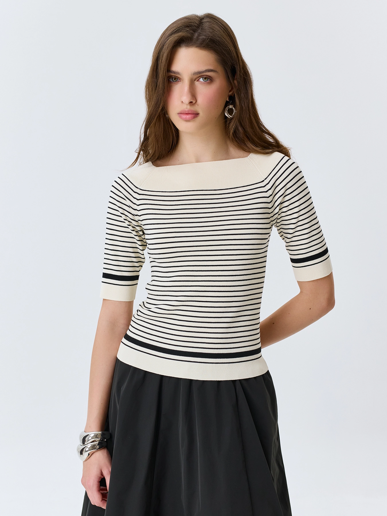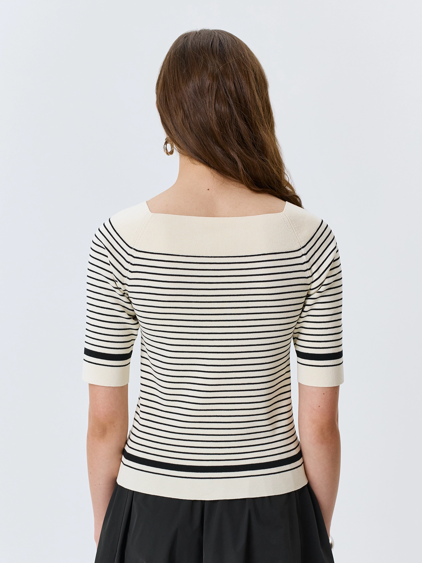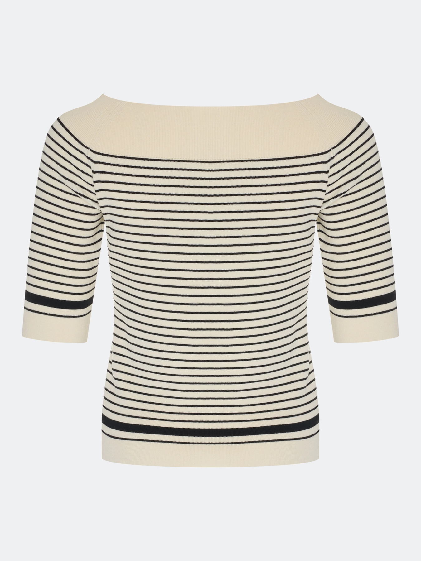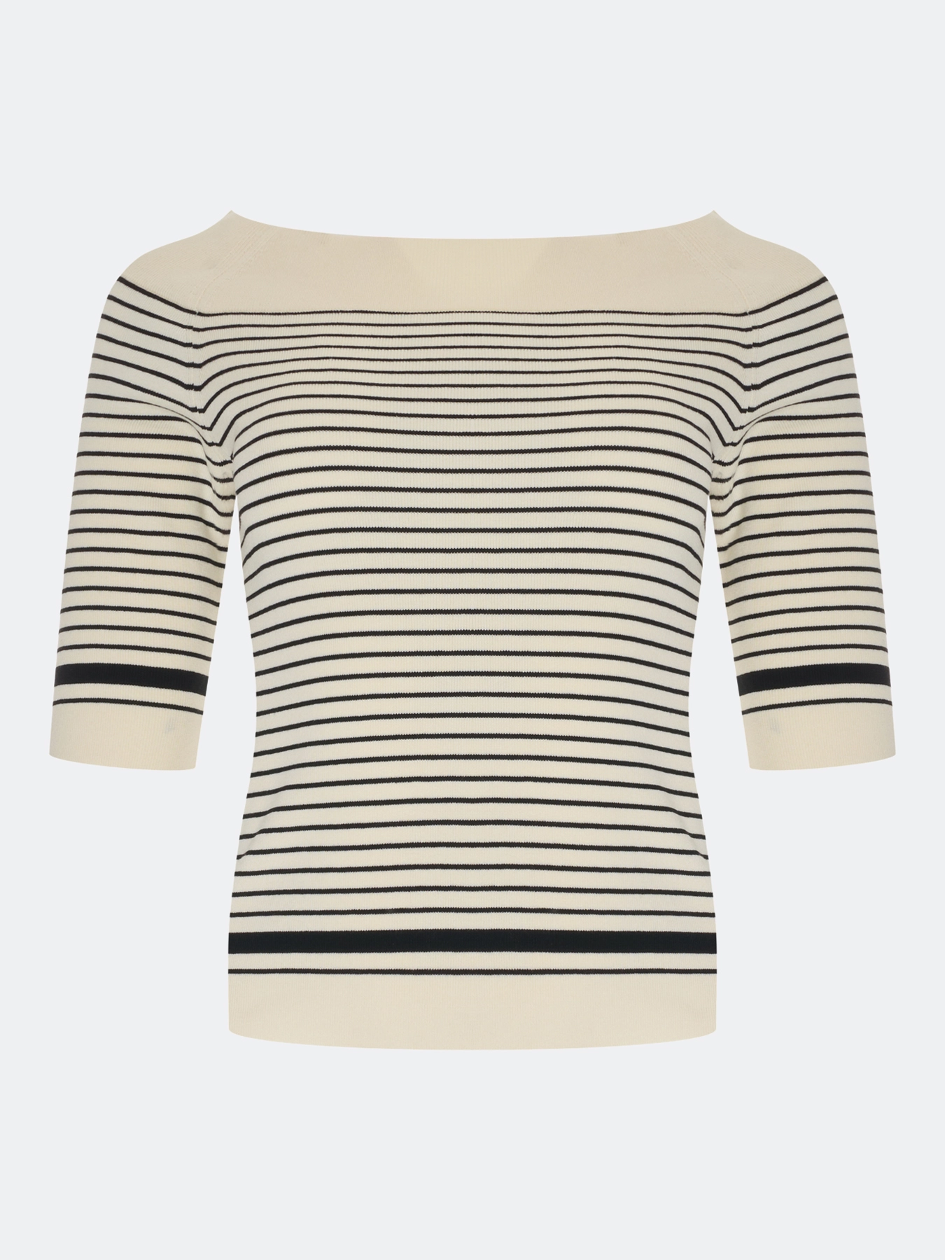 Элегантный вязаный джемпер из 100% вискозы в контрастную полоску. Приталенный силуэт. Акцентный вырез лодочка. Укороченные рукава. Дополнен рибом по горловине, низу изделия и рукавов.