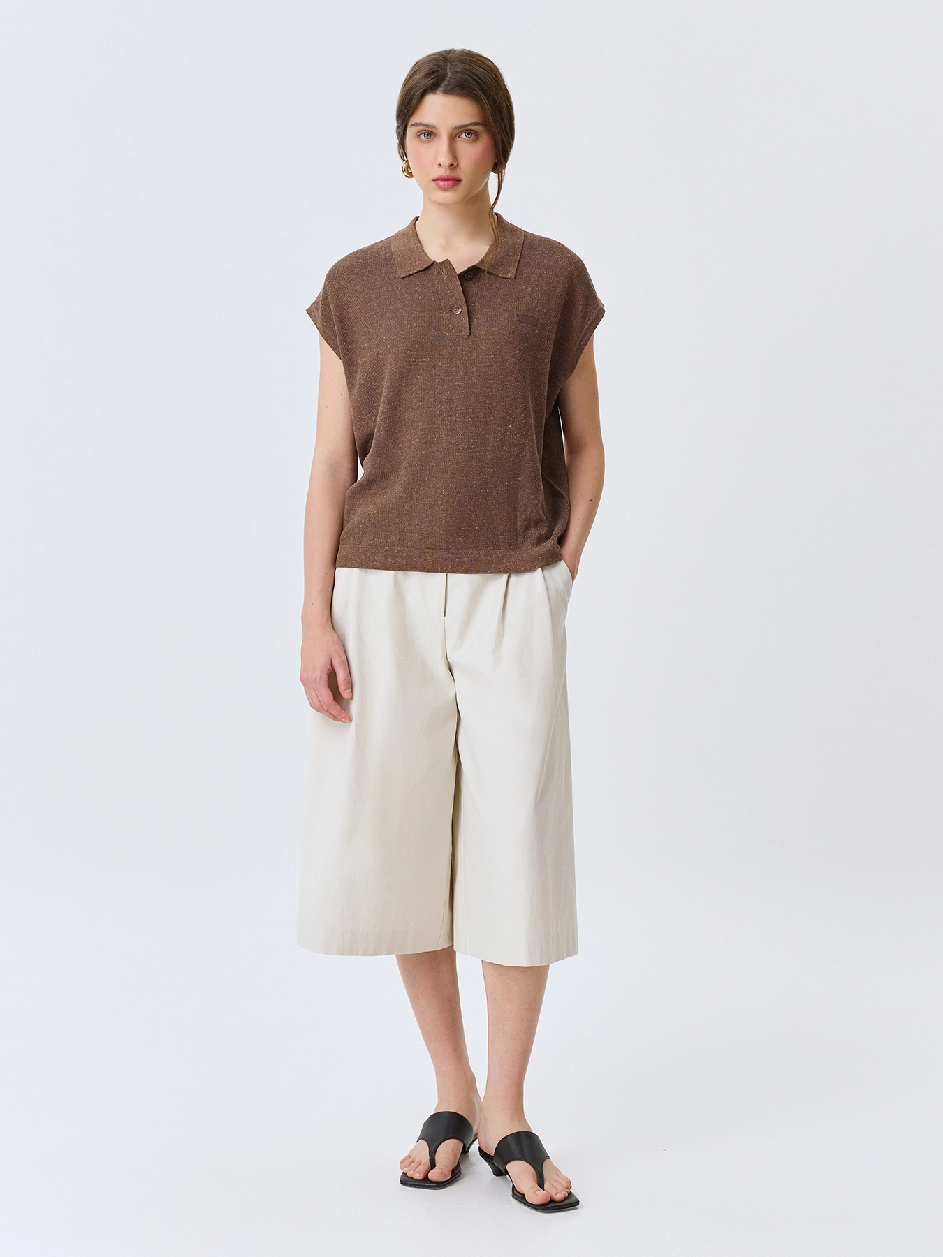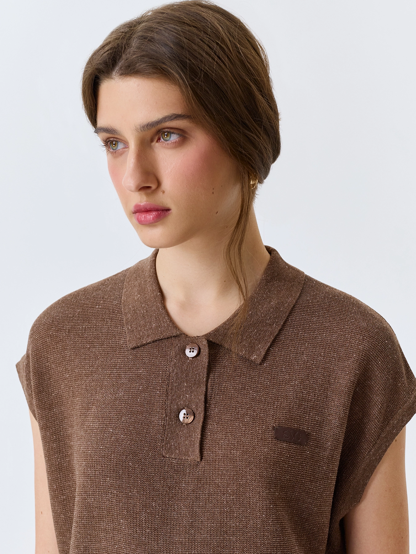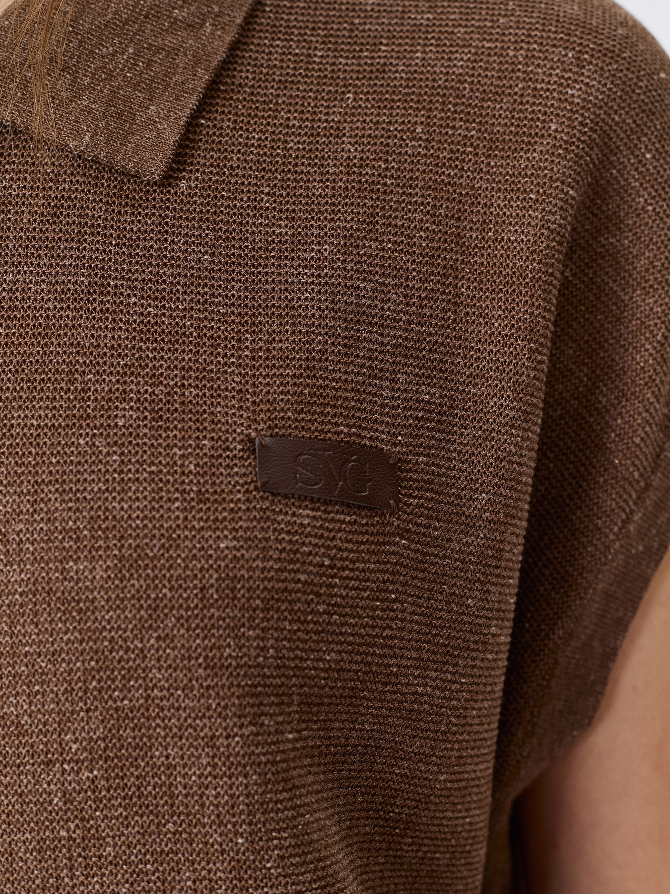 Вязаное поло из пряжи с лиоцеллем и льном. Свободный силуэт. Отложной воротник-поло на пуговицах. Короткие цельнокроенные рукава. Спущенная линия плеч. Деликатный декор из эко кожи.