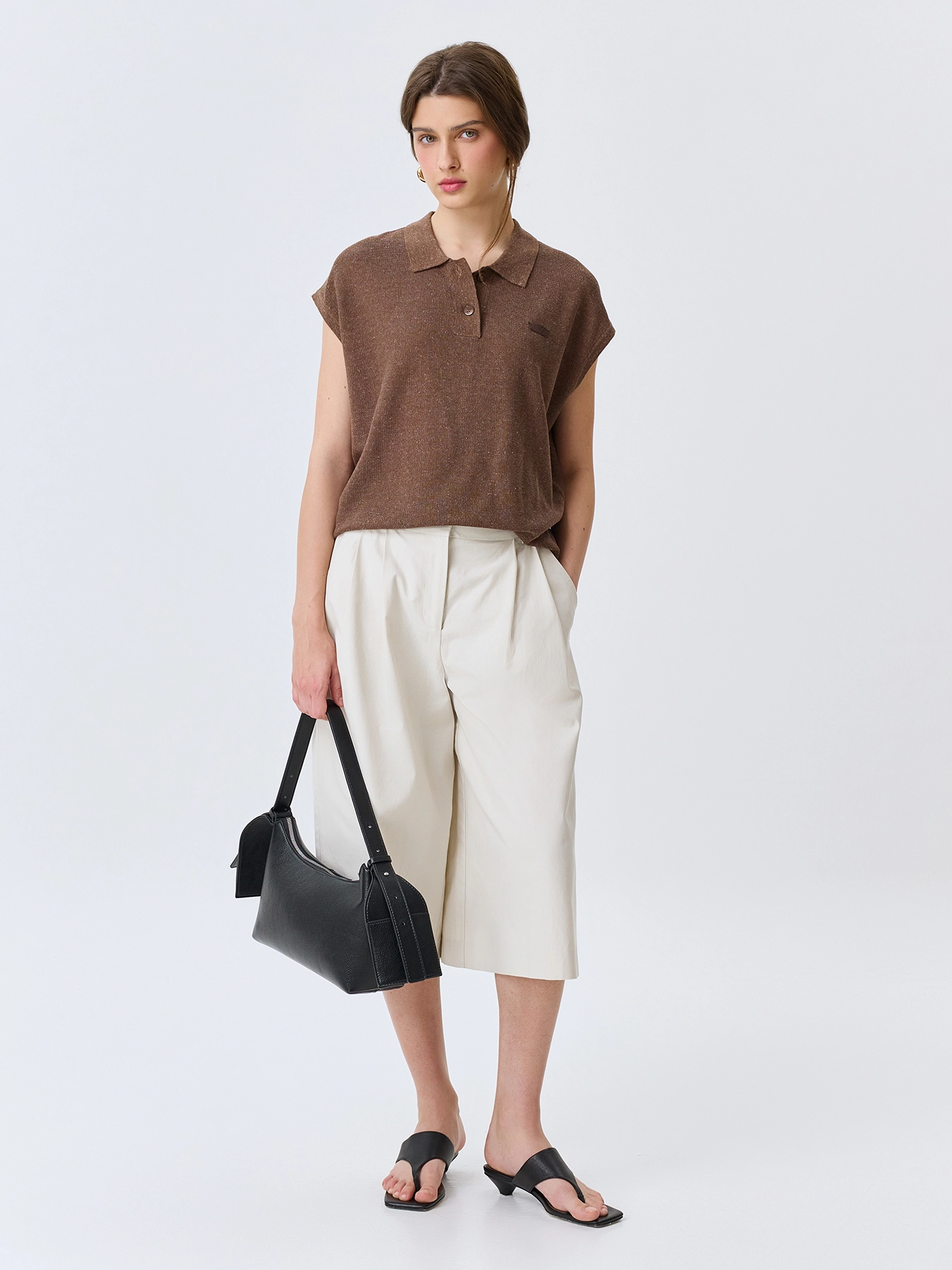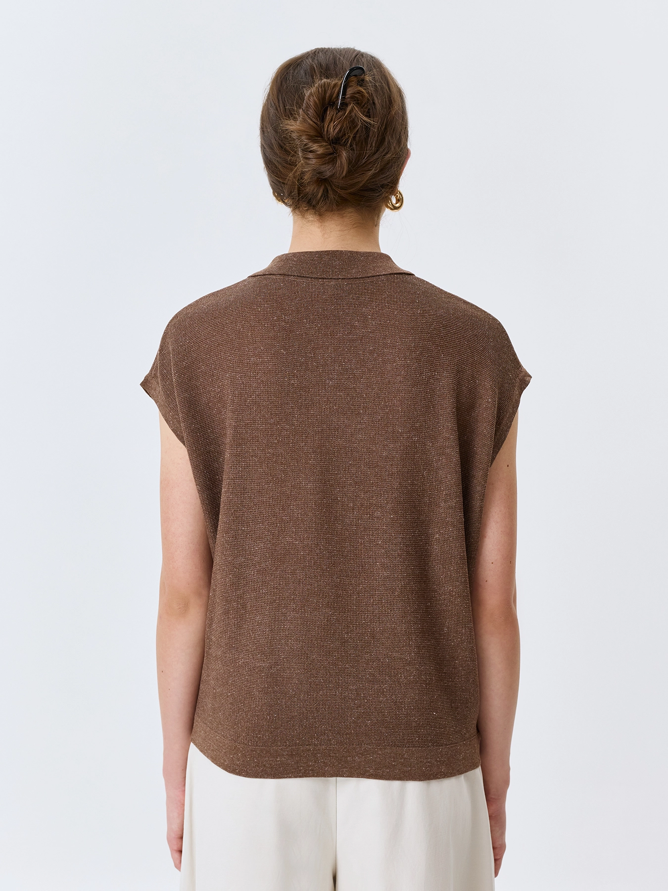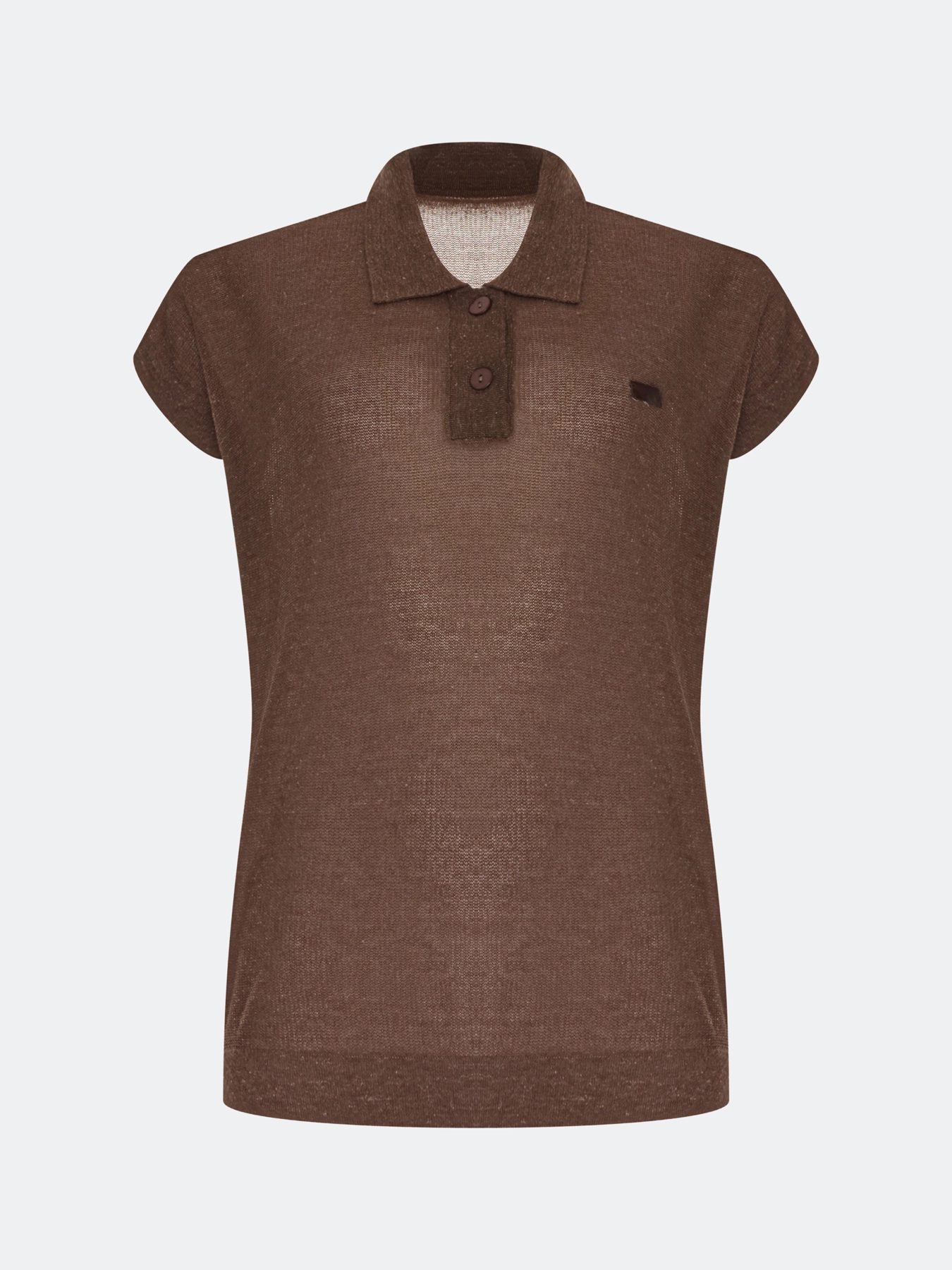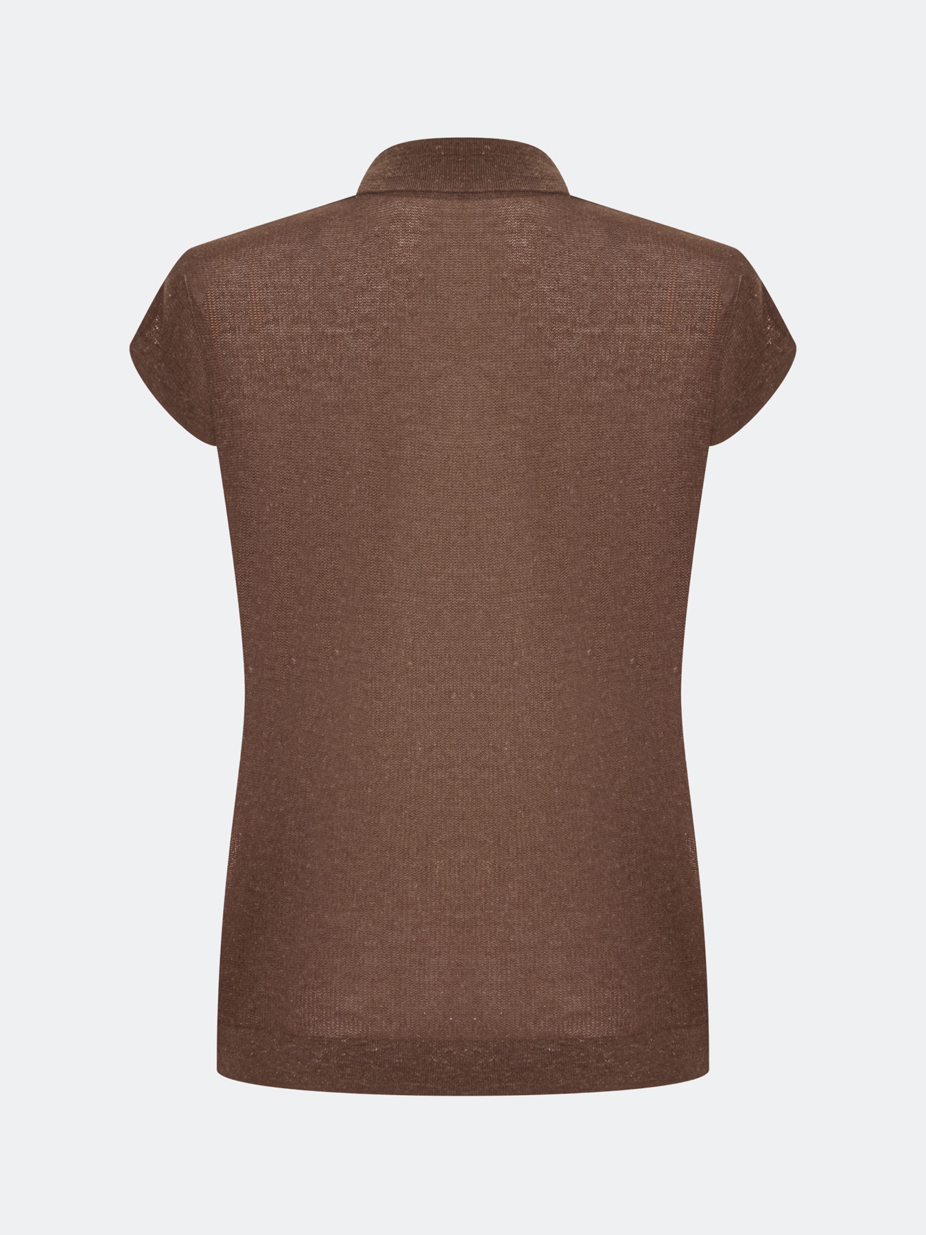 Вязаное поло из пряжи с лиоцеллем и льном. Свободный силуэт. Отложной воротник-поло на пуговицах. Короткие цельнокроенные рукава. Спущенная линия плеч. Деликатный декор из эко кожи.
