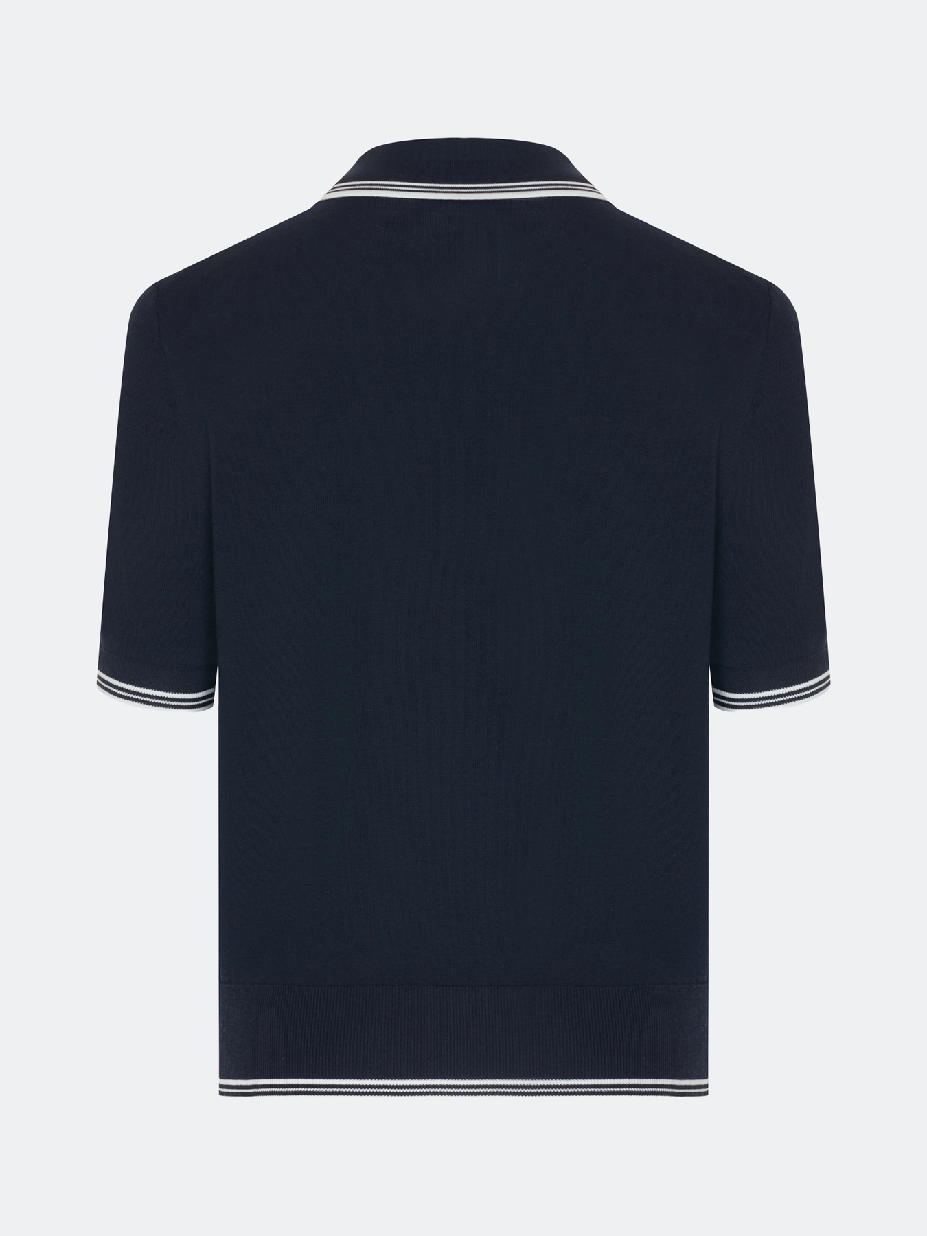 Вязаное поло из вискозы с контрастными полосками по линии воротника, низу рукавов и изделия. Прилегающий силуэт. Отложной воротник-поло. Укороченные втачные рукава. Застежка на пуговицы. В составе вискоза.
