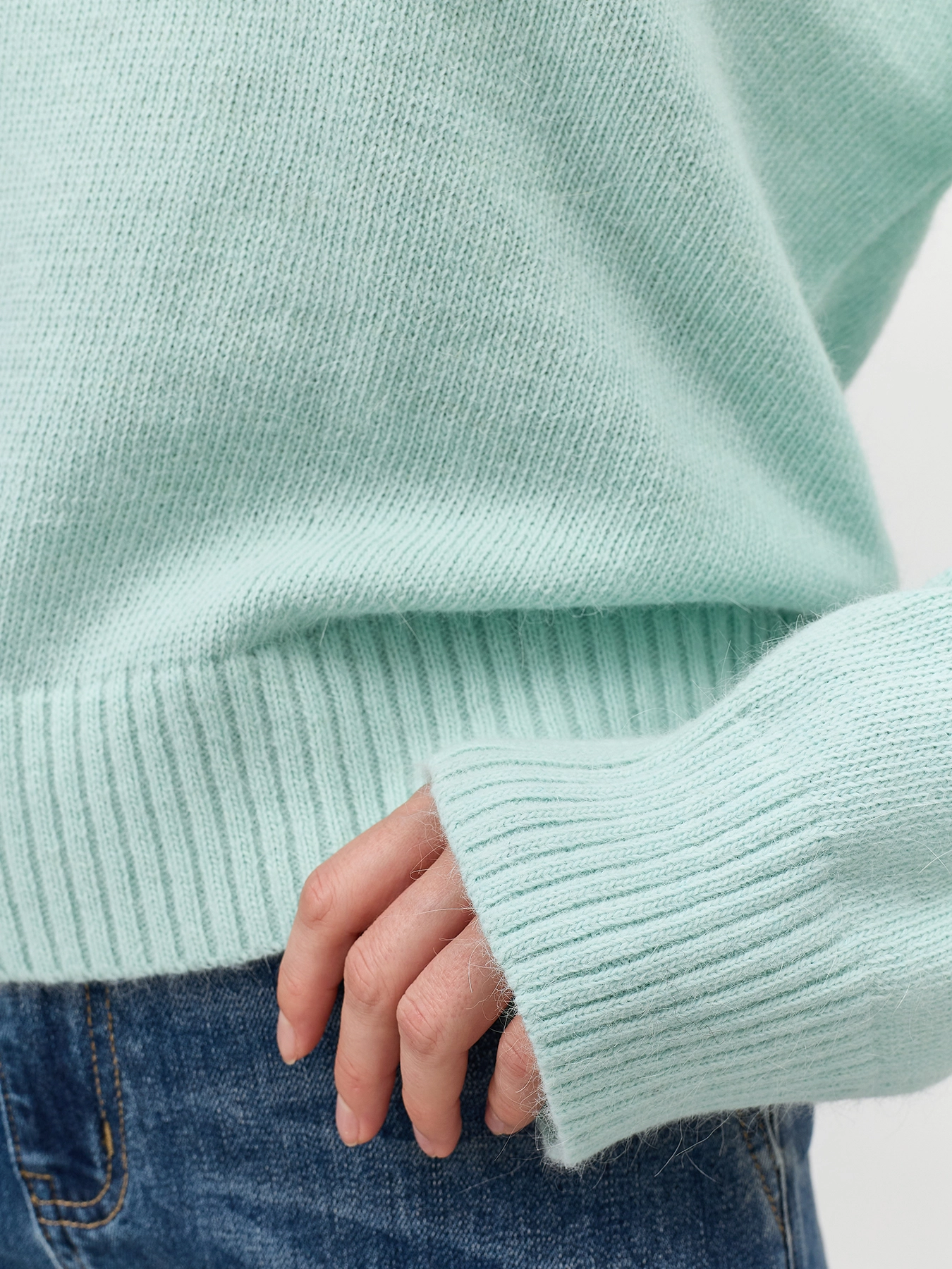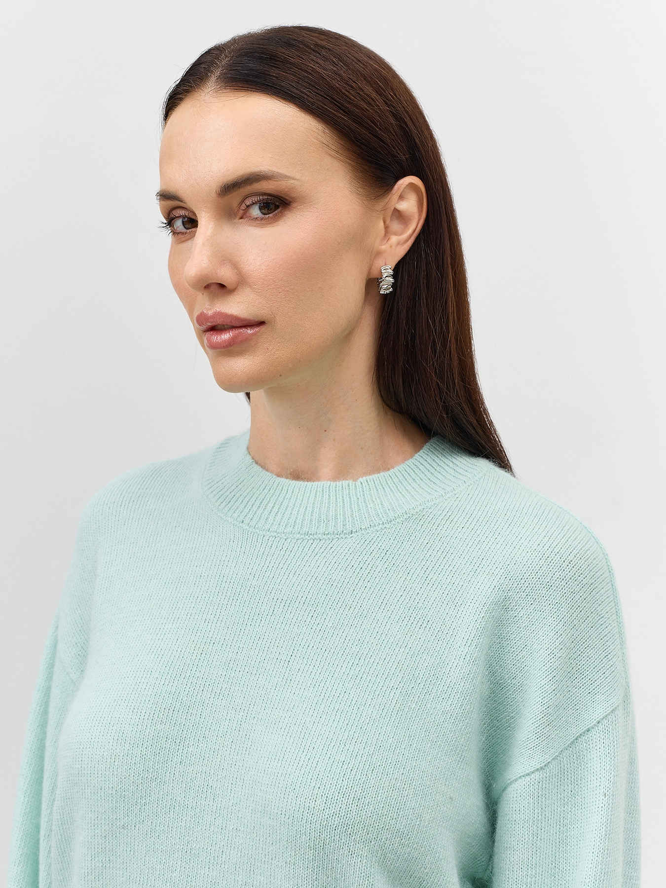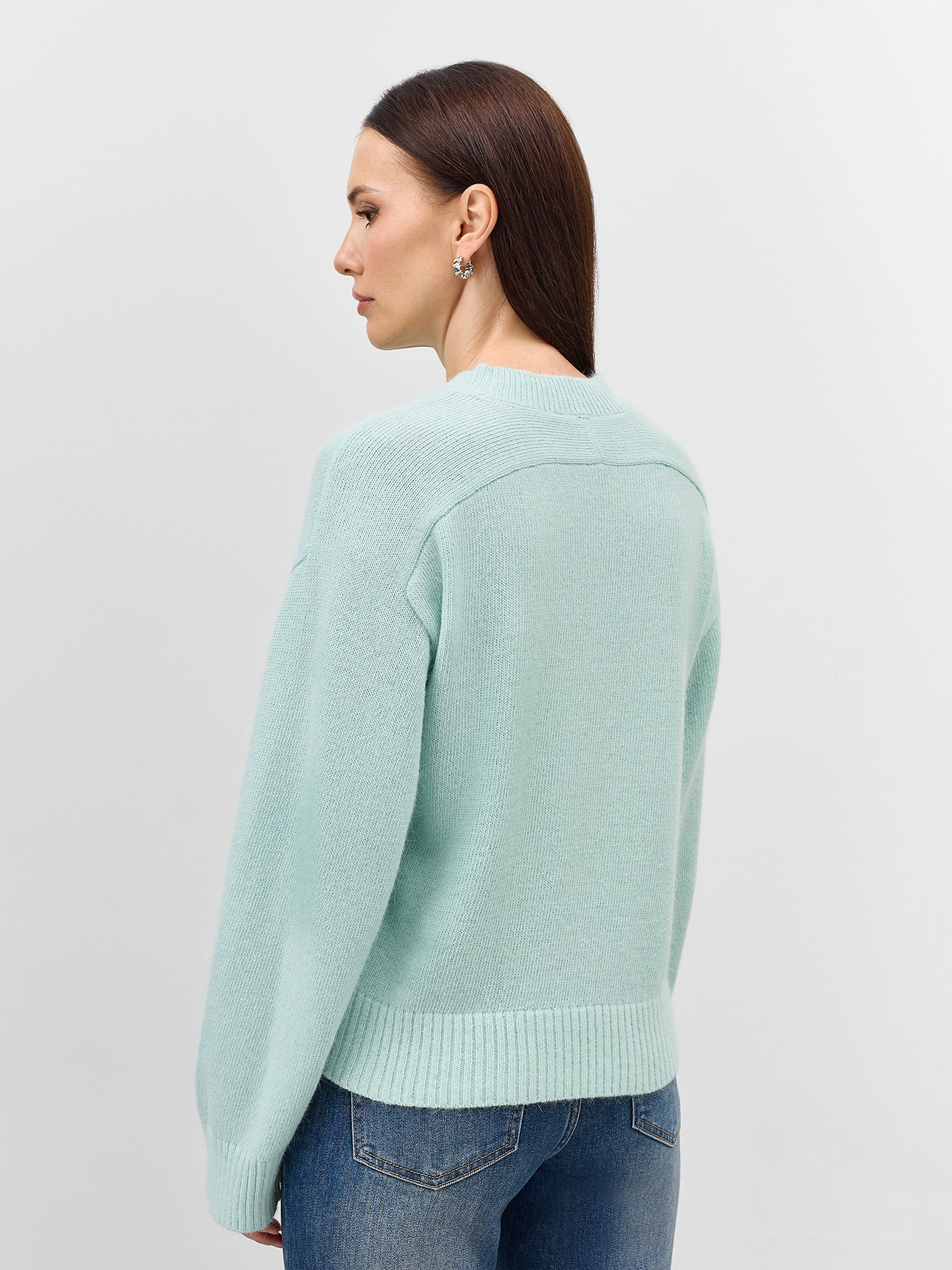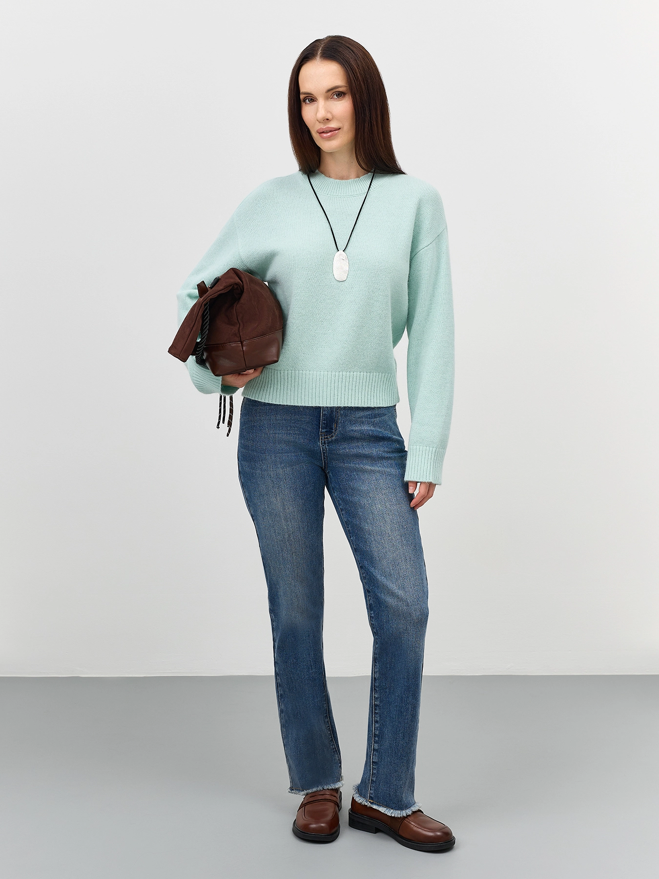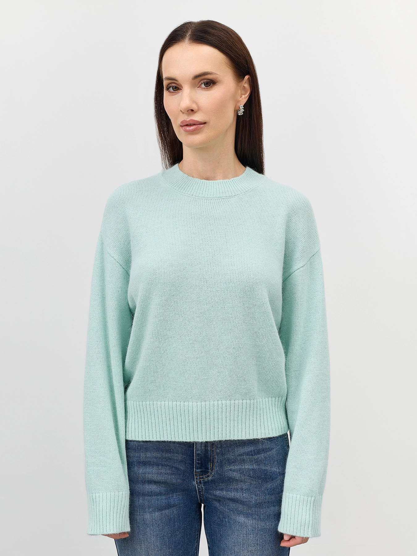 Пушистый джемпер с ангорой и шерстью в составе. Прямой силуэт. Спущенная линия плеч. Круглый вырез. Манжеты по горловине, низу рукавов и изделия. В составе вискоза.