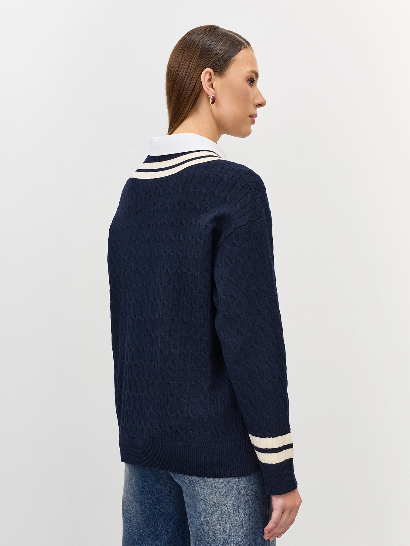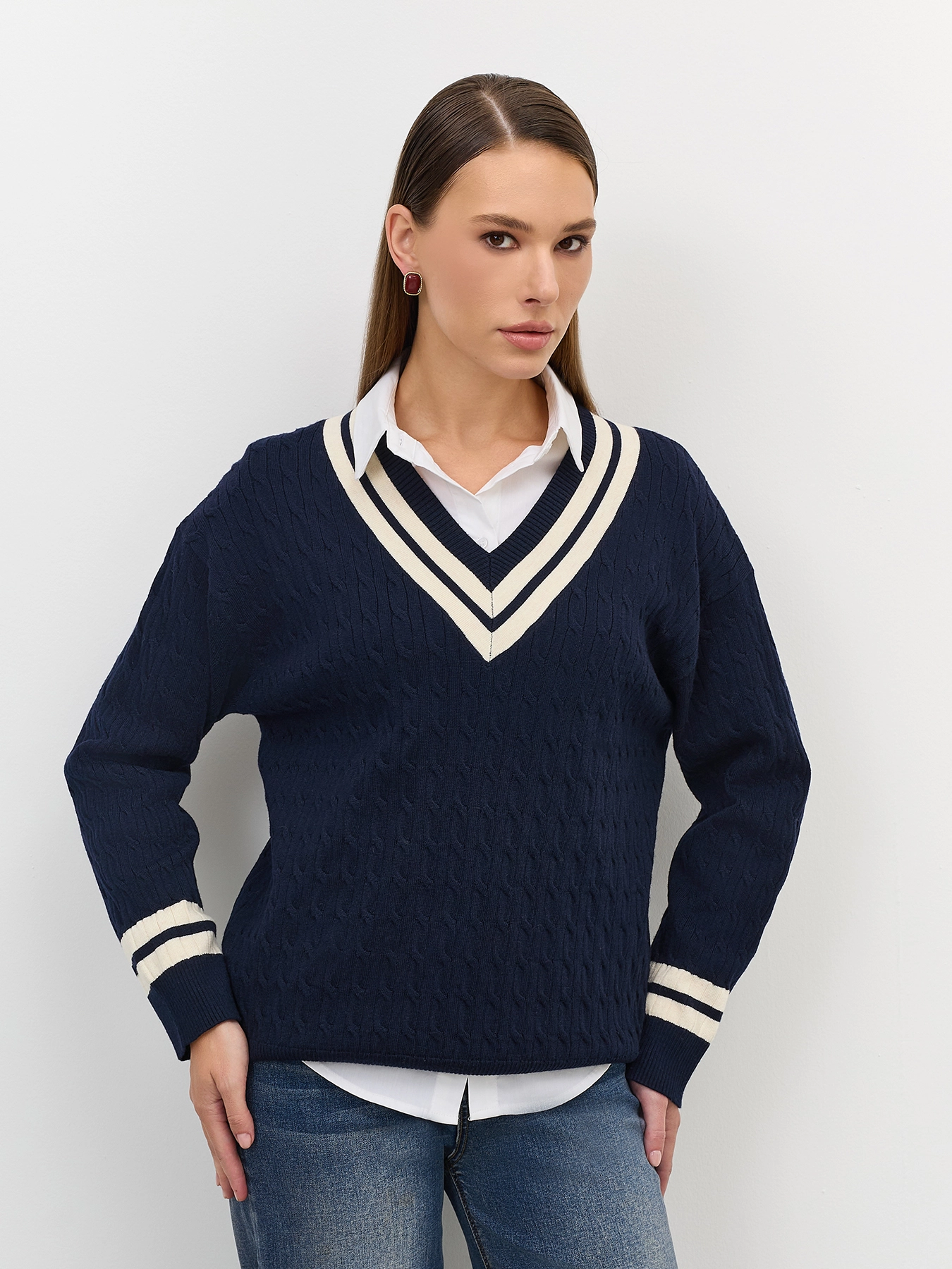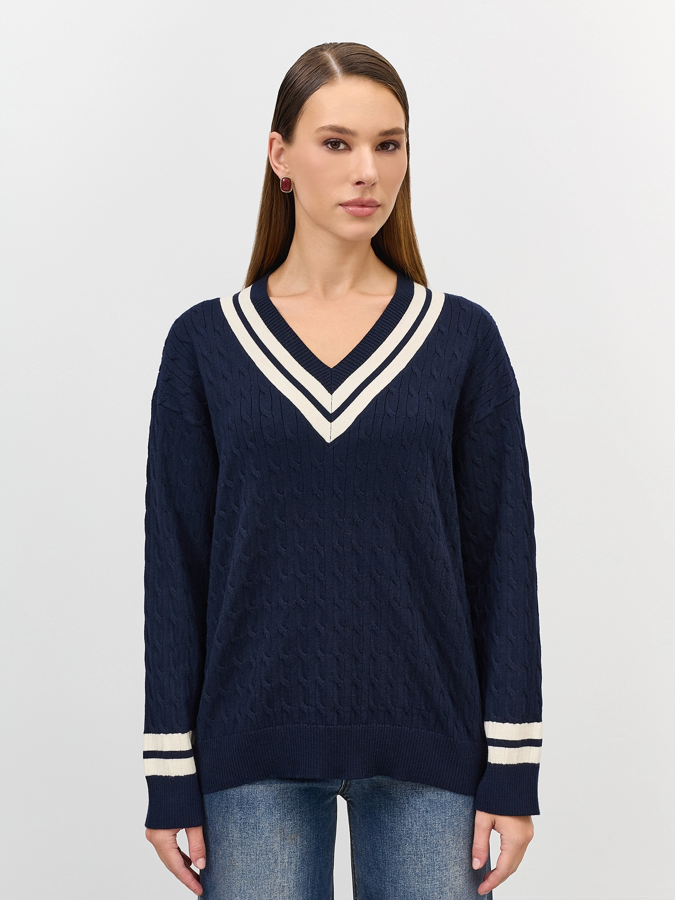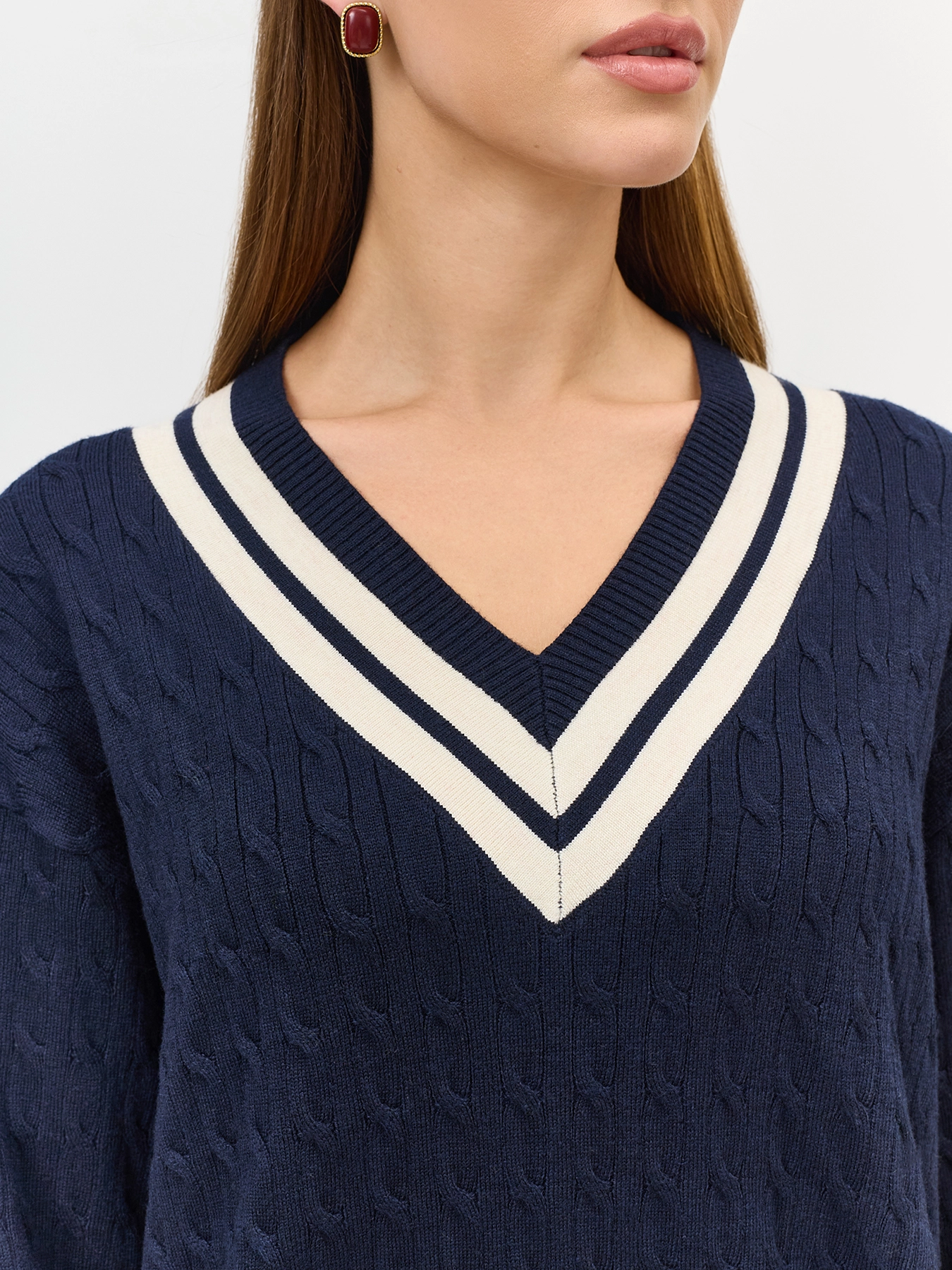 Свитер с косами и контрастной отделкой. Прямой силуэт. Спущенная линия плеча. V-образный вырез. Контрастные полосы по горловине и низу рукавов. В составе шерсть.