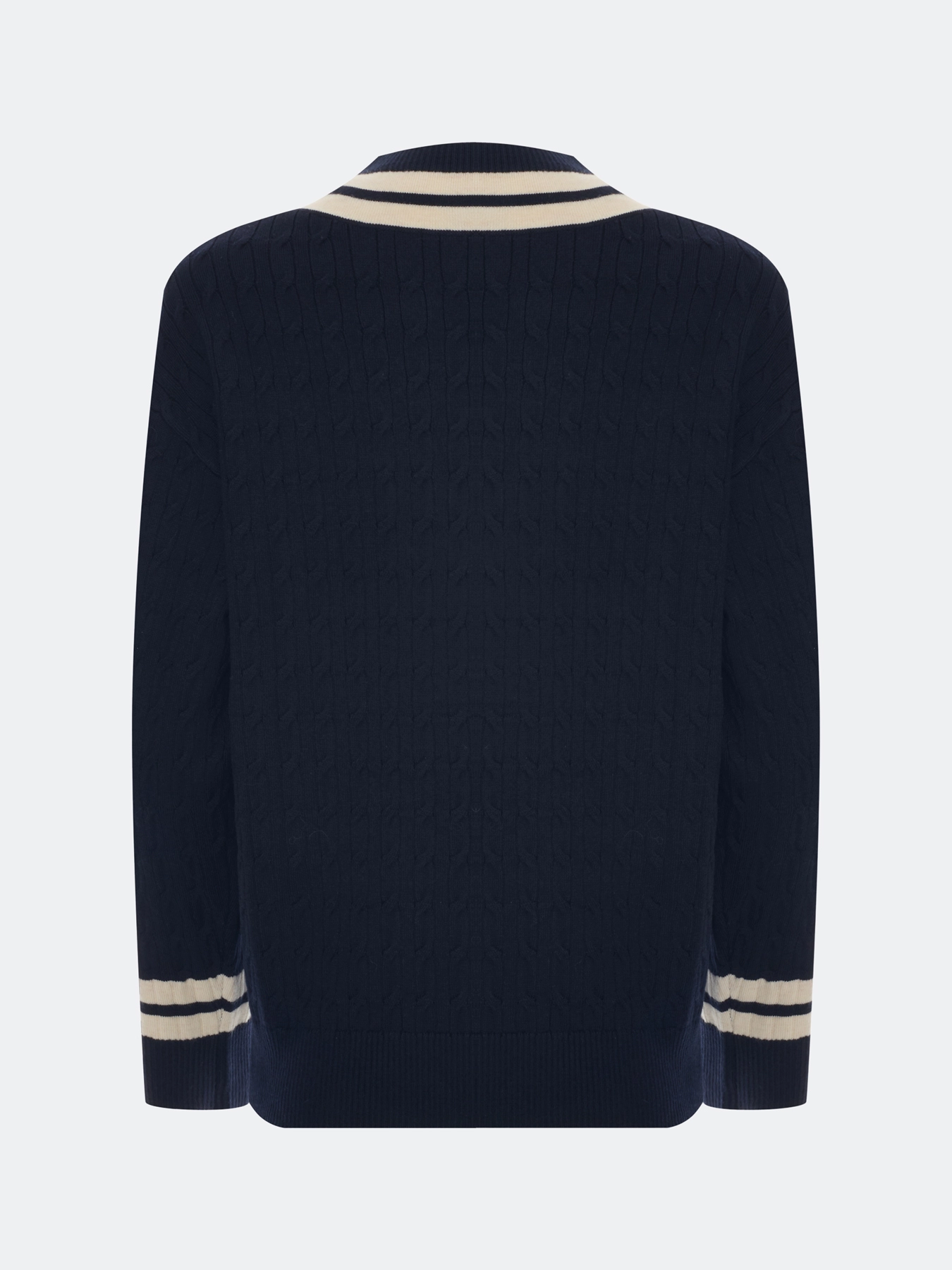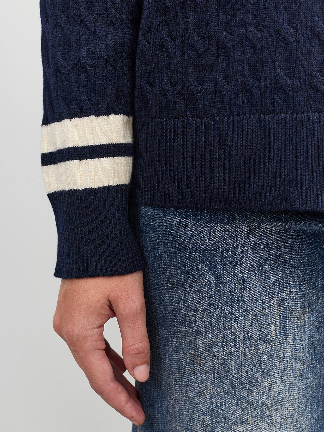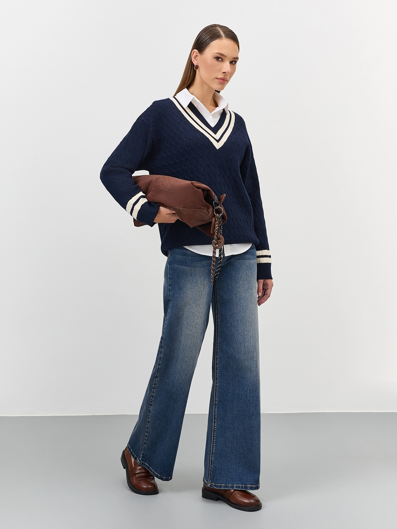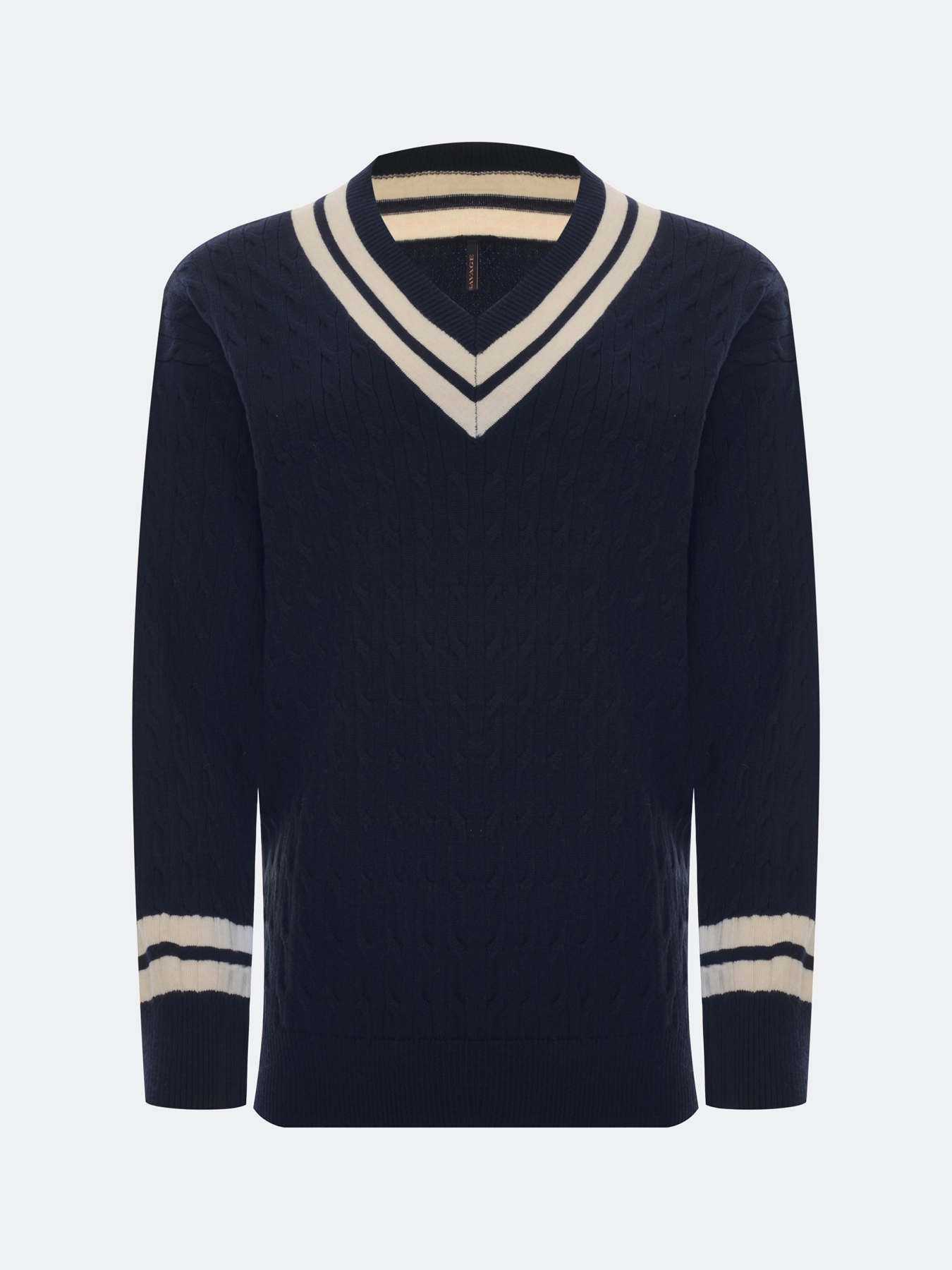 Свитер с косами и контрастной отделкой. Прямой силуэт. Спущенная линия плеча. V-образный вырез. Контрастные полосы по горловине и низу рукавов. В составе шерсть.