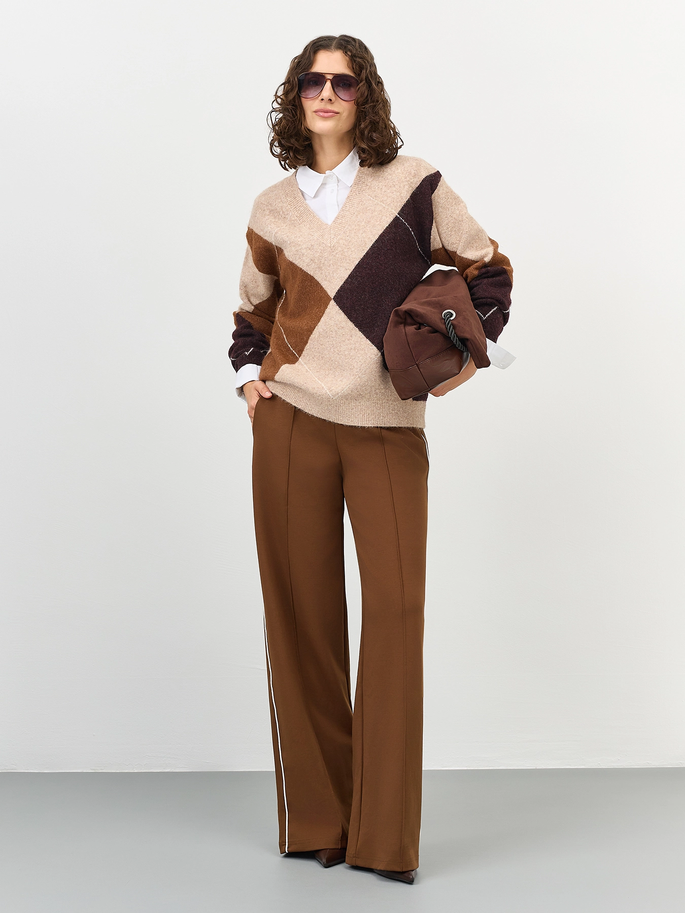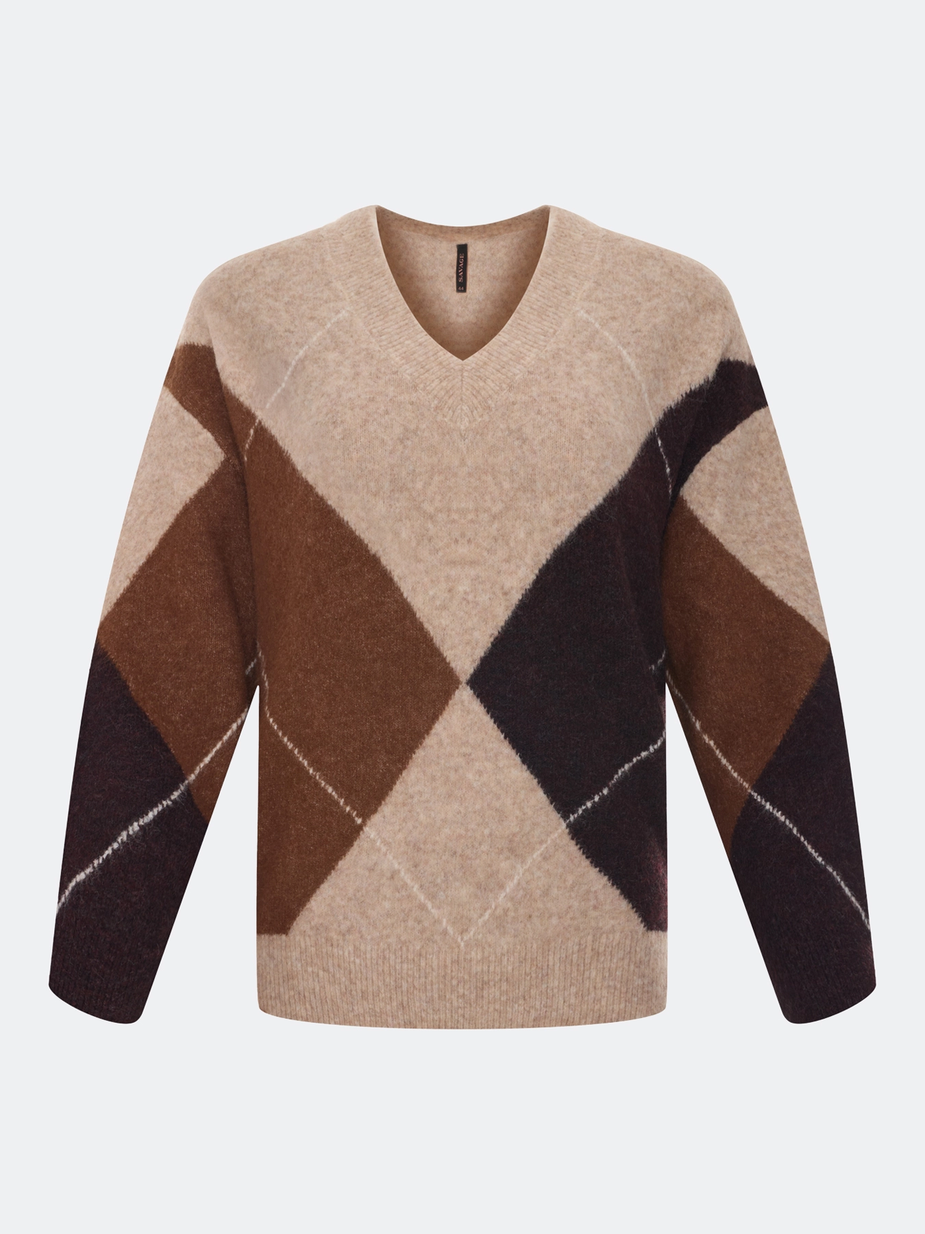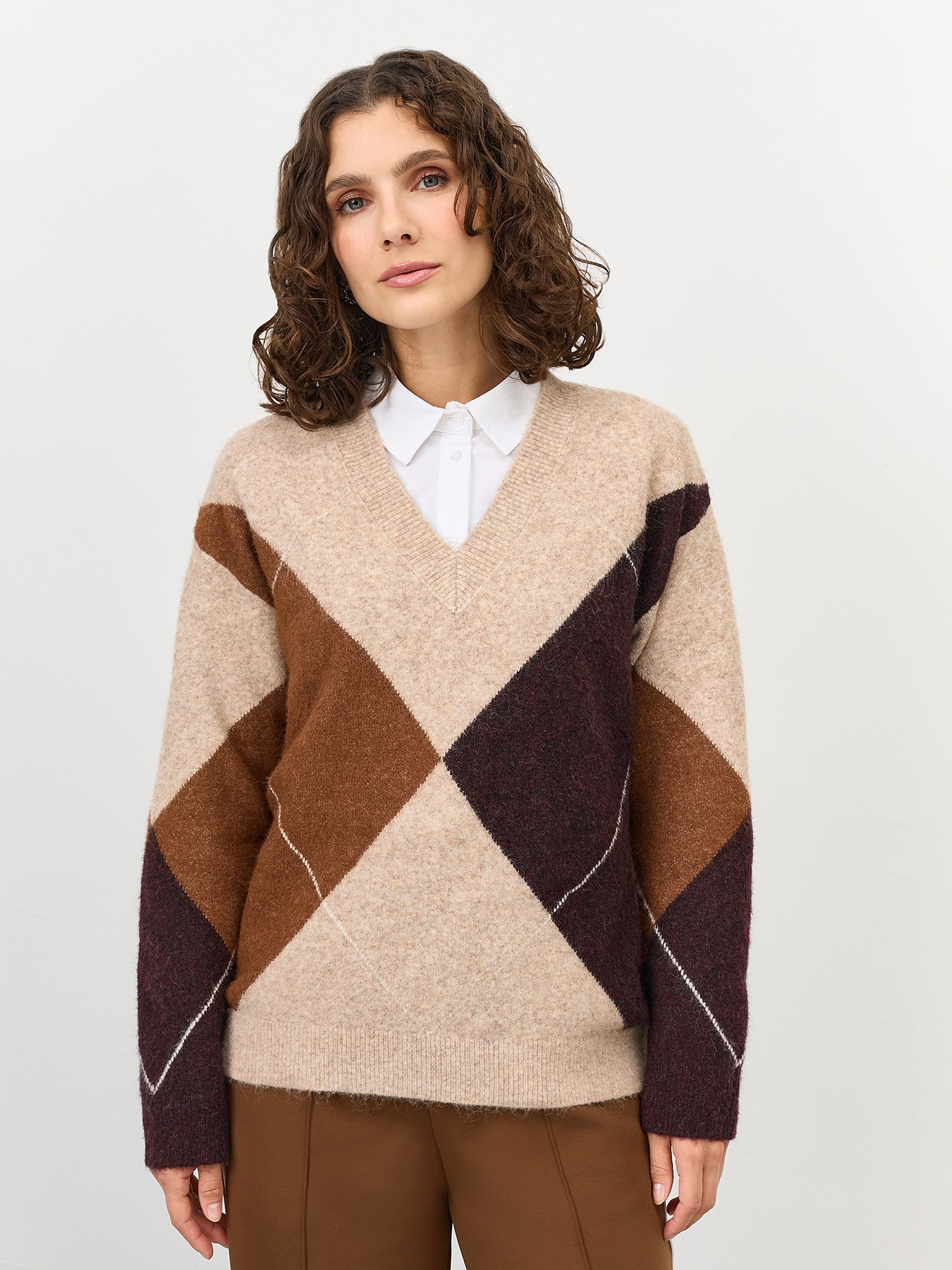 Мягкий свитер с узором "аргайл" из пряжи с добавлением шерсти. Прямой силуэт. V-образный вырез. Спущенная линия плеч. В составе шерсть.