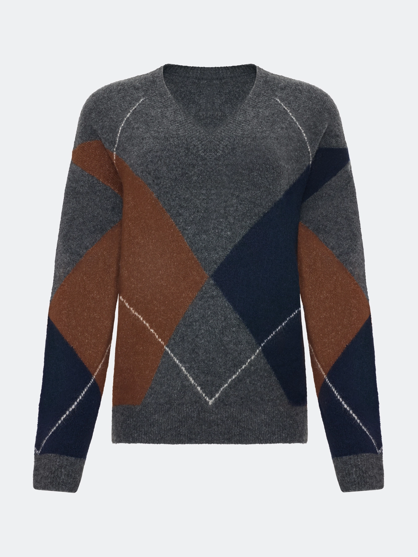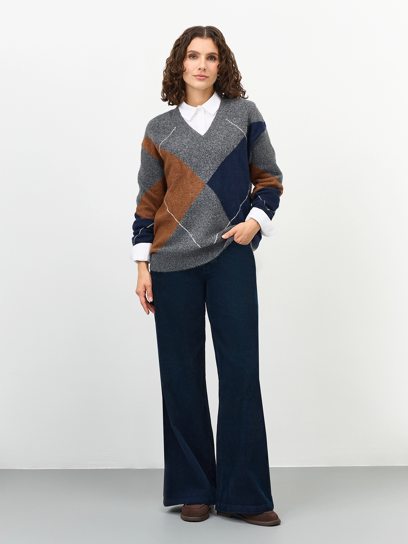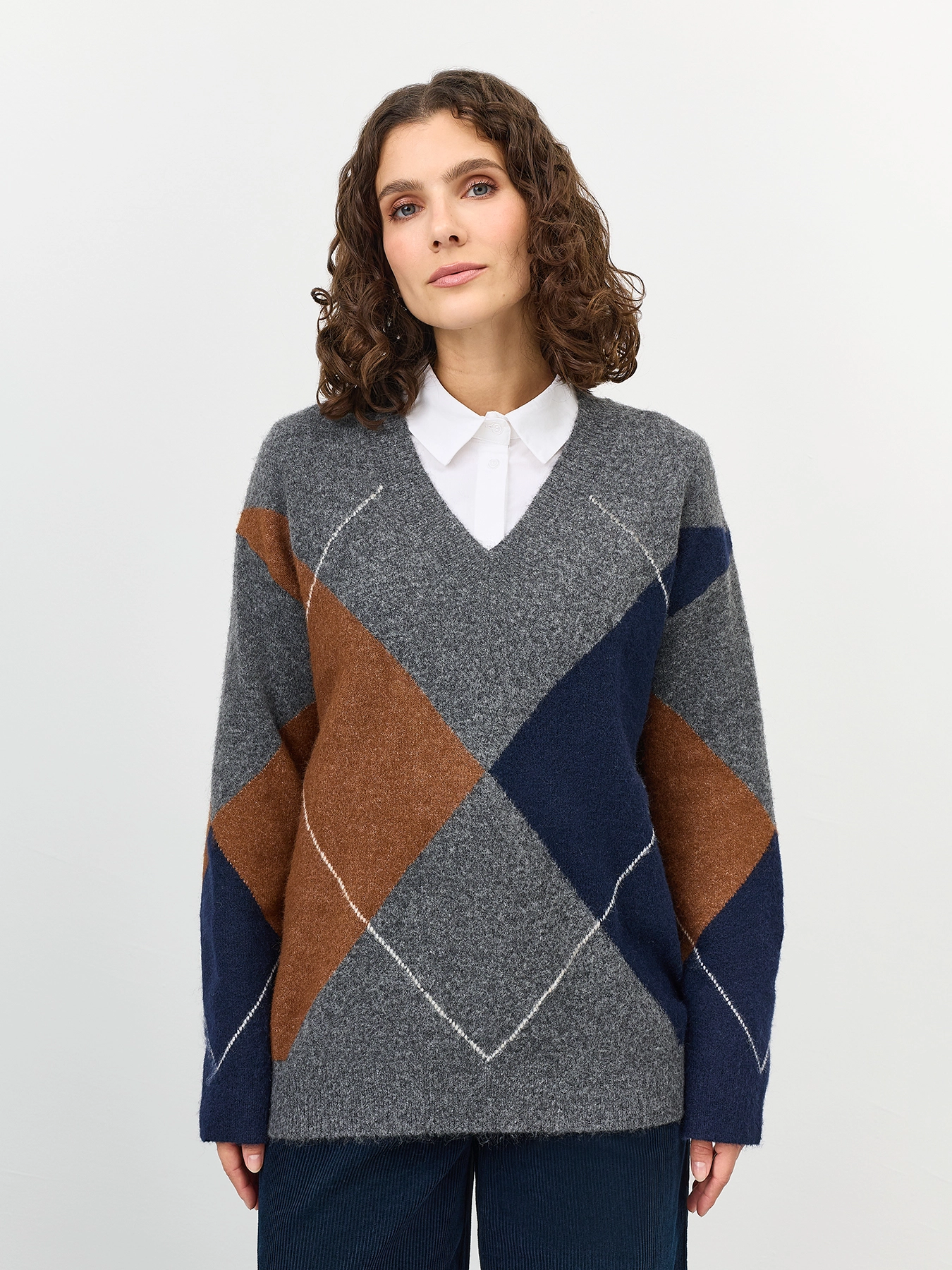Мягкий свитер с узором "аргайл" из пряжи с добавлением шерсти. Прямой силуэт. V-образный вырез. Спущенная линия плеч. В составе шерсть.