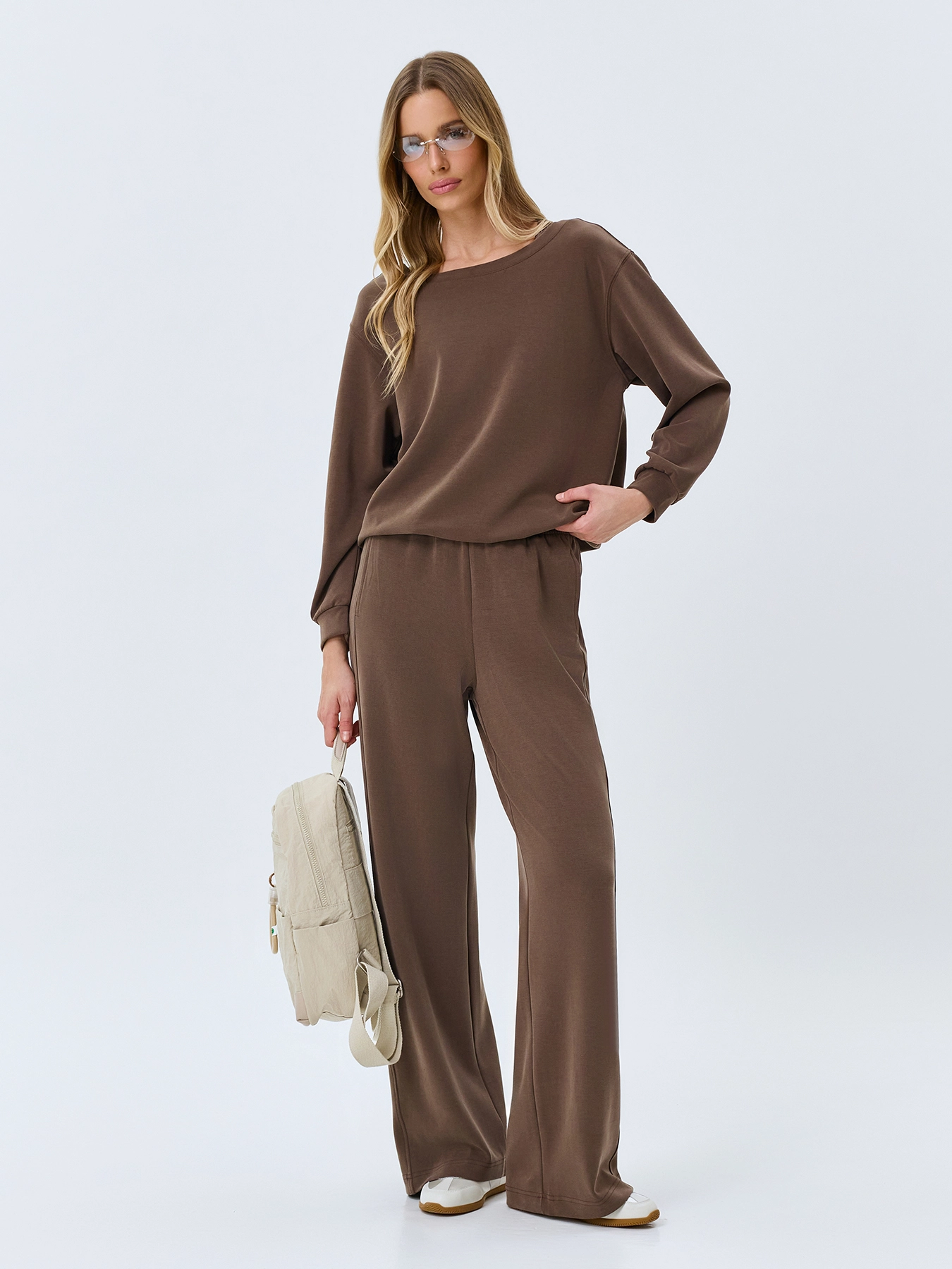 Свитшот свободного силуэта из модала. Вырез лодочка. Спущенная линия плеч. Длинные втачные рукава с манжетами по низу. Внутренний топ из смесовой вискозы с круглым вырезом и широкими бретелями. Комплект с 63920.