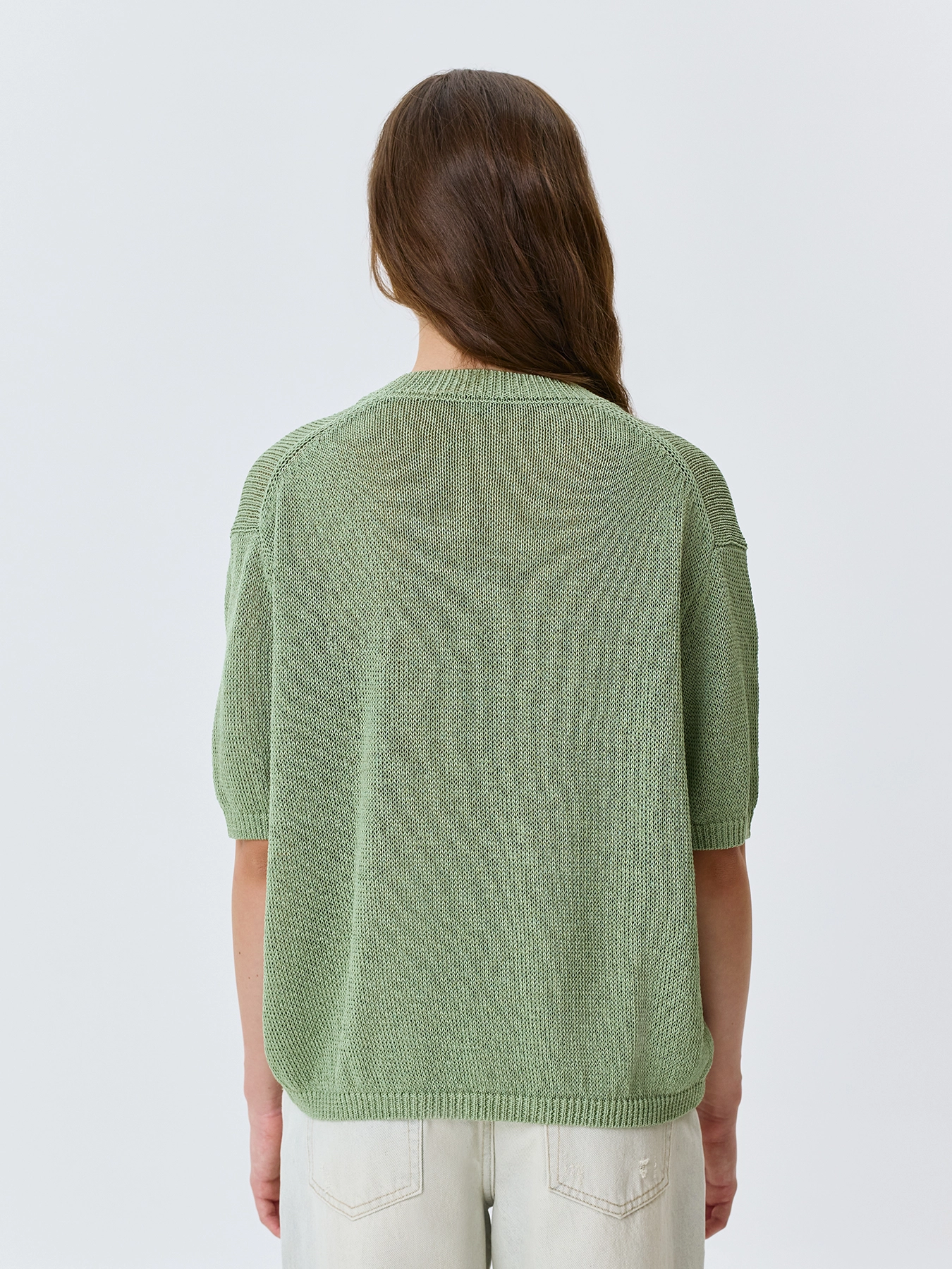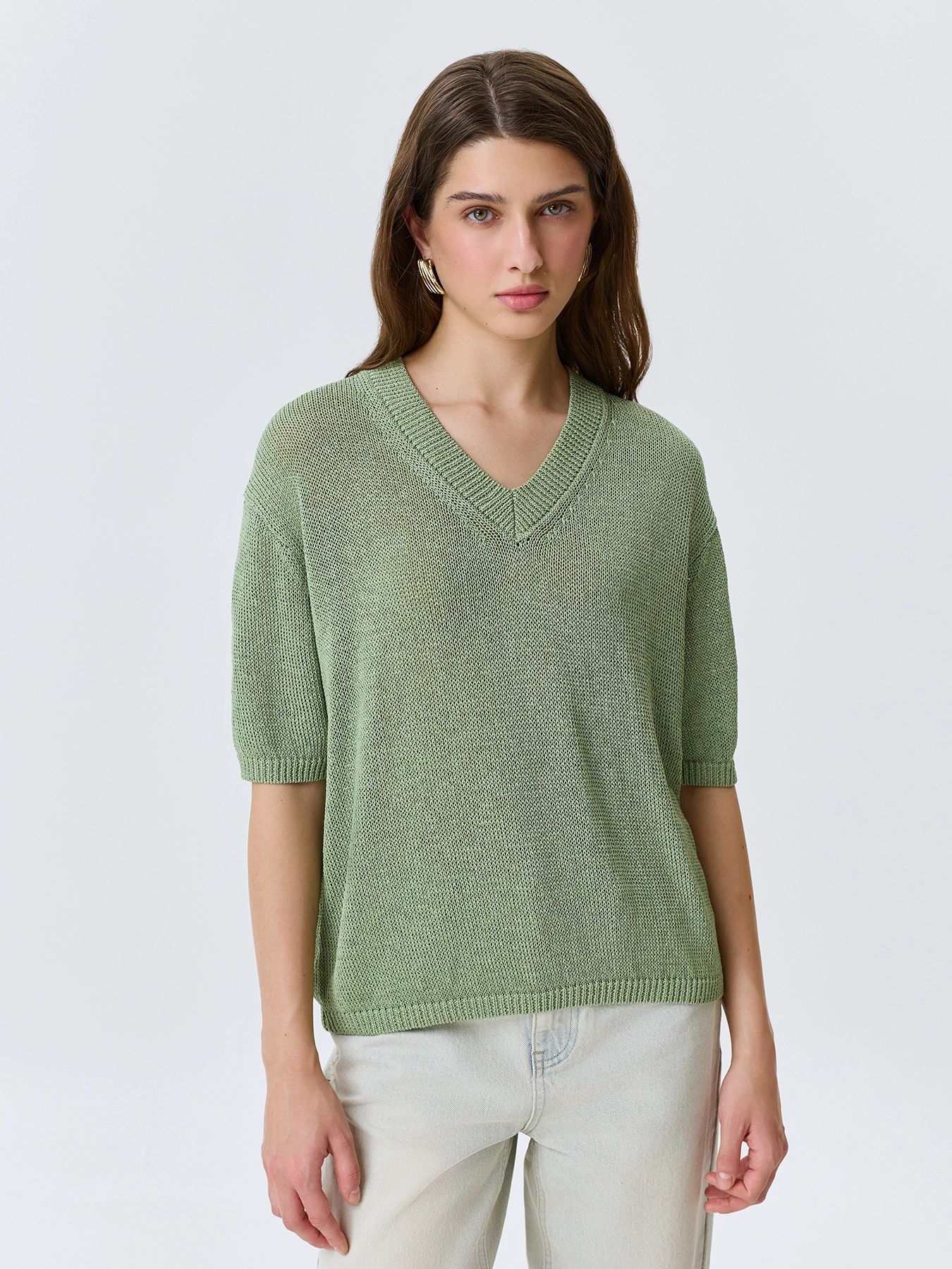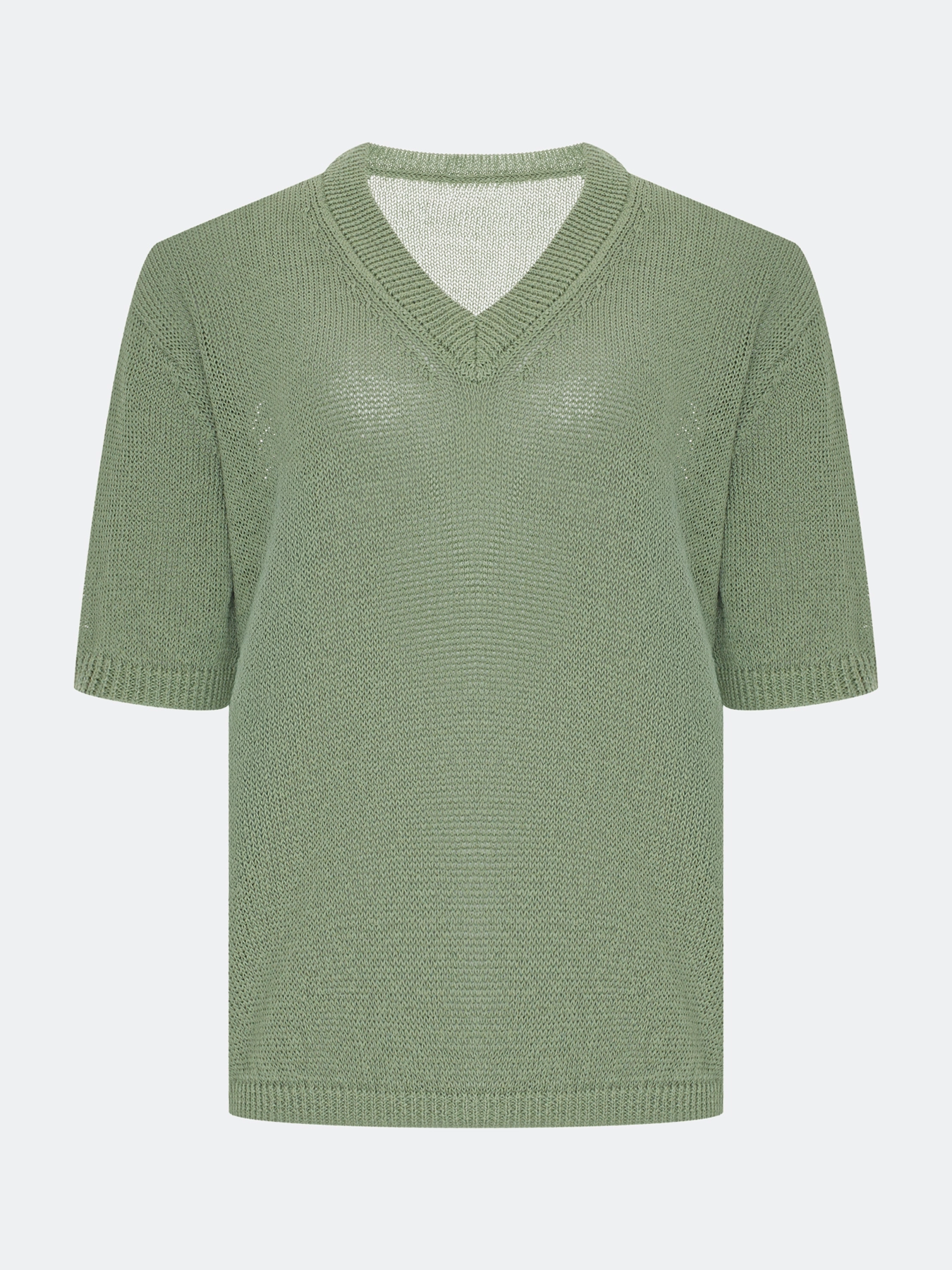 Свободный джемпер из фактурной вискозной пряжи. V-образный вырез. Спущенная линия плеч. Короткие рукава с манжетами по низу. Дополнен рибом по горловине, низу изделия и рукавов.