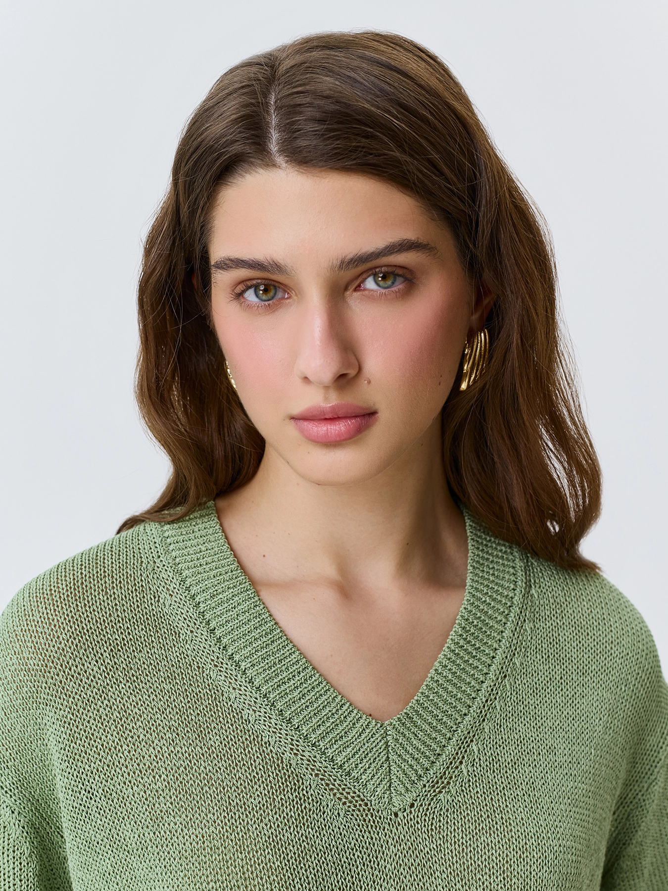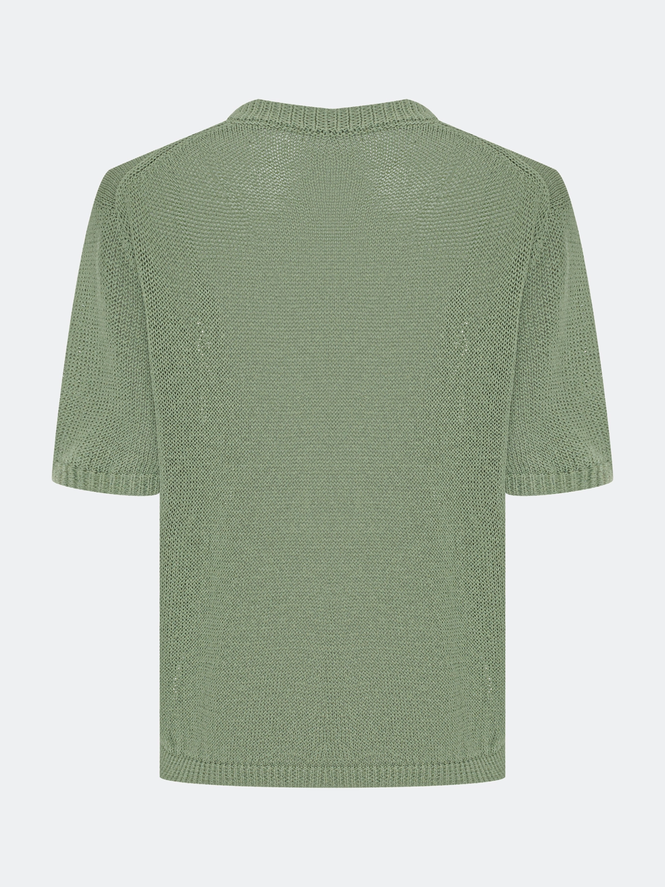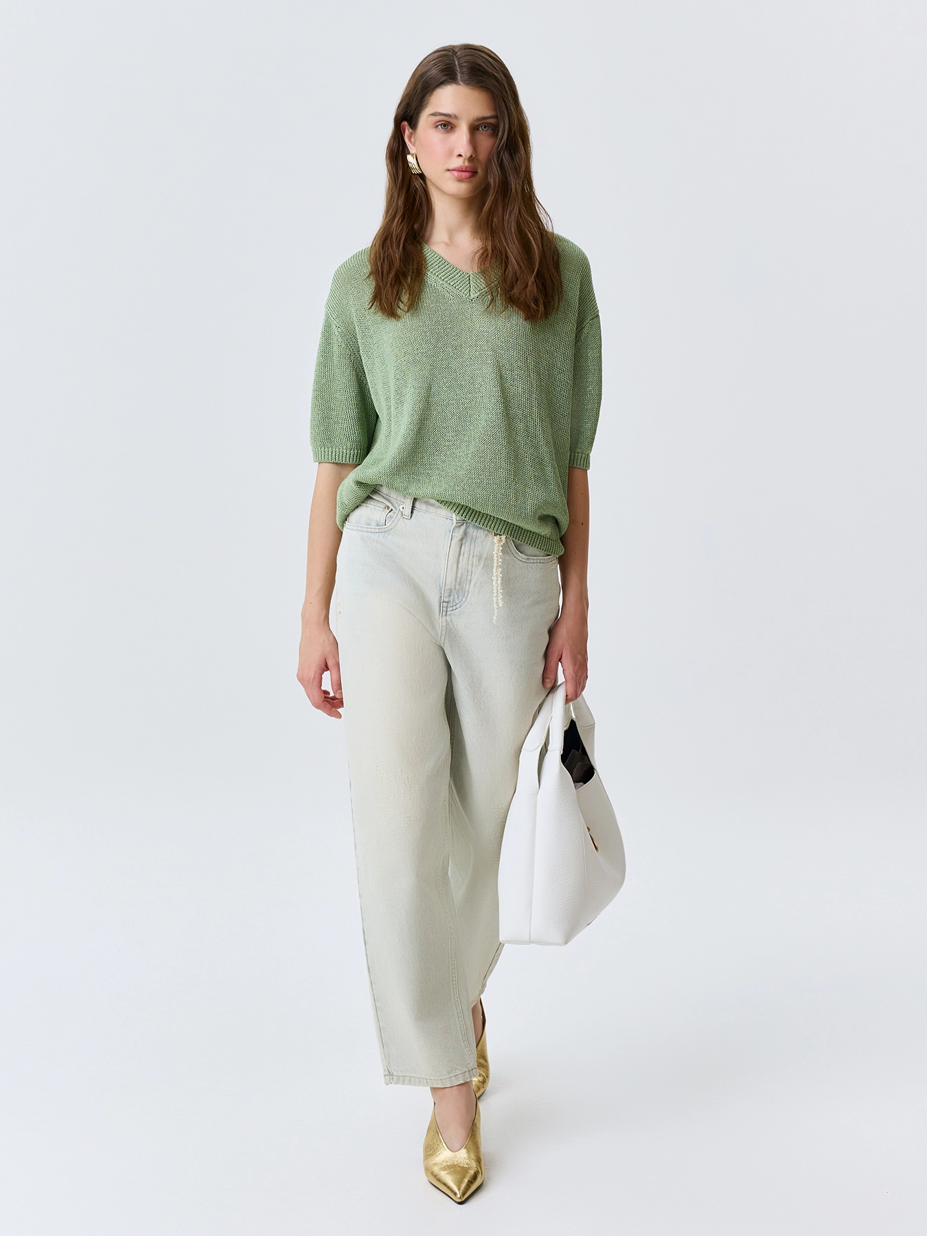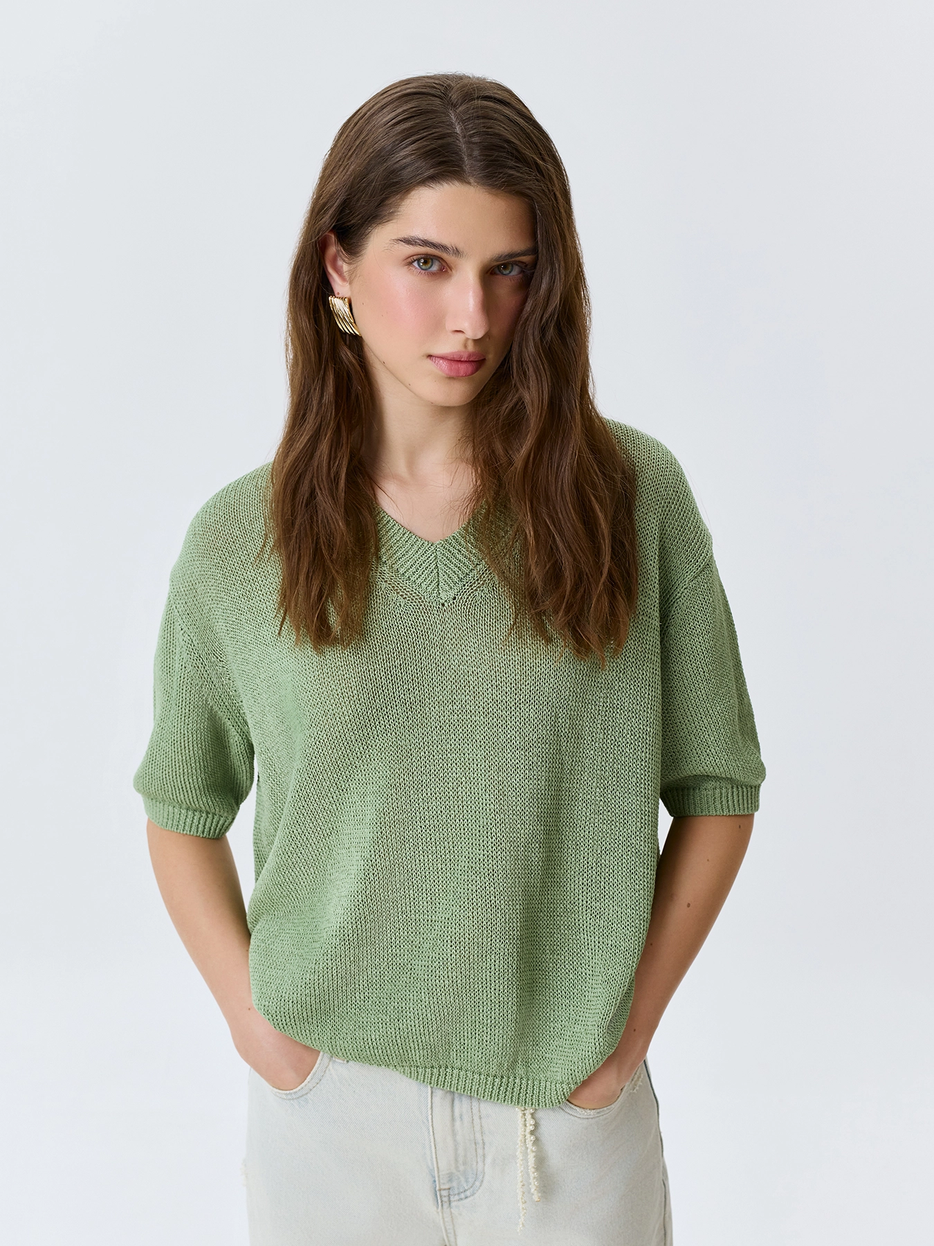 Свободный джемпер из фактурной вискозной пряжи. V-образный вырез. Спущенная линия плеч. Короткие рукава с манжетами по низу. Дополнен рибом по горловине, низу изделия и рукавов.