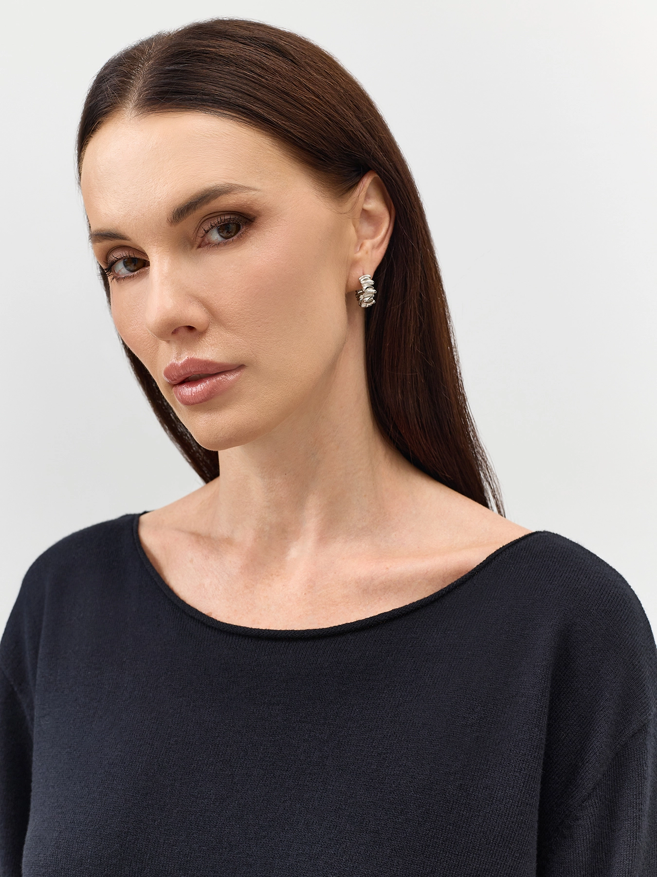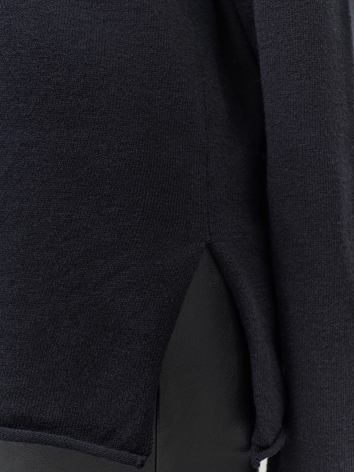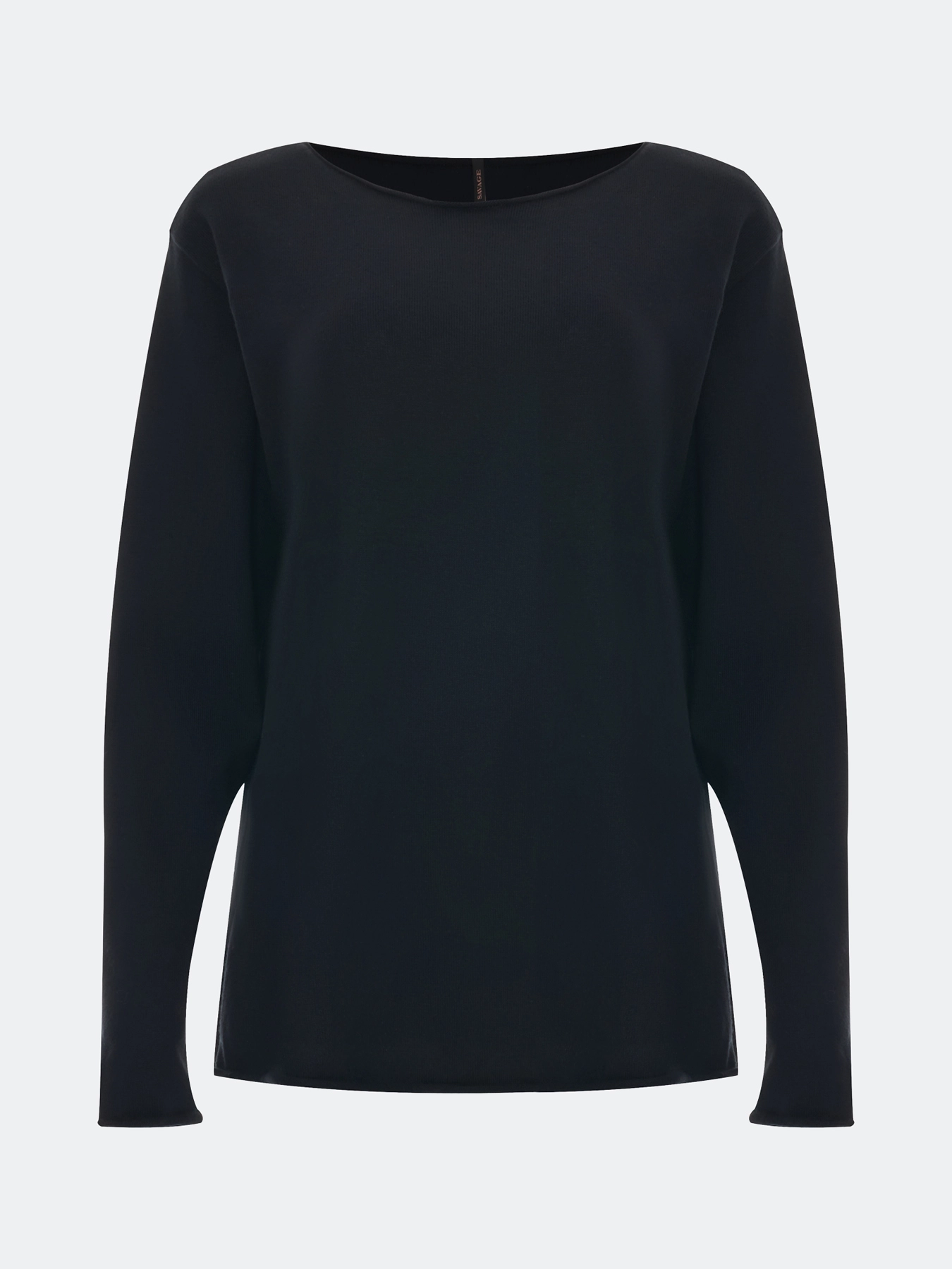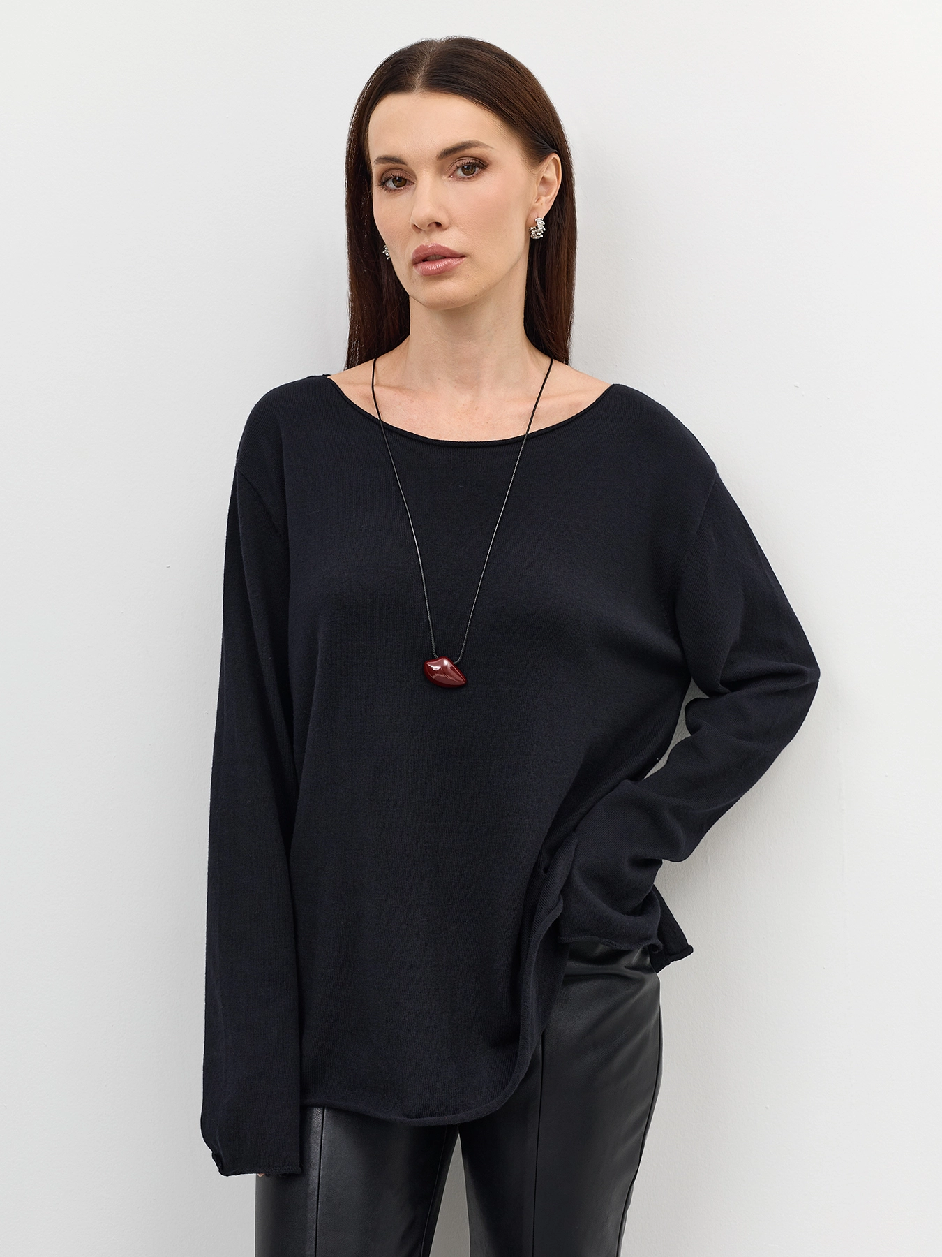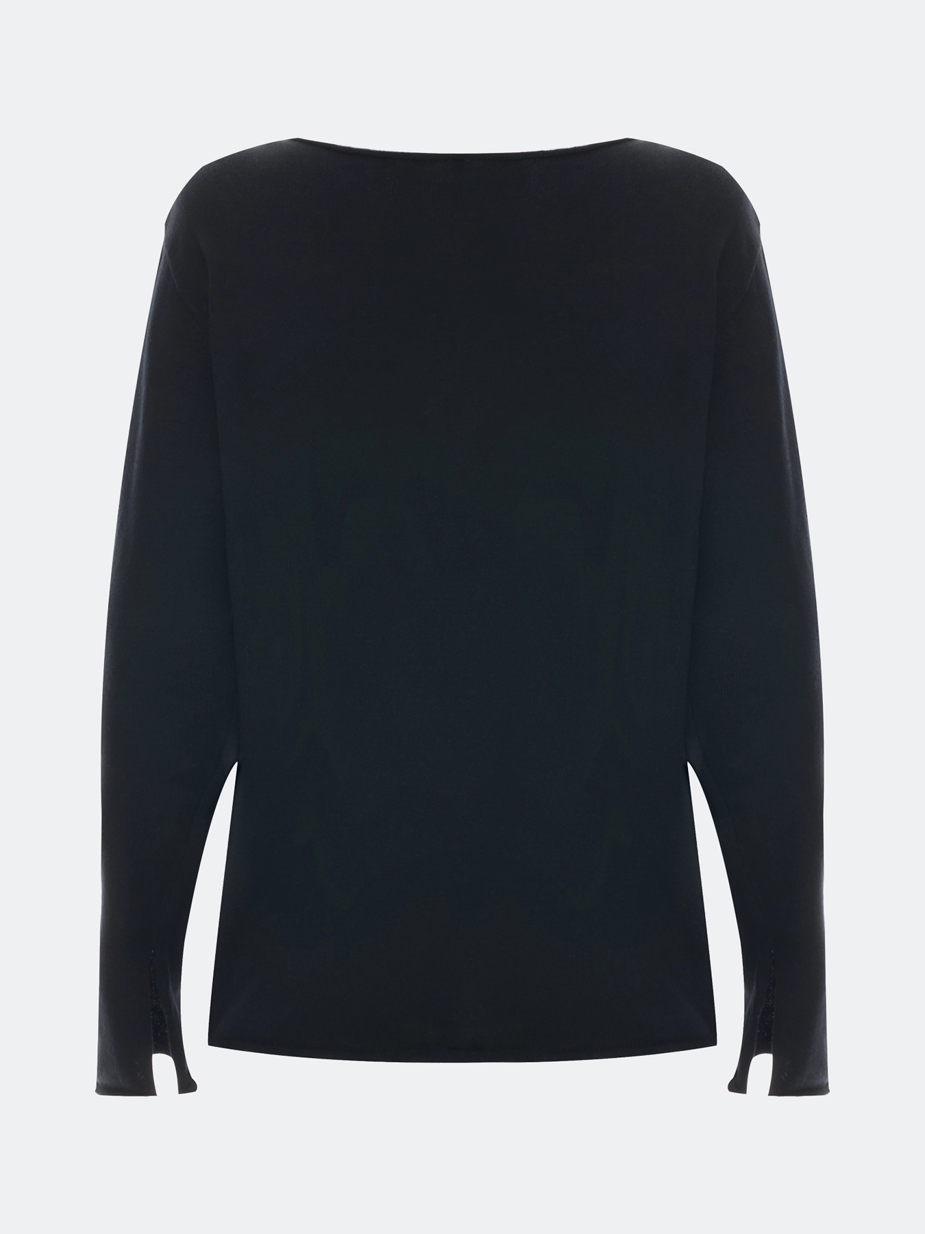 Свободный джемпер с разрезами на рукавах. Свободный силуэт. Вырез лодочка. Спущенная линия плеч. Боковые разрезы в швах. Акцентные необработанные края.