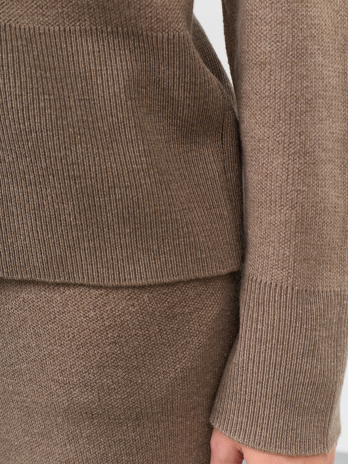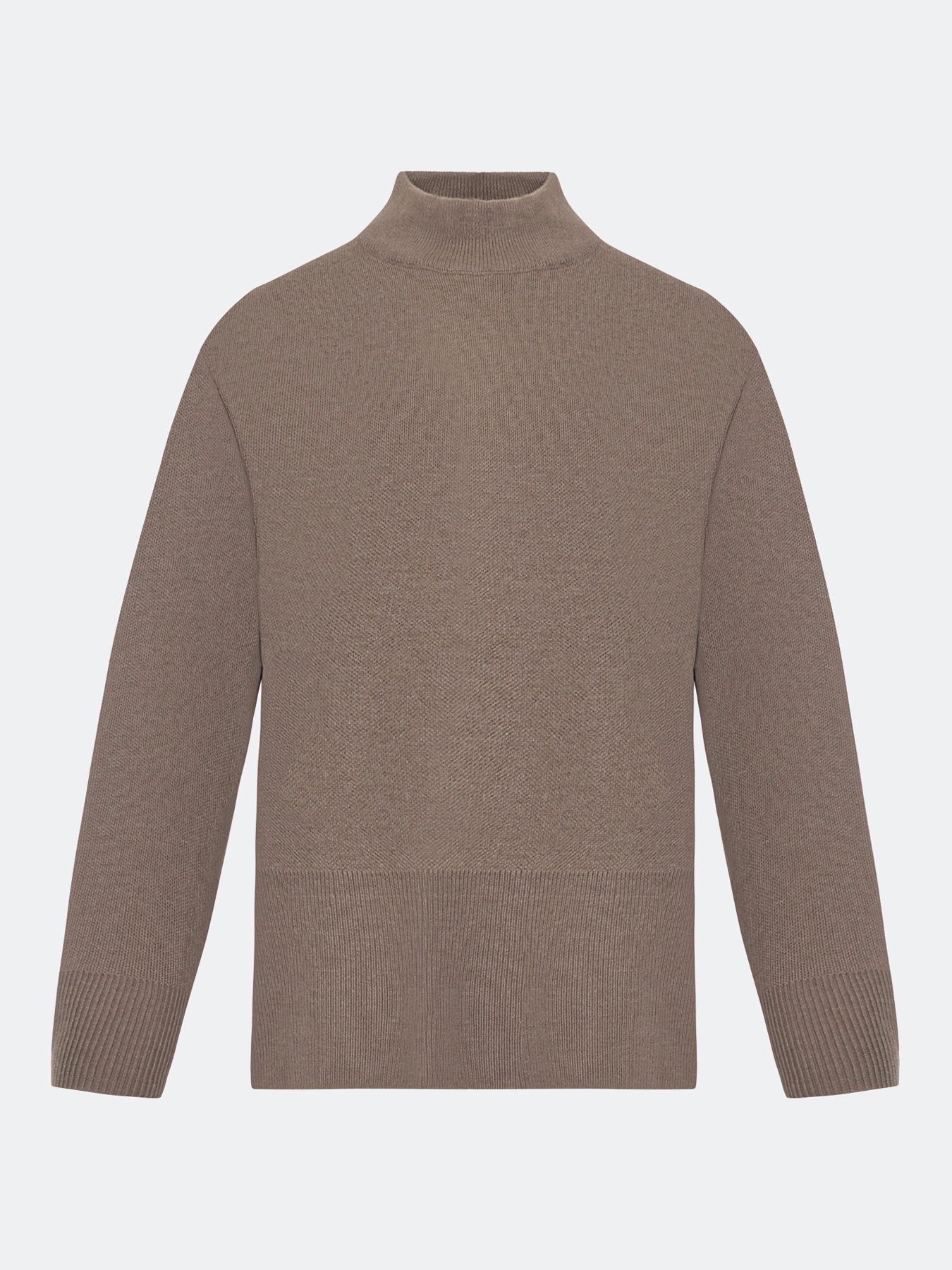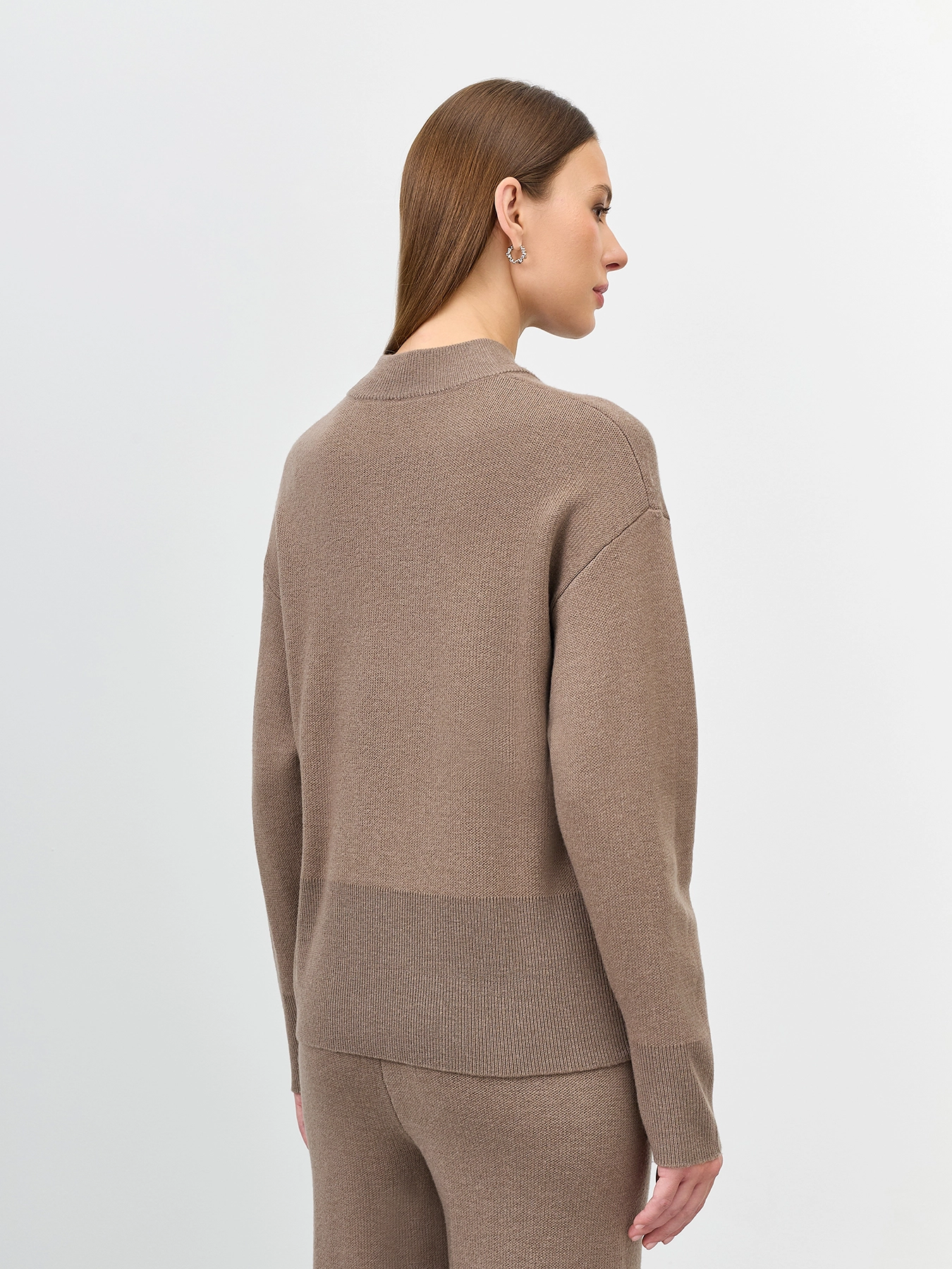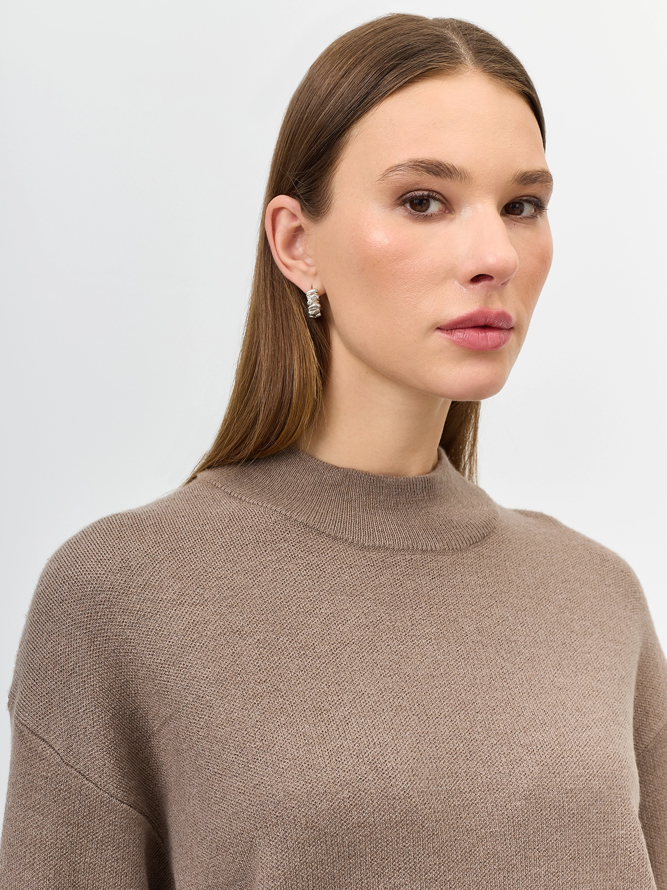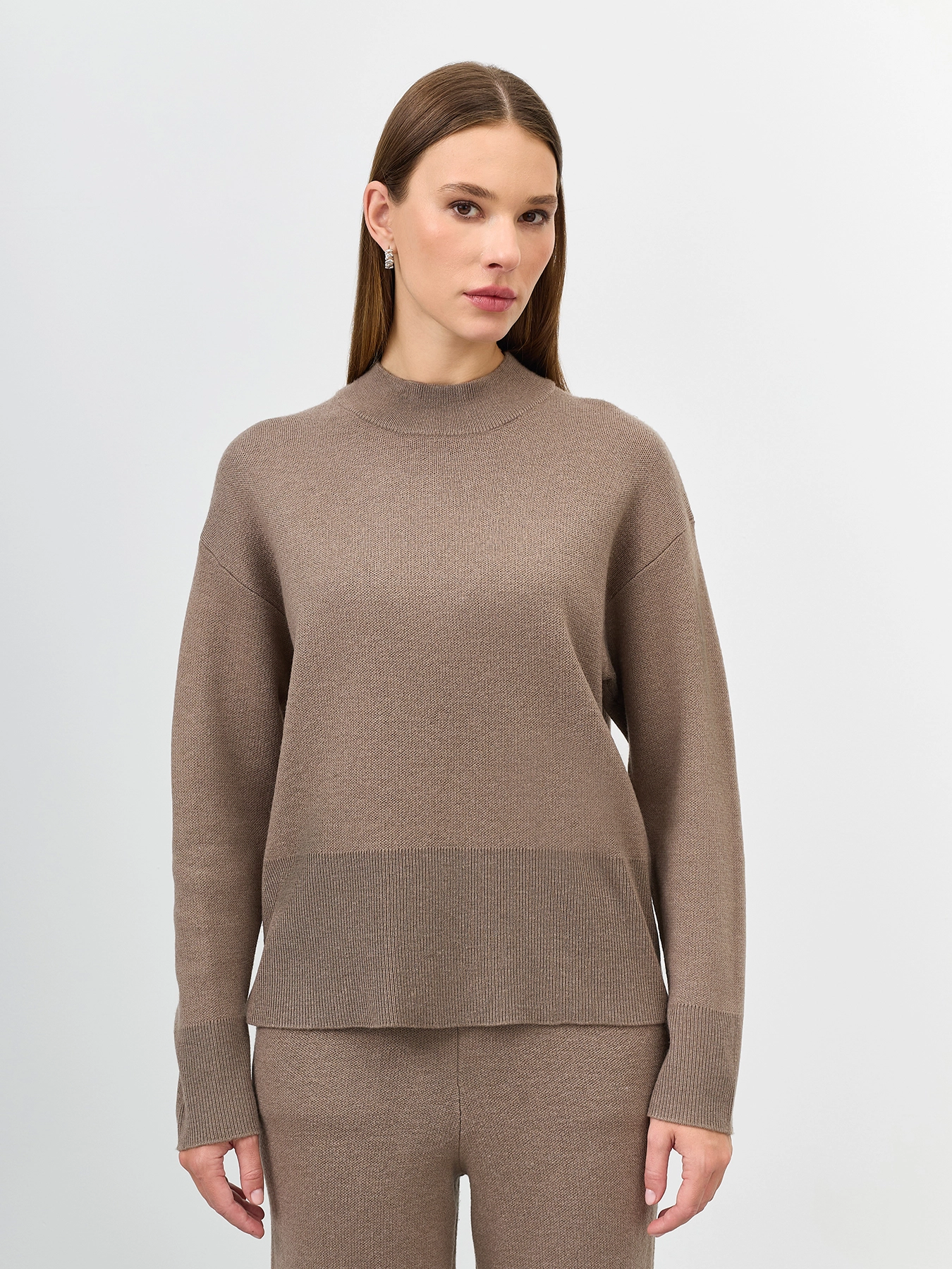 Свободный свитер с шерстью в составе. Свободный силуэт. Спущенная линия плеч. Воротник стойка. Широкие манжеты по низу рукавов и изделия. Комплект с арт. 60907.