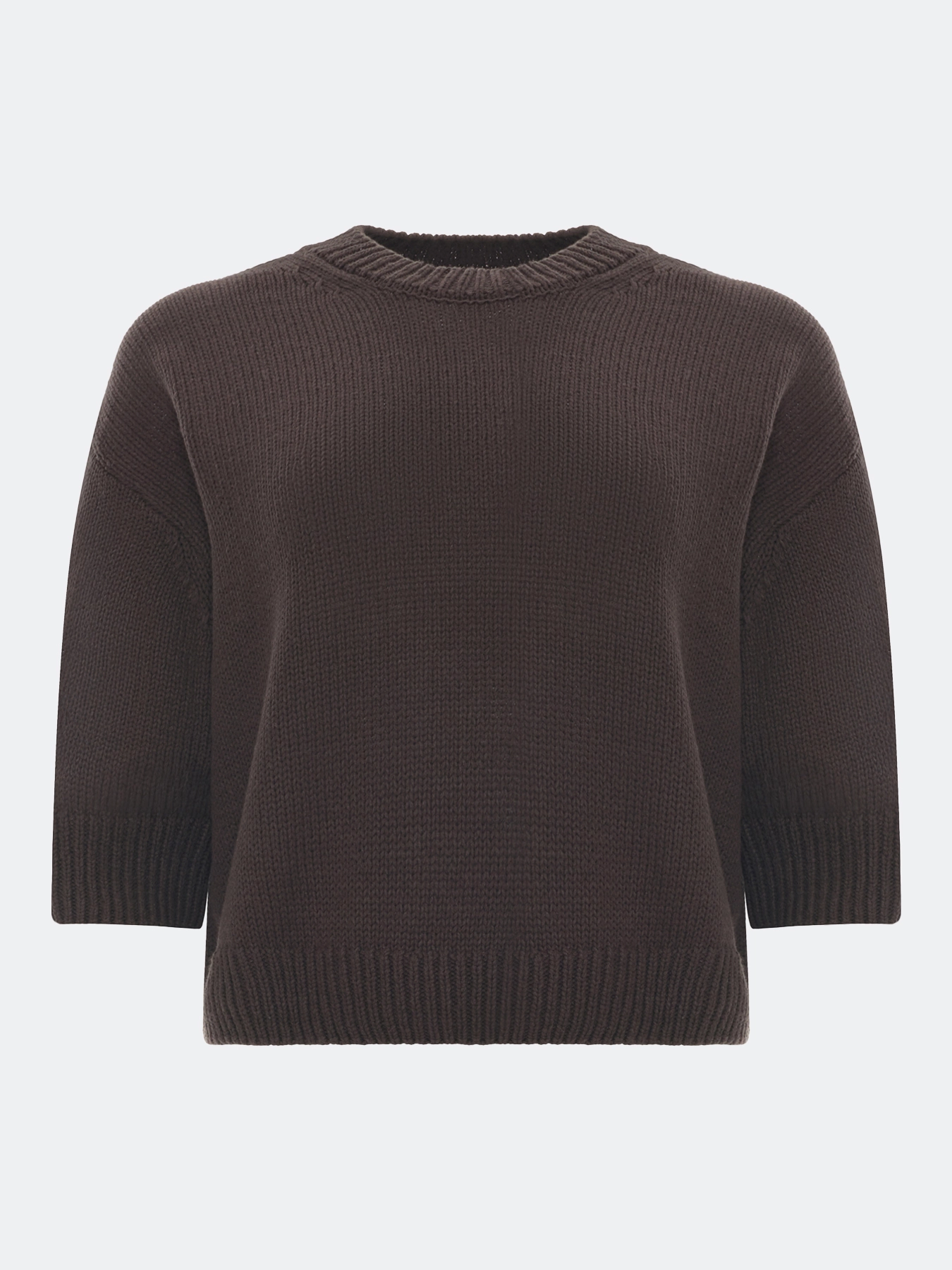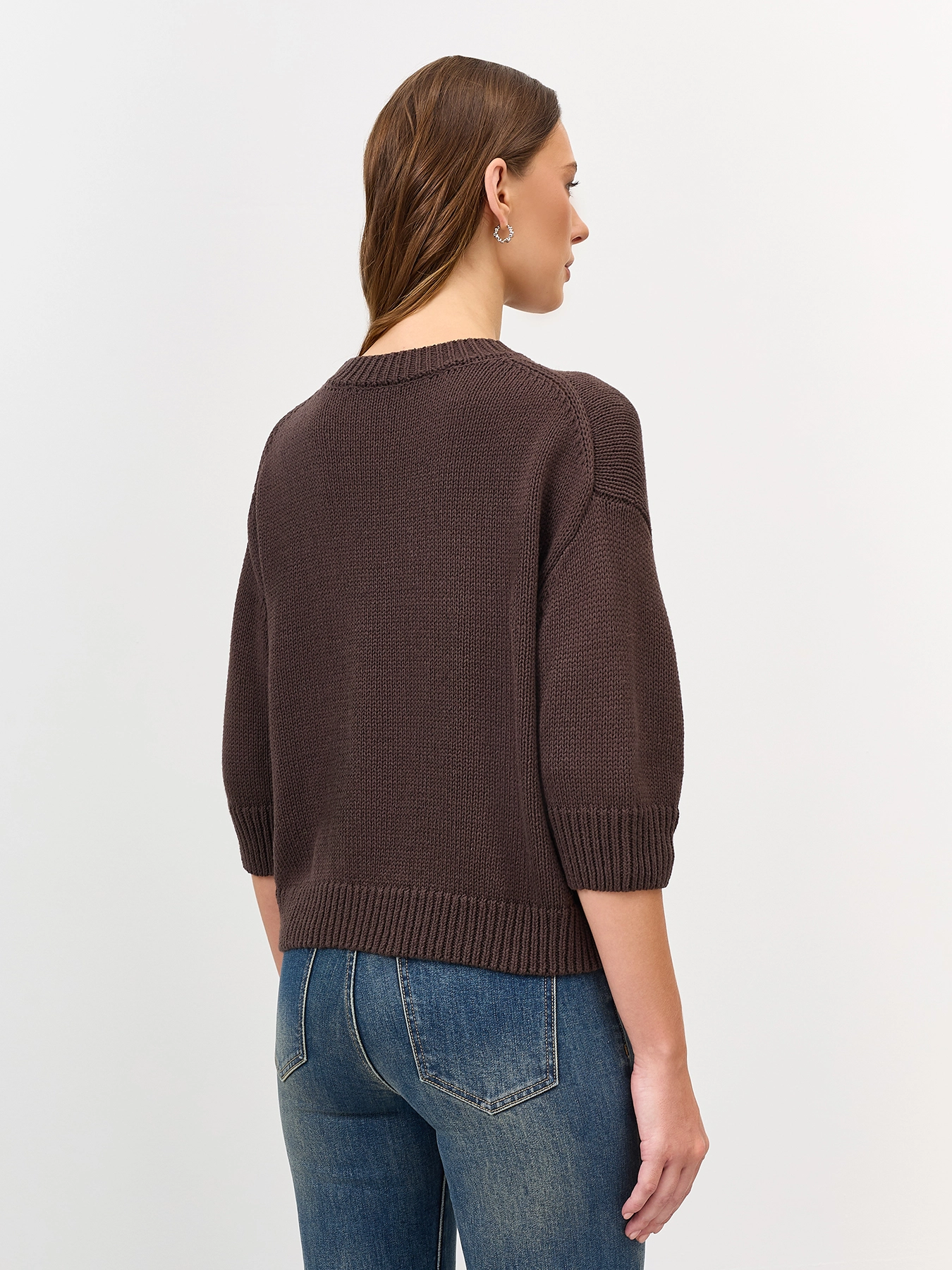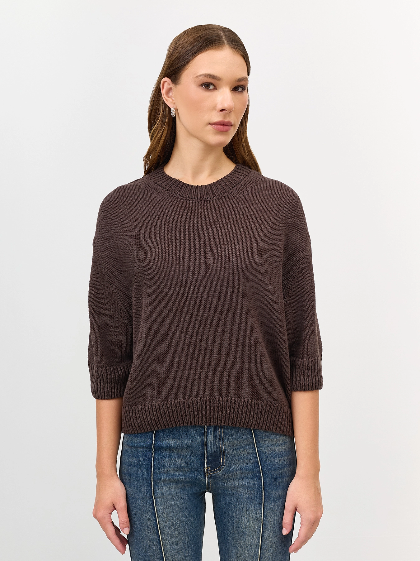 Укороченный свитер свободного силуэта. Рукава 3/4. Круглый вырез. Спущенная линия плеч. В составе хлопок.