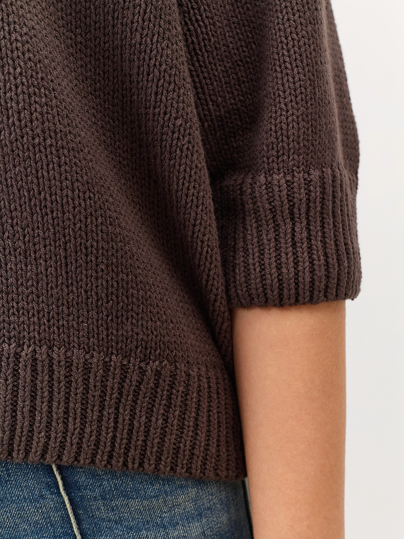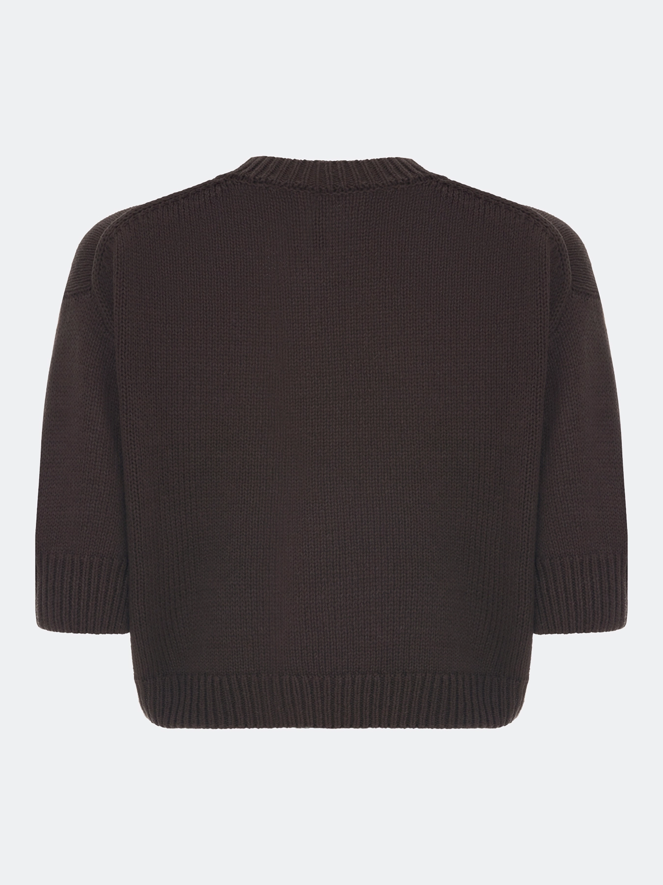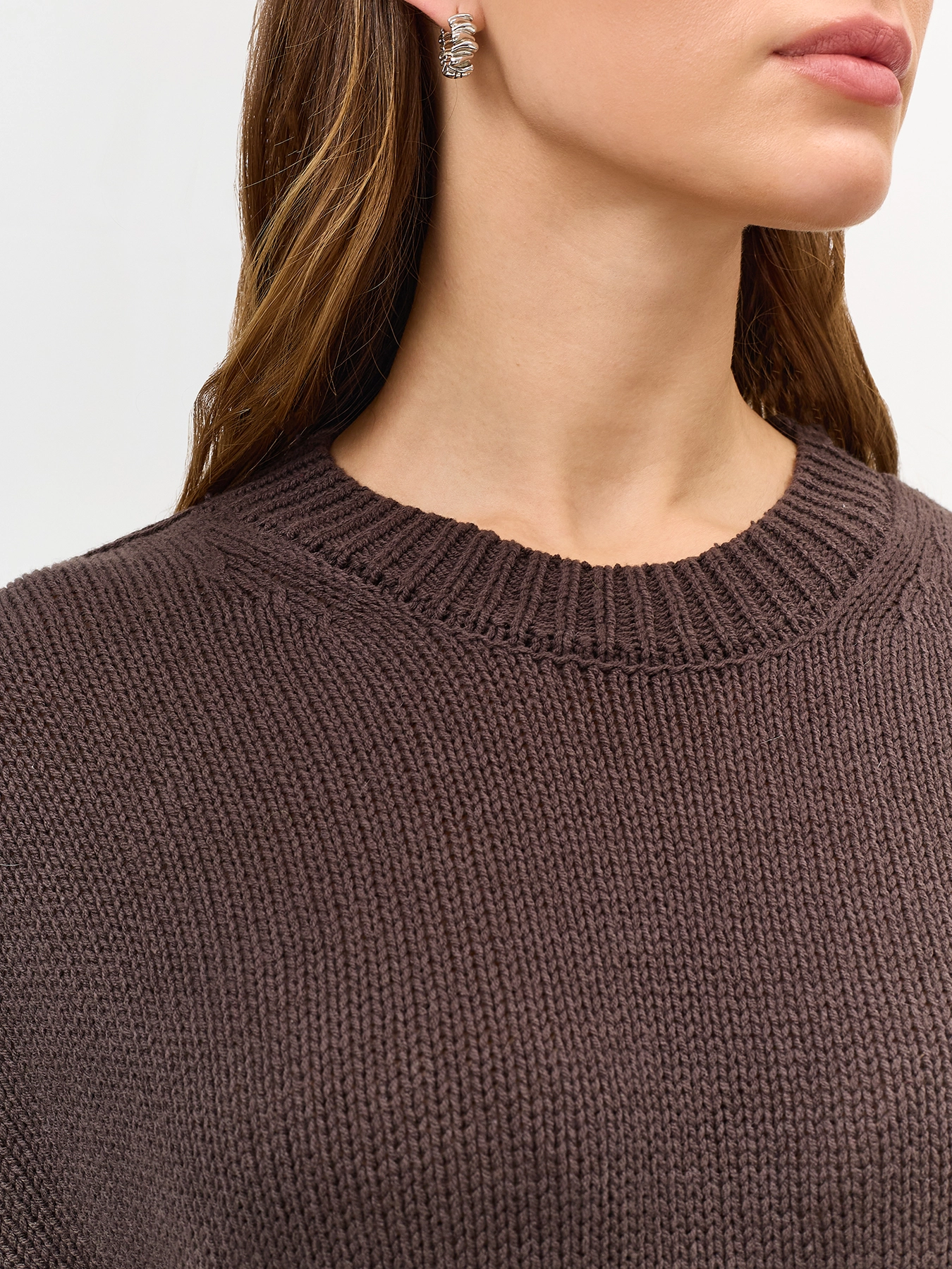 Укороченный свитер свободного силуэта. Рукава 3/4. Круглый вырез. Спущенная линия плеч. В составе хлопок.