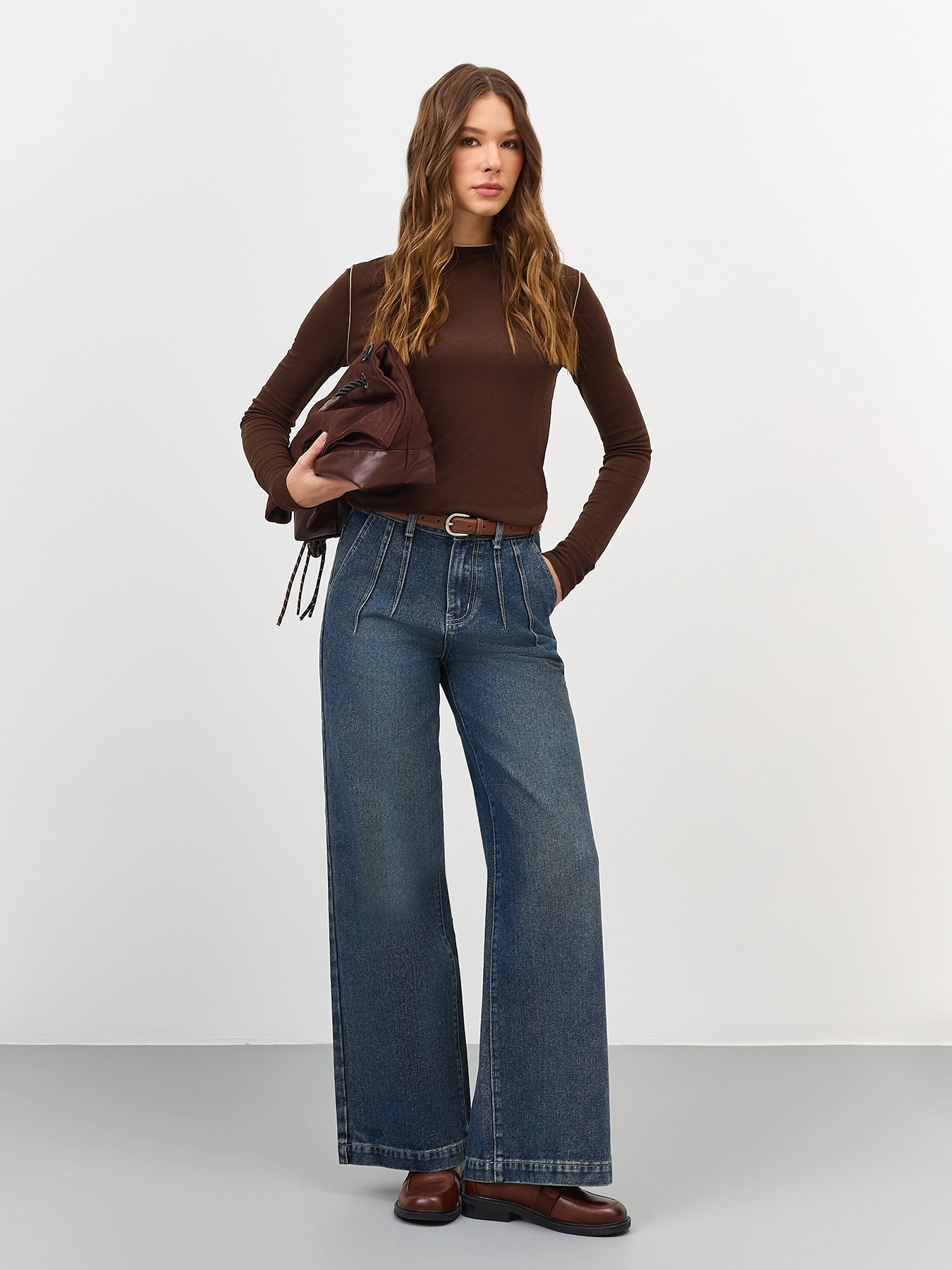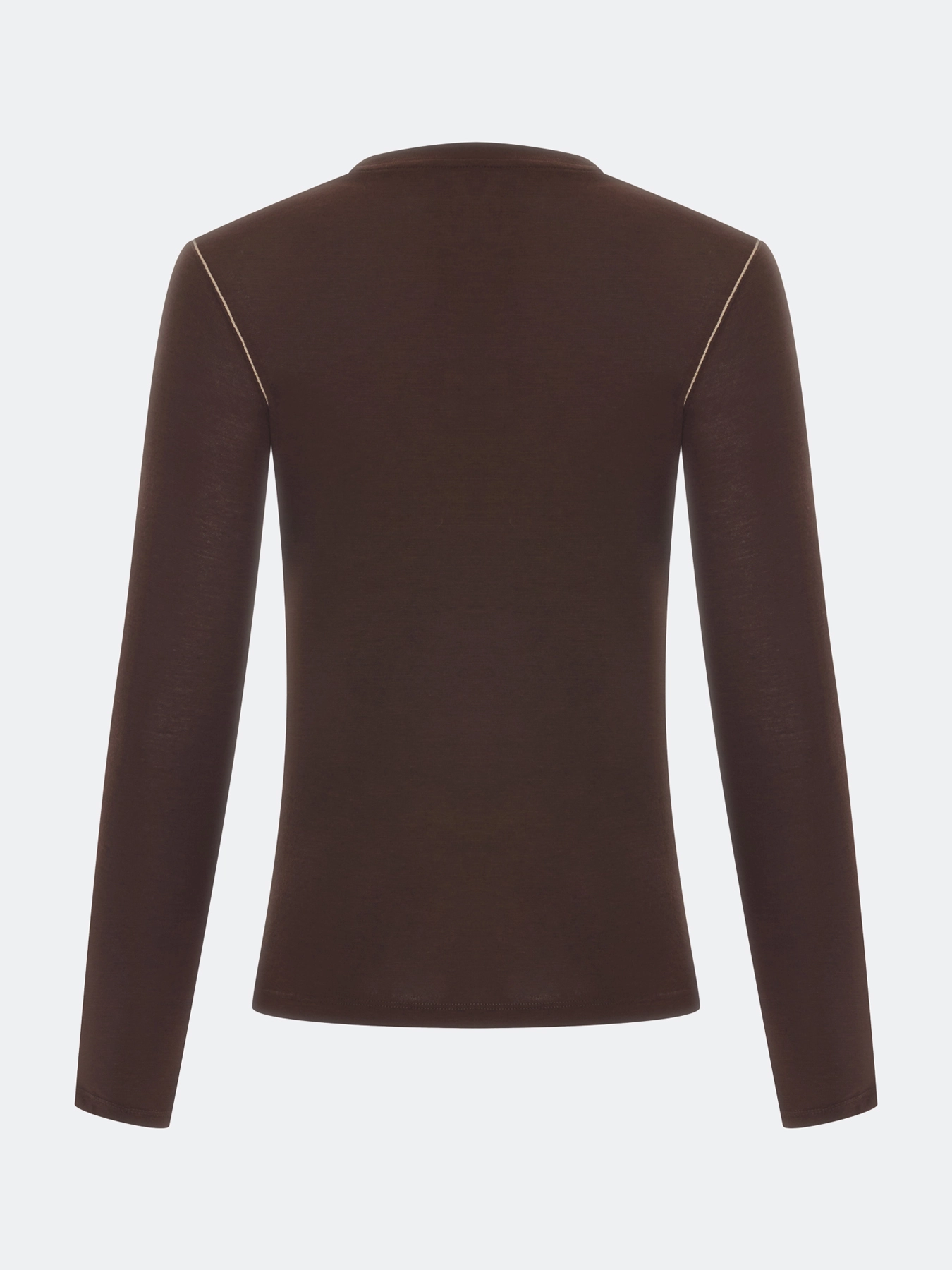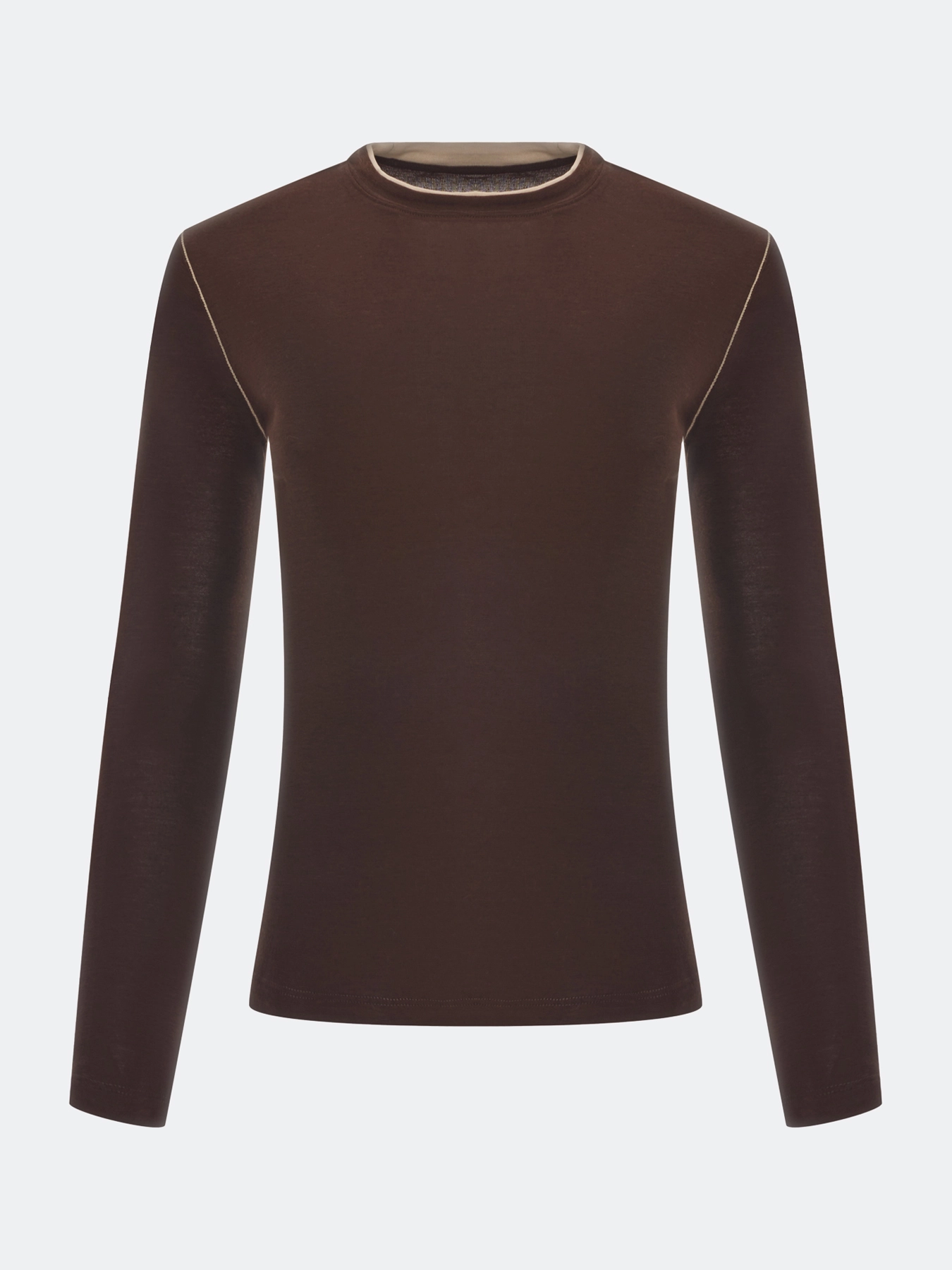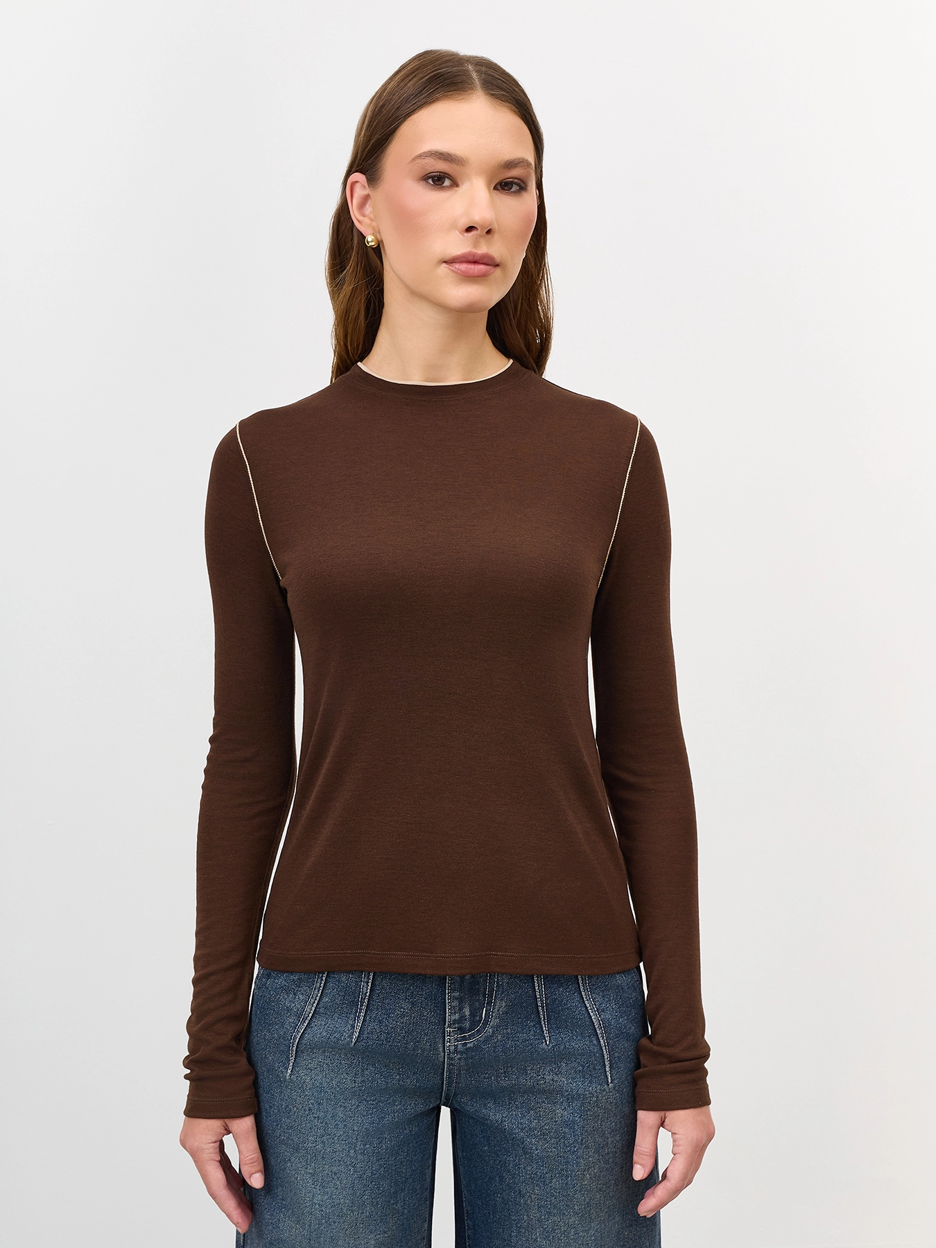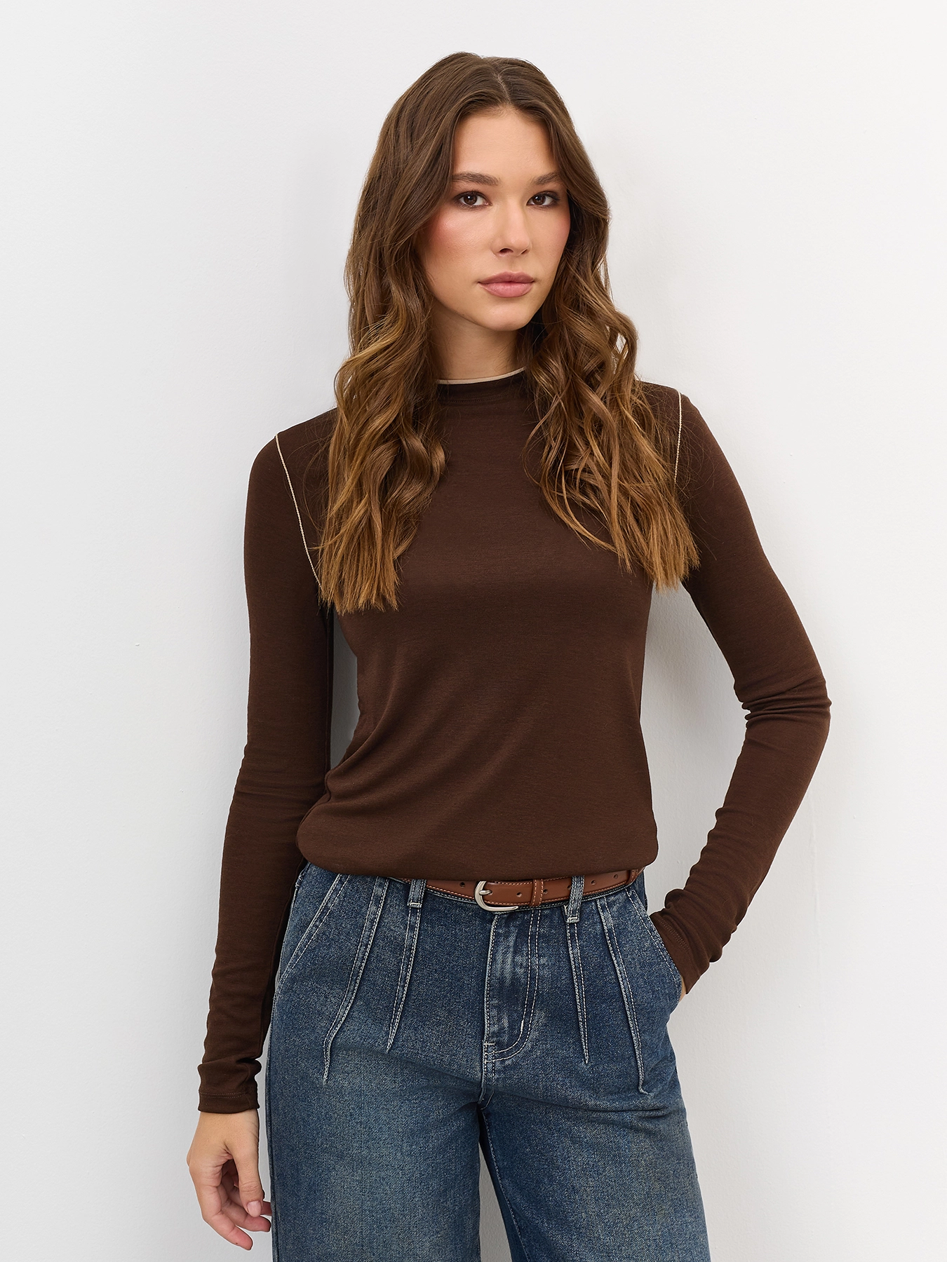 Тонкий лонгслив с шерстью в составе. Прилегающий силуэт. Круглый вырез. Дополнен контрастной отделкой по горловине и контрастными отстрочками. В составе модал и шерсть.